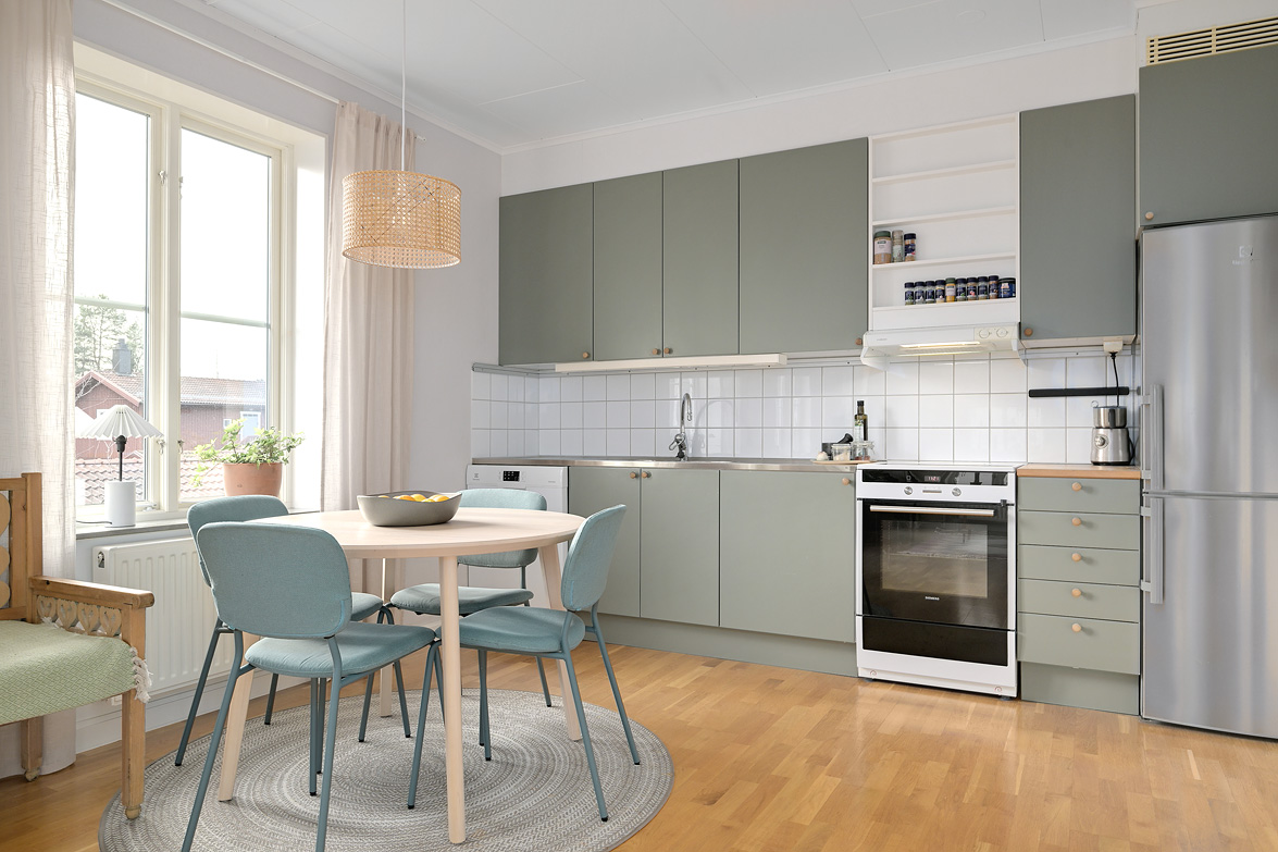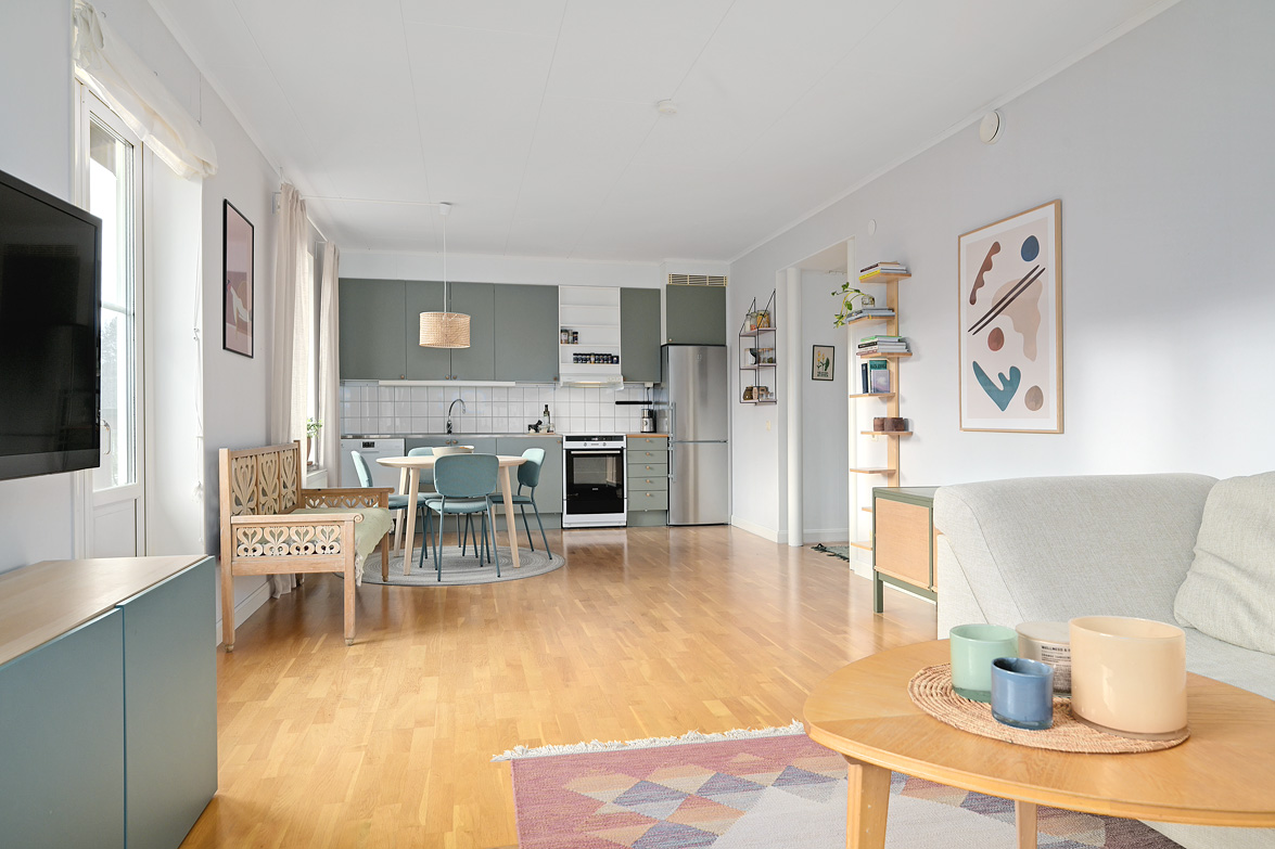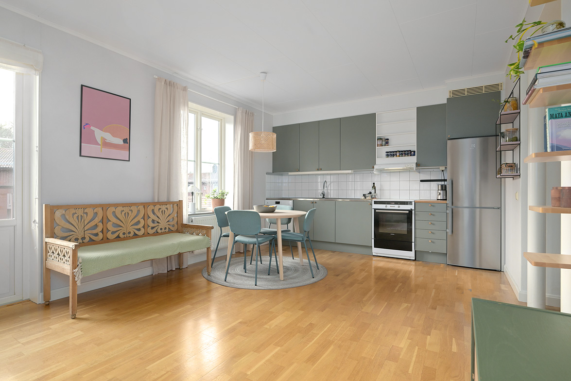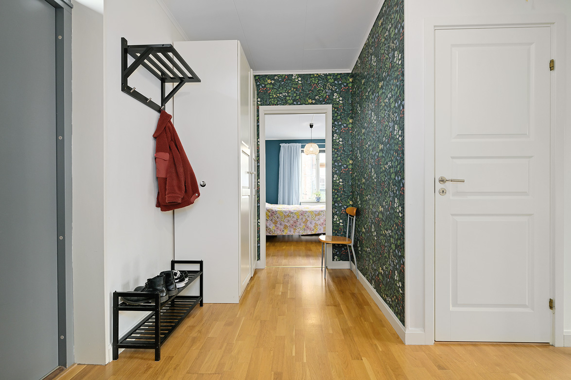 Hall Välkomnande hall med gott om plats för ytterkläder och skor direkt innanför dörren. De ljusa väggarna och den genomgående ekparketten sätter tonen för resten av bostaden – en stilren, sammanhållen och modern känsla. I anslutning till hallen finns en rymlig klädkammare som erbjuder utmärkt förvaring för kläder, skor och annat. Kök och vardagsrum Ett öppet och socialt rum där kök och vardagsrum flyter samman i en harmonisk helhet. Stora fönster i flera väderstreck släpper in ett fantastiskt ljus och skapar en luftig atmosfär. Köket är både praktiskt och stilrent, med gott om arbetsytor, bra förvaring i över- och underskåp samt plats för en matgrupp intill fönstret. Maskinellt är det utrustat med spishäll, ugn, diskmaskin samt kombinerad kyl och frys. Vardagsrumsdelen erbjuder generösa ytor för soffgrupp och TV-möbel. Härifrån nås den härliga, södervända balkongen som förlänger sällskapsytan under årets varmare månader. För den som önskar fler rum kan väggen återställas och rummet återgå till den ursprungliga planlösningen med två sovrum. Sovrum Ljust och rofyllt sovrum med gott om plats för dubbelsäng, sängbord och förvaring. Det stora fönstret släpper in fint dagsljus. Badrum Fräscht och välplanerat badrum med kaklade väggar, våtrumsmatta och ett praktiskt fönster som ger naturligt ljusinsläpp. Här finns WC, dusch, handfat med kommod och spegelskåp, samt en smart tvättdel med tvättmaskin, torktumlare, arbetsbänk och överskåp – allt för att göra vardagen så bekväm som möjligt. Klädkammare I direkt anslutning till hallen finns en stor och lättillgänglig klädkammare som ger gott om plats för kläder, väskor och hushållsprylar – en uppskattad bonus i vardagen. Balkong Södervänd balkong med utsikt mot innergården, en perfekt plats för morgonkaffet, en bok i solen eller sommarens middagar i det fria. Förråd på gården. Trivsam förening med närhet till Coop, bussförbindelser, Nydalasjön och Universitetet. Varmt välkomna att boka visning!