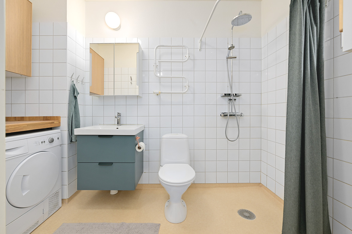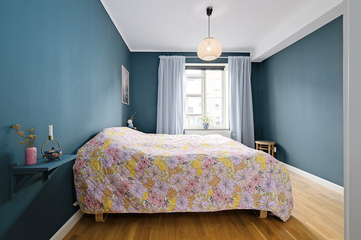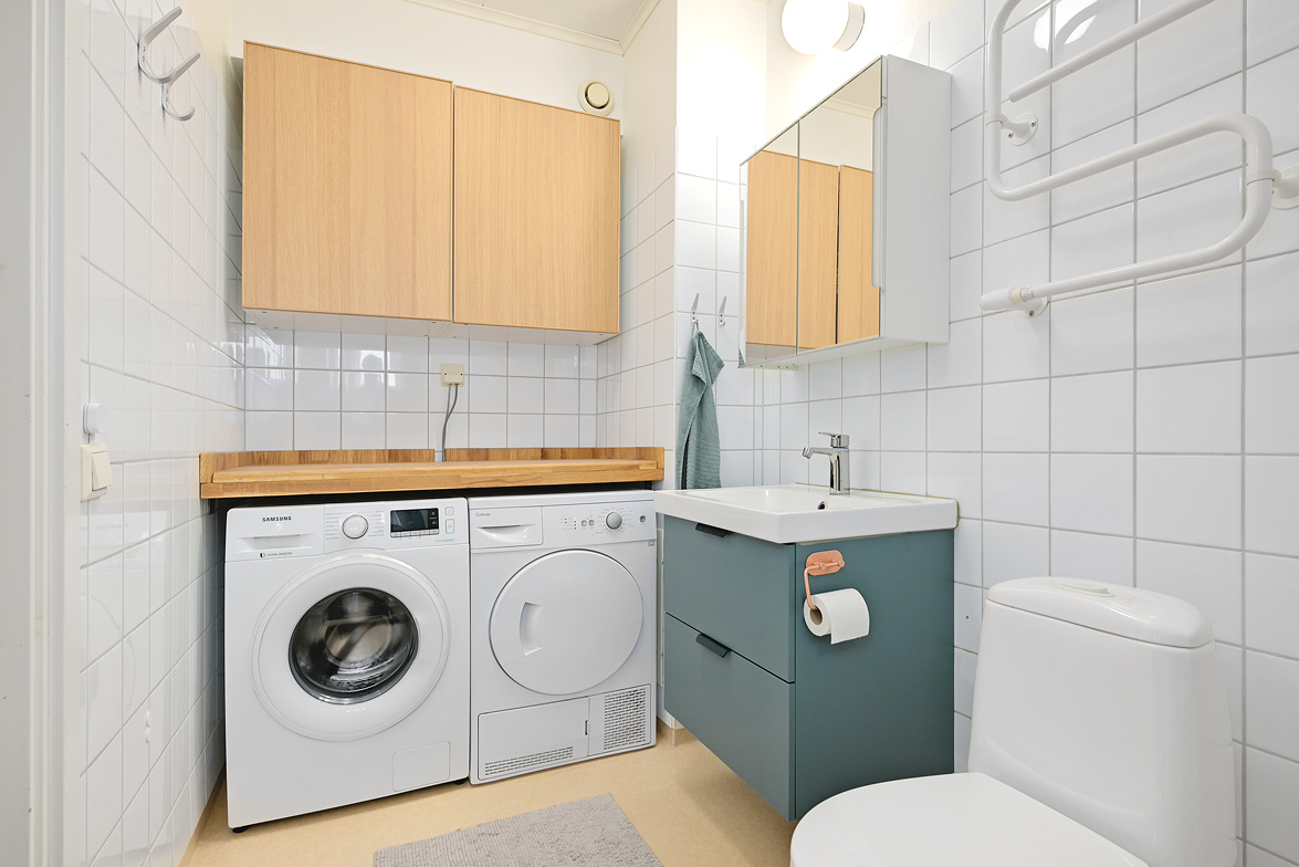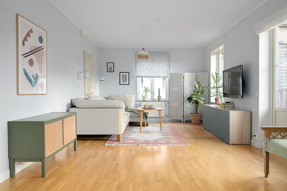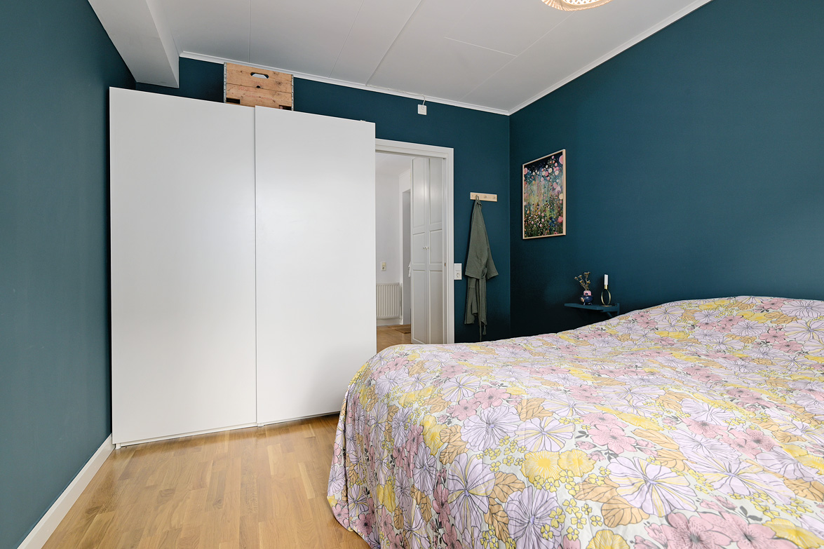 Hall Välkomnande hall med gott om plats för ytterkläder och skor direkt innanför dörren. De ljusa väggarna och den genomgående ekparketten sätter tonen för resten av bostaden – en stilren, sammanhållen och modern känsla. I anslutning till hallen finns en rymlig klädkammare som erbjuder utmärkt förvaring för kläder, skor och annat. Kök och vardagsrum Ett öppet och socialt rum där kök och vardagsrum flyter samman i en harmonisk helhet. Stora fönster i flera väderstreck släpper in ett fantastiskt ljus och skapar en luftig atmosfär. Köket är både praktiskt och stilrent, med gott om arbetsytor, bra förvaring i över- och underskåp samt plats för en matgrupp intill fönstret. Maskinellt är det utrustat med spishäll, ugn, diskmaskin samt kombinerad kyl och frys. Vardagsrumsdelen erbjuder generösa ytor för soffgrupp och TV-möbel. Härifrån nås den härliga, södervända balkongen som förlänger sällskapsytan under årets varmare månader. För den som önskar fler rum kan väggen återställas och rummet återgå till den ursprungliga planlösningen med två sovrum. Sovrum Ljust och rofyllt sovrum med gott om plats för dubbelsäng, sängbord och förvaring. Det stora fönstret släpper in fint dagsljus. Badrum Fräscht och välplanerat badrum med kaklade väggar, våtrumsmatta och ett praktiskt fönster som ger naturligt ljusinsläpp. Här finns WC, dusch, handfat med kommod och spegelskåp, samt en smart tvättdel med tvättmaskin, torktumlare, arbetsbänk och överskåp – allt för att göra vardagen så bekväm som möjligt. Klädkammare I direkt anslutning till hallen finns en stor och lättillgänglig klädkammare som ger gott om plats för kläder, väskor och hushållsprylar – en uppskattad bonus i vardagen. Balkong Södervänd balkong med utsikt mot innergården, en perfekt plats för morgonkaffet, en bok i solen eller sommarens middagar i det fria. Förråd på gården. Trivsam förening med närhet till Coop, bussförbindelser, Nydalasjön och Universitetet. Varmt välkomna att boka visning!