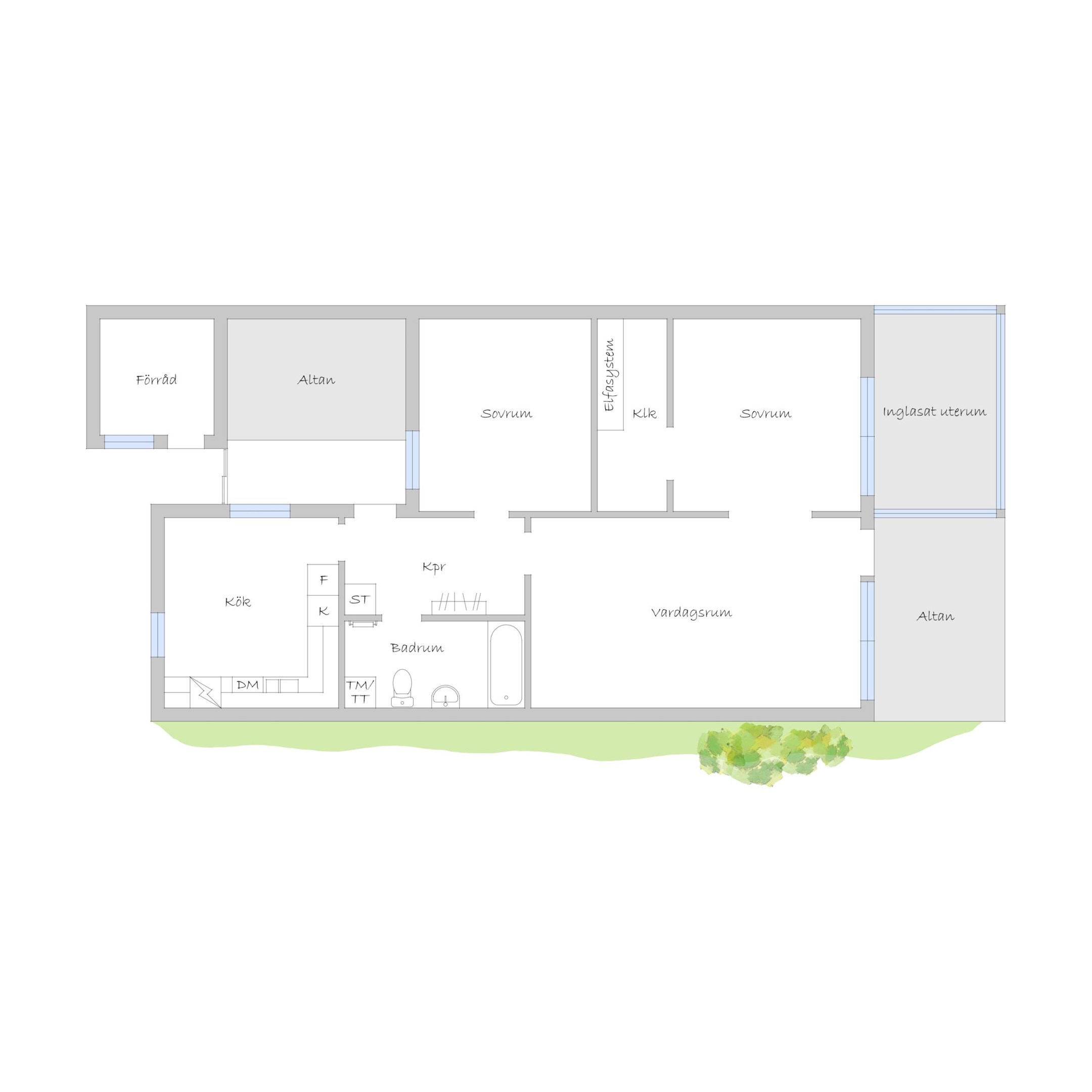 Entrén till huset sker via en skyddad liten innergård med träaltan. Hall Hall med mörk golvvinyl och ljust målade väggar. Kök Kök med högkvalitativ golvvinyl och väggar målade i ljusgrått. Köket försågs med en ny köksinredning och nya maskiner 2023, här finns bred Kyl/frys med ismaskin, denna är i rostfritt, integrerad diskmaskin, induktionshäll, inbyggnadsugn samt en kåpfläkt i rostfritt (alliancefläkt). Badrum Kaklat badrum med wc, handfat vattenburen handdukstork och badkar. Här finns även en tvättstapel med tvättmaskin och torktumlare, dessa är installerade i höst och de är helt oanvända. Vardagsrum Vardagsrum med vinylklickgolv, gråmålade väggar samt en långsida med akustikpanel. Från vardagsrummet har man utgång till trädgården med uteplats och uterum där man kan njuta av västerläge och kvällsol. Sovrum Sovrum ett har ljusa väggar, vinylklickgolv samt en vägg klädd med akustikpanel. Från sovrummet har man ingång till en fin klädkammare med mjuk matta och Elfainredning. Sovrum två har även det ljusa väggar, vinylklickgolv samt en vägg klädd med akustikpanel. Huset helrenoverades 2022-2023 (golv, väggar, tak), all el är bytt, även elcentral. Huset har ny ytterdörr.