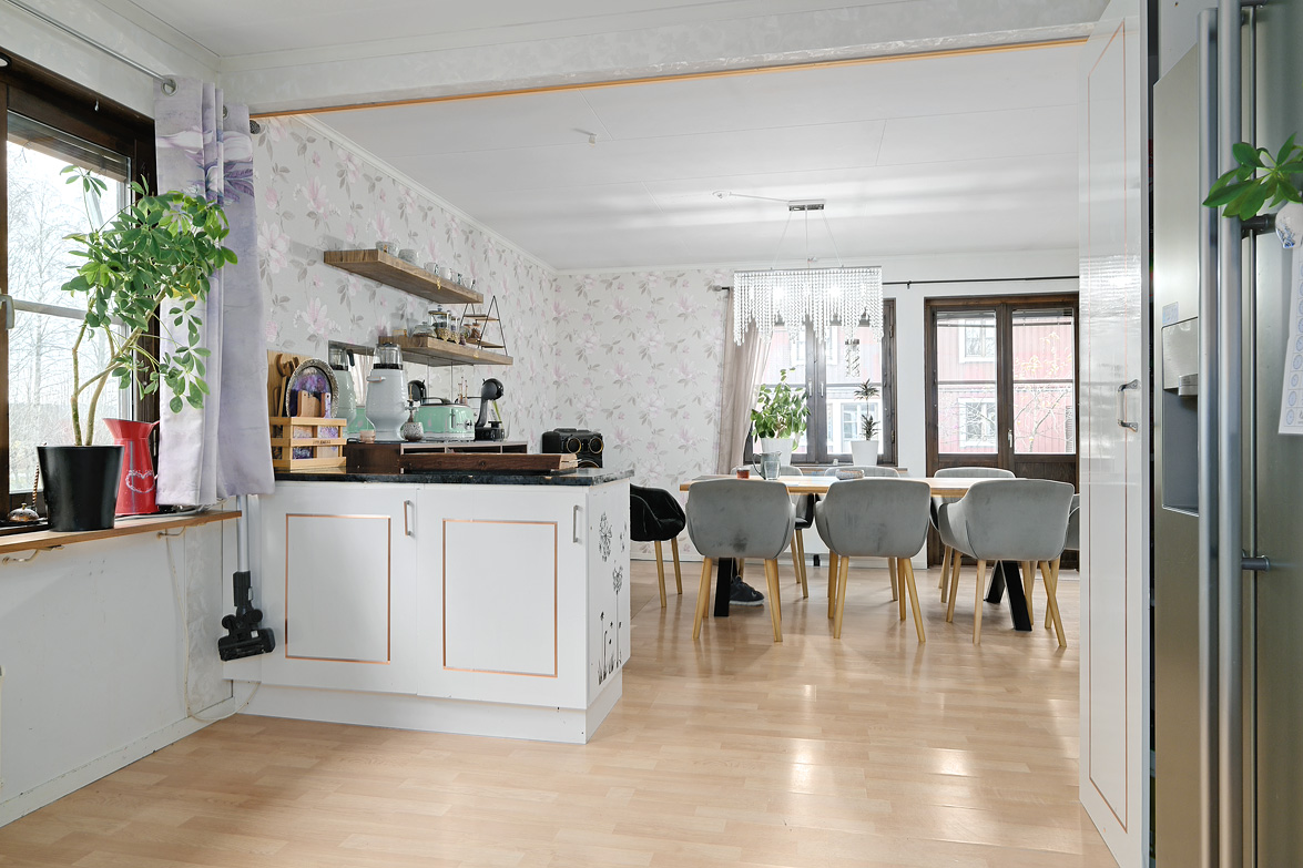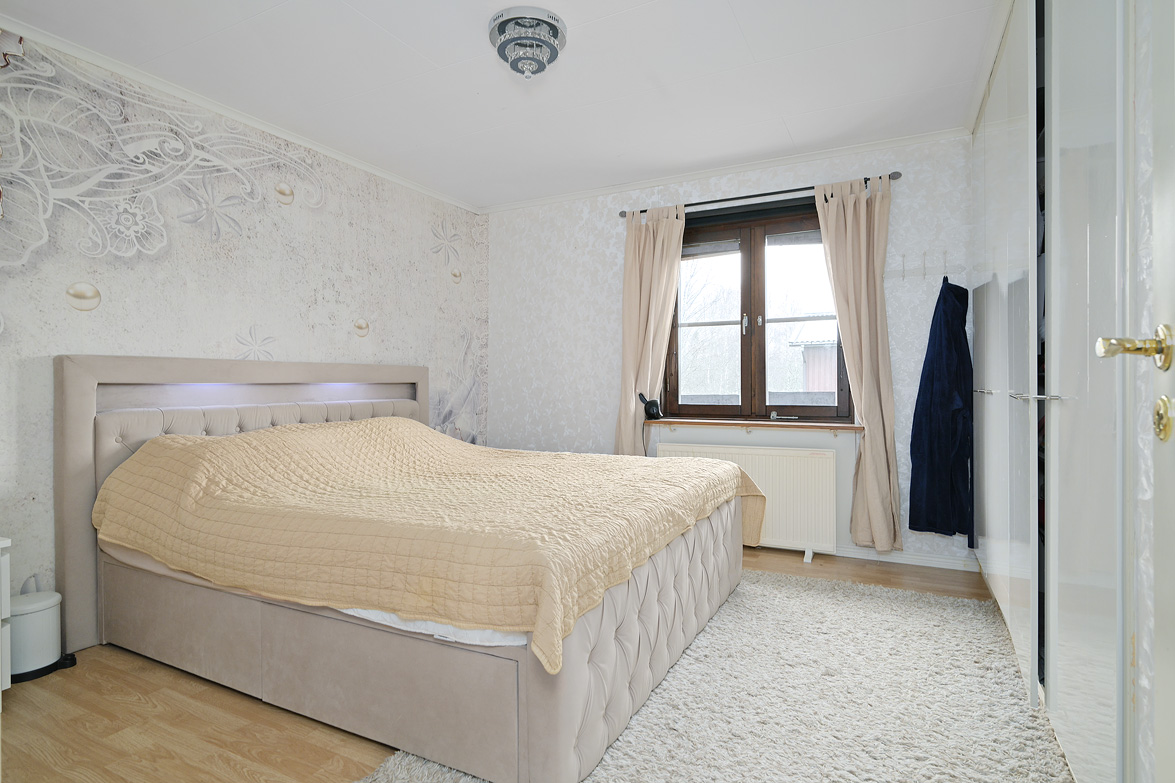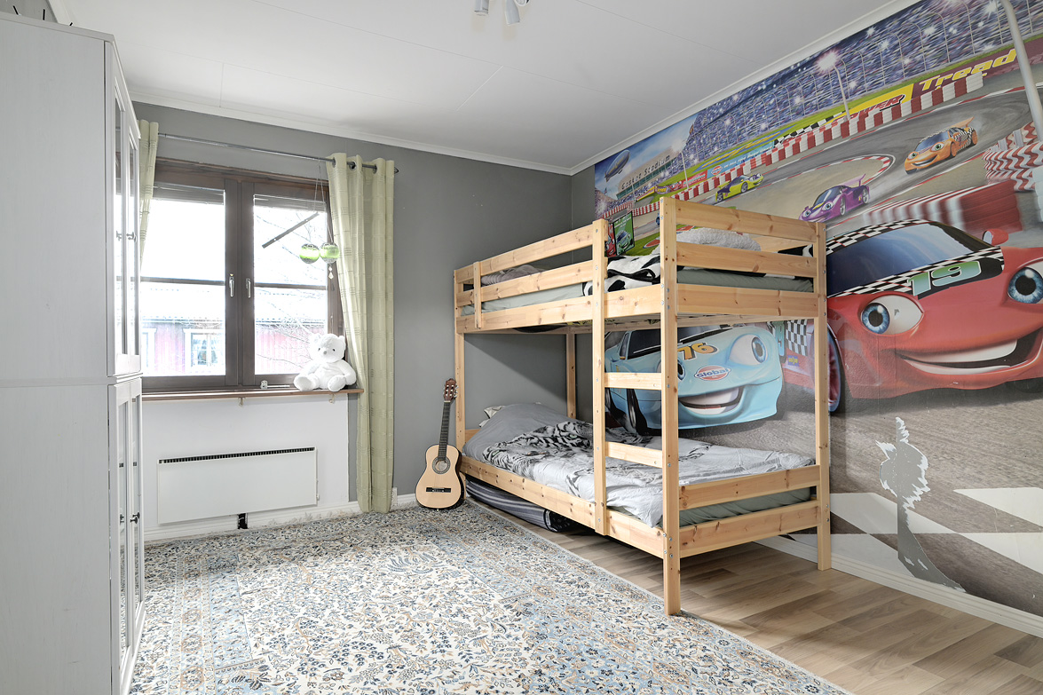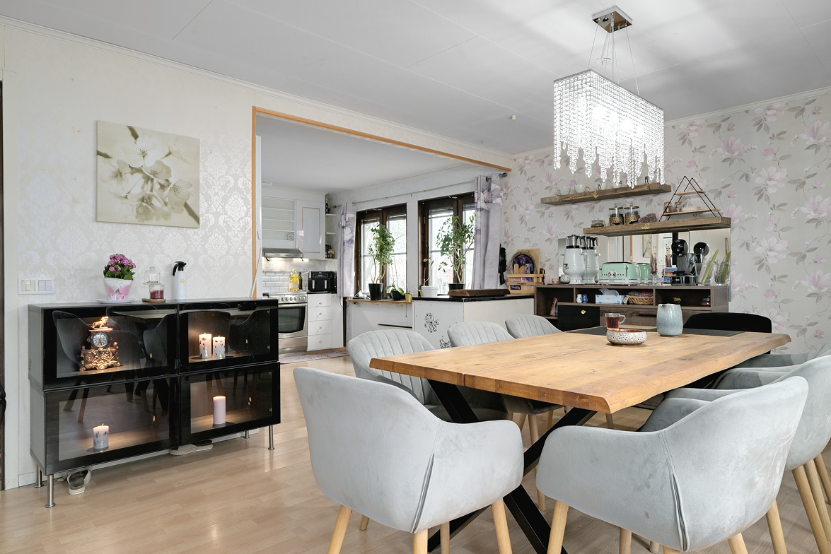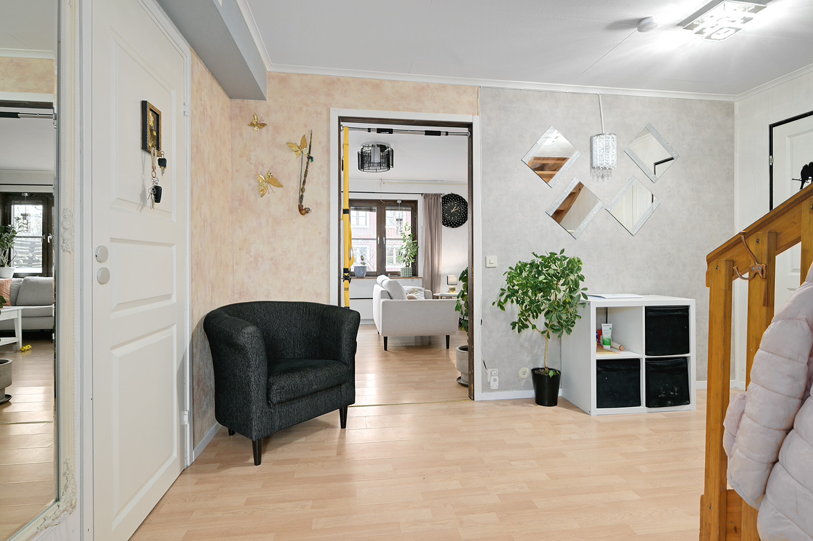 Hall En välkomnande hall som ger plats för ytterkläder och bra förvaring – perfekt för familjen som gillar ordning och reda. Golvet matchas fint med den ljusa väggarna. Kök Ett ljust och välplanerat kök där två fönster vetter mot natur och de öppna fälten - släpper även in rikligt med dagsljus på de stora arbetsytorna. Köket är utrustat med med hel kyl och frys, diskmaskin, diskbänk, spis med häll och ugn, samt en fläkt. Arbetsytorna erbjuder både utmärkt förvaring och extra arbetsyta – perfekt för både matlagning och sociala stunder. Vitt kakel till ljusa färger på skåp och vägg, enhetligt golv håller snyggt ihop kök och vardagsrum. Vardagsrum Ett ljust och rymligt vardagsrum med flera stora fönster som släpper in härligt dagsljus och skapar en luftig känsla. Pardörrar leder ut till trädgården och altanen, vilket suddar ut gränsen mellan inne och ute. Här finns gott om plats för både en stor matplats och en generös soffgrupp – perfekt för familjemiddagar och umgänge. Ljusa lätt mönstrade tapet på väggar Toalett En stilren och praktisk gästtoalett med en kommod med handfat och spegel. Rummet är inrett i härliga färger på både golv och väggar. En perfekt extra toalett för både familj och gäster. Tvättstuga En funktionell och tvättstuga utrustad med kombi-tvättmaskin (tvätt och tork i ett) och plats för skåp och hyllor som ger gott om förvaring för tvättmedel, handdukar och andra nödvändigheter. Ett fönster släpper in naturligt ljus och skapar en trivsam arbetsmiljö till tvättbestyren. Allrum - (ev sovrum 4) Ett rymligt och inbjudande allrum med fina ytor för umgänge och flexibel möblering. Här finns gott om plats för en bekväm soffa och en trivsam sällskapsyta. En dörr leder ut till balkongen, där du kan njuta av frisk luft och en härlig utsikt. Rummet har dessutom stor potential – vid behov kan det enkelt delas av för att skapa ett extra sovrum samtidigt som ett mindre allrum bevaras. Ljusgrå väggar och fint golv. Sovrum 1 Det största sovrummet har gott om plats för en större säng samt bra förvaring, vilket gör det till en perfekt föräldrasvit eller det största sovrummet för familjen. Här finns även möjlighet att inreda med extra möbler eller en liten sittgrupp om så önskas. Sovrummet går i ljusa färger, en mönstrad fondvägg i dova färger återfinns bakom sänggaveln. Sovrum 2 & 3 De två övriga sovrummen är också rymliga och erbjuder både plats för säng samt bra förvaring. Dessa rum fungerar utmärkt som barnrum, gästrum eller hemmakontor – med flexibilitet för olika behov. Färgen på väggarna är ljusa med livfulla tapeter, vilket ger en trivsam känsla. Badrum Rymligt badrum med vit tvättställskommod, spegel, wc och två takduschar som erbjuder en härlig duschupplevelse. Ett fönster släpper in naturligt ljus och ger möjlighet till vädring. Varm färg på melerade väggar till blåmelerat golv. Känns detta intressant, boka visningstid redan nu!