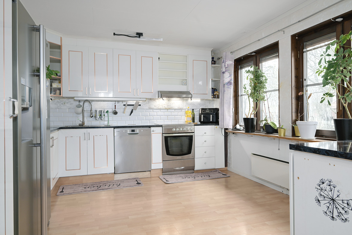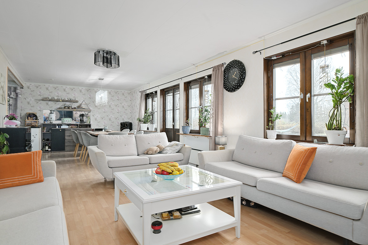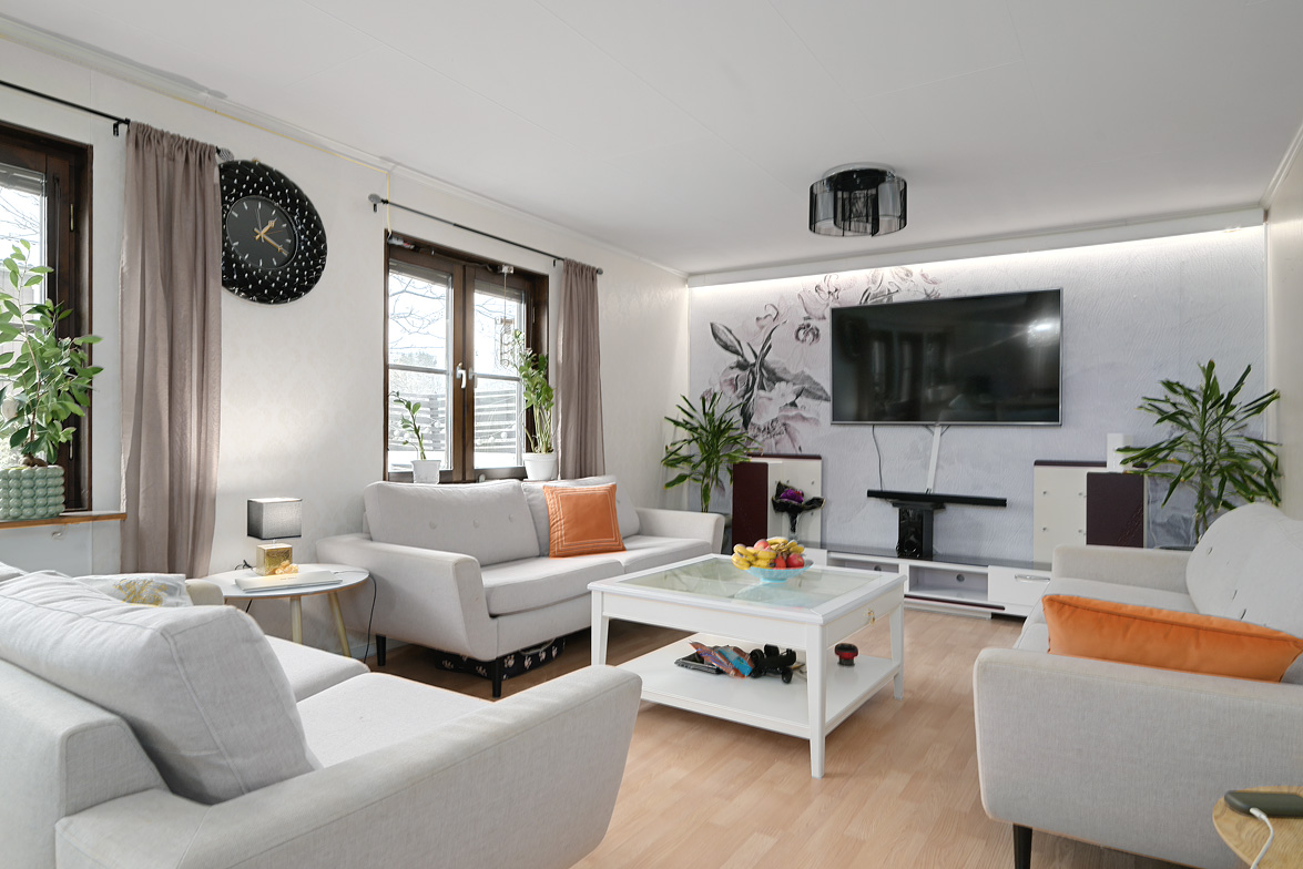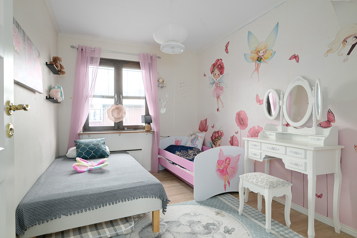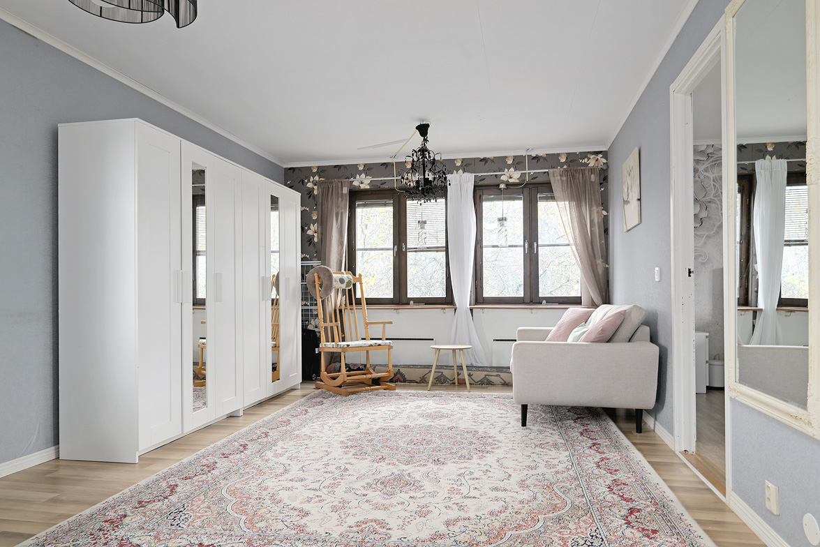 Hall En välkomnande hall som ger plats för ytterkläder och bra förvaring – perfekt för familjen som gillar ordning och reda. Golvet matchas fint med den ljusa väggarna. Kök Ett ljust och välplanerat kök där två fönster vetter mot natur och de öppna fälten - släpper även in rikligt med dagsljus på de stora arbetsytorna. Köket är utrustat med med hel kyl och frys, diskmaskin, diskbänk, spis med häll och ugn, samt en fläkt. Arbetsytorna erbjuder både utmärkt förvaring och extra arbetsyta – perfekt för både matlagning och sociala stunder. Vitt kakel till ljusa färger på skåp och vägg, enhetligt golv håller snyggt ihop kök och vardagsrum. Vardagsrum Ett ljust och rymligt vardagsrum med flera stora fönster som släpper in härligt dagsljus och skapar en luftig känsla. Pardörrar leder ut till trädgården och altanen, vilket suddar ut gränsen mellan inne och ute. Här finns gott om plats för både en stor matplats och en generös soffgrupp – perfekt för familjemiddagar och umgänge. Ljusa lätt mönstrade tapet på väggar Toalett En stilren och praktisk gästtoalett med en kommod med handfat och spegel. Rummet är inrett i härliga färger på både golv och väggar. En perfekt extra toalett för både familj och gäster. Tvättstuga En funktionell och tvättstuga utrustad med kombi-tvättmaskin (tvätt och tork i ett) och plats för skåp och hyllor som ger gott om förvaring för tvättmedel, handdukar och andra nödvändigheter. Ett fönster släpper in naturligt ljus och skapar en trivsam arbetsmiljö till tvättbestyren. Allrum - (ev sovrum 4) Ett rymligt och inbjudande allrum med fina ytor för umgänge och flexibel möblering. Här finns gott om plats för en bekväm soffa och en trivsam sällskapsyta. En dörr leder ut till balkongen, där du kan njuta av frisk luft och en härlig utsikt. Rummet har dessutom stor potential – vid behov kan det enkelt delas av för att skapa ett extra sovrum samtidigt som ett mindre allrum bevaras. Ljusgrå väggar och fint golv. Sovrum 1 Det största sovrummet har gott om plats för en större säng samt bra förvaring, vilket gör det till en perfekt föräldrasvit eller det största sovrummet för familjen. Här finns även möjlighet att inreda med extra möbler eller en liten sittgrupp om så önskas. Sovrummet går i ljusa färger, en mönstrad fondvägg i dova färger återfinns bakom sänggaveln. Sovrum 2 & 3 De två övriga sovrummen är också rymliga och erbjuder både plats för säng samt bra förvaring. Dessa rum fungerar utmärkt som barnrum, gästrum eller hemmakontor – med flexibilitet för olika behov. Färgen på väggarna är ljusa med livfulla tapeter, vilket ger en trivsam känsla. Badrum Rymligt badrum med vit tvättställskommod, spegel, wc och två takduschar som erbjuder en härlig duschupplevelse. Ett fönster släpper in naturligt ljus och ger möjlighet till vädring. Varm färg på melerade väggar till blåmelerat golv. Känns detta intressant, boka visningstid redan nu!