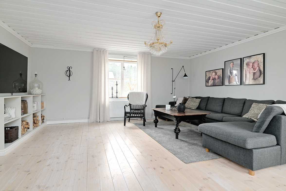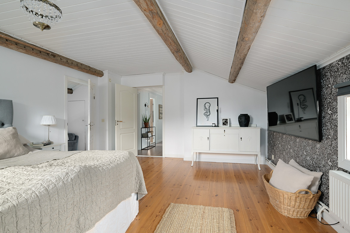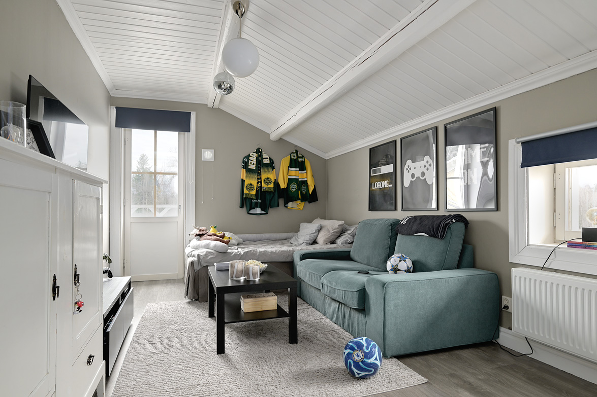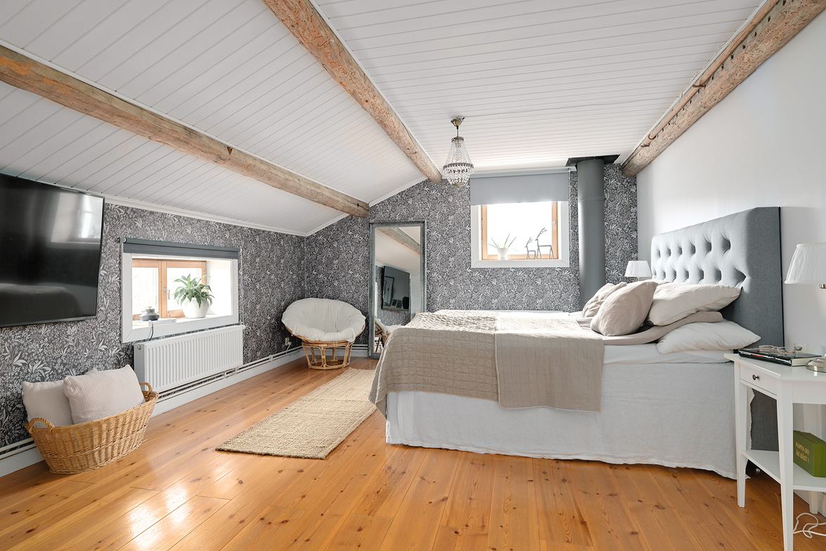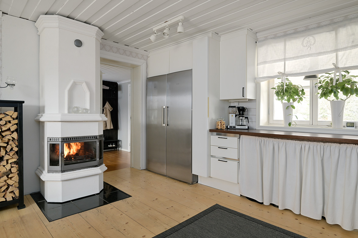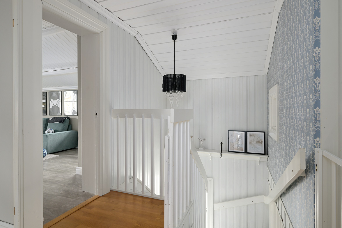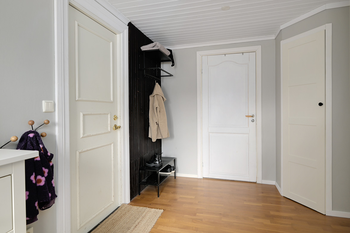 Hall Välkommen in i en ljus och luftig hall med gott om plats för både avhängning och möblering. Här kombineras praktisk klinker vid entrén med ett vackert ljust plankgolv som löper vidare in mot bostadens sociala ytor. Väggarna går i en harmonisk grå ton tillsammans med ljus panel som skapar en varm och inbjudande känsla. Kök Köket är hemmets självklara hjärta – en plats att samlas på. Den värmande kaminen bidrar till en mysig och ombonad atmosfär. Här erbjuds ett klassiskt vitt kök med generösa förvaringsmöjligheter i skafferi, skåp och lådor. Vitt kakel ovan arbetsytorna och fönster i två väderstreck ger ett härligt ljusinsläpp. Matplatsen är placerad vid fönster med vacker utsikt över öppna fält, där både familj och gäster ryms med lätthet. Köket är utrustat med spis med häll och ugn, fläkt, diskmaskin samt fullstor kyl och frys. Ljust plankgolv möter smakfullt mönstrade tapeter. Vardagsrum Ett generöst vardagsrum med stora fönsterpartier som ger ett fantastiskt ljus och en luftig känsla. Här finns gott om plats för både soffgrupp och matsalsmöbel om så önskas. Den pampiga kaminen blir rummets naturliga mittpunkt och höjer trivseln ytterligare. Ljust plankgolv i kombination med ljusgrå väggar skapar en stilren helhet. WC (entréplan) Smakfull gästtoalett med vit bröstpanel och en charmig blommig tapet. Här finns wc, handfat med spegel samt praktiska hyllplan för förvaring. Sovrum 1 Rymligt sovrum på entréplan med plats för dubbelsäng och god förvaring i garderober. Härifrån nås altanen på baksidan via balkongdörr – perfekt för lugna morgnar och kvällar. Inre hall Praktisk groventré via garaget som leder in till en inre hall med skjutdörrsgarderob och goda förvaringsmöjligheter. Väggar i grå ton och slitstarkt golv. Här skulle man kunna sätta in en dörr direkt ut om man inte vill gå via garaget. Badrum/Tvättstuga (entréplan) Stort, helkaklat badrum med integrerad tvättdel. Här finns dusch, tvättmaskin, torktumlare, tvättho samt gott om förvaring i skåp och lådor. Betongglas släpper in ett behagligt dagsljus. Stilrena färgval i grått och beige ger ett lugnt intryck. Övre plan Allrum / Sovrum 2 Ett rymligt och charmigt rum med synliga takstockar, vackert plankgolv och smakfulla tapeter. Härifrån nås även en praktisk klädkammare. Används idag till sovrum. Badrum Rymligt badrum med badkar, tvättställskommod och wc. Fönster ger ett fint ljusinsläpp och möjlighet till vädring. Vitt kakel kombineras med klinker och gråmålade väggpartier. Sovrum 3 & 4 Två rymliga sovrum med plats för större säng och övrig möblering. Väggarna går i grå toner och en vacker timmervägg pryder ett av rummen, snyggt och stilfullt! Garderober finns i det ena rummet. Från båda rummen nås en balkong med härlig dag- och kvällssol. Kontor Mindre kontor – perfekt som arbetsplats eller studierum. Vit panel på väggarna till plankgolv. Klädkammare/Förråd Praktiskt förrådsutrymme med gott om plats för säsongsförvaring. Perfekt för den som gillar ordning och reda! Övrigt Det stora garaget och den charmiga ladan på gården erbjuder fantastiska möjligheter för hobby, projekt och generös förvaring. Välkommen till ett hem att verkligen trivas i! Känns detta intressant? Varmt välkommen att anmäla dig till visning.