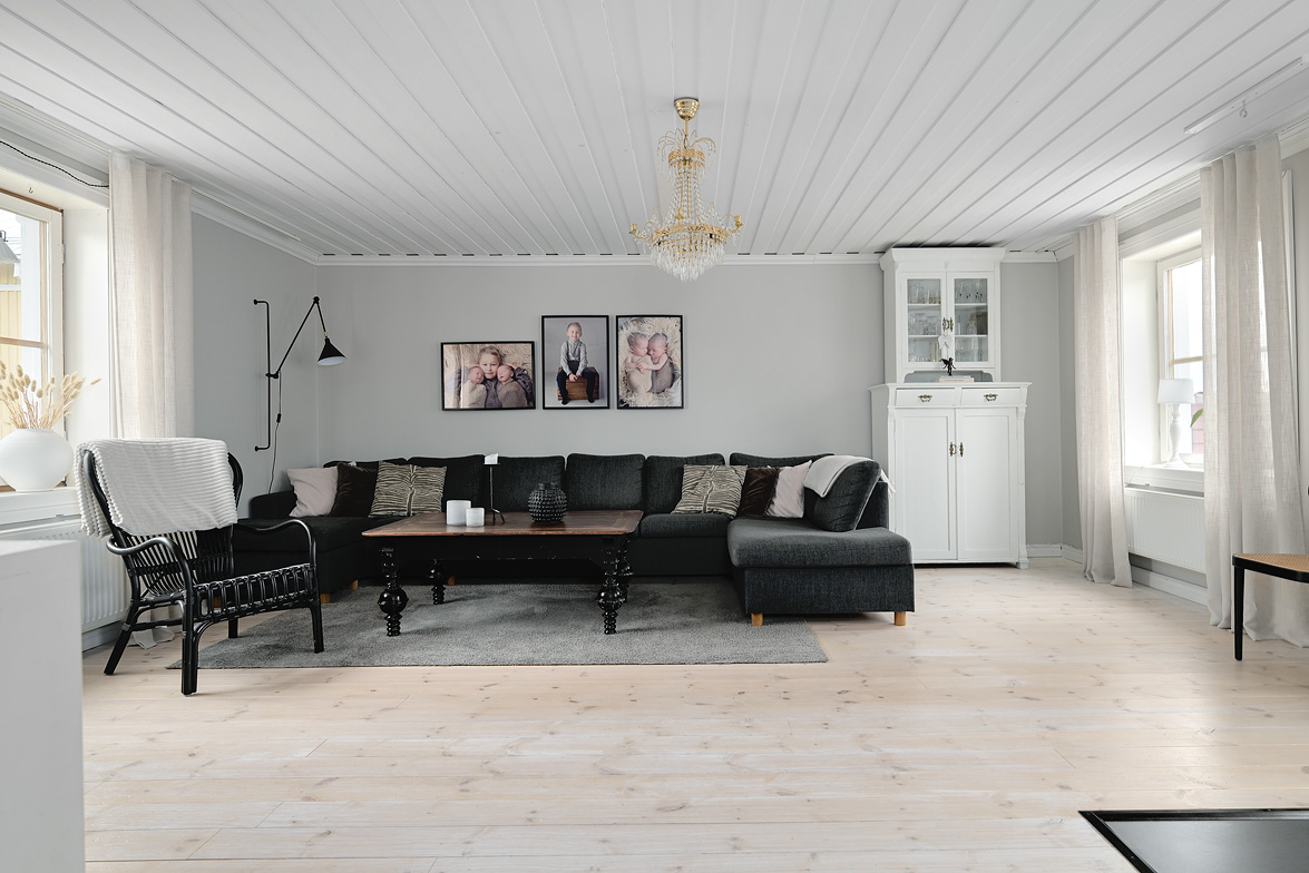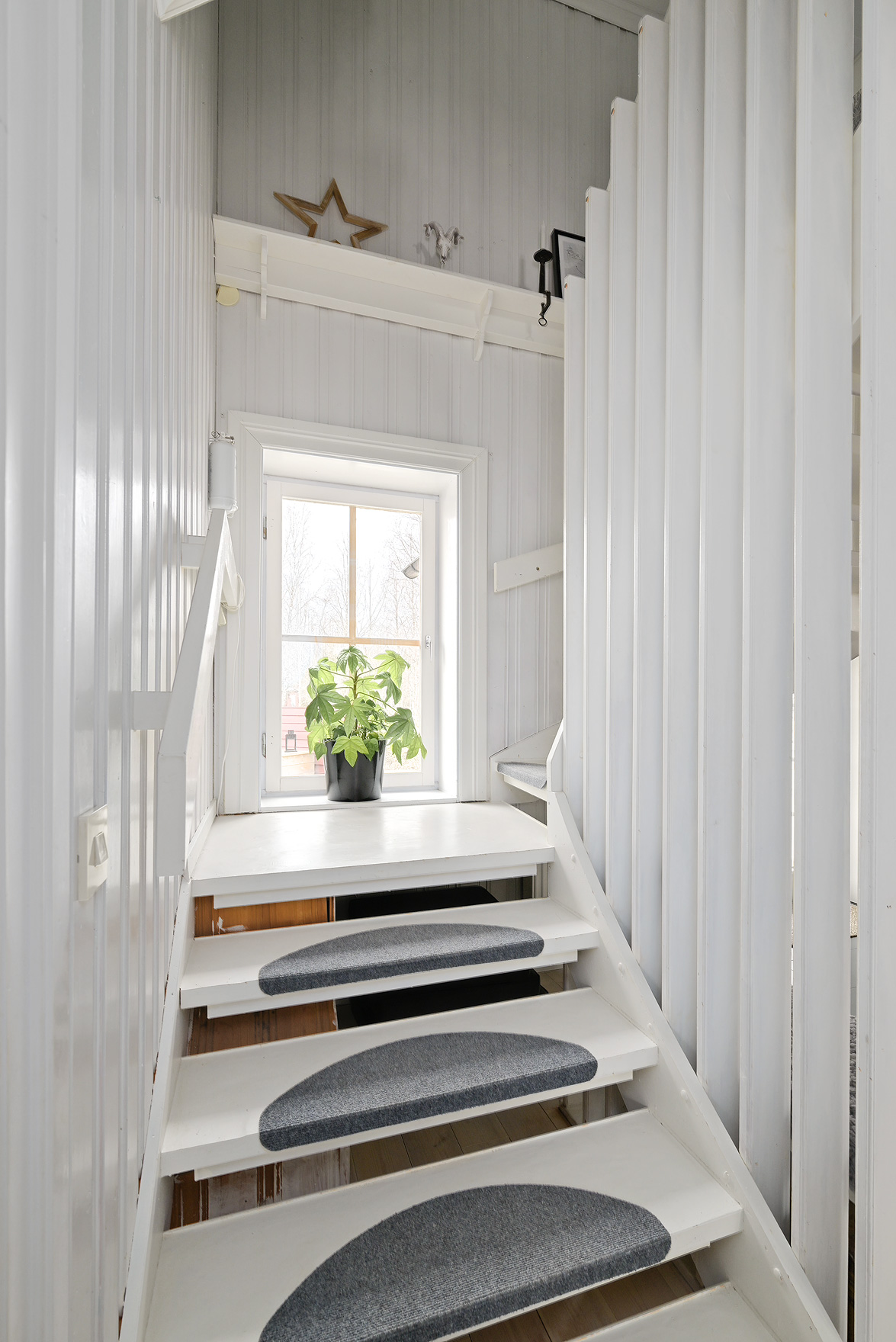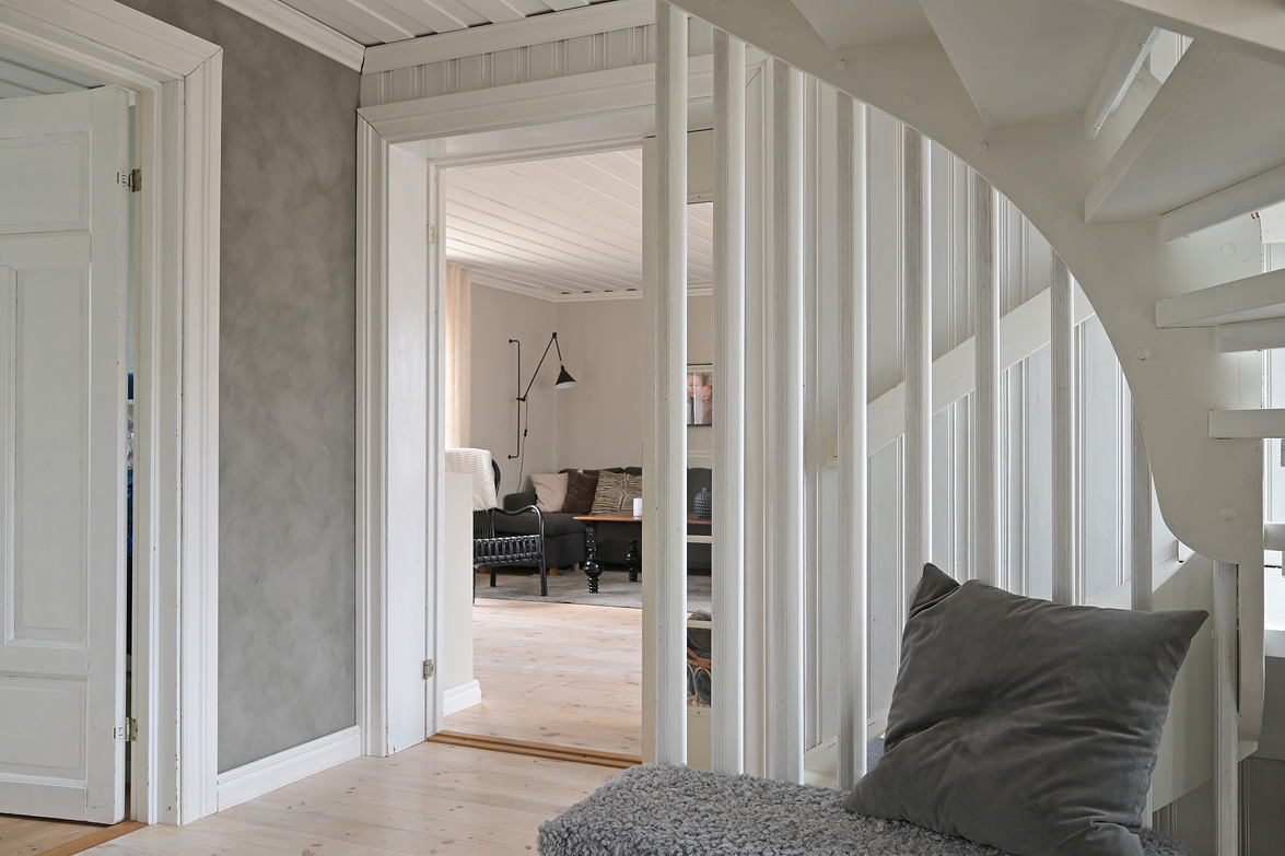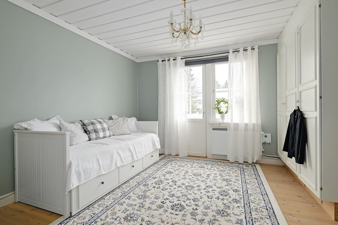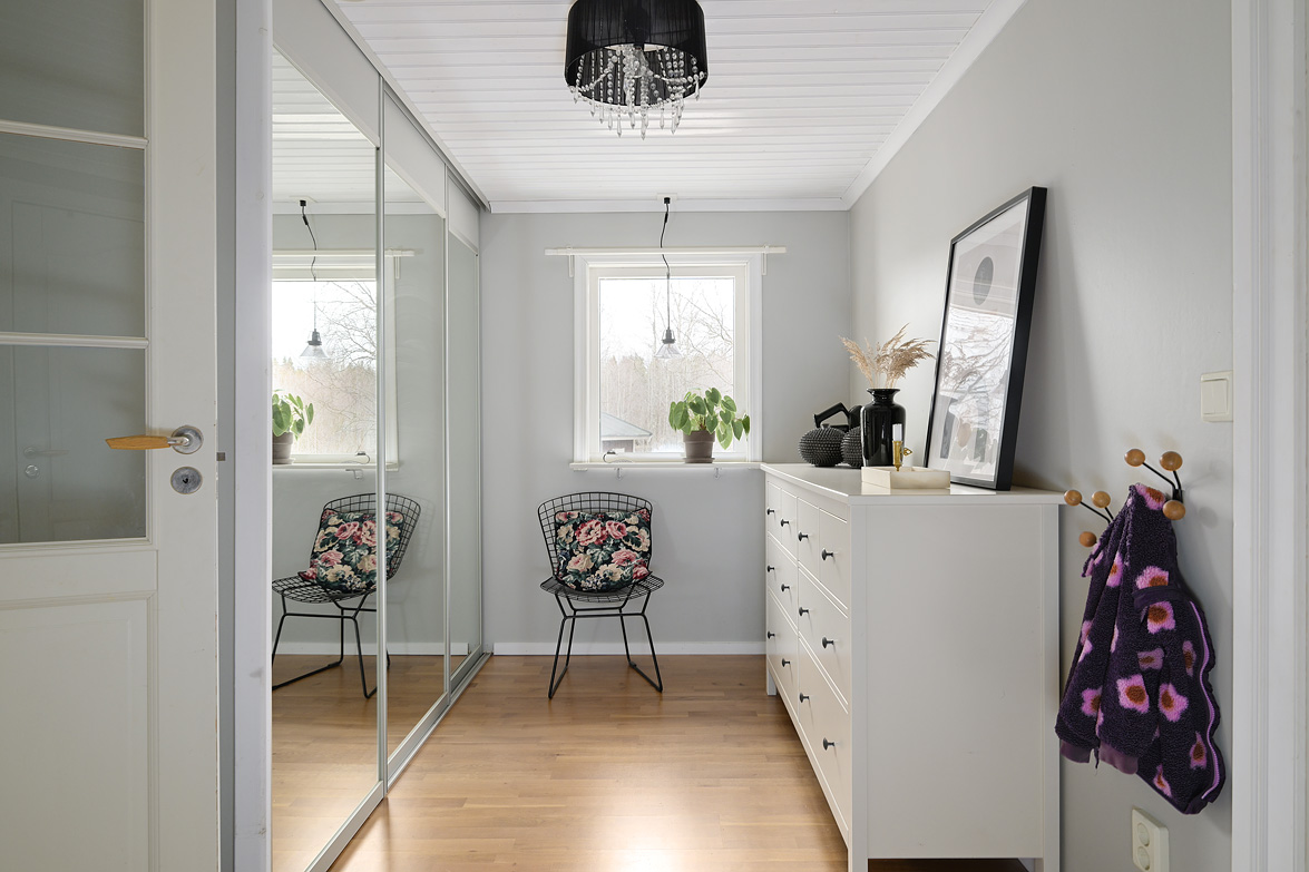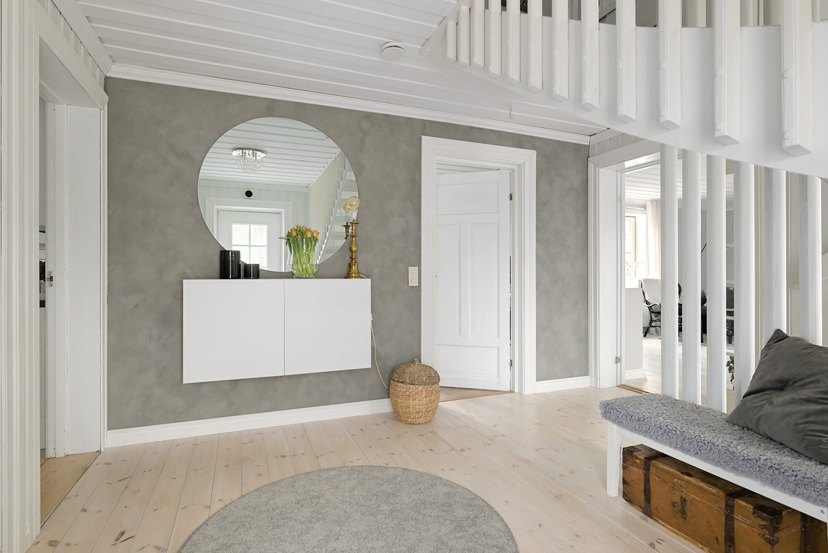 Hall Välkommen in i en ljus och luftig hall med gott om plats för både avhängning och möblering. Här kombineras praktisk klinker vid entrén med ett vackert ljust plankgolv som löper vidare in mot bostadens sociala ytor. Väggarna går i en harmonisk grå ton tillsammans med ljus panel som skapar en varm och inbjudande känsla. Kök Köket är hemmets självklara hjärta – en plats att samlas på. Den värmande kaminen bidrar till en mysig och ombonad atmosfär. Här erbjuds ett klassiskt vitt kök med generösa förvaringsmöjligheter i skafferi, skåp och lådor. Vitt kakel ovan arbetsytorna och fönster i två väderstreck ger ett härligt ljusinsläpp. Matplatsen är placerad vid fönster med vacker utsikt över öppna fält, där både familj och gäster ryms med lätthet. Köket är utrustat med spis med häll och ugn, fläkt, diskmaskin samt fullstor kyl och frys. Ljust plankgolv möter smakfullt mönstrade tapeter. Vardagsrum Ett generöst vardagsrum med stora fönsterpartier som ger ett fantastiskt ljus och en luftig känsla. Här finns gott om plats för både soffgrupp och matsalsmöbel om så önskas. Den pampiga kaminen blir rummets naturliga mittpunkt och höjer trivseln ytterligare. Ljust plankgolv i kombination med ljusgrå väggar skapar en stilren helhet. WC (entréplan) Smakfull gästtoalett med vit bröstpanel och en charmig blommig tapet. Här finns wc, handfat med spegel samt praktiska hyllplan för förvaring. Sovrum 1 Rymligt sovrum på entréplan med plats för dubbelsäng och god förvaring i garderober. Härifrån nås altanen på baksidan via balkongdörr – perfekt för lugna morgnar och kvällar. Inre hall Praktisk groventré via garaget som leder in till en inre hall med skjutdörrsgarderob och goda förvaringsmöjligheter. Väggar i grå ton och slitstarkt golv. Här skulle man kunna sätta in en dörr direkt ut om man inte vill gå via garaget. Badrum/Tvättstuga (entréplan) Stort, helkaklat badrum med integrerad tvättdel. Här finns dusch, tvättmaskin, torktumlare, tvättho samt gott om förvaring i skåp och lådor. Betongglas släpper in ett behagligt dagsljus. Stilrena färgval i grått och beige ger ett lugnt intryck. Övre plan Allrum / Sovrum 2 Ett rymligt och charmigt rum med synliga takstockar, vackert plankgolv och smakfulla tapeter. Härifrån nås även en praktisk klädkammare. Används idag till sovrum. Badrum Rymligt badrum med badkar, tvättställskommod och wc. Fönster ger ett fint ljusinsläpp och möjlighet till vädring. Vitt kakel kombineras med klinker och gråmålade väggpartier. Sovrum 3 & 4 Två rymliga sovrum med plats för större säng och övrig möblering. Väggarna går i grå toner och en vacker timmervägg pryder ett av rummen, snyggt och stilfullt! Garderober finns i det ena rummet. Från båda rummen nås en balkong med härlig dag- och kvällssol. Kontor Mindre kontor – perfekt som arbetsplats eller studierum. Vit panel på väggarna till plankgolv. Klädkammare/Förråd Praktiskt förrådsutrymme med gott om plats för säsongsförvaring. Perfekt för den som gillar ordning och reda! Övrigt Det stora garaget och den charmiga ladan på gården erbjuder fantastiska möjligheter för hobby, projekt och generös förvaring. Välkommen till ett hem att verkligen trivas i! Känns detta intressant? Varmt välkommen att anmäla dig till visning.