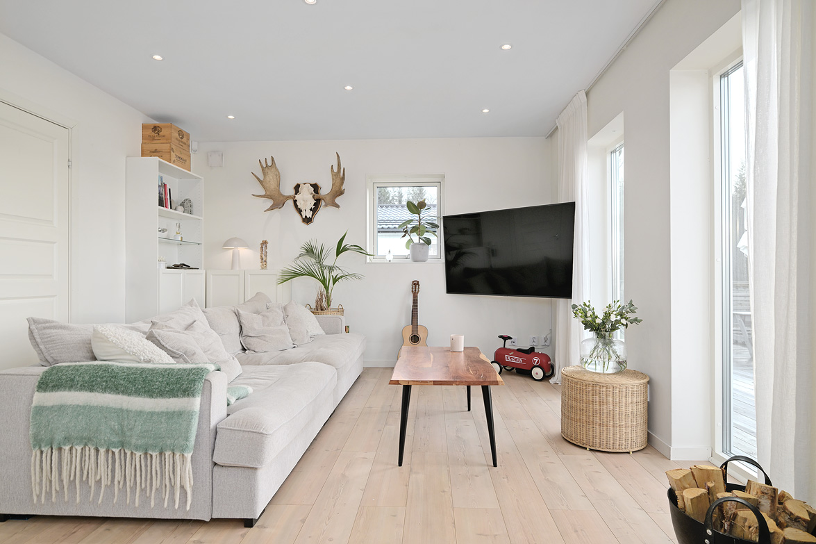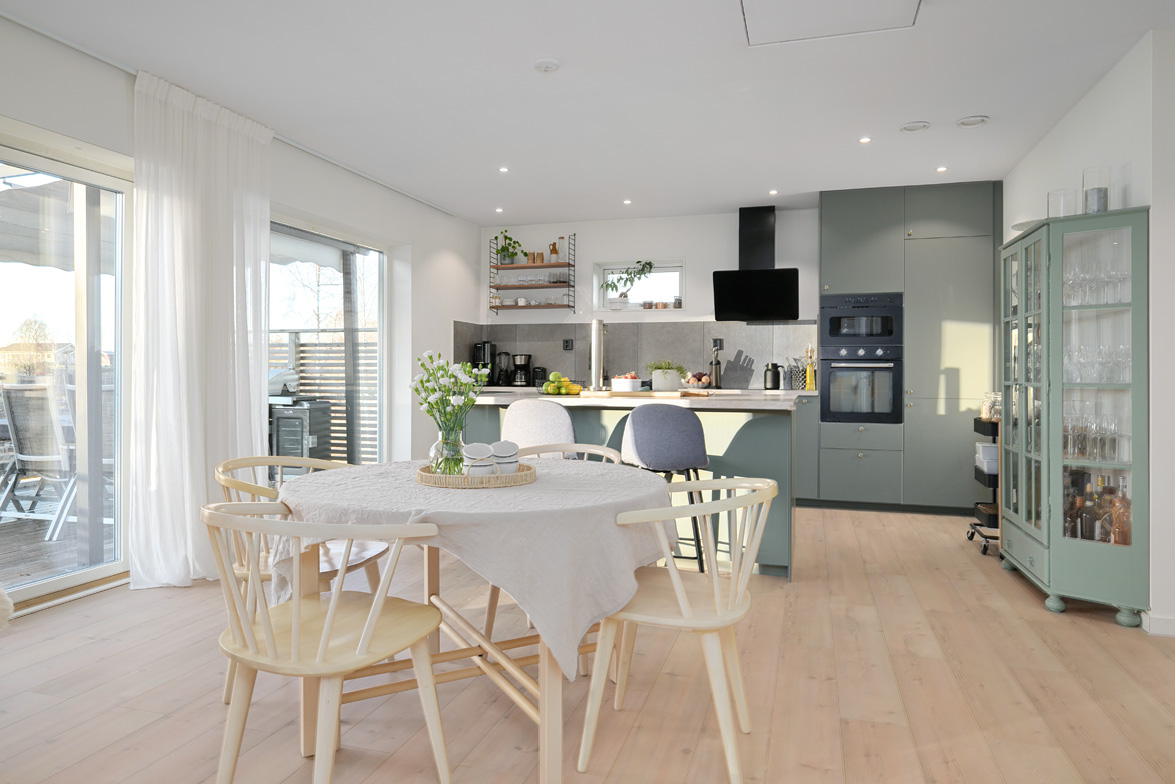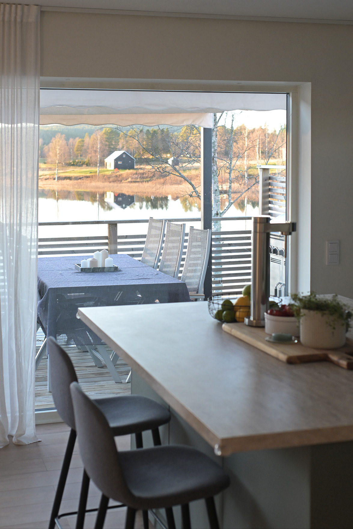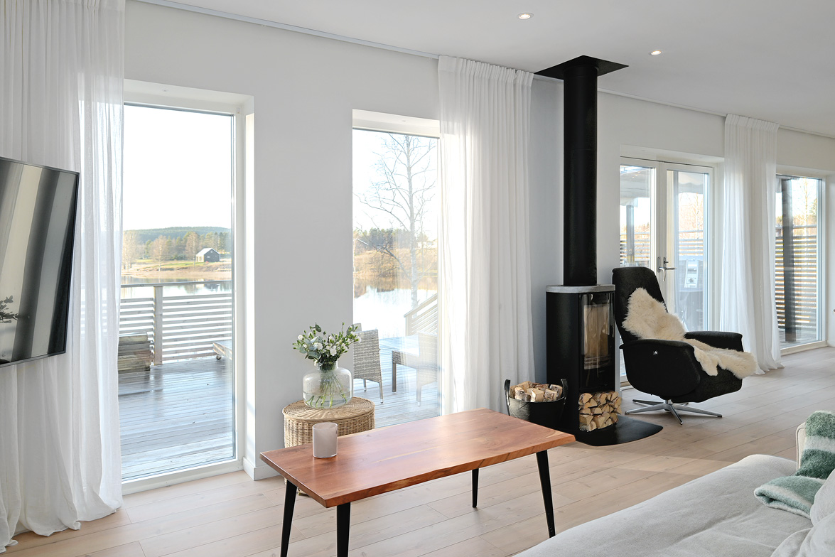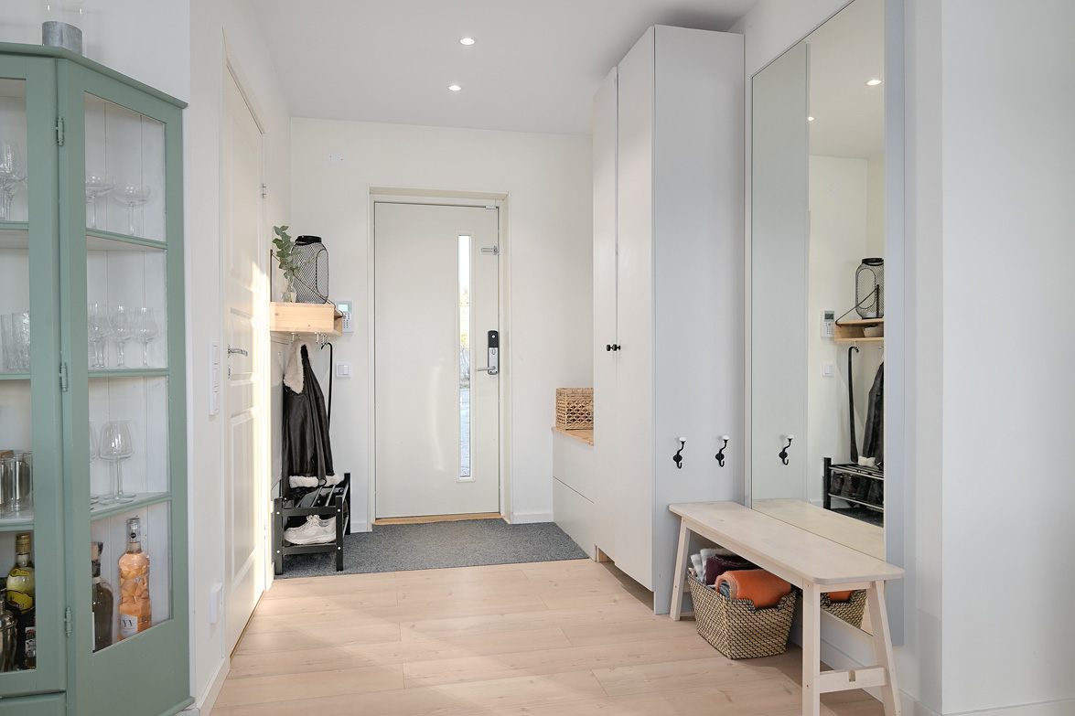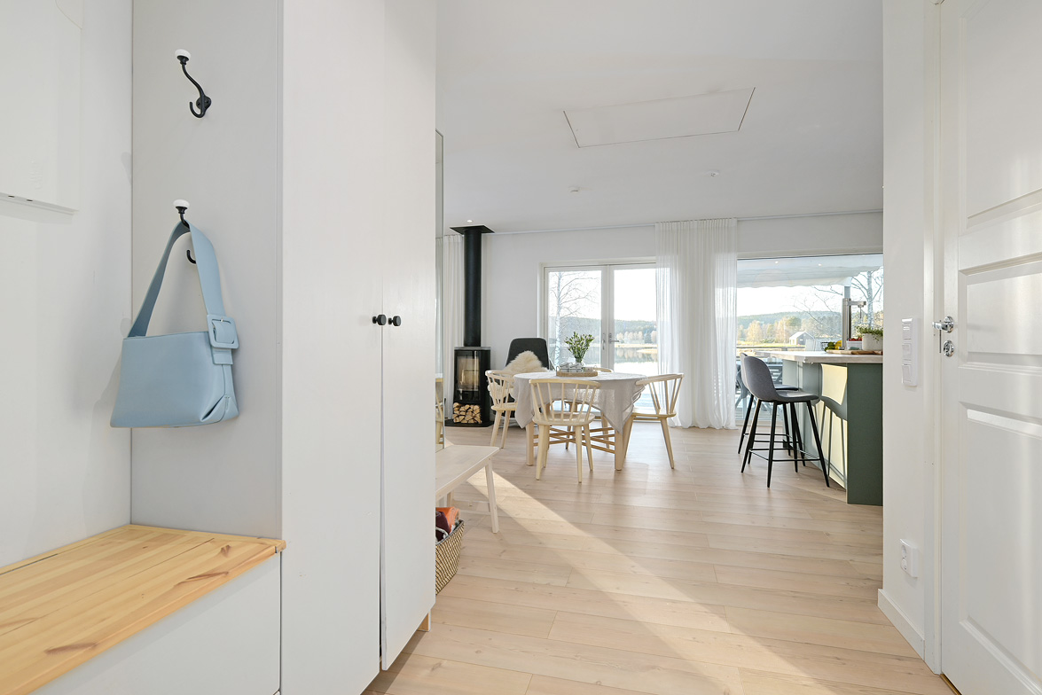 Hall - Laminatgolv, vitmålade väggar. Två garderober. Kök - Stilrent kök, praktisk köksö med sittplats och förvaring, plats för ett matbord. Induktionshäll med fläkt, ugn och micro på praktisk arbetshöjd. Integrerad kyl/frys samt diskmaskin. Infällda spotlights. Vardagsrum - Laminatgolv, vitmålade väggar. Infällda spotlights. Utgång till altan i västerläge mot vattnet. Badrum - Kakel och klinker med golvvärme. Kombimaskin med arbetsbänk, takdusch med vikbara glasdörrar, handfat med kommod, väggskåp samt wc. Sovrum 1 - Laminatgolv, vitmålade väggar. Sovrum 2 - Laminatgolv, vitmålade väggar. Garderobslösning. Altan - Rymlig altan i västerläge, delvis under pergola, altanen ligger mot Pengsjön. Trappa ned till vattnet och brygga med båtplats.