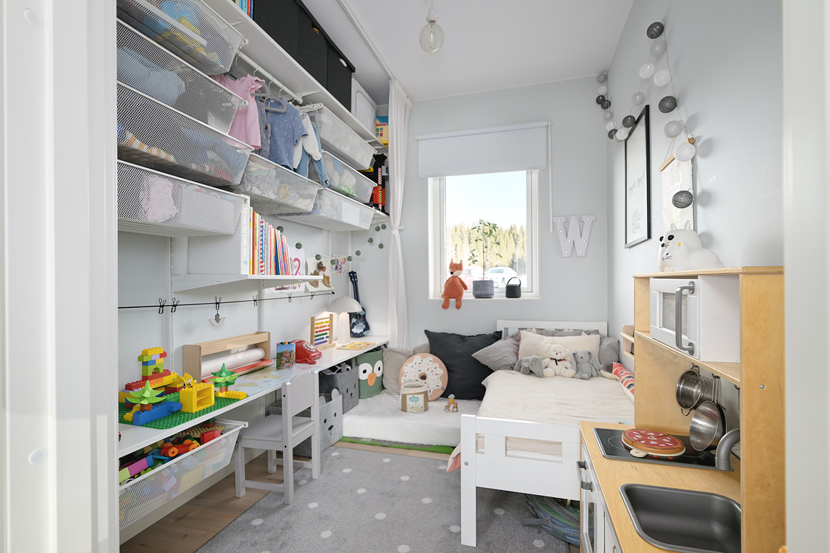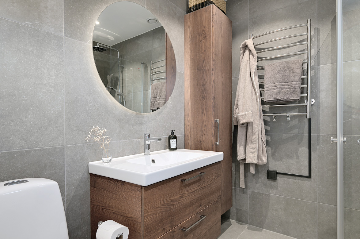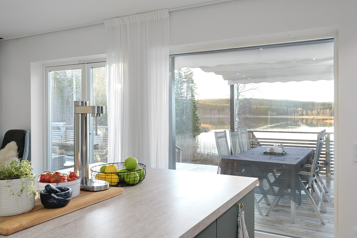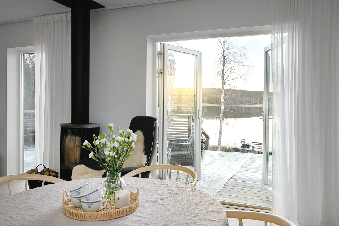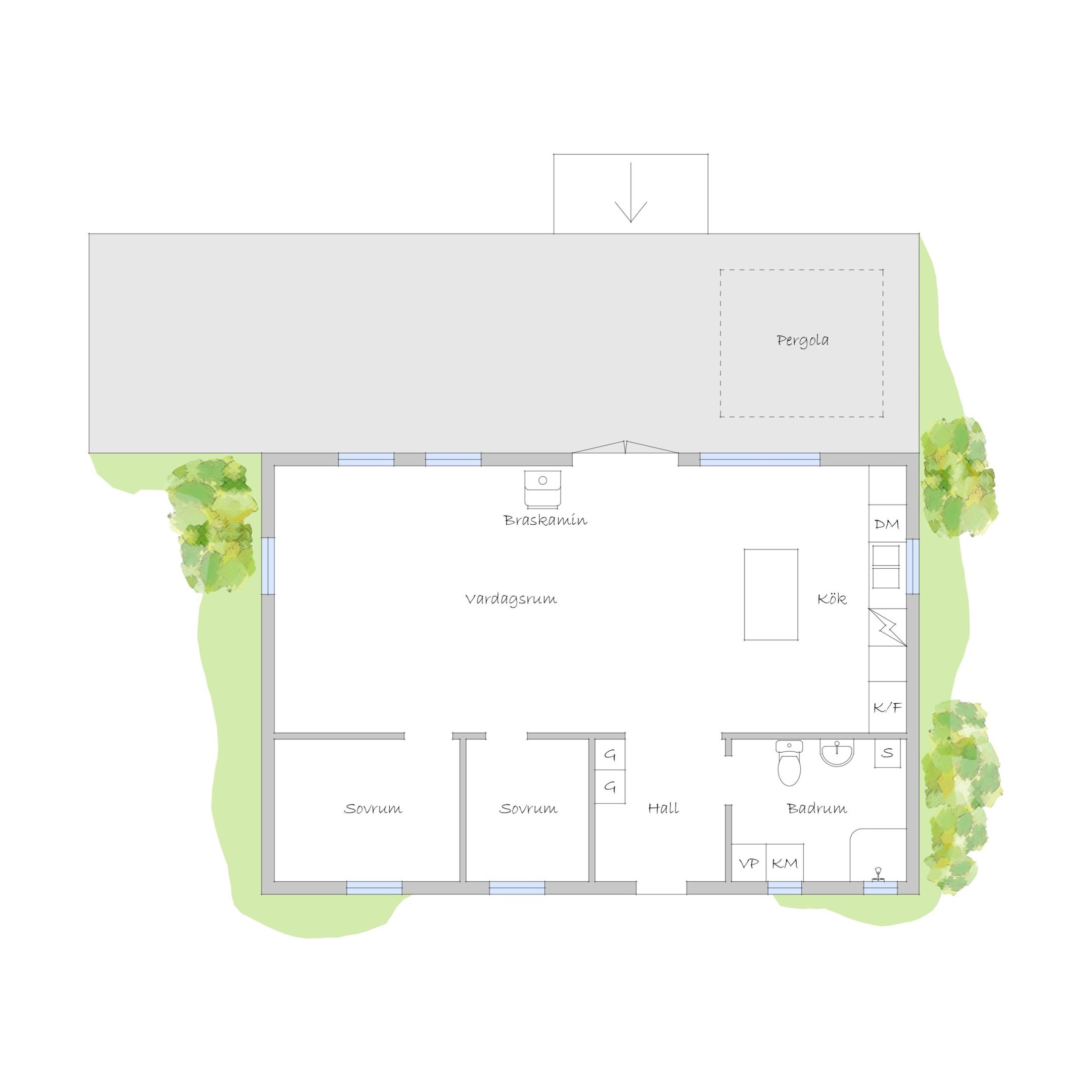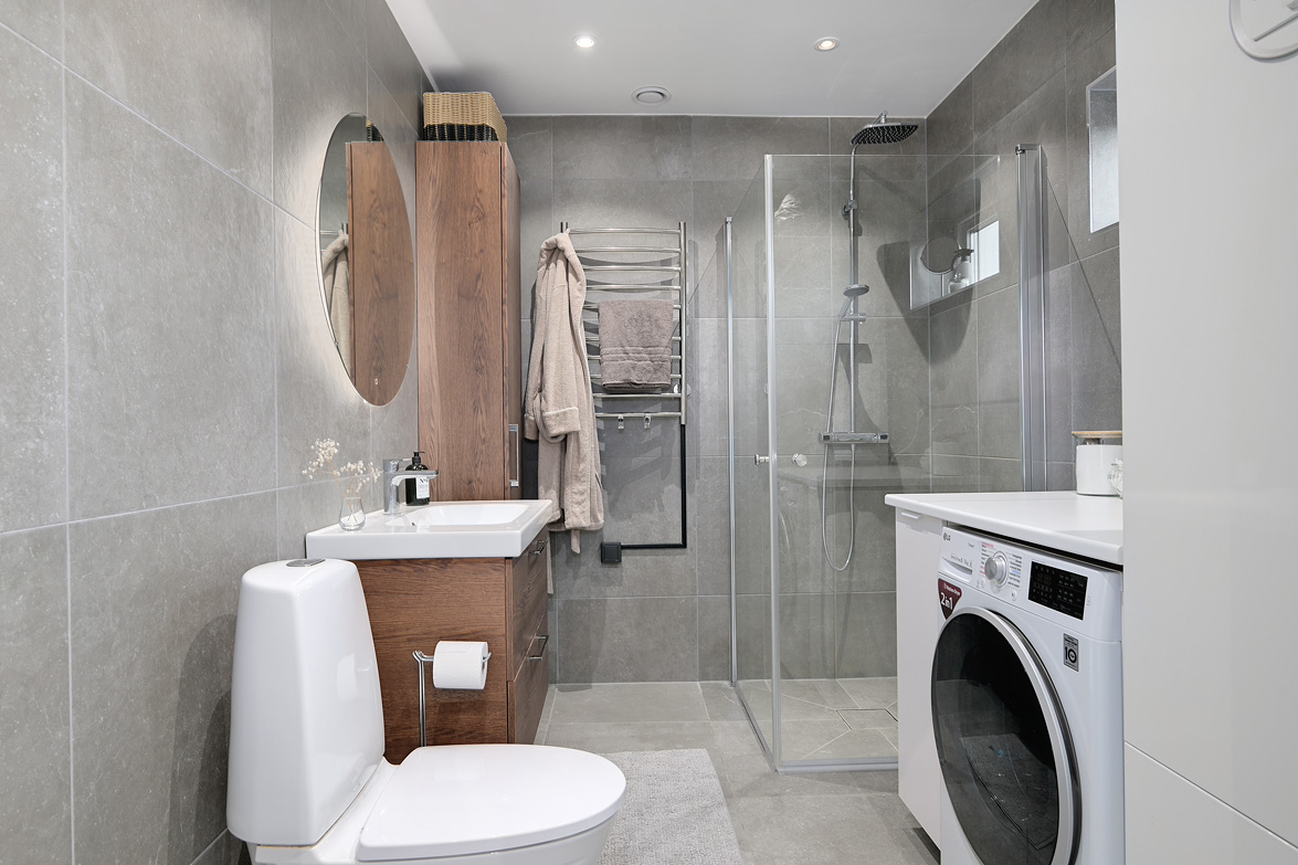 Hall - Laminatgolv, vitmålade väggar. Två garderober. Kök - Stilrent kök, praktisk köksö med sittplats och förvaring, plats för ett matbord. Induktionshäll med fläkt, ugn och micro på praktisk arbetshöjd. Integrerad kyl/frys samt diskmaskin. Infällda spotlights. Vardagsrum - Laminatgolv, vitmålade väggar. Infällda spotlights. Utgång till altan i västerläge mot vattnet. Badrum - Kakel och klinker med golvvärme. Kombimaskin med arbetsbänk, takdusch med vikbara glasdörrar, handfat med kommod, väggskåp samt wc. Sovrum 1 - Laminatgolv, vitmålade väggar. Sovrum 2 - Laminatgolv, vitmålade väggar. Garderobslösning. Altan - Rymlig altan i västerläge, delvis under pergola, altanen ligger mot Pengsjön. Trappa ned till vattnet och brygga med båtplats.