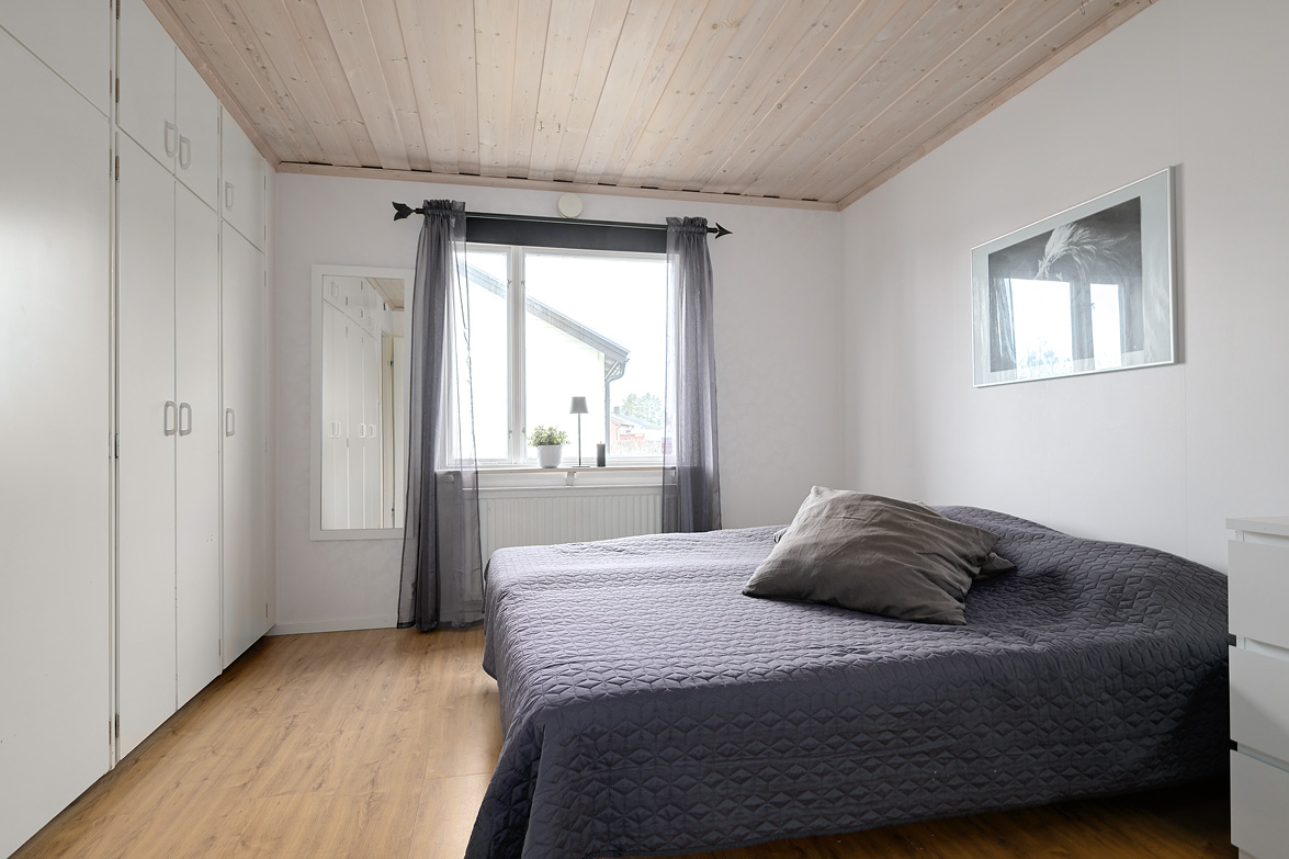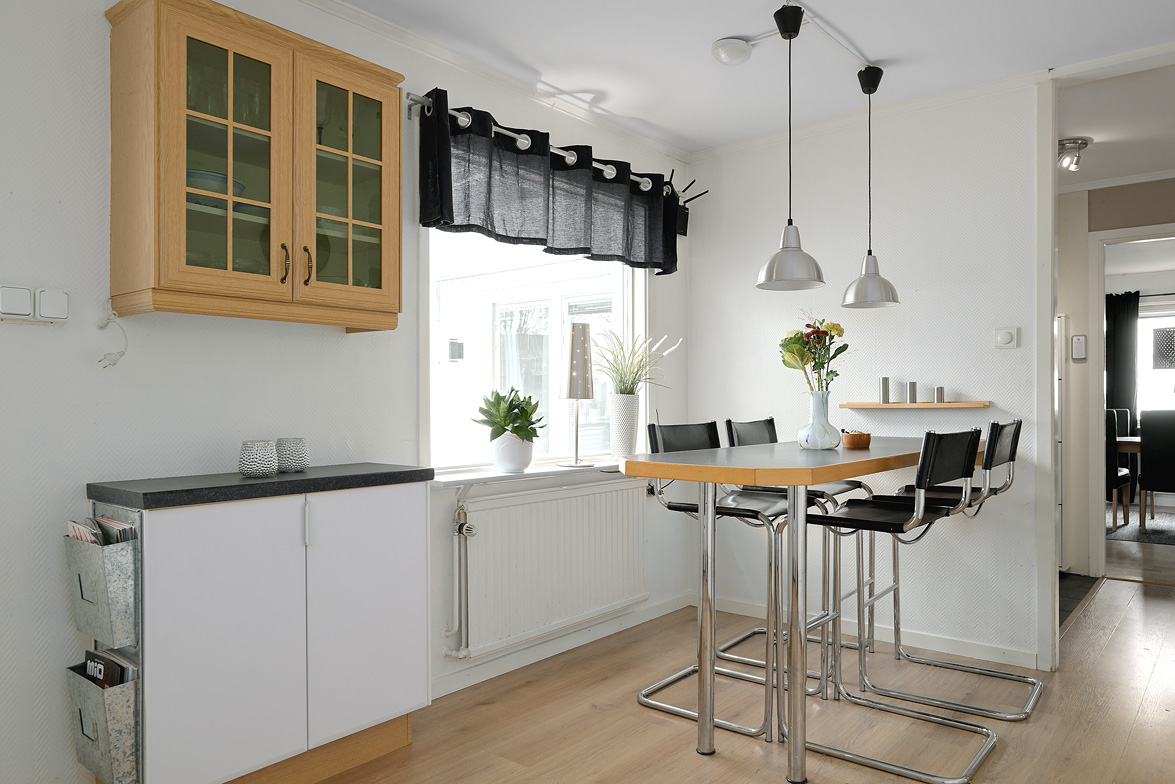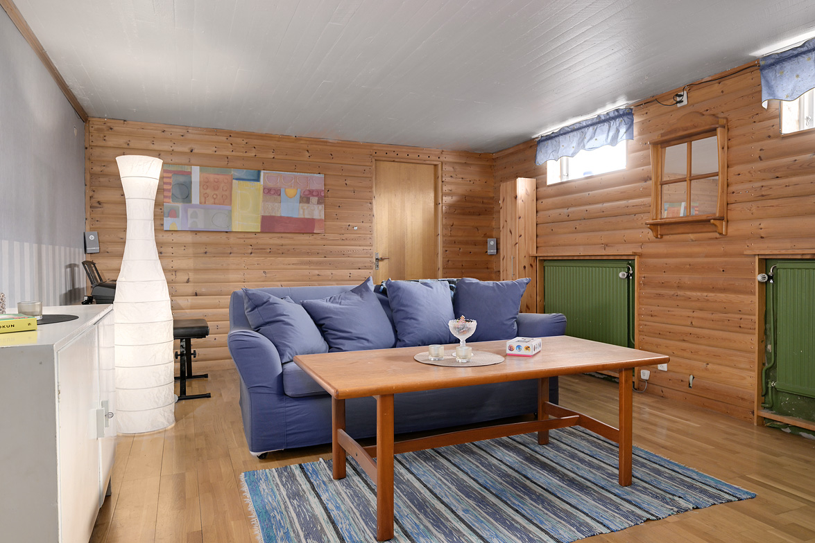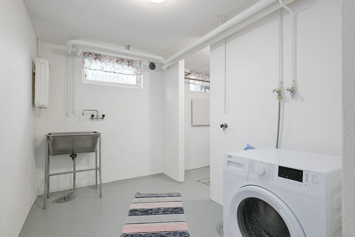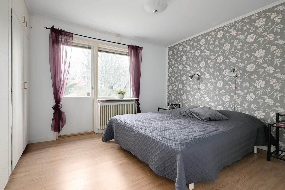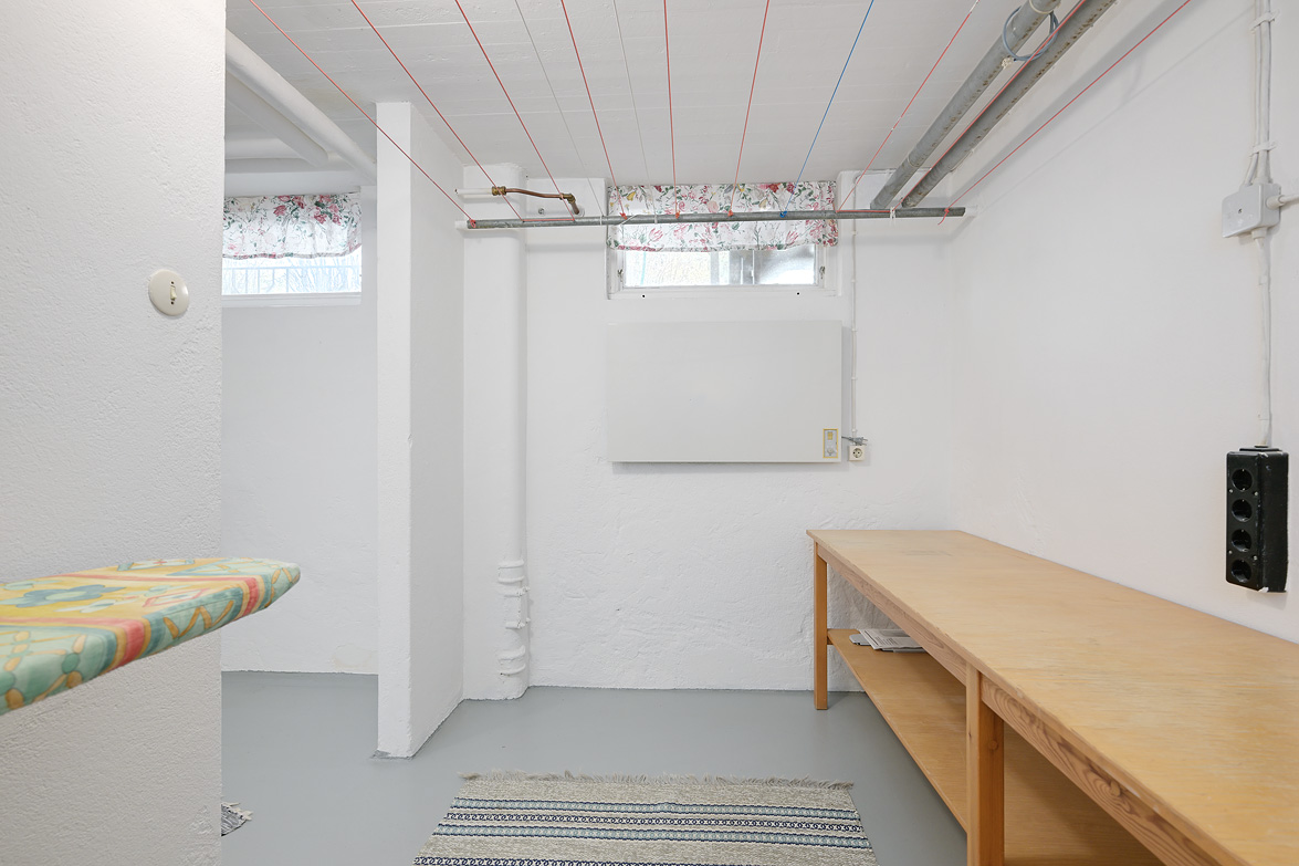 Entrén till huset sker via en fin uppbyggd altan med västerläge. Vid ingången är entrén överbyggd med tak. Hall Hall med grått klinkergolv med vattenburen golvvärme vid ingången, den inre delen av hallen har laminatgolv. Vid entrédörren finns en hatthylla och en dubbelgarderob för avhängning av ytterkläder. Kök och uterum Kök med ljusa luckor, kyl/frys, diskmaskin, spis med häll samt fläkt. Köket har ett platsbyggt matbord. Köket har ett likadant laminatgolv som hallen på väggarna sitter det vit väv. Från köket har man utgång till ett stort inglasat uterum med västerläge. Detta är delvis isolerat och används flitigt vår, sommar och höst. Under korta perioder har det även nyttjats vintertid. Uterummets golv och väggar är isolerade, fönstren är isolerrutor (2- och 3-glas). Taket är ett kraftigt kanalplasttak. Från uterummet har man sedan utgång till en öppen altandel där man kan sitta och njuta under sommarens varmare dagar. Under altanen finns möjlighet till förvaring. Vardagsrum Stort vardagsrum med ekparkett. Väggarna är ljusa med en mörk fondvägg vid matsalsmöbeln. Badrum Äldre badrum med inbyggt badkar. Badrummet har mosaikgolv, väggarna är halvkaklade. I badrummet finns även ett wc med handfat, ovan detta sitter ett spegelskåp. Sovrum Sovrum 1: Stort sovrum med fem fasta garderober, från rummet har man utgång till balkong och trädgård. Sovrummets väggar är vita med en blommig fondvägg, rummet har laminatgolv. Sovrum 2: Vita väggar, mörk fondvägg och laminatgolv. Sovrum 3: Garderobsvägg med två dubbla och två enkla garderober. Sovrummet har laminatgolv, ljusa väggar och en ljus blommönstrad fondvägg. Källare Allrum med parkettgolv och panelväggar. Matkällare/Förråd. Innanför allrummet finns en nedre hall, från denna nås ett förråd under trappen, härifrån nås även en bastu. Sovrum med laminatgolv och ljusa väggar. Badrum med vikdusch, wc och tvättställ med spegel. Badrummet har klinkergolv och kaklade väggar. Förråd med uppgång till gården. Förrådet har parkettgolv och vita väggar. Tvättstuga med målad betong på golv och vägg, här finns tvättmaskin och tvättho. Innanför tvättstugan finns ett torkrum. Pannrum med bergvärmepump Nibe Fighter 1215, bergvärmen är ansluten till ett ca 185 m djupt hål. Pannrummet i övrigt används idag som förråd. I källaren finns en woods avfuktare samt en frysbox. Källaren är 2014 omdränerad med platonmatta och dagvattenanslutning. I samband med omdräneringen så tilläggsisolerades källargrundmuren på utsidan med 20 cm isolering.