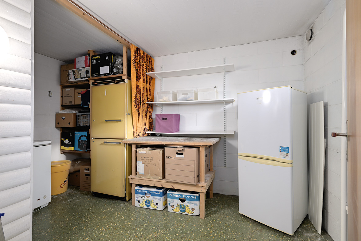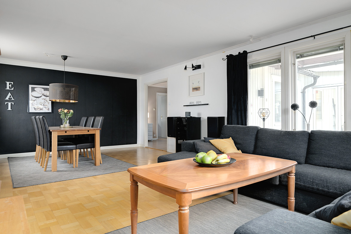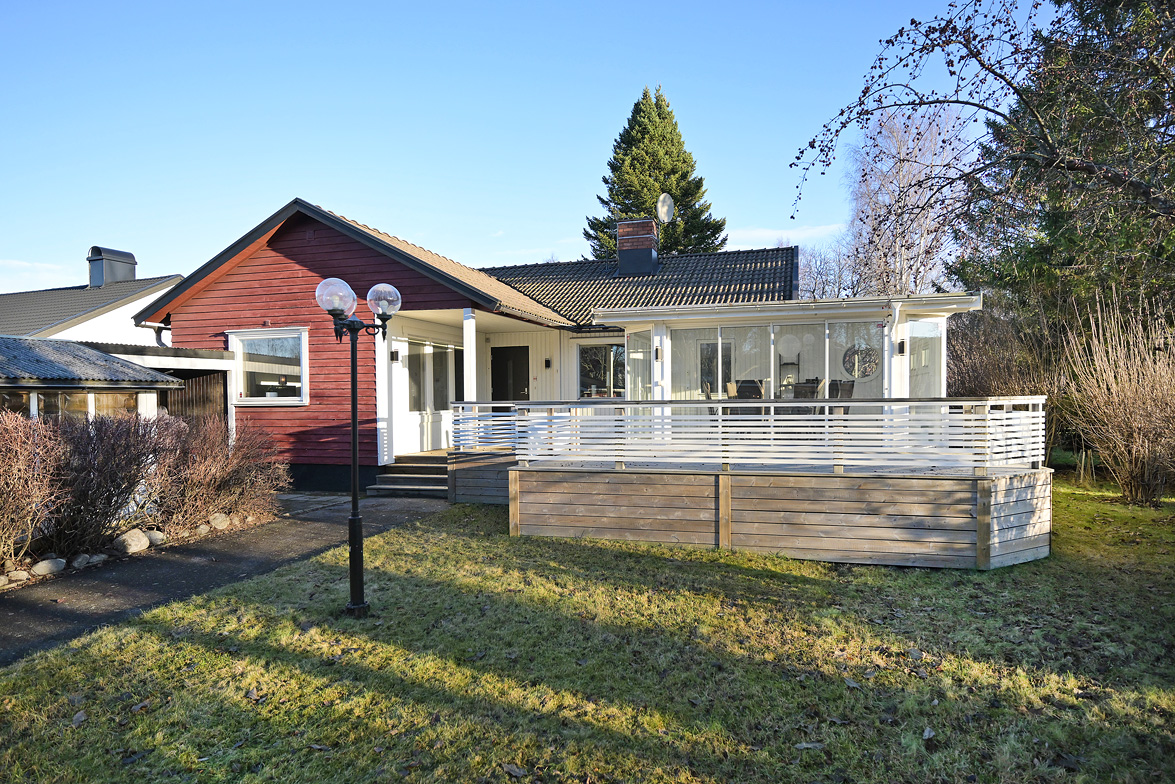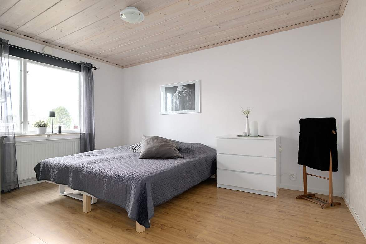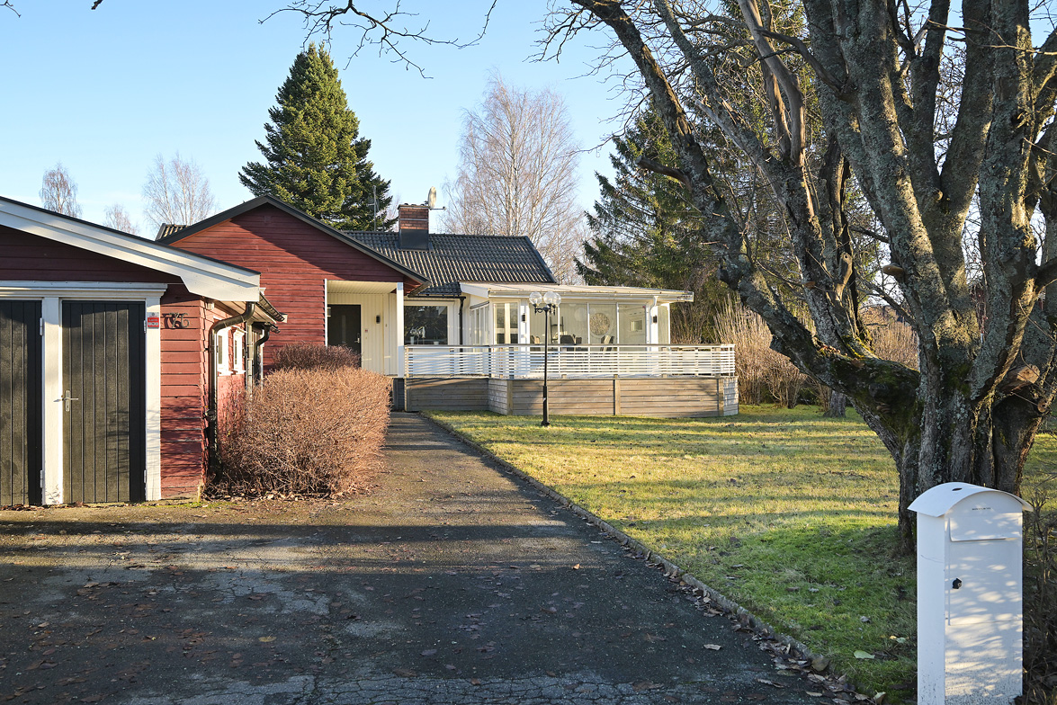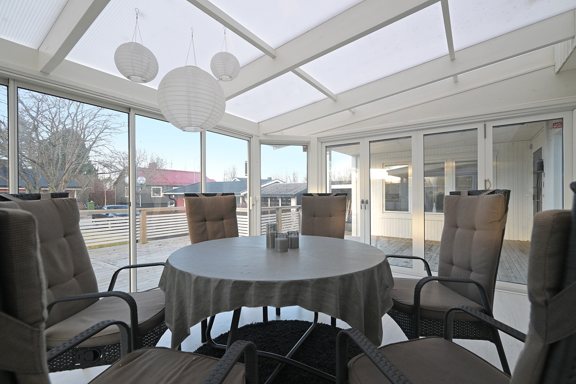 Entrén till huset sker via en fin uppbyggd altan med västerläge. Vid ingången är entrén överbyggd med tak. Hall Hall med grått klinkergolv med vattenburen golvvärme vid ingången, den inre delen av hallen har laminatgolv. Vid entrédörren finns en hatthylla och en dubbelgarderob för avhängning av ytterkläder. Kök och uterum Kök med ljusa luckor, kyl/frys, diskmaskin, spis med häll samt fläkt. Köket har ett platsbyggt matbord. Köket har ett likadant laminatgolv som hallen på väggarna sitter det vit väv. Från köket har man utgång till ett stort inglasat uterum med västerläge. Detta är delvis isolerat och används flitigt vår, sommar och höst. Under korta perioder har det även nyttjats vintertid. Uterummets golv och väggar är isolerade, fönstren är isolerrutor (2- och 3-glas). Taket är ett kraftigt kanalplasttak. Från uterummet har man sedan utgång till en öppen altandel där man kan sitta och njuta under sommarens varmare dagar. Under altanen finns möjlighet till förvaring. Vardagsrum Stort vardagsrum med ekparkett. Väggarna är ljusa med en mörk fondvägg vid matsalsmöbeln. Badrum Äldre badrum med inbyggt badkar. Badrummet har mosaikgolv, väggarna är halvkaklade. I badrummet finns även ett wc med handfat, ovan detta sitter ett spegelskåp. Sovrum Sovrum 1: Stort sovrum med fem fasta garderober, från rummet har man utgång till balkong och trädgård. Sovrummets väggar är vita med en blommig fondvägg, rummet har laminatgolv. Sovrum 2: Vita väggar, mörk fondvägg och laminatgolv. Sovrum 3: Garderobsvägg med två dubbla och två enkla garderober. Sovrummet har laminatgolv, ljusa väggar och en ljus blommönstrad fondvägg. Källare Allrum med parkettgolv och panelväggar. Matkällare/Förråd. Innanför allrummet finns en nedre hall, från denna nås ett förråd under trappen, härifrån nås även en bastu. Sovrum med laminatgolv och ljusa väggar. Badrum med vikdusch, wc och tvättställ med spegel. Badrummet har klinkergolv och kaklade väggar. Förråd med uppgång till gården. Förrådet har parkettgolv och vita väggar. Tvättstuga med målad betong på golv och vägg, här finns tvättmaskin och tvättho. Innanför tvättstugan finns ett torkrum. Pannrum med bergvärmepump Nibe Fighter 1215, bergvärmen är ansluten till ett ca 185 m djupt hål. Pannrummet i övrigt används idag som förråd. I källaren finns en woods avfuktare samt en frysbox. Källaren är 2014 omdränerad med platonmatta och dagvattenanslutning. I samband med omdräneringen så tilläggsisolerades källargrundmuren på utsidan med 20 cm isolering.