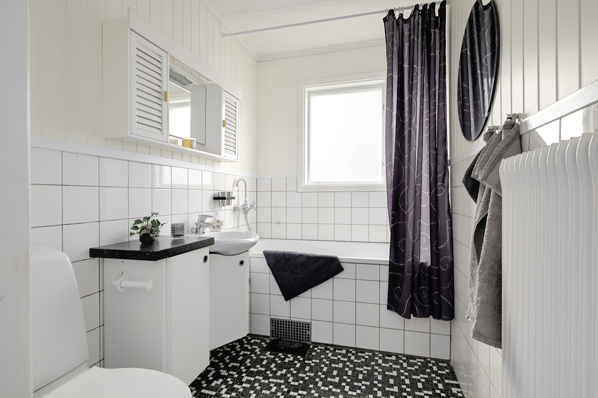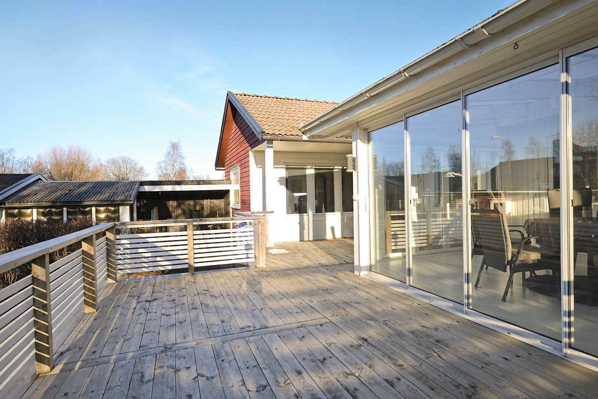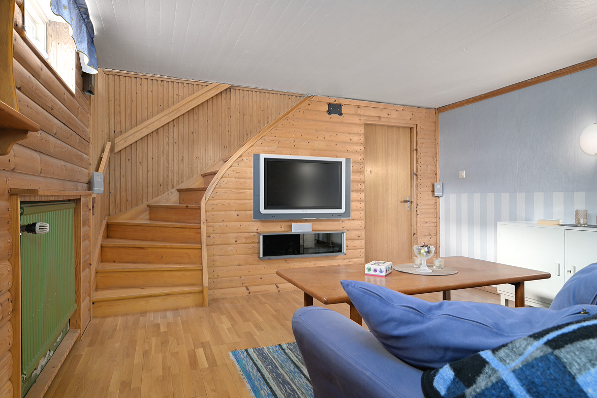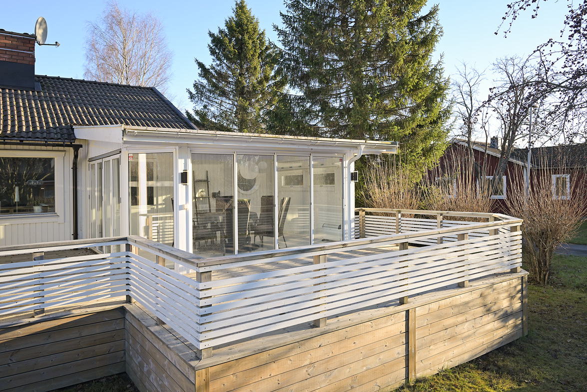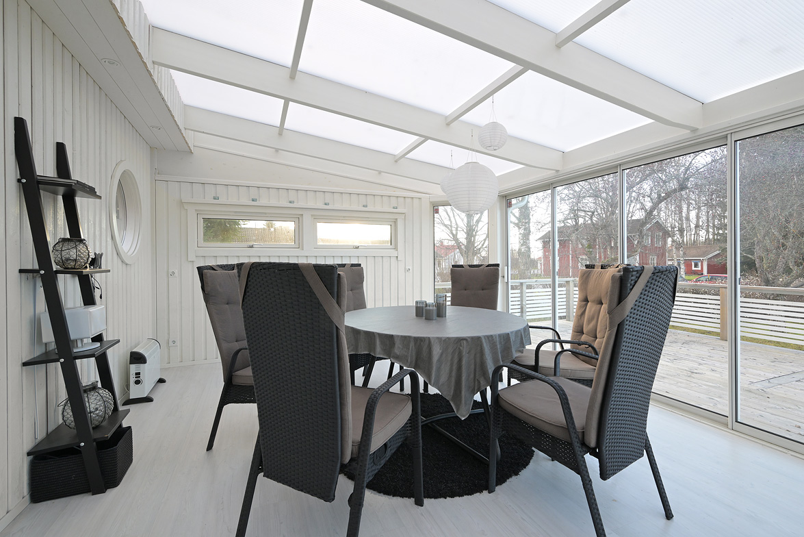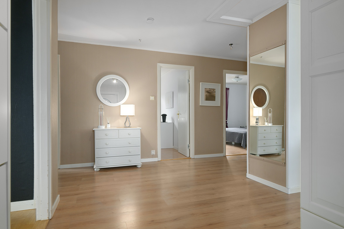 Entrén till huset sker via en fin uppbyggd altan med västerläge. Vid ingången är entrén överbyggd med tak. Hall Hall med grått klinkergolv med vattenburen golvvärme vid ingången, den inre delen av hallen har laminatgolv. Vid entrédörren finns en hatthylla och en dubbelgarderob för avhängning av ytterkläder. Kök och uterum Kök med ljusa luckor, kyl/frys, diskmaskin, spis med häll samt fläkt. Köket har ett platsbyggt matbord. Köket har ett likadant laminatgolv som hallen på väggarna sitter det vit väv. Från köket har man utgång till ett stort inglasat uterum med västerläge. Detta är delvis isolerat och används flitigt vår, sommar och höst. Under korta perioder har det även nyttjats vintertid. Uterummets golv och väggar är isolerade, fönstren är isolerrutor (2- och 3-glas). Taket är ett kraftigt kanalplasttak. Från uterummet har man sedan utgång till en öppen altandel där man kan sitta och njuta under sommarens varmare dagar. Under altanen finns möjlighet till förvaring. Vardagsrum Stort vardagsrum med ekparkett. Väggarna är ljusa med en mörk fondvägg vid matsalsmöbeln. Badrum Äldre badrum med inbyggt badkar. Badrummet har mosaikgolv, väggarna är halvkaklade. I badrummet finns även ett wc med handfat, ovan detta sitter ett spegelskåp. Sovrum Sovrum 1: Stort sovrum med fem fasta garderober, från rummet har man utgång till balkong och trädgård. Sovrummets väggar är vita med en blommig fondvägg, rummet har laminatgolv. Sovrum 2: Vita väggar, mörk fondvägg och laminatgolv. Sovrum 3: Garderobsvägg med två dubbla och två enkla garderober. Sovrummet har laminatgolv, ljusa väggar och en ljus blommönstrad fondvägg. Källare Allrum med parkettgolv och panelväggar. Matkällare/Förråd. Innanför allrummet finns en nedre hall, från denna nås ett förråd under trappen, härifrån nås även en bastu. Sovrum med laminatgolv och ljusa väggar. Badrum med vikdusch, wc och tvättställ med spegel. Badrummet har klinkergolv och kaklade väggar. Förråd med uppgång till gården. Förrådet har parkettgolv och vita väggar. Tvättstuga med målad betong på golv och vägg, här finns tvättmaskin och tvättho. Innanför tvättstugan finns ett torkrum. Pannrum med bergvärmepump Nibe Fighter 1215, bergvärmen är ansluten till ett ca 185 m djupt hål. Pannrummet i övrigt används idag som förråd. I källaren finns en woods avfuktare samt en frysbox. Källaren är 2014 omdränerad med platonmatta och dagvattenanslutning. I samband med omdräneringen så tilläggsisolerades källargrundmuren på utsidan med 20 cm isolering.