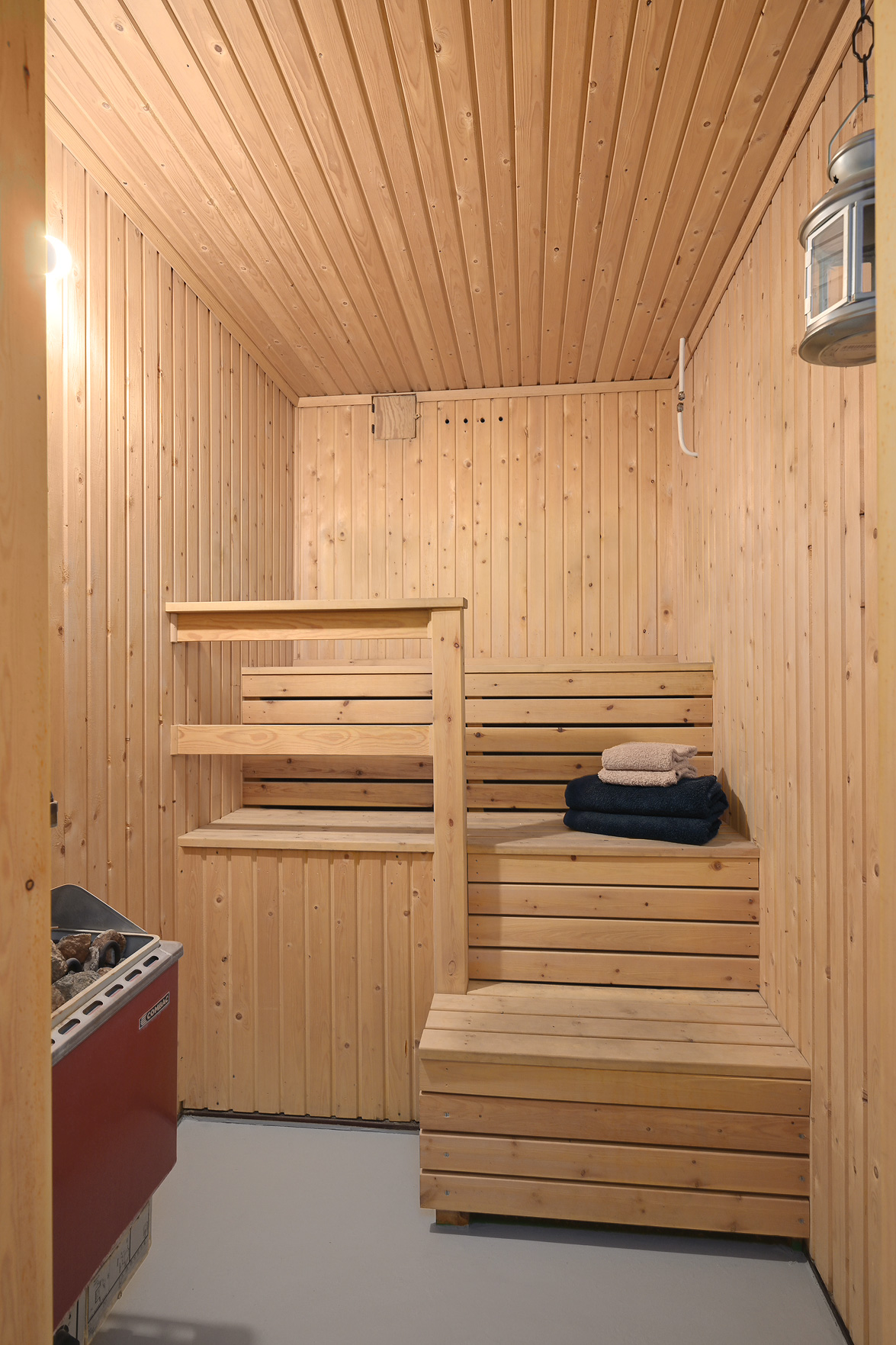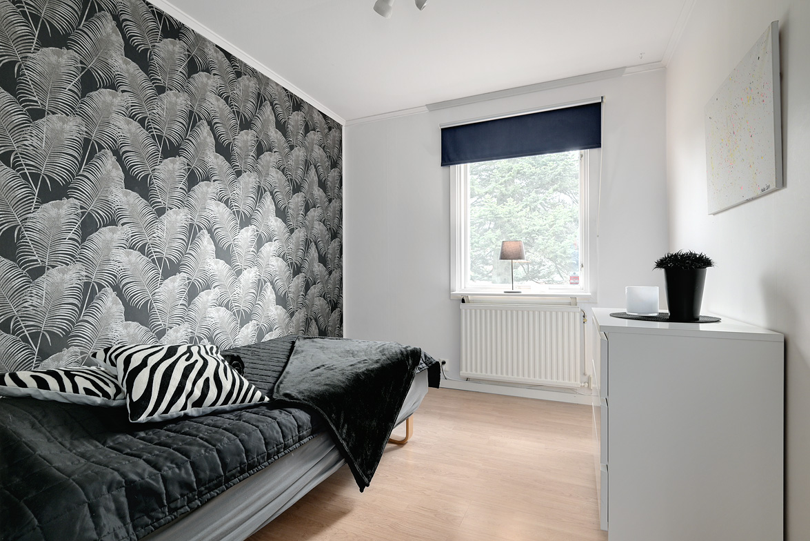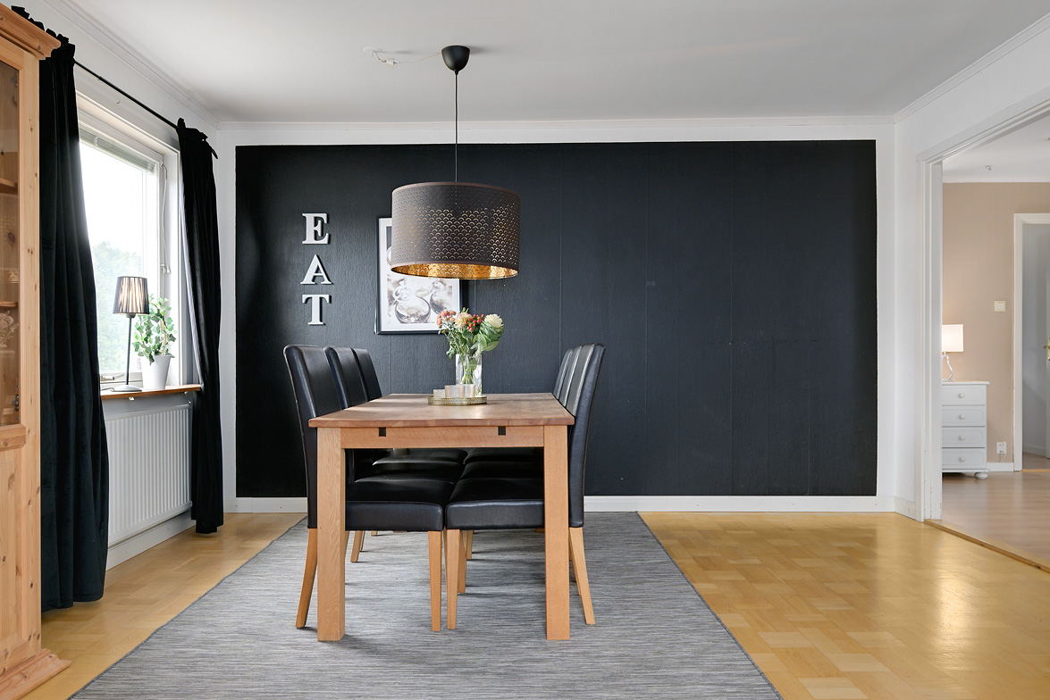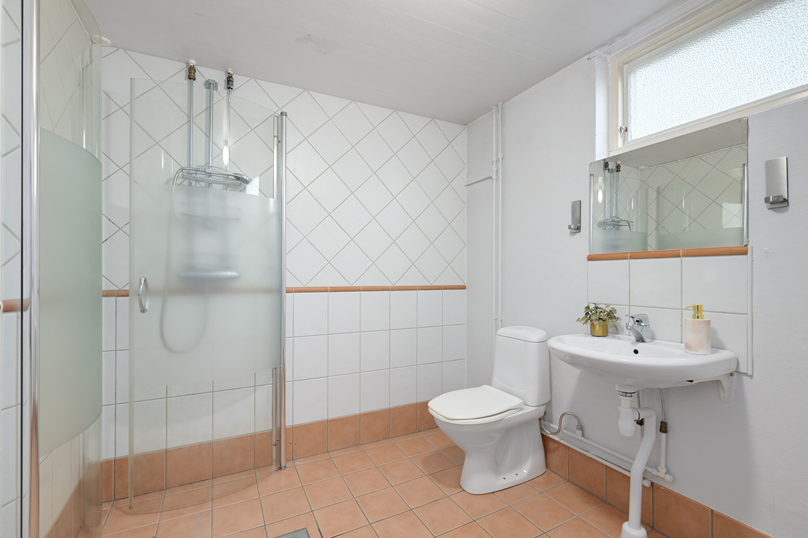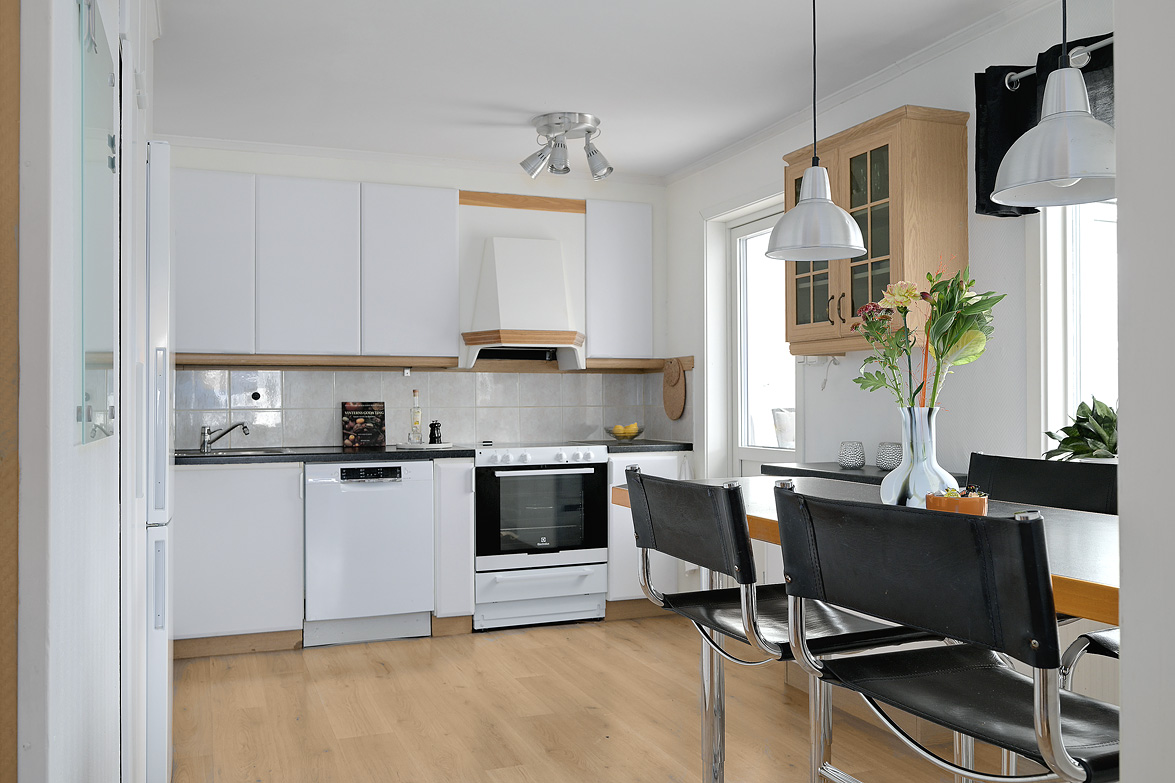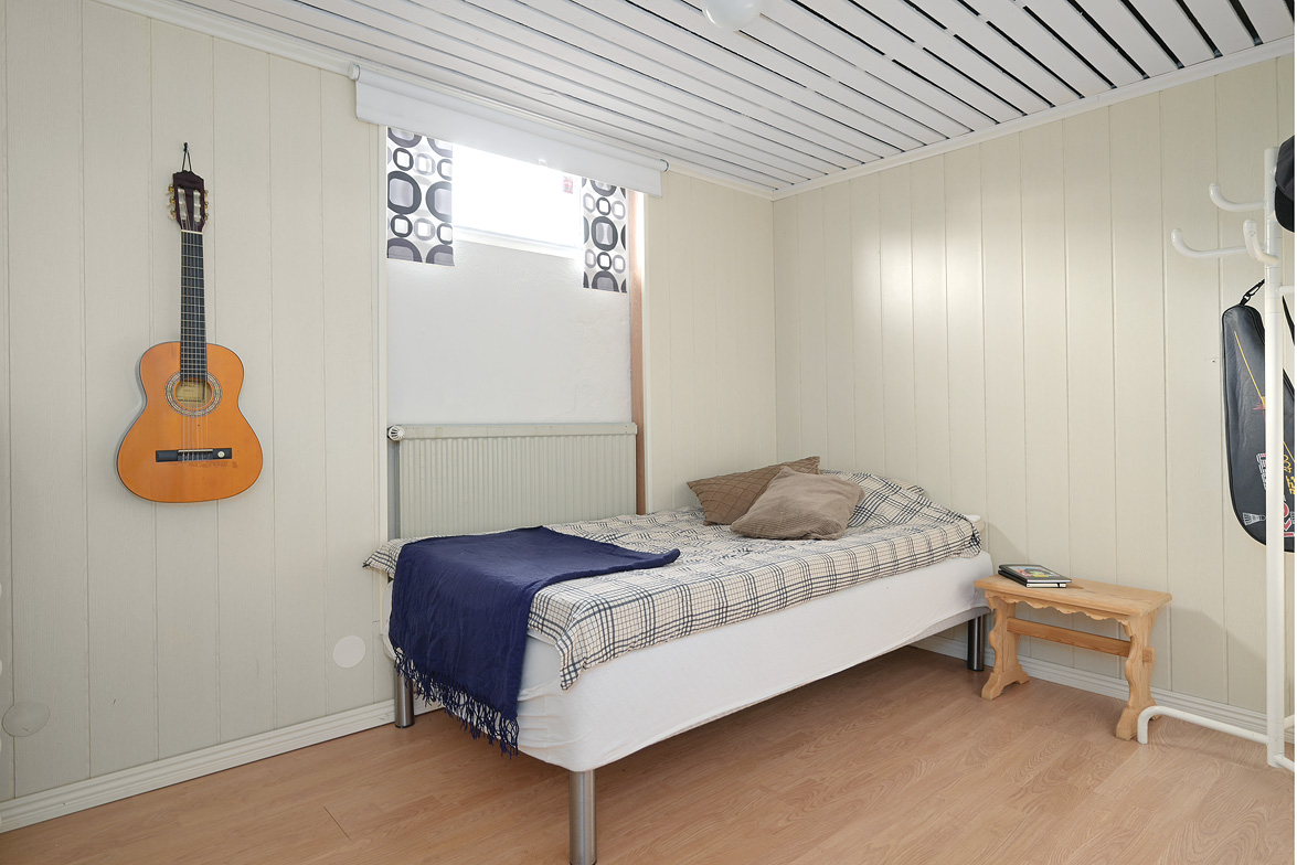 Entrén till huset sker via en fin uppbyggd altan med västerläge. Vid ingången är entrén överbyggd med tak. Hall Hall med grått klinkergolv med vattenburen golvvärme vid ingången, den inre delen av hallen har laminatgolv. Vid entrédörren finns en hatthylla och en dubbelgarderob för avhängning av ytterkläder. Kök och uterum Kök med ljusa luckor, kyl/frys, diskmaskin, spis med häll samt fläkt. Köket har ett platsbyggt matbord. Köket har ett likadant laminatgolv som hallen på väggarna sitter det vit väv. Från köket har man utgång till ett stort inglasat uterum med västerläge. Detta är delvis isolerat och används flitigt vår, sommar och höst. Under korta perioder har det även nyttjats vintertid. Uterummets golv och väggar är isolerade, fönstren är isolerrutor (2- och 3-glas). Taket är ett kraftigt kanalplasttak. Från uterummet har man sedan utgång till en öppen altandel där man kan sitta och njuta under sommarens varmare dagar. Under altanen finns möjlighet till förvaring. Vardagsrum Stort vardagsrum med ekparkett. Väggarna är ljusa med en mörk fondvägg vid matsalsmöbeln. Badrum Äldre badrum med inbyggt badkar. Badrummet har mosaikgolv, väggarna är halvkaklade. I badrummet finns även ett wc med handfat, ovan detta sitter ett spegelskåp. Sovrum Sovrum 1: Stort sovrum med fem fasta garderober, från rummet har man utgång till balkong och trädgård. Sovrummets väggar är vita med en blommig fondvägg, rummet har laminatgolv. Sovrum 2: Vita väggar, mörk fondvägg och laminatgolv. Sovrum 3: Garderobsvägg med två dubbla och två enkla garderober. Sovrummet har laminatgolv, ljusa väggar och en ljus blommönstrad fondvägg. Källare Allrum med parkettgolv och panelväggar. Matkällare/Förråd. Innanför allrummet finns en nedre hall, från denna nås ett förråd under trappen, härifrån nås även en bastu. Sovrum med laminatgolv och ljusa väggar. Badrum med vikdusch, wc och tvättställ med spegel. Badrummet har klinkergolv och kaklade väggar. Förråd med uppgång till gården. Förrådet har parkettgolv och vita väggar. Tvättstuga med målad betong på golv och vägg, här finns tvättmaskin och tvättho. Innanför tvättstugan finns ett torkrum. Pannrum med bergvärmepump Nibe Fighter 1215, bergvärmen är ansluten till ett ca 185 m djupt hål. Pannrummet i övrigt används idag som förråd. I källaren finns en woods avfuktare samt en frysbox. Källaren är 2014 omdränerad med platonmatta och dagvattenanslutning. I samband med omdräneringen så tilläggsisolerades källargrundmuren på utsidan med 20 cm isolering.