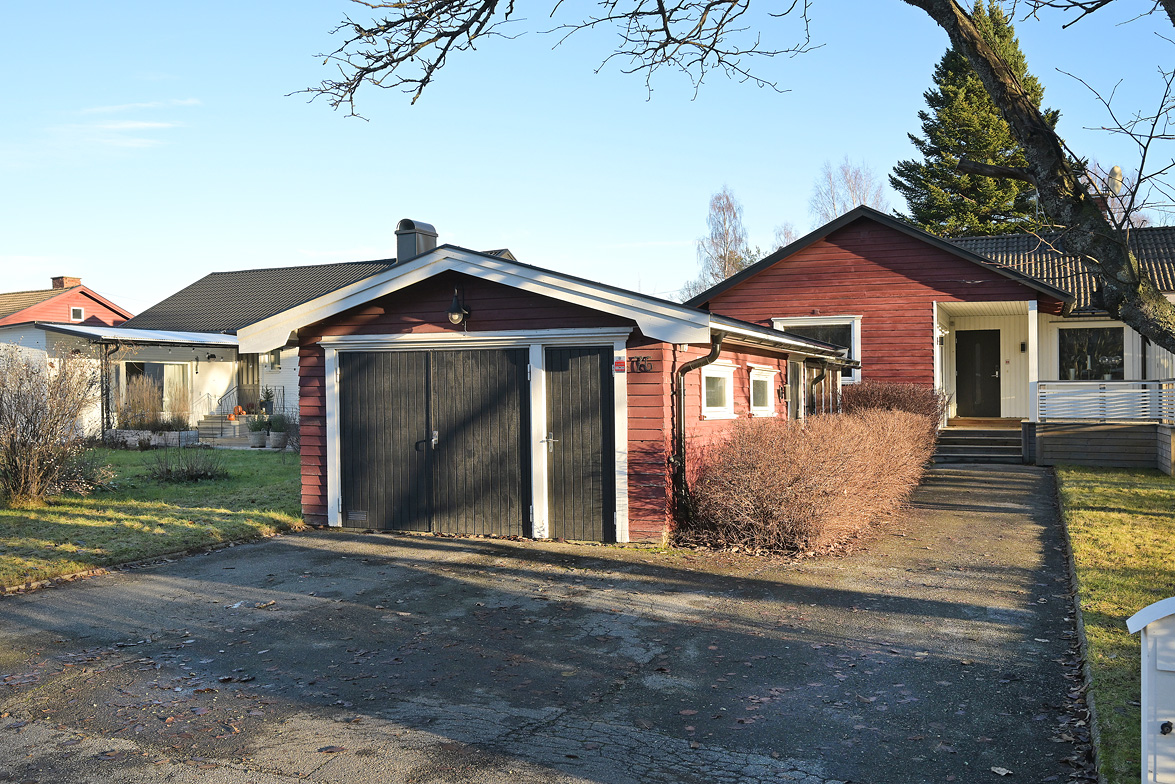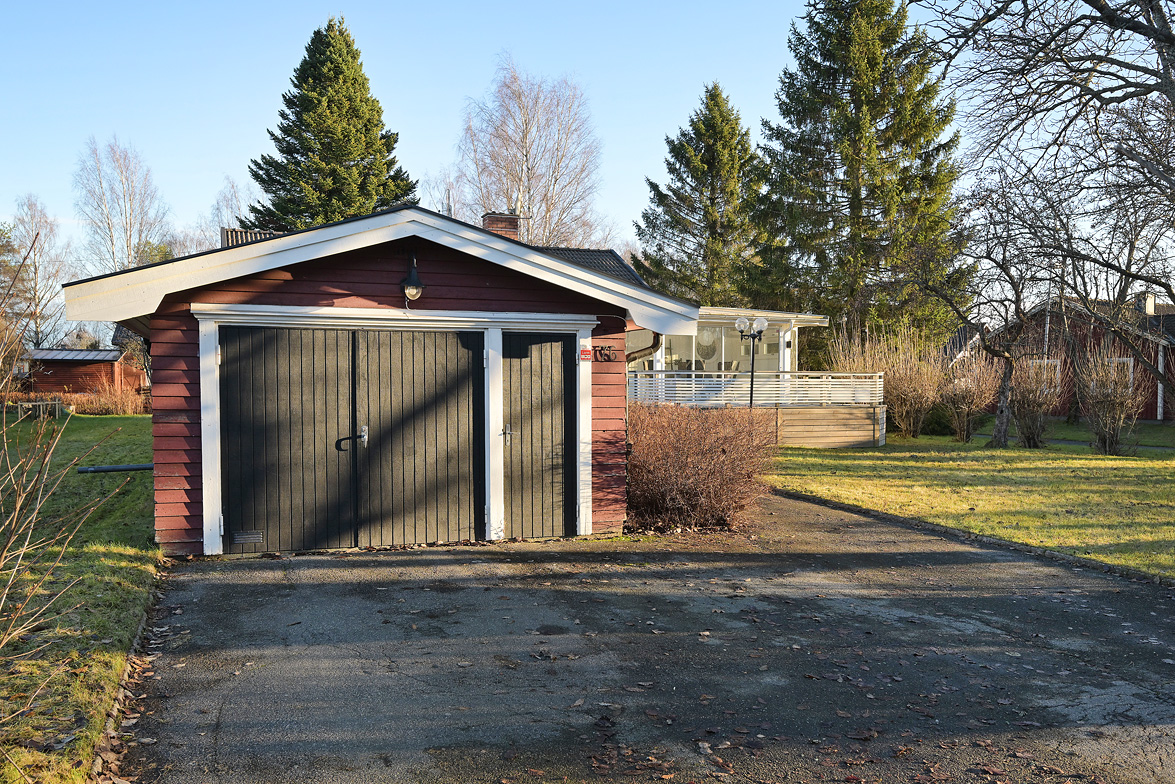 På gården finns ett rymligt varmgarage och ett överbyggt cykelförråd. Garaget har nytt papptak.