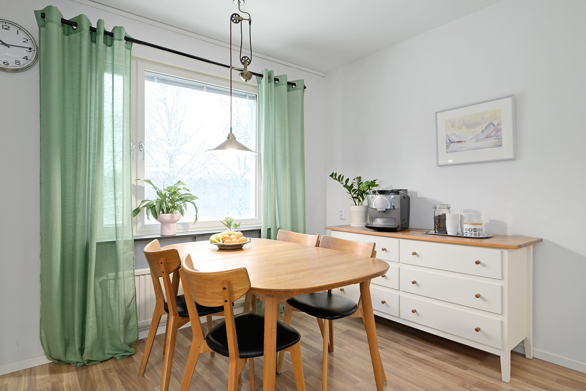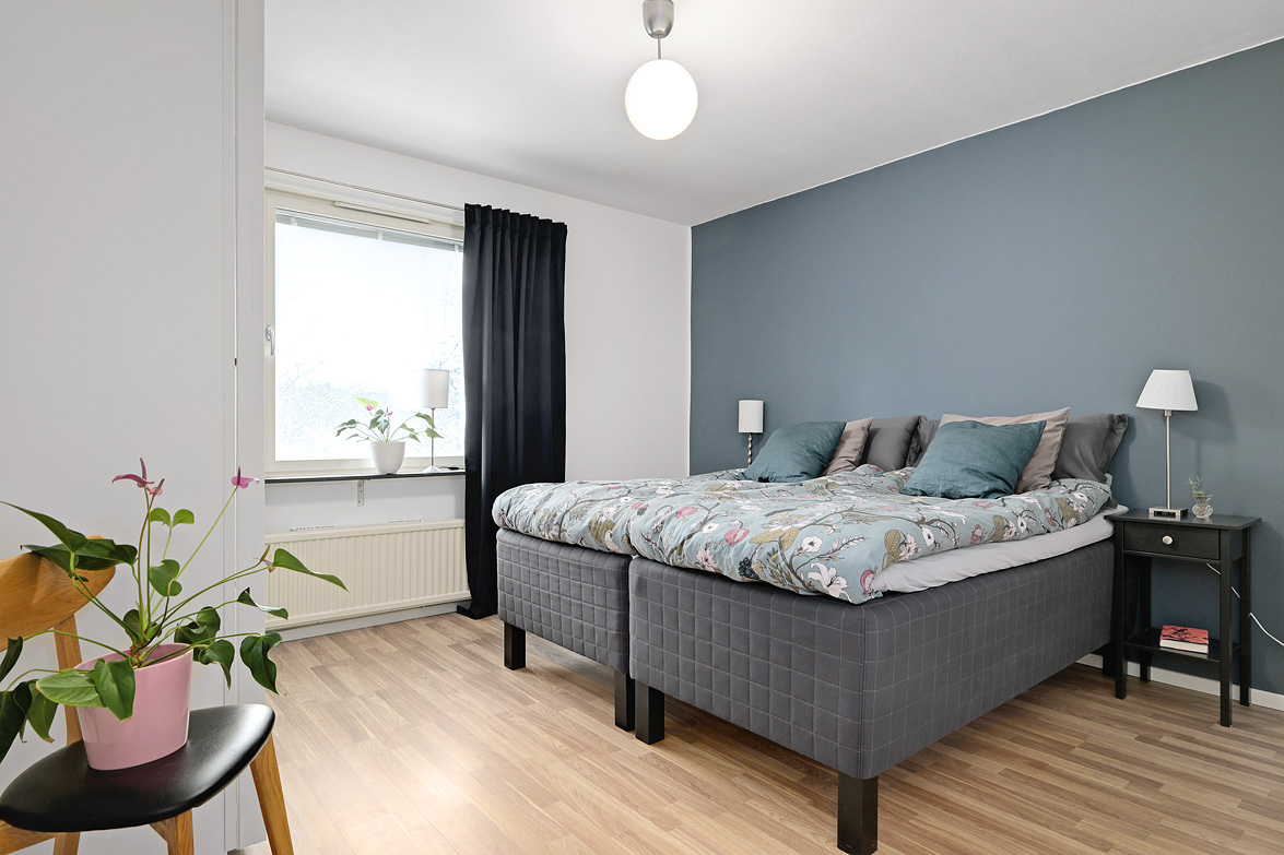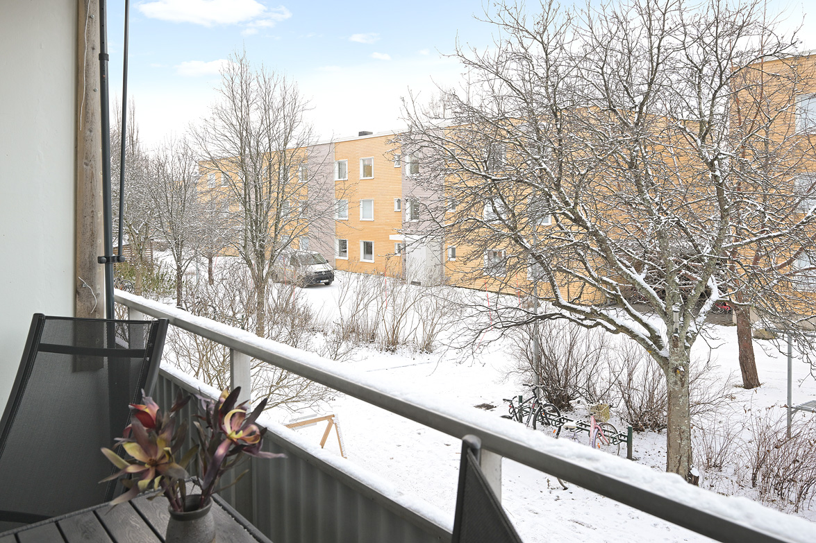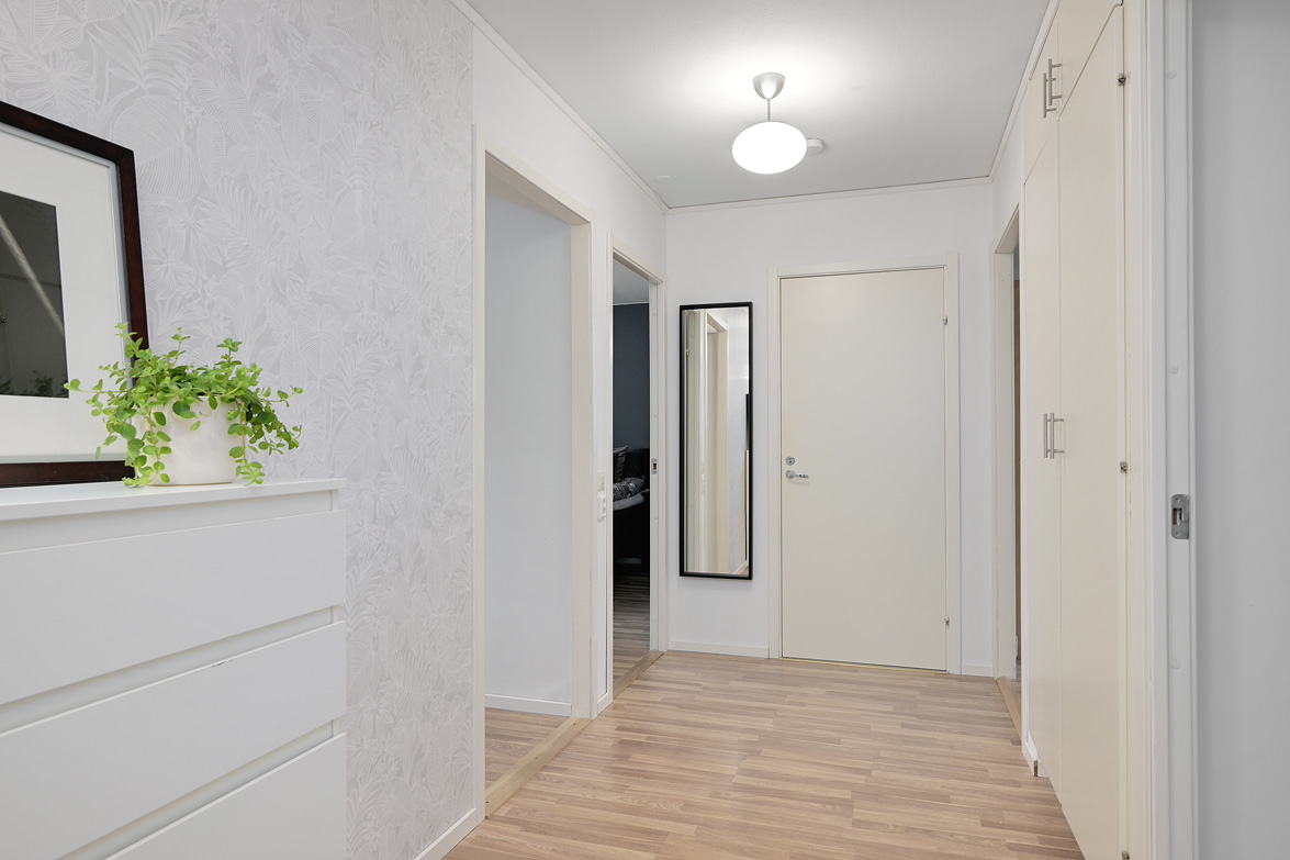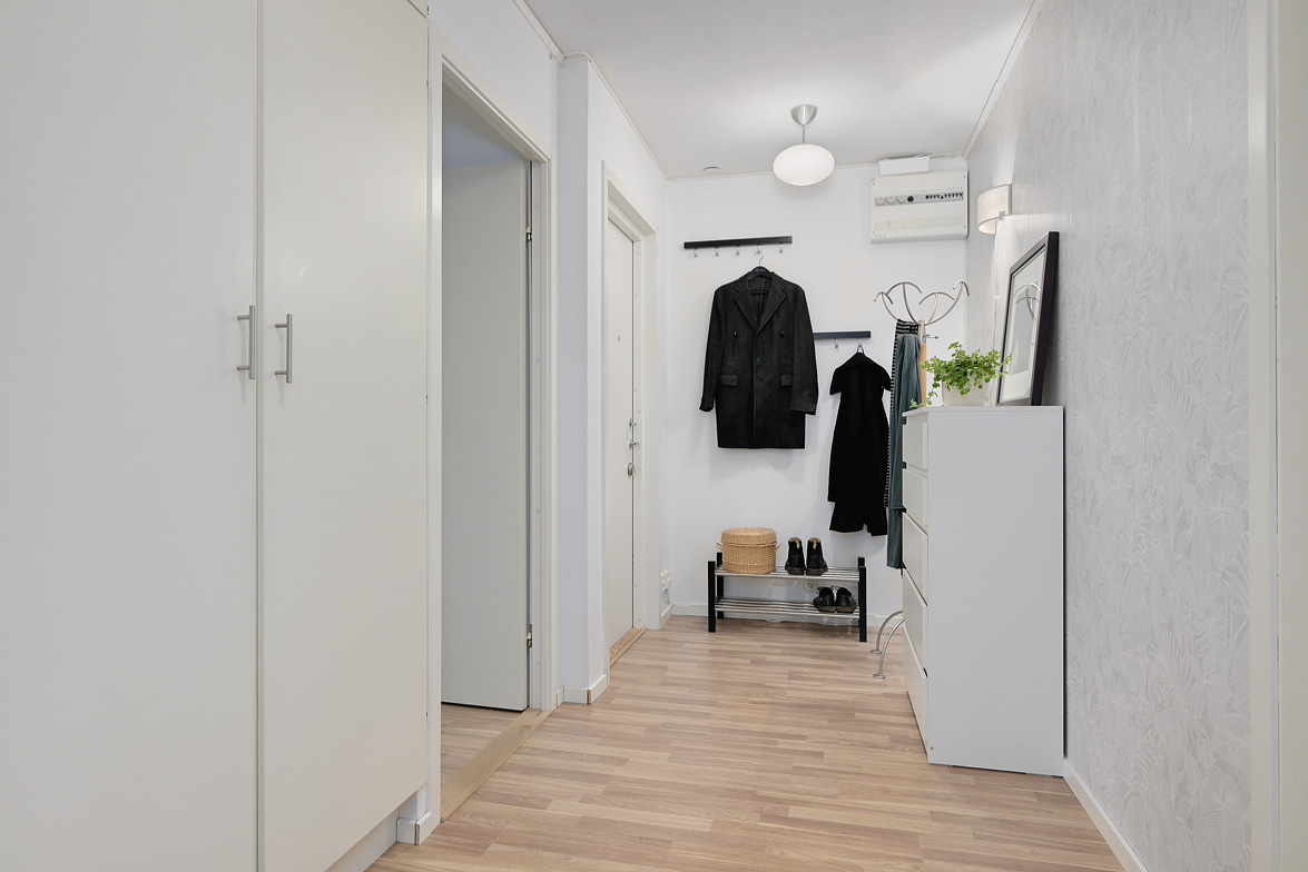 Hall Hall med ljust laminatgolv och ljusa väggar. I hallen finns avhängningsmöjligheter för ytterkläder samt ett inbyggt städskåp. Kök Kök med köksinredning i vitt, köket har mörka laminatbänkskivor med matchande kakel ovanför. Här finns det gott om plats även för ett större matbord, och från matplatsen har man fin utsikt mot skog och grönområden. Köket är välutrustat, det är försett med fullstor kyl och frys i rostfritt (Båda 2021), diskmaskin, hällspis med fläkt samt skafferi. Köket har även det ljusa väggar och laminatgolv. Vardagsrum Rymligt vardagsrum med ljusa väggar och laminatgolv, från rummet har man utgång till balkongen som har västerläge. Vardagsrummet rymmer enkelt både en soffgrupp och en matsalsmöbel. Badrum Badrum med dusch, wc samt handfat med spegel. Badrummet är försett med våtrumsvinyler på golv och vägg, det är även förberett för tvättmaskin. Sovrum Det större sovrummet har laminatgolv samt ljusa väggar kompletterat med en mörk fondvägg. I sovrummet finns en fin dubbel skjutdörrsgarderob. Det andra sovrummet har ljusa väggar, laminatgolv och en fin blommönstrad fondväggstapet. Även i detta sovrum finns en dubbel skjutgarderob. Lägenheten har genomgående fina laminatgolv och ljus färgsättning.