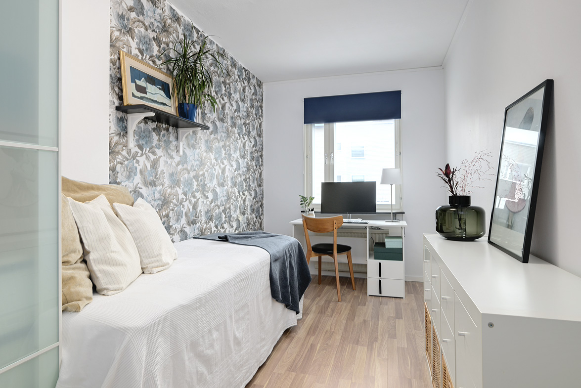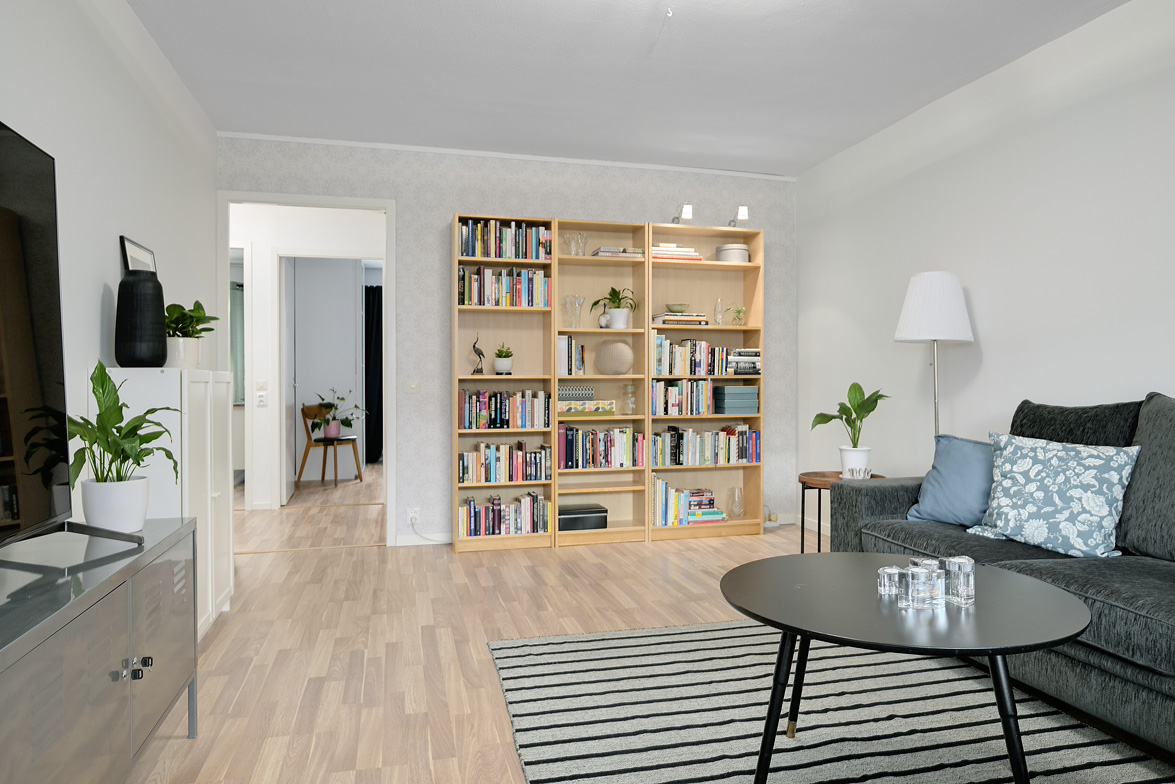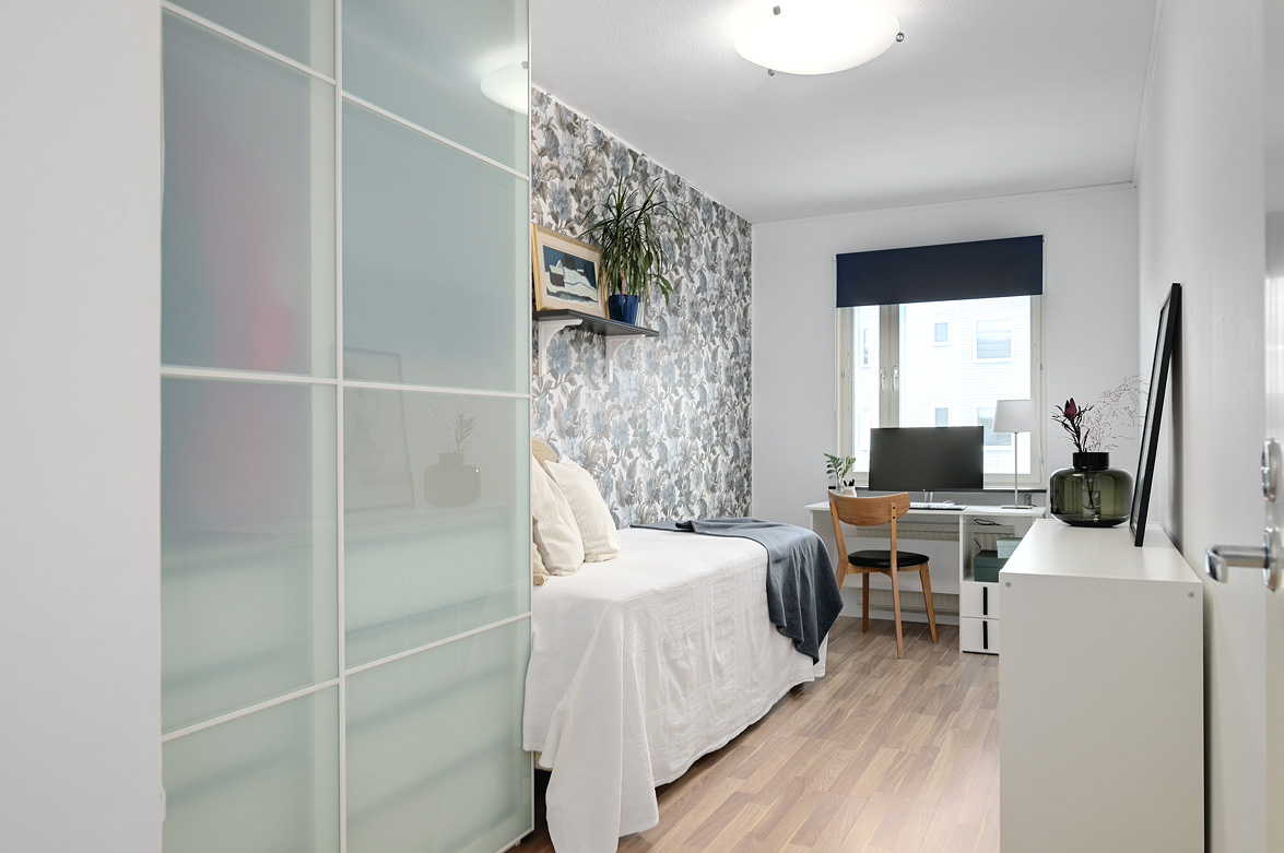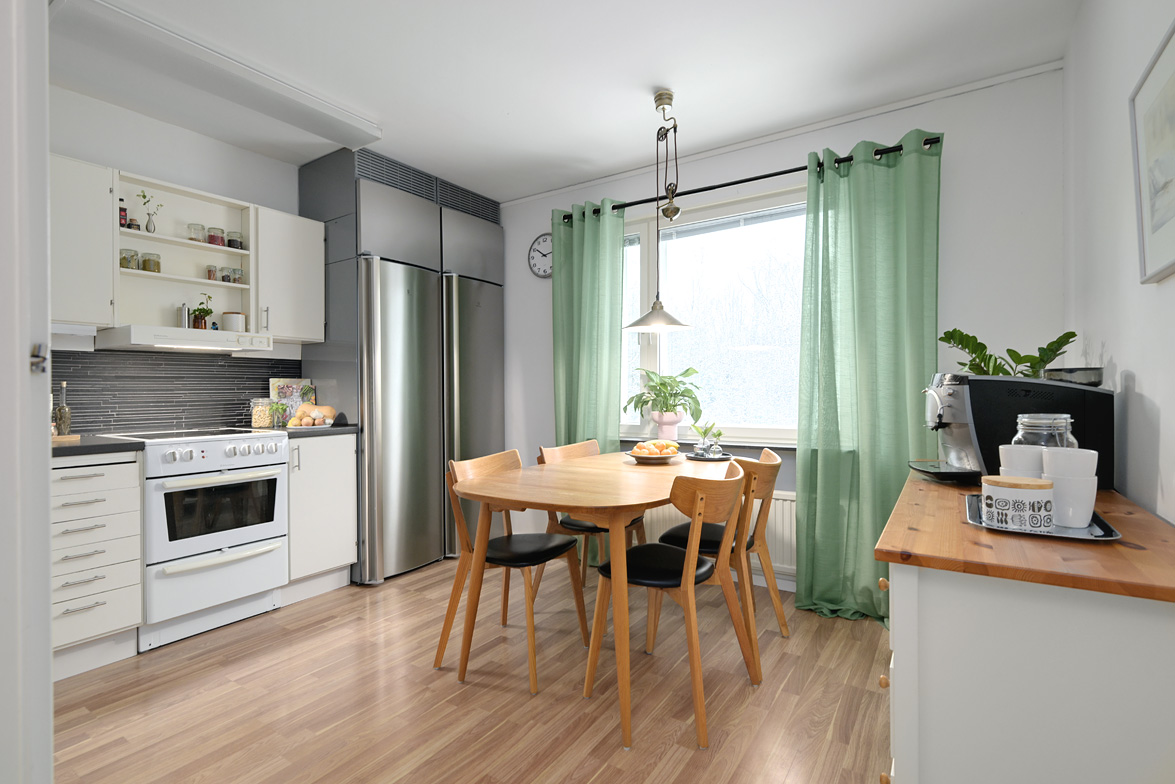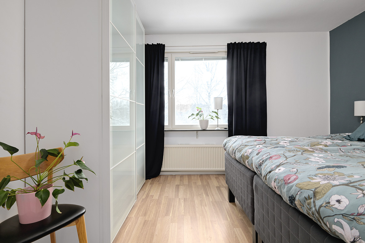 Hall Hall med ljust laminatgolv och ljusa väggar. I hallen finns avhängningsmöjligheter för ytterkläder samt ett inbyggt städskåp. Kök Kök med köksinredning i vitt, köket har mörka laminatbänkskivor med matchande kakel ovanför. Här finns det gott om plats även för ett större matbord, och från matplatsen har man fin utsikt mot skog och grönområden. Köket är välutrustat, det är försett med fullstor kyl och frys i rostfritt (Båda 2021), diskmaskin, hällspis med fläkt samt skafferi. Köket har även det ljusa väggar och laminatgolv. Vardagsrum Rymligt vardagsrum med ljusa väggar och laminatgolv, från rummet har man utgång till balkongen som har västerläge. Vardagsrummet rymmer enkelt både en soffgrupp och en matsalsmöbel. Badrum Badrum med dusch, wc samt handfat med spegel. Badrummet är försett med våtrumsvinyler på golv och vägg, det är även förberett för tvättmaskin. Sovrum Det större sovrummet har laminatgolv samt ljusa väggar kompletterat med en mörk fondvägg. I sovrummet finns en fin dubbel skjutdörrsgarderob. Det andra sovrummet har ljusa väggar, laminatgolv och en fin blommönstrad fondväggstapet. Även i detta sovrum finns en dubbel skjutgarderob. Lägenheten har genomgående fina laminatgolv och ljus färgsättning.