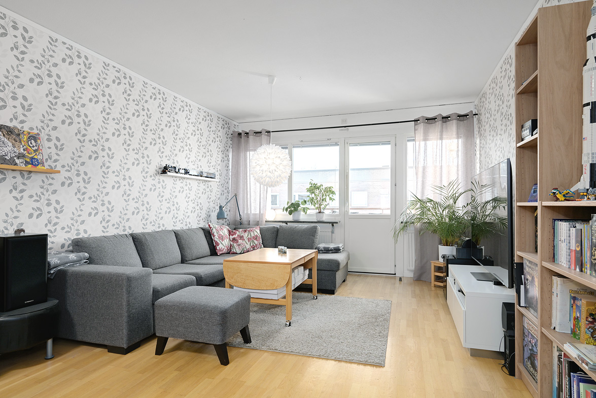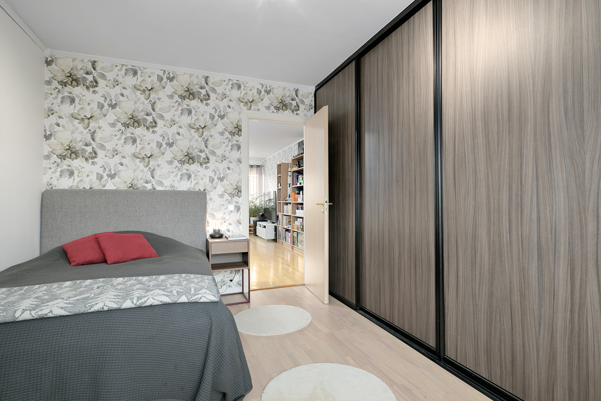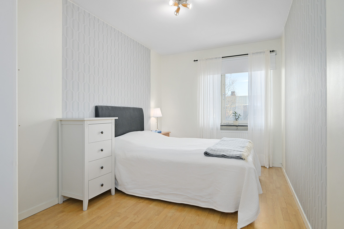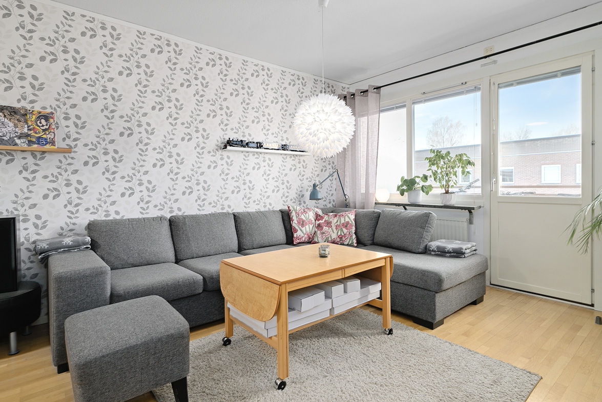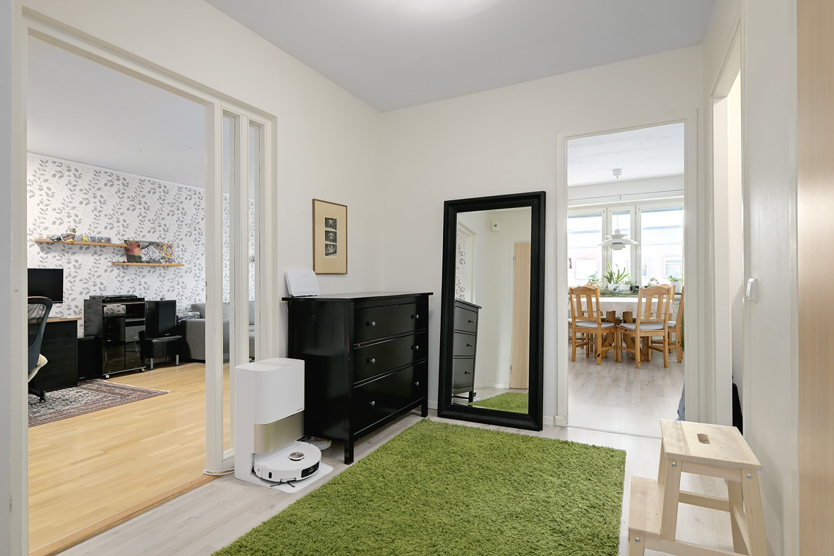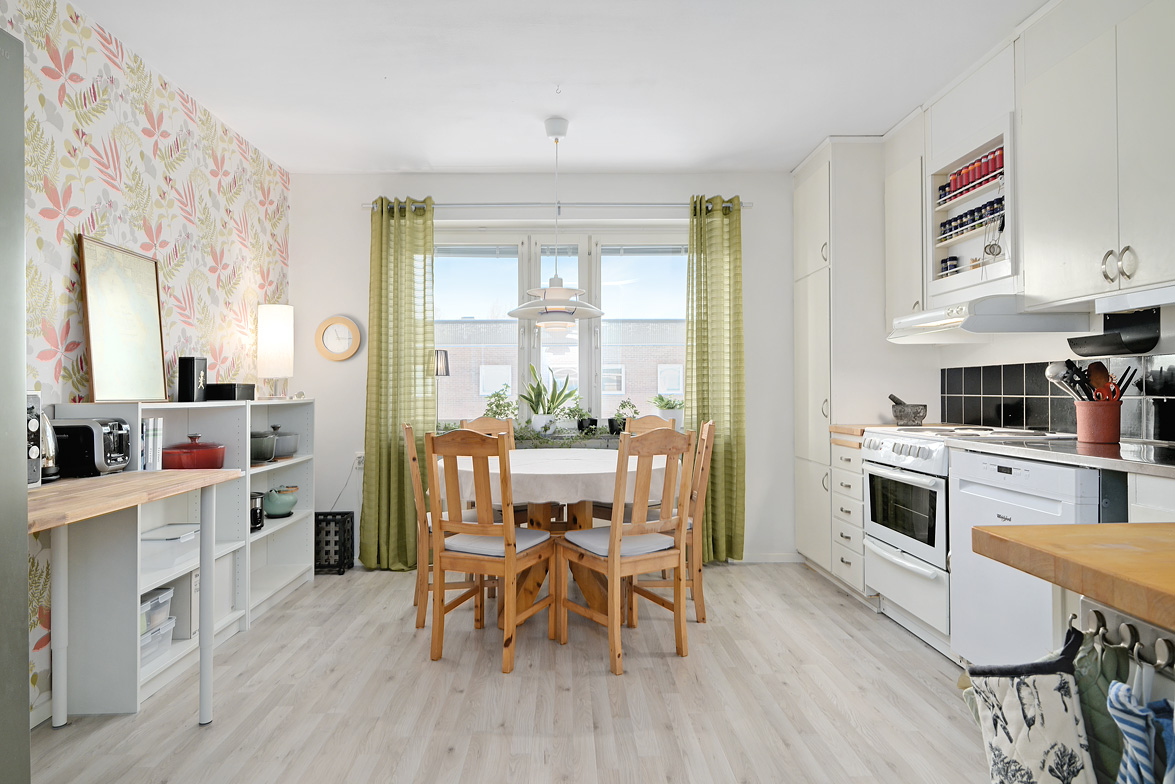 Hall Hall med mörkt klinkerlaminat och ljusa väggar vid entrén. Inre delen av hallen har ljust laminatgolv och vitmålade väggar. Från hallen nås en praktisk klädkammare. Kök Stort, ljust kök med ljust laminatgolv, vitmålade väggar och en mönstrad fondvägg. Köksinredning i vitt, ovan diskbänken sitter det mörkt kakel. Spis, spisfläkt, kyl/frys i rostfritt samt diskmaskin. Vardagsrum Rymligt vardagsrum med ekparkettgolv och tapet med blommönster. Från vardagsrummet har man utgång till västerbalkong där man har sol från lunchtid fram till sena kvällen. Badrum Helkaklat badrum med dusch. Badrummet har skjutbar duschvägg, elgolvvärme och handduksstork, det är även förberett för tvättmaskin. Badrummet är försett med ett fönster. Sovrum Stort sovrum med vitlaserat ekparkettgolv. Sovrummet har en hel skjutgarderobsvägg vilket ger hela 4 meter garderobsförvaring med praktisk inredning, en mycket snygg förvaringslösning! Sovrum med eklaminatgolv och antikvita väggar. Lägenheten är genomgående ljus och trivsam med bra storlek på rummen och god bostadsstandard.
