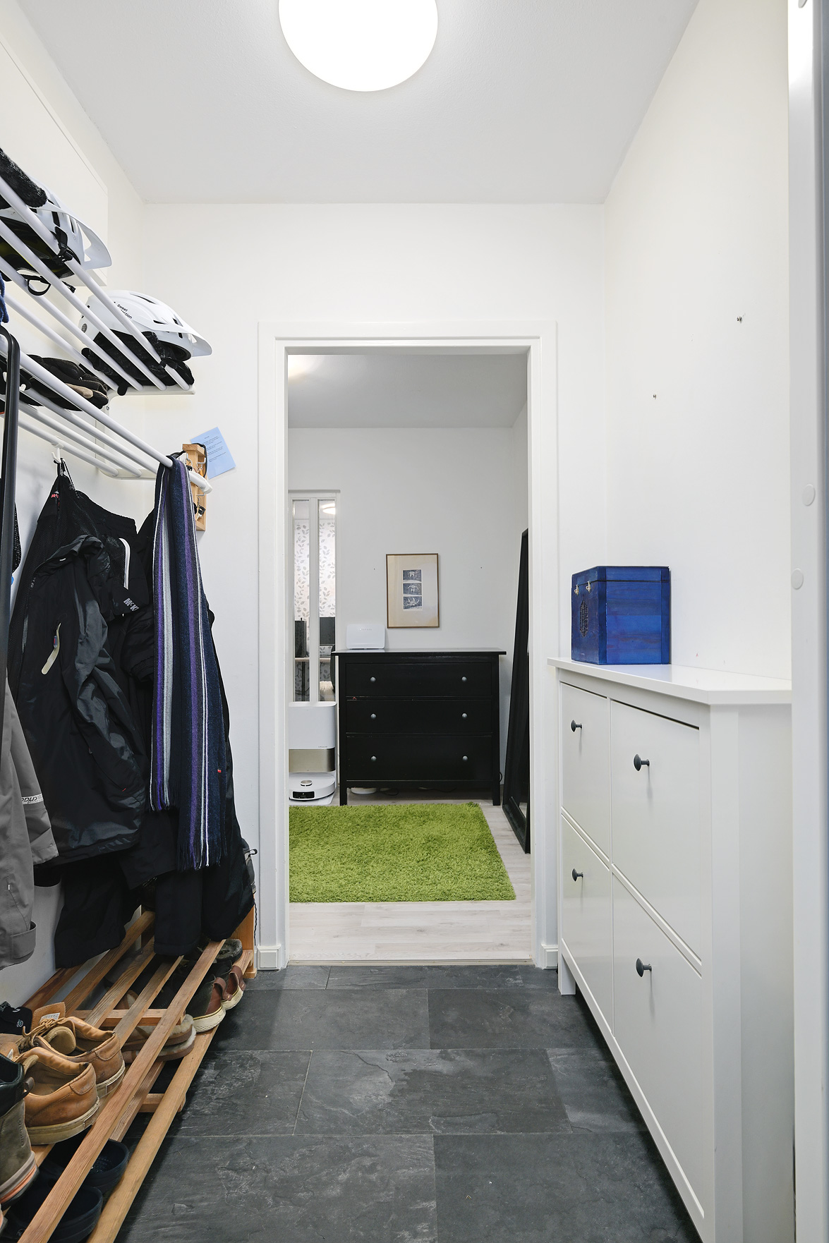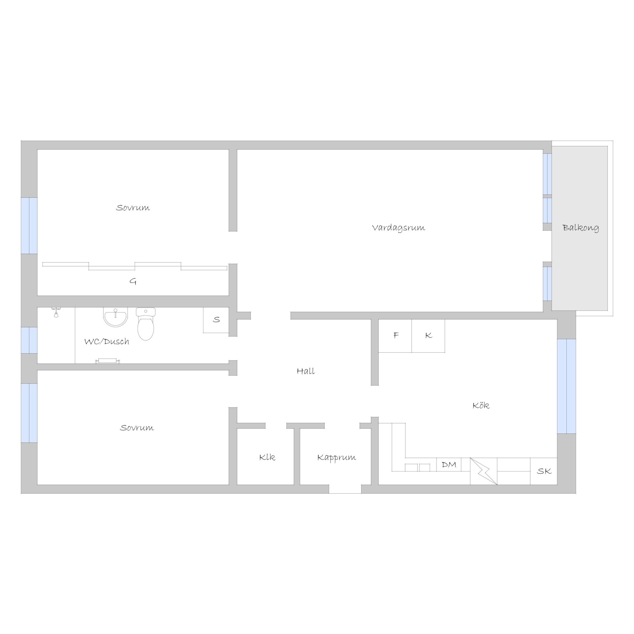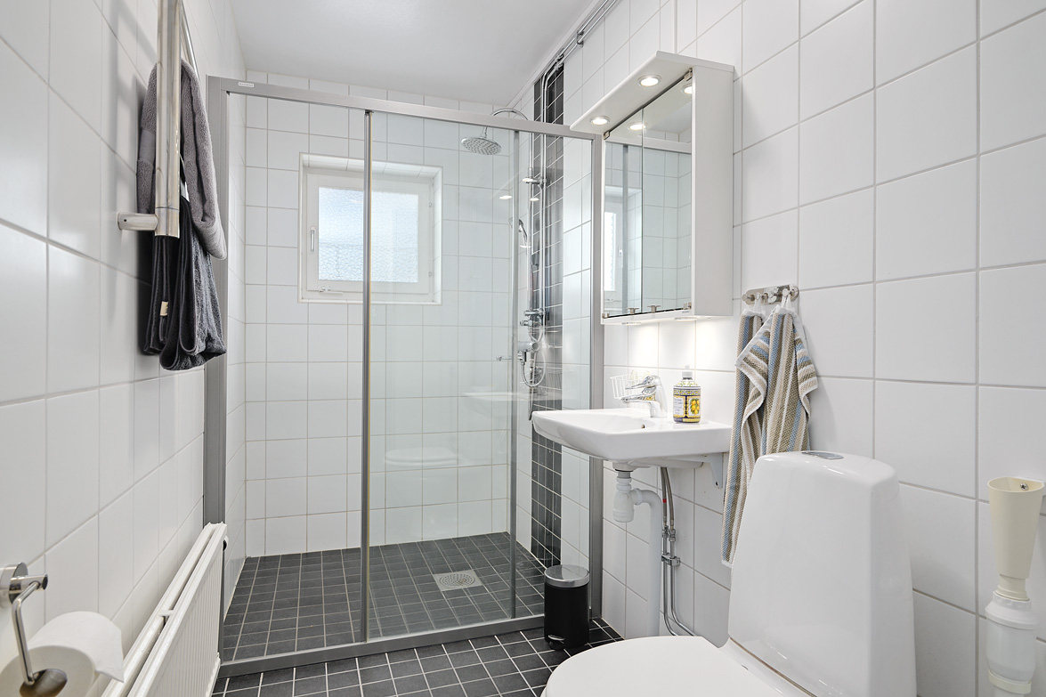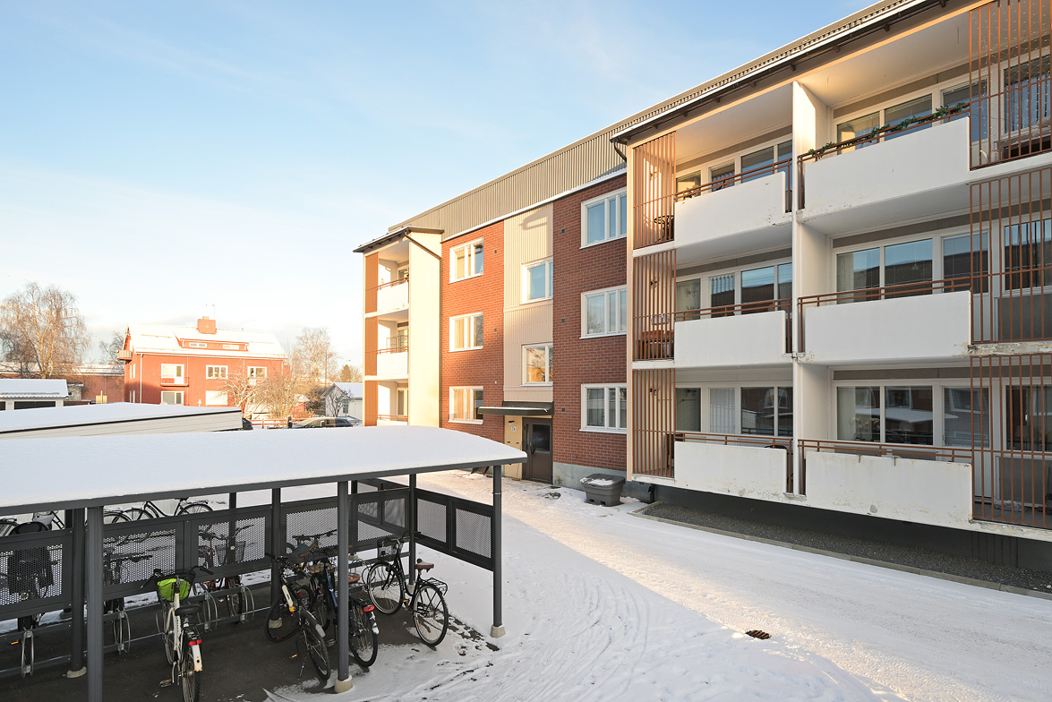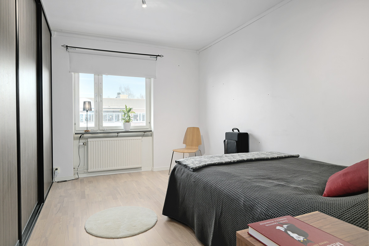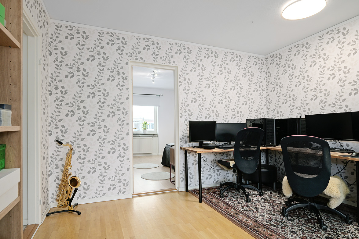 Hall Hall med mörkt klinkerlaminat och ljusa väggar vid entrén. Inre delen av hallen har ljust laminatgolv och vitmålade väggar. Från hallen nås en praktisk klädkammare. Kök Stort, ljust kök med ljust laminatgolv, vitmålade väggar och en mönstrad fondvägg. Köksinredning i vitt, ovan diskbänken sitter det mörkt kakel. Spis, spisfläkt, kyl/frys i rostfritt samt diskmaskin. Vardagsrum Rymligt vardagsrum med ekparkettgolv och tapet med blommönster. Från vardagsrummet har man utgång till västerbalkong där man har sol från lunchtid fram till sena kvällen. Badrum Helkaklat badrum med dusch. Badrummet har skjutbar duschvägg, elgolvvärme och handduksstork, det är även förberett för tvättmaskin. Badrummet är försett med ett fönster. Sovrum Stort sovrum med vitlaserat ekparkettgolv. Sovrummet har en hel skjutgarderobsvägg vilket ger hela 4 meter garderobsförvaring med praktisk inredning, en mycket snygg förvaringslösning! Sovrum med eklaminatgolv och antikvita väggar. Lägenheten är genomgående ljus och trivsam med bra storlek på rummen och god bostadsstandard.