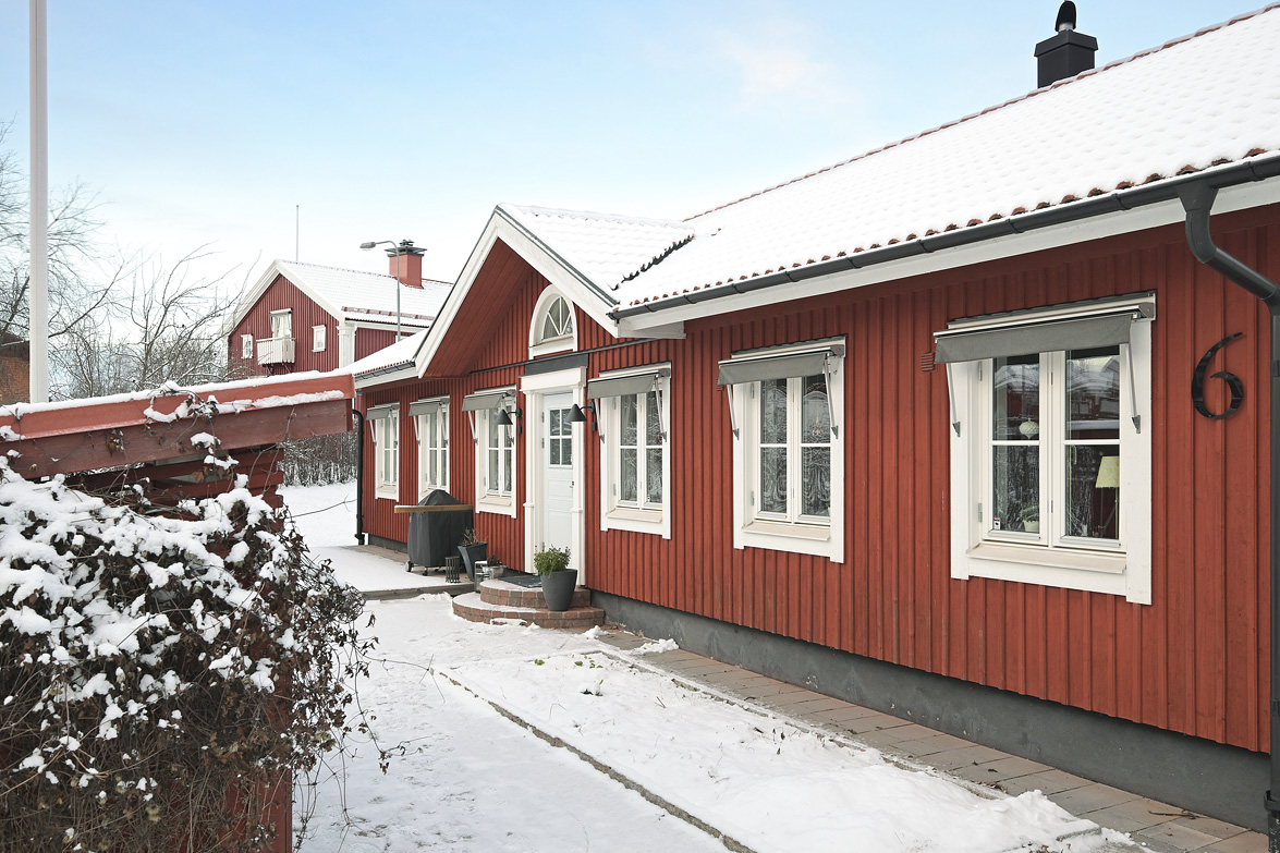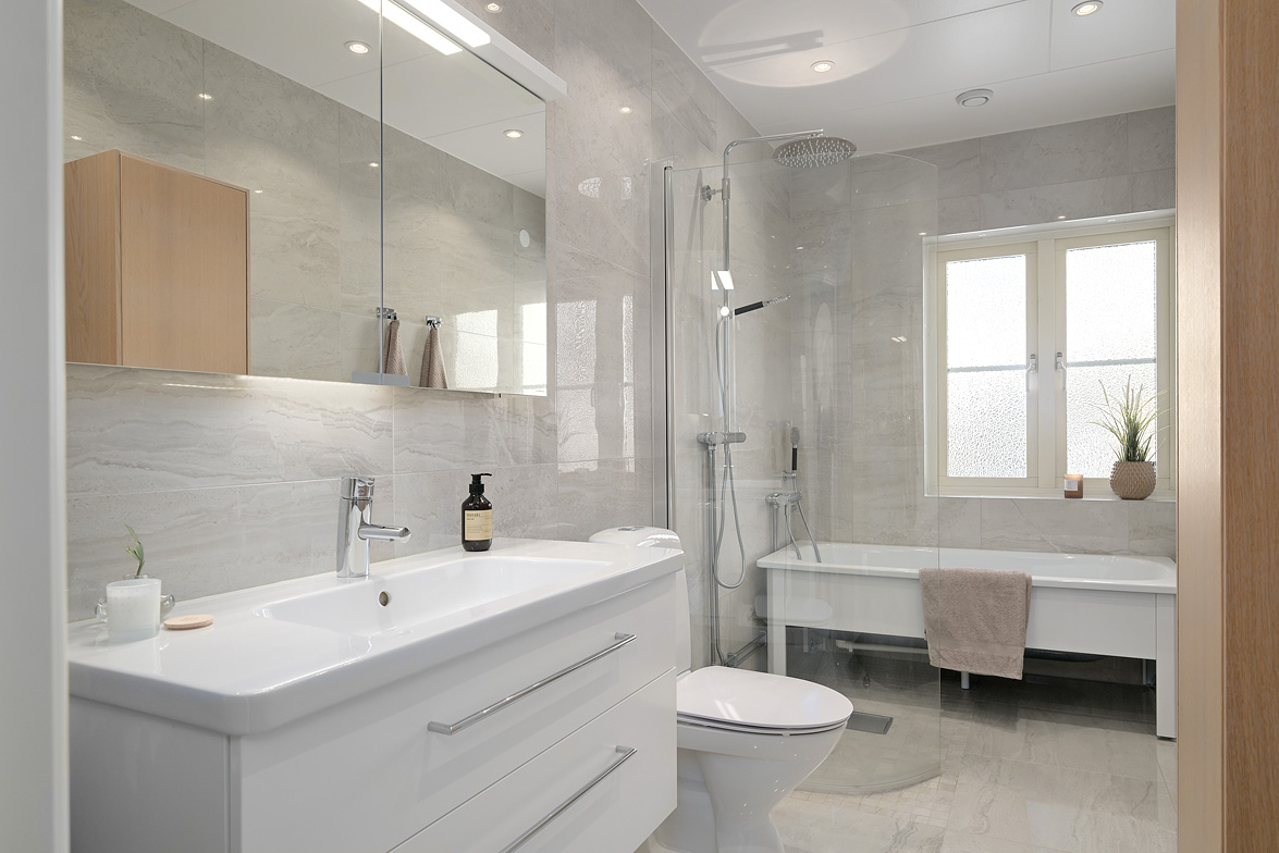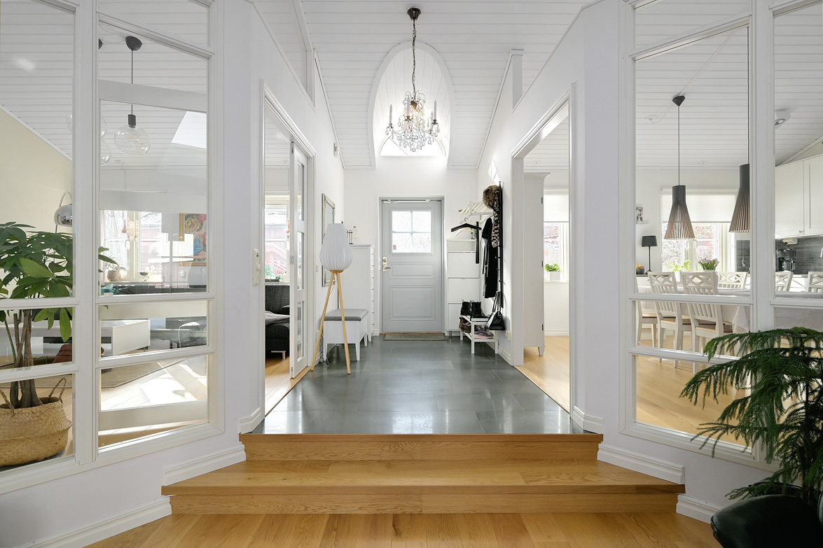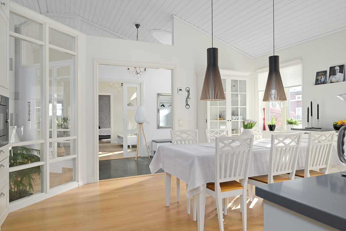 Entré till huset sker via en hall med ett vackert stengolv i grå offerdalsskiffer. Ovan entrén är det en hög kupol med ett halvmåneformat fönster som släpper in ljus till hall och vardagsrum. Rakt fram från hallen öppnar huset upp sig mot ett vardagsrum i etage, detta rum har en härlig rymd med ryggåstak och ca 4 meters takhöjd, i ena hörnet finns det en kamin, i taket sitter ett stort takfönster (Velux). Vardagsrummet har ett nytt enstavigt ekparkettgolv. Från vardagsrummet har man sedan utgång till en stenlagd uteplats. Till vänster om entrén ligger det rymliga köket med ryggåstak (takhöjd ca 3.80), detta försågs med ny köksinredning från Electrolux i slutet av 2011. Köket är vitt, inredningen är mycket smakfull och praktisk, bänkskivorna är i silestone, ovan köksbänkskivorna sitter det ett matchande gråsvart kakel. En bred induktionshäll är infälld (2026), ovan denna sitter en lika bred Frankefläkt i rostfritt. Diskmaskinen är från 2026. Fullstor kyl och frys i Rostfritt. Inbyggd ugn och inbyggd micro. Ny halogenbelysning och kompletterande eluttag är installerade. Köket har nytt enstavigt ekparkettgolv. Innanför köket finns en passage som tidigare använts som en kontorshörna. Till vänster om passagen är det ett sovrum alternativt arbetsrum. Till höger om passagen är det ett mycket påkostat helkaklat badrum som 2022 renoverades med hjälp av BL interiör. Badrummet har snygg ljusgrå cementmosaik på golv och vägg, i taket sitter det infälld spotlightbelysning. I badrummet finns wc, tvättställ med underskåp, ovan detta sitter det ett spegelskåp med belysning. Här finns också både duschplats med glasväggar och ett badkar. Badrummet är försett med fönster. Från köket nås även husets största sovrum, detta är försett med två garderober och ett linneskåp. Till höger om entrén ligger ett fint allrum med ryggåstak (takhöjd ca 3.80), detta har fungerat som husets tv-rum. Rummet är idag avgränsat från hall och köksavdelning med väggar i glas, detta ger fin ljuddämpning i huset och tillåter ändå ett fritt ljusflöde mellan rummen. Allrummet har ett nytt enstavigt ekparkettgolv. Innanför allrummet ligger ett sovrum med fin tapet. Till vänster om allrummet finns ett sovrum med garderob, mitt emot sovrummet finns en klädkammare. Innanför allrummet har man husets andra badrum, även detta helrenoverades 2022 med hjälp av BL interiör, och liksom det andra badrummet har det fönster, golv och väggar är klädda i cementmosaik. I badrummet finns wc, dusch och tvättställ med underskåp samt belyst spegel. Från allrummet når man även tvättstugan med grovingången, tvättstugan renoverades 2014 och den försågs då med en mycket praktisk inredning med garderob och skåpförvaring på ena långsidan och en lång tvättbänk på andra sidan. Tvättstugan är utrustad med tvättmaskin (2018) och tumlare (2018), här är även husets ventilations och värmesystem placerat. I taket finns en bred vindslucka med stege som leder upp till ett rymligt vindsförråd med golv. Huset har genomgående ekparkett i alla ytor som inte är stenbelagda, vissa av dessa parkettgolv är nya enstaviga parketter. Villan har genomgående vattenburen golvvärme och vitmålade paneltak där det är ryggåstak, i övrigt är det släta vita tak. Huset är bredbandsanslutet via Telia. Fönsterbänkarna i huset är i marmor. Villan har en fin planlösning med rymd, uppdelningen av huset med sällskapsytor mellan de två sovrumsavdelningarna som har tillgång till var sitt badrum är synnerligen väl genomtänkt. En mycket välskött och trivsam bostad i ett omtyckt, äldre kvarter just ovanför Tvärån och med promenadavstånd till stan.
