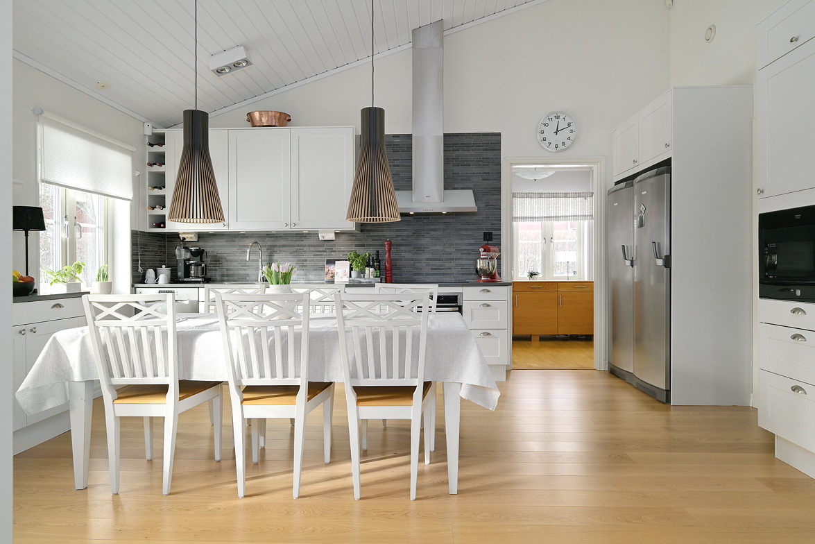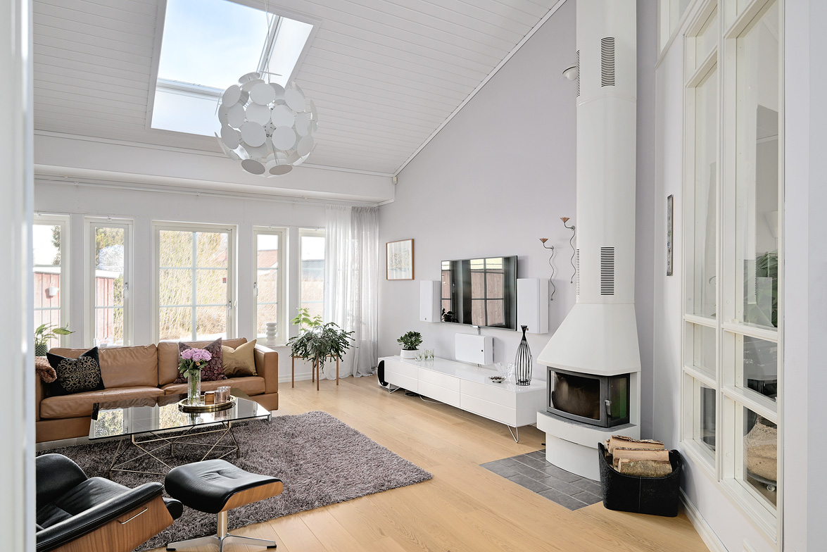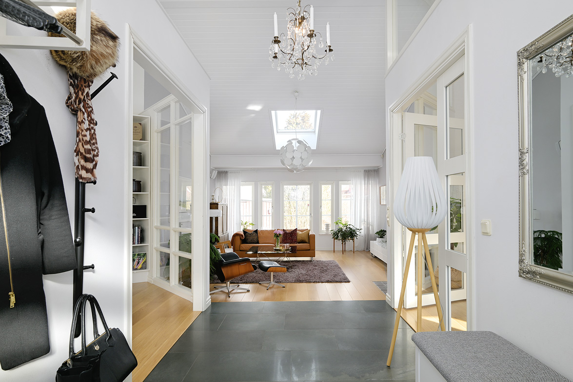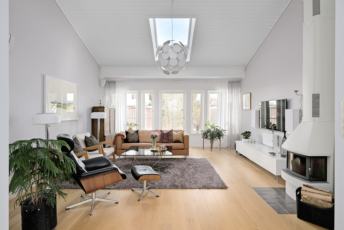 Entré till huset sker via en hall med ett vackert stengolv i grå offerdalsskiffer. Ovan entrén är det en hög kupol med ett halvmåneformat fönster som släpper in ljus till hall och vardagsrum. Rakt fram från hallen öppnar huset upp sig mot ett vardagsrum i etage, detta rum har en härlig rymd med ryggåstak och ca 4 meters takhöjd, i ena hörnet finns det en kamin, i taket sitter ett stort takfönster (Velux). Vardagsrummet har ett nytt enstavigt ekparkettgolv. Från vardagsrummet har man sedan utgång till en stenlagd uteplats. Till vänster om entrén ligger det rymliga köket med ryggåstak (takhöjd ca 3.80), detta försågs med ny köksinredning från Electrolux i slutet av 2011. Köket är vitt, inredningen är mycket smakfull och praktisk, bänkskivorna är i silestone, ovan köksbänkskivorna sitter det ett matchande gråsvart kakel. En bred induktionshäll är infälld (2026), ovan denna sitter en lika bred Frankefläkt i rostfritt. Diskmaskinen är från 2026. Fullstor kyl och frys i Rostfritt. Inbyggd ugn och inbyggd micro. Ny halogenbelysning och kompletterande eluttag är installerade. Köket har nytt enstavigt ekparkettgolv. Innanför köket finns en passage som tidigare använts som en kontorshörna. Till vänster om passagen är det ett sovrum alternativt arbetsrum. Till höger om passagen är det ett mycket påkostat helkaklat badrum som 2022 renoverades med hjälp av BL interiör. Badrummet har snygg ljusgrå cementmosaik på golv och vägg, i taket sitter det infälld spotlightbelysning. I badrummet finns wc, tvättställ med underskåp, ovan detta sitter det ett spegelskåp med belysning. Här finns också både duschplats med glasväggar och ett badkar. Badrummet är försett med fönster. Från köket nås även husets största sovrum, detta är försett med två garderober och ett linneskåp. Till höger om entrén ligger ett fint allrum med ryggåstak (takhöjd ca 3.80), detta har fungerat som husets tv-rum. Rummet är idag avgränsat från hall och köksavdelning med väggar i glas, detta ger fin ljuddämpning i huset och tillåter ändå ett fritt ljusflöde mellan rummen. Allrummet har ett nytt enstavigt ekparkettgolv. Innanför allrummet ligger ett sovrum med fin tapet. Till vänster om allrummet finns ett sovrum med garderob, mitt emot sovrummet finns en klädkammare. Innanför allrummet har man husets andra badrum, även detta helrenoverades 2022 med hjälp av BL interiör, och liksom det andra badrummet har det fönster, golv och väggar är klädda i cementmosaik. I badrummet finns wc, dusch och tvättställ med underskåp samt belyst spegel. Från allrummet når man även tvättstugan med grovingången, tvättstugan renoverades 2014 och den försågs då med en mycket praktisk inredning med garderob och skåpförvaring på ena långsidan och en lång tvättbänk på andra sidan. Tvättstugan är utrustad med tvättmaskin (2018) och tumlare (2018), här är även husets ventilations och värmesystem placerat. I taket finns en bred vindslucka med stege som leder upp till ett rymligt vindsförråd med golv. Huset har genomgående ekparkett i alla ytor som inte är stenbelagda, vissa av dessa parkettgolv är nya enstaviga parketter. Villan har genomgående vattenburen golvvärme och vitmålade paneltak där det är ryggåstak, i övrigt är det släta vita tak. Huset är bredbandsanslutet via Telia. Fönsterbänkarna i huset är i marmor. Villan har en fin planlösning med rymd, uppdelningen av huset med sällskapsytor mellan de två sovrumsavdelningarna som har tillgång till var sitt badrum är synnerligen väl genomtänkt. En mycket välskött och trivsam bostad i ett omtyckt, äldre kvarter just ovanför Tvärån och med promenadavstånd till stan.