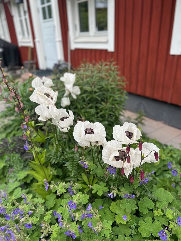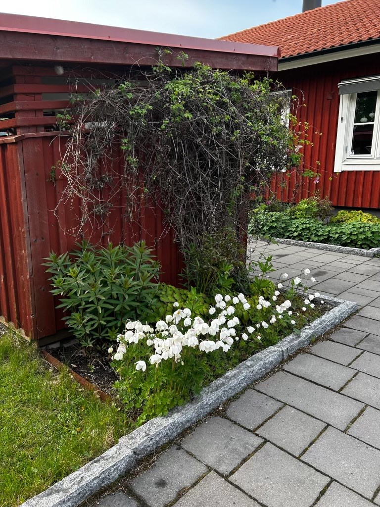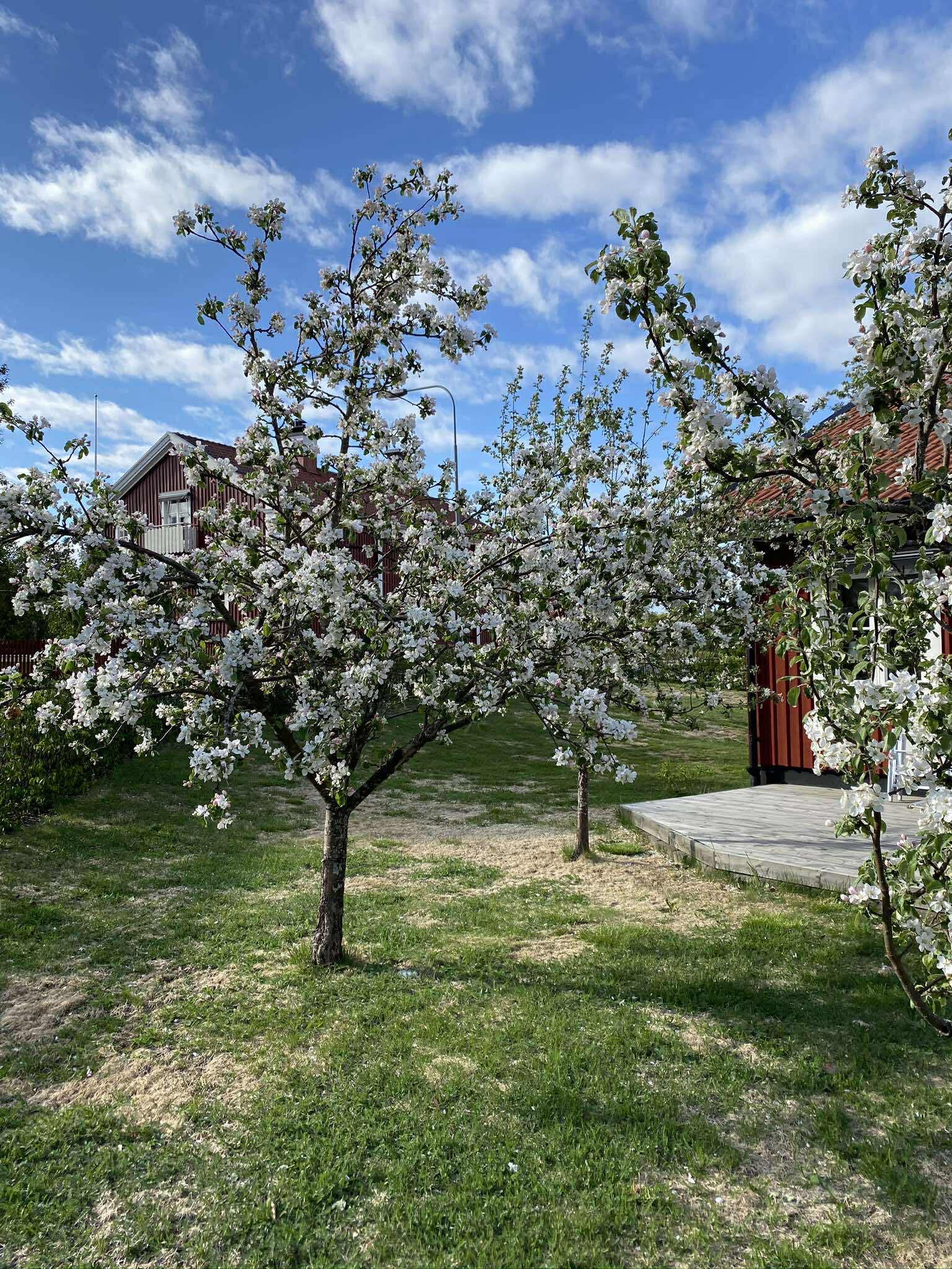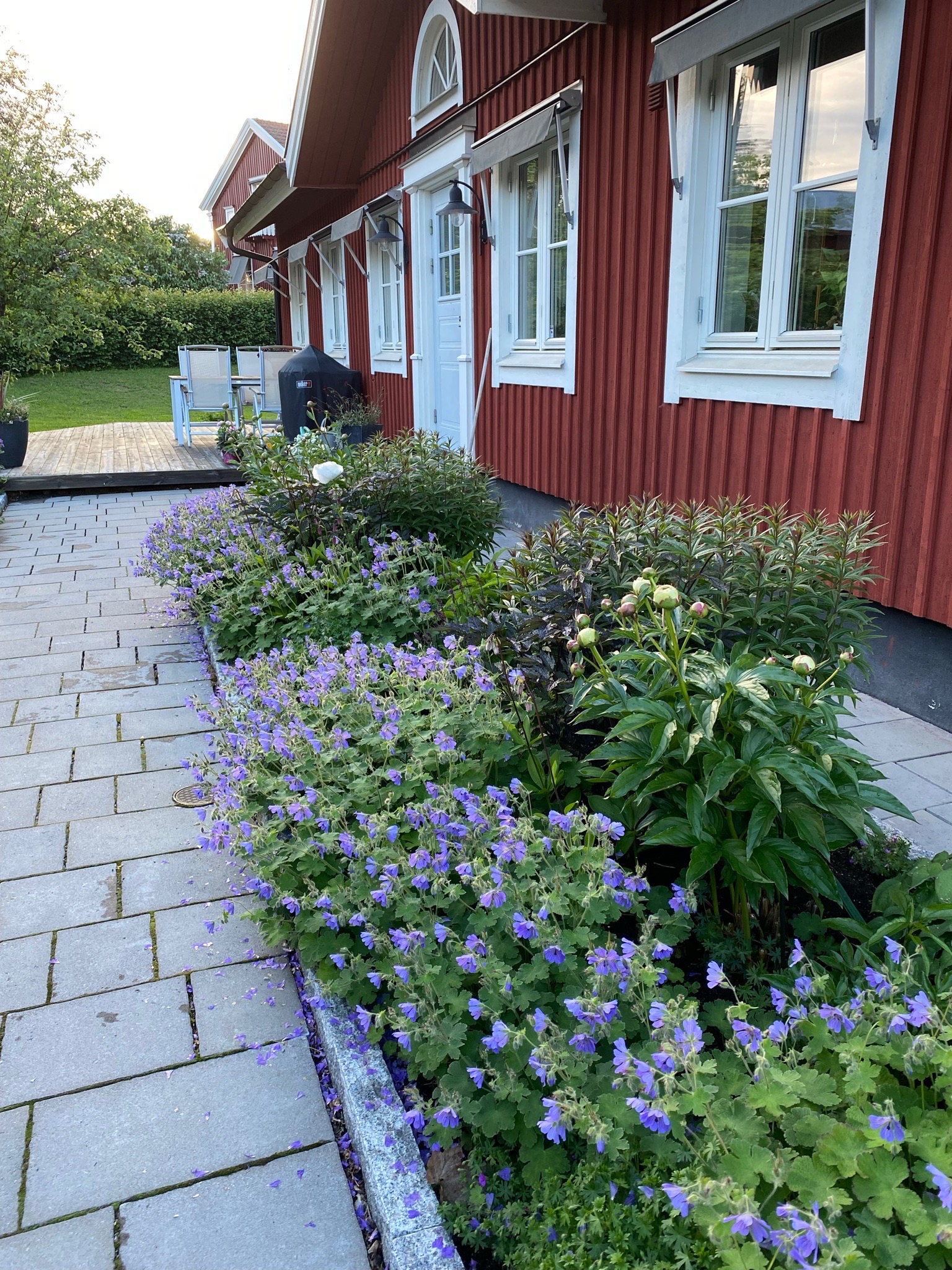 Uppvuxen trädgård med gräsmatta, perennrabatter, äppelträd, röda vinbär, jordgubbsland, rabarber, kryddträdgård och flaggstång. En fin utemiljö som formligen badar i sol, tomten omgärdas av en tät häggmispelhäck.