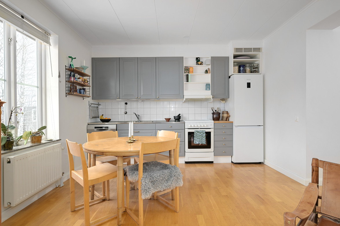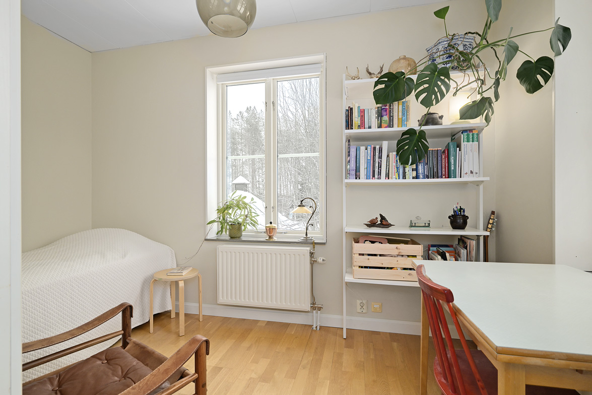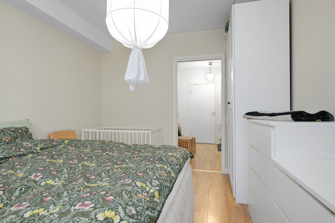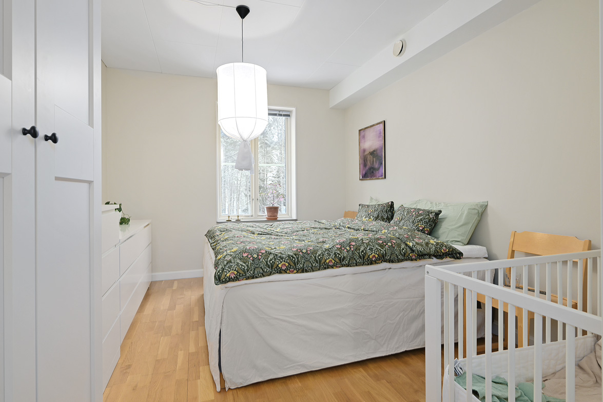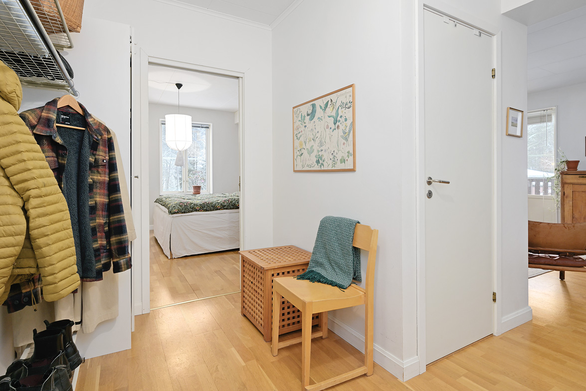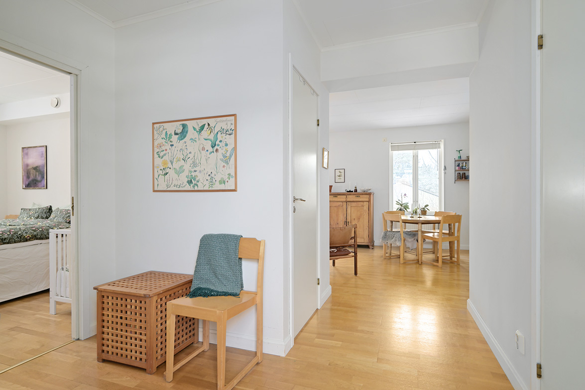 Hall Rymlig och välkomnande hall med gott om plats för avhängning. Ekparketten fortsätter genom hela bostaden och ger ett stilrent och enhetligt intryck. Intill hallen finns en praktisk klädkammare som gör vardagsförvaringen enkel och lättillgänglig. Kök & Vardagsrum Ljust och socialt rum i öppen planlösning med stora fönster och balkongdörrar som skapar en härlig rymd. Köket erbjuder generösa arbetsytor, gott om förvaring samt plats för matbord vid fönsterpartiet. Vardagsrumsdelen rymmer enkelt både soffgrupp och tv-möbel. Härifrån når du även den soliga balkongen – ett naturligt extra rum under årets varmare månader. Sovrum 1 (Stora sovrummet) Rofyllt och väl tilltaget sovrum med plats för dubbelsäng, sängbord och flera garderober. Ett ljust och lugnt rum tack vare att fönstret är på gaveln och har ett insynsskyddat läge. Sovrum 2 Mindre men mycket funktionellt sovrum som passar perfekt som barnrum, gästrum eller kontor. Det stora fönstrena i två väderstreck bidrar till härligt ljusinsläpp och gör rummet lätt att möblera. Badrum Välplanerat badrum med kaklade väggar, våtrumsmatta och ett högt placerat fönster som ger naturligt ljus. Här finns tvättmaskin, arbetsbänk för klädvård och hyllor till förvaring – ett komplett och praktiskt utrymme. Dusch, handfat, spegelskåp och WC gör badrummet både funktionellt och fräscht. Klädkammare Rymlig klädkammare med bra hyllsystem – perfekt för att hålla ordning på säsongsplagg, skor, resväskor och hushållssaker. Balkong Sydvästvänd och insynsskyddad balkong med kvällssol och utsikt mot lummig grönska. Här finns gott om plats för möblering, växter och avkoppling – en perfekt plats att njuta av ljuset långt in på kvällen.
