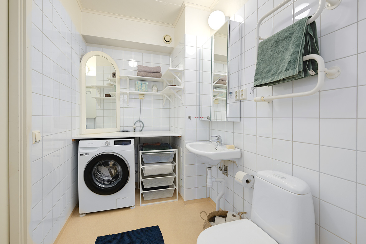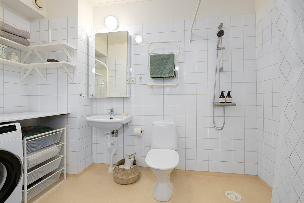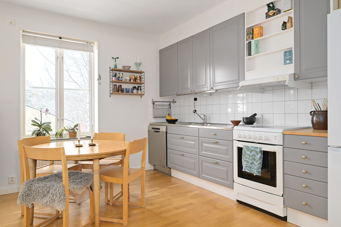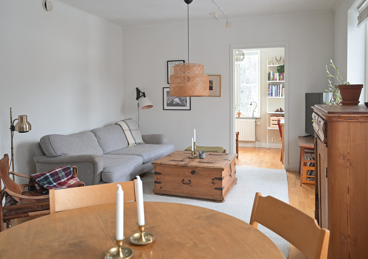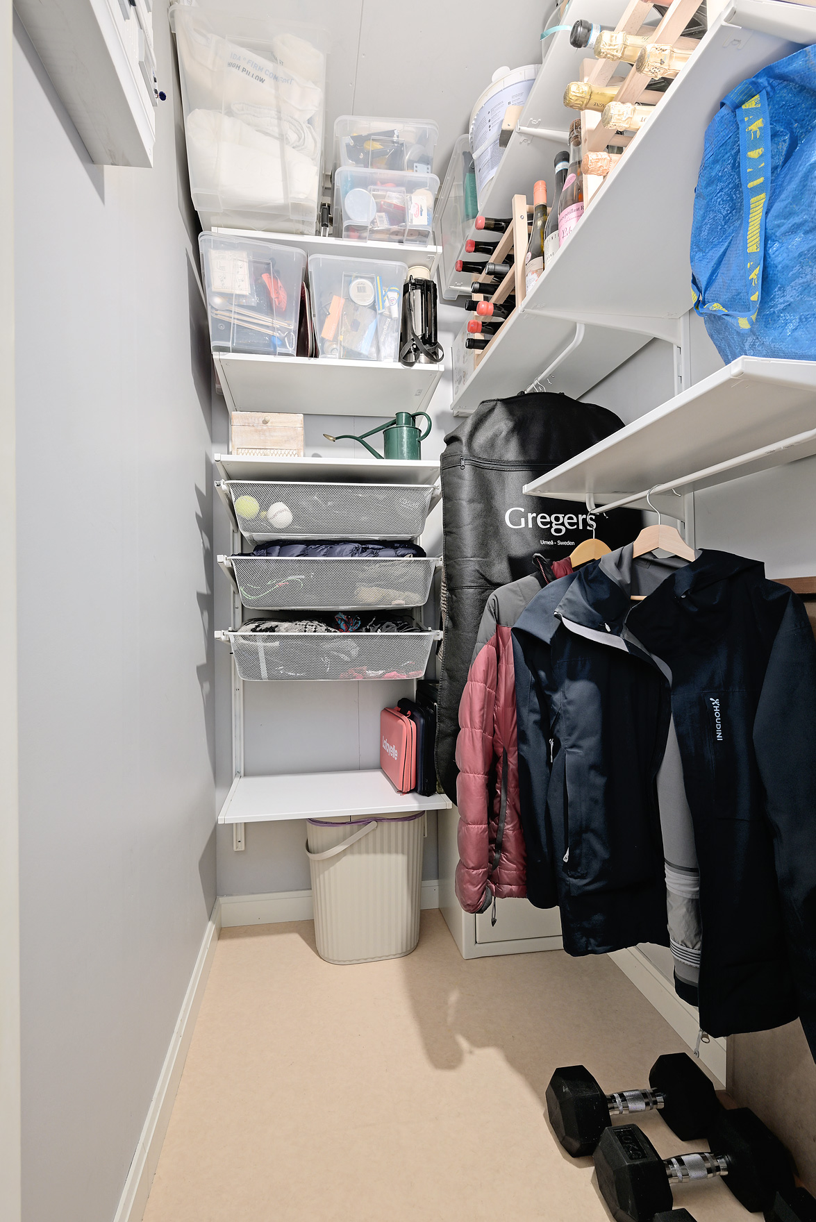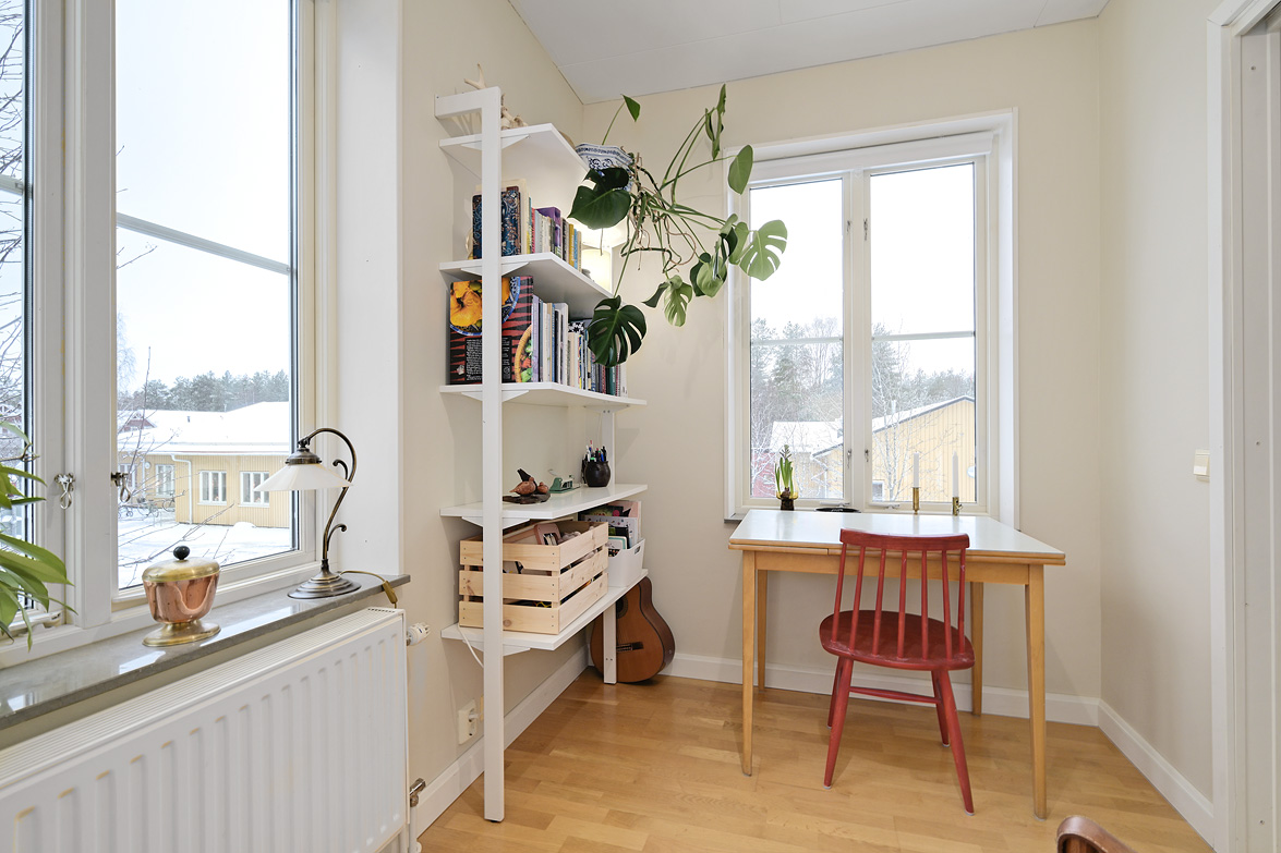 Hall Rymlig och välkomnande hall med gott om plats för avhängning. Ekparketten fortsätter genom hela bostaden och ger ett stilrent och enhetligt intryck. Intill hallen finns en praktisk klädkammare som gör vardagsförvaringen enkel och lättillgänglig. Kök & Vardagsrum Ljust och socialt rum i öppen planlösning med stora fönster och balkongdörrar som skapar en härlig rymd. Köket erbjuder generösa arbetsytor, gott om förvaring samt plats för matbord vid fönsterpartiet. Vardagsrumsdelen rymmer enkelt både soffgrupp och tv-möbel. Härifrån når du även den soliga balkongen – ett naturligt extra rum under årets varmare månader. Sovrum 1 (Stora sovrummet) Rofyllt och väl tilltaget sovrum med plats för dubbelsäng, sängbord och flera garderober. Ett ljust och lugnt rum tack vare att fönstret är på gaveln och har ett insynsskyddat läge. Sovrum 2 Mindre men mycket funktionellt sovrum som passar perfekt som barnrum, gästrum eller kontor. Det stora fönstrena i två väderstreck bidrar till härligt ljusinsläpp och gör rummet lätt att möblera. Badrum Välplanerat badrum med kaklade väggar, våtrumsmatta och ett högt placerat fönster som ger naturligt ljus. Här finns tvättmaskin, arbetsbänk för klädvård och hyllor till förvaring – ett komplett och praktiskt utrymme. Dusch, handfat, spegelskåp och WC gör badrummet både funktionellt och fräscht. Klädkammare Rymlig klädkammare med bra hyllsystem – perfekt för att hålla ordning på säsongsplagg, skor, resväskor och hushållssaker. Balkong Sydvästvänd och insynsskyddad balkong med kvällssol och utsikt mot lummig grönska. Här finns gott om plats för möblering, växter och avkoppling – en perfekt plats att njuta av ljuset långt in på kvällen.