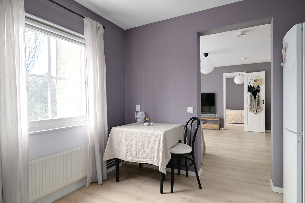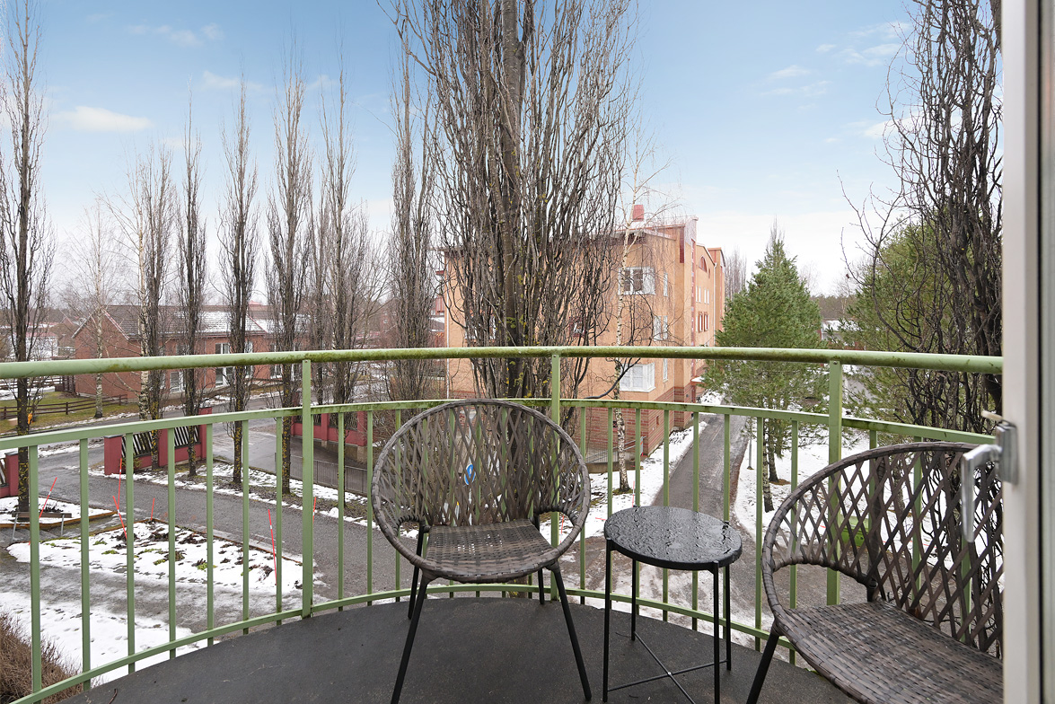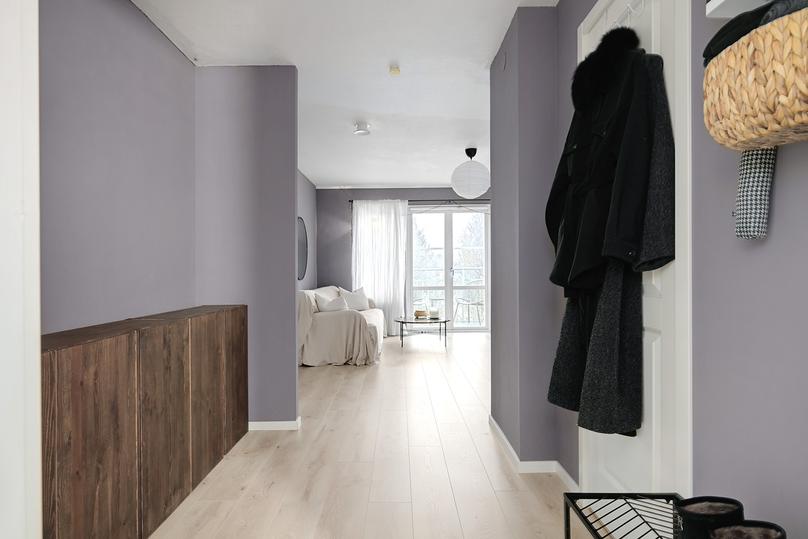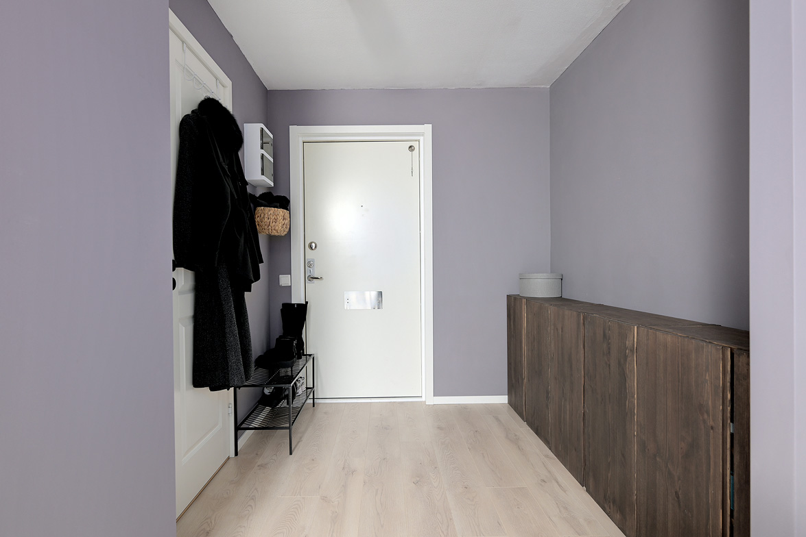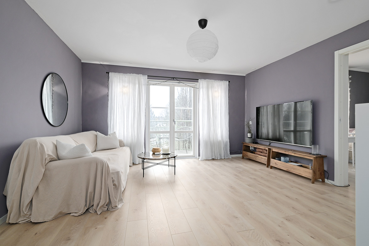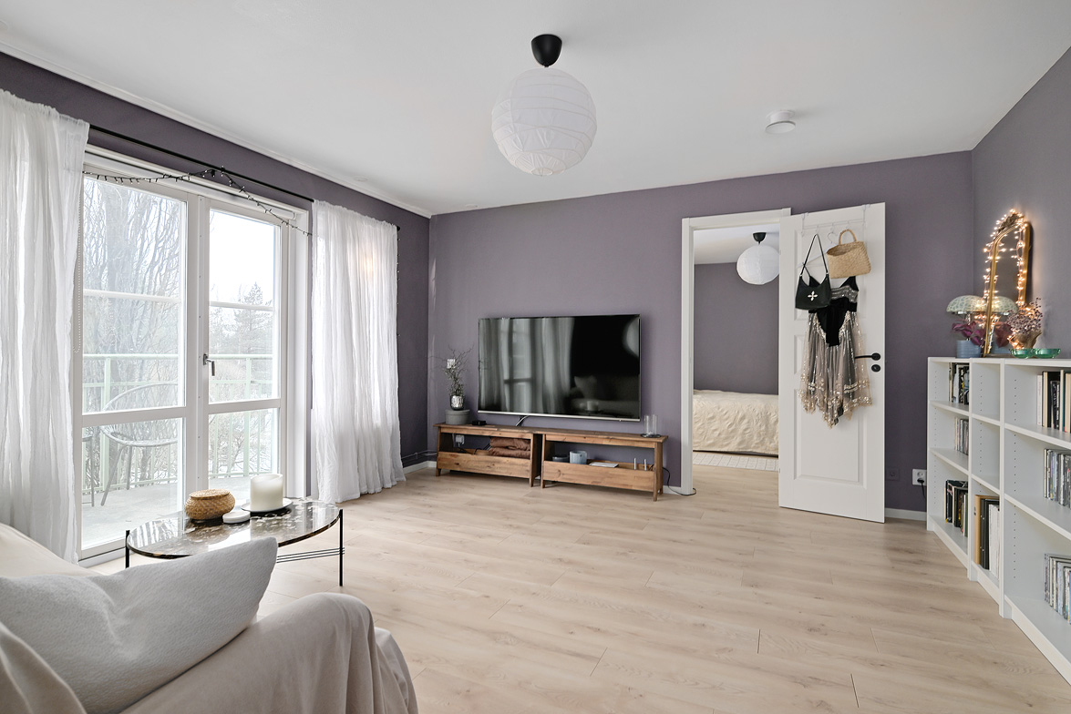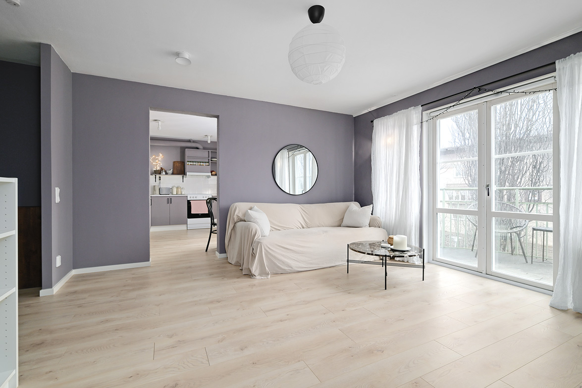 Hall Välkomnande hall med goda avhängningsmöjligheter. På vänster sida av hallen löper en vägg där man enkelt kan installera skjutdörrsgarderober för extra förvaring.Ljus parkett och lila väggar som löper genom bostaden. Vardagsrum Stort och luftigt vardagsrum med plats för både soffgrupp och matplats. Vackra dubbeldörrar med fönsterpartier samt utgång till balkong i halvmåneform mot innergården. Balkong Charmig balkong med rundad form och lugnt läge mot innergården – insynsskyddad pga sitt läge längst upp i huset. Här finns plats för en cafégrupp eller dylikt. Sovrum Sovrum med plats för dubbelsäng, sängbord och skrivbord om så önskas. Fönster mot innergården ger ett tyst och behagligt läge. Kök Ljust och funktionellt kök med fönster mot innergården. Utrustat med spis, kyl/frys, diskmaskin, diskho samt över- och underskåp med god förvaring. Badrum Stilfullt badrum med mönstrat klinkergolv och kakel i duschhörnan. Utrustat med WC, handfat, kommod med underskåp samt tvättmaskin.