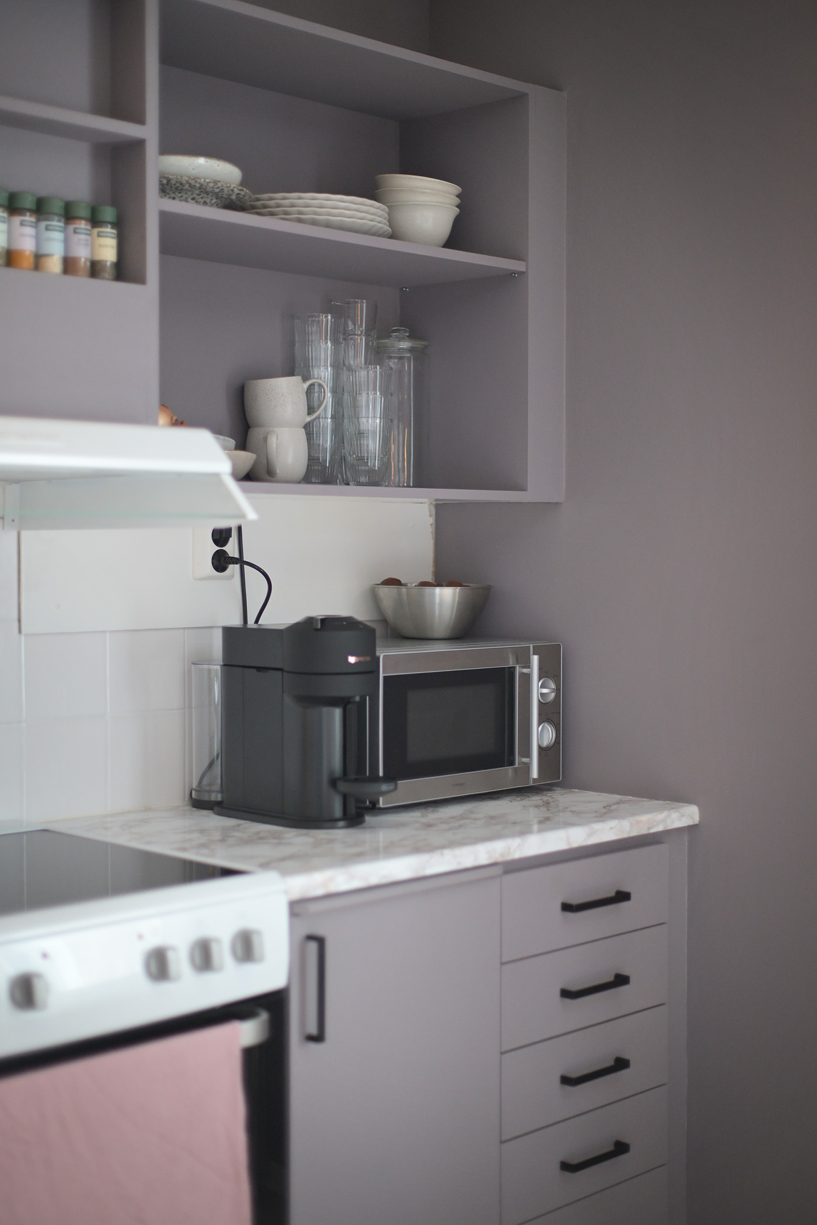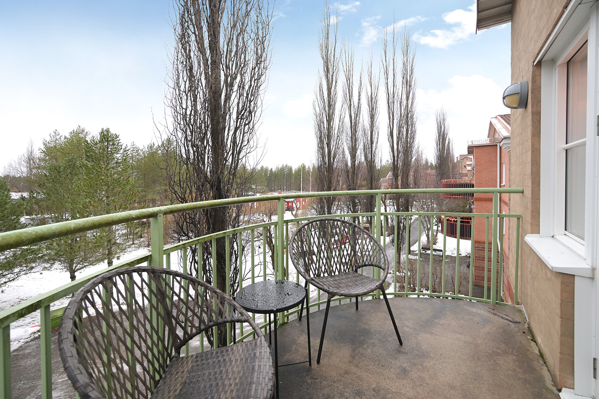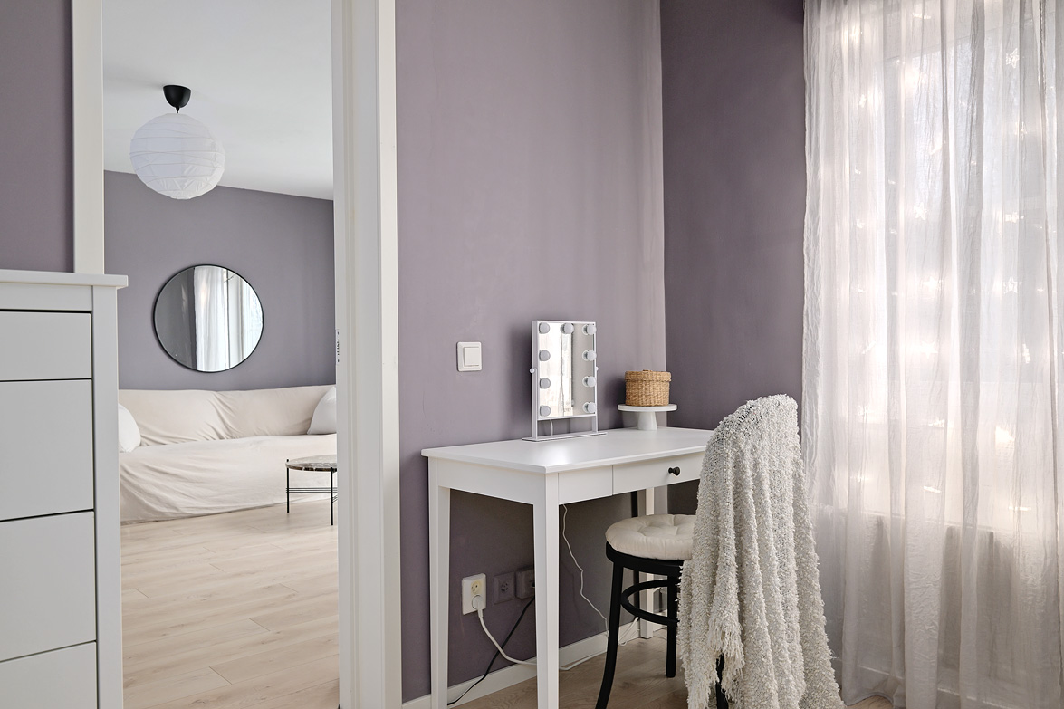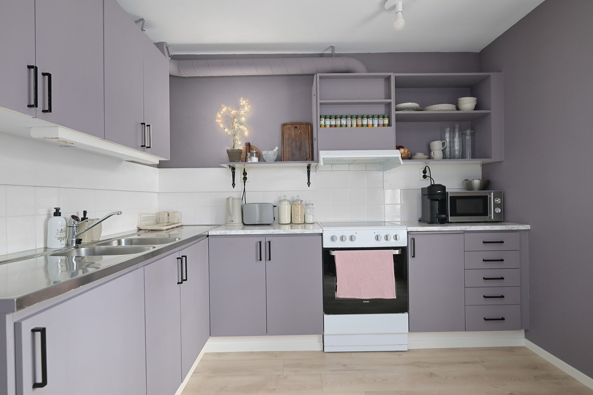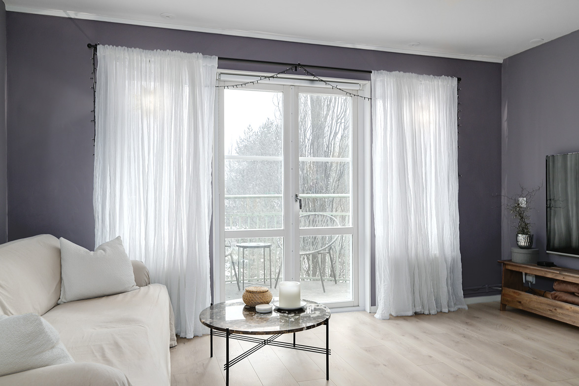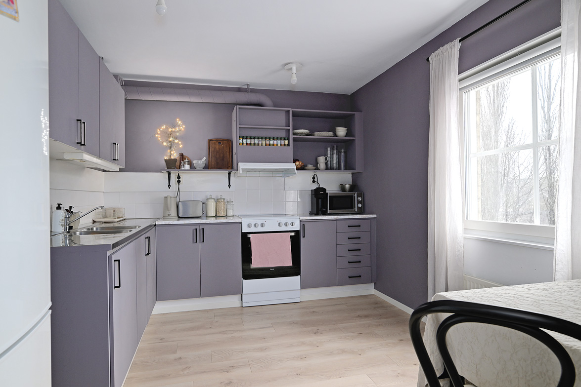 Hall Välkomnande hall med goda avhängningsmöjligheter. På vänster sida av hallen löper en vägg där man enkelt kan installera skjutdörrsgarderober för extra förvaring.Ljus parkett och lila väggar som löper genom bostaden. Vardagsrum Stort och luftigt vardagsrum med plats för både soffgrupp och matplats. Vackra dubbeldörrar med fönsterpartier samt utgång till balkong i halvmåneform mot innergården. Balkong Charmig balkong med rundad form och lugnt läge mot innergården – insynsskyddad pga sitt läge längst upp i huset. Här finns plats för en cafégrupp eller dylikt. Sovrum Sovrum med plats för dubbelsäng, sängbord och skrivbord om så önskas. Fönster mot innergården ger ett tyst och behagligt läge. Kök Ljust och funktionellt kök med fönster mot innergården. Utrustat med spis, kyl/frys, diskmaskin, diskho samt över- och underskåp med god förvaring. Badrum Stilfullt badrum med mönstrat klinkergolv och kakel i duschhörnan. Utrustat med WC, handfat, kommod med underskåp samt tvättmaskin.