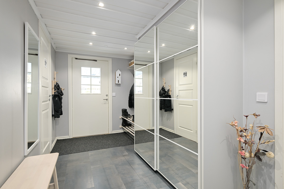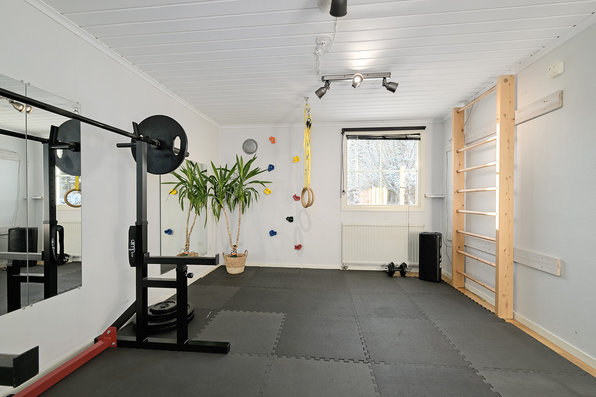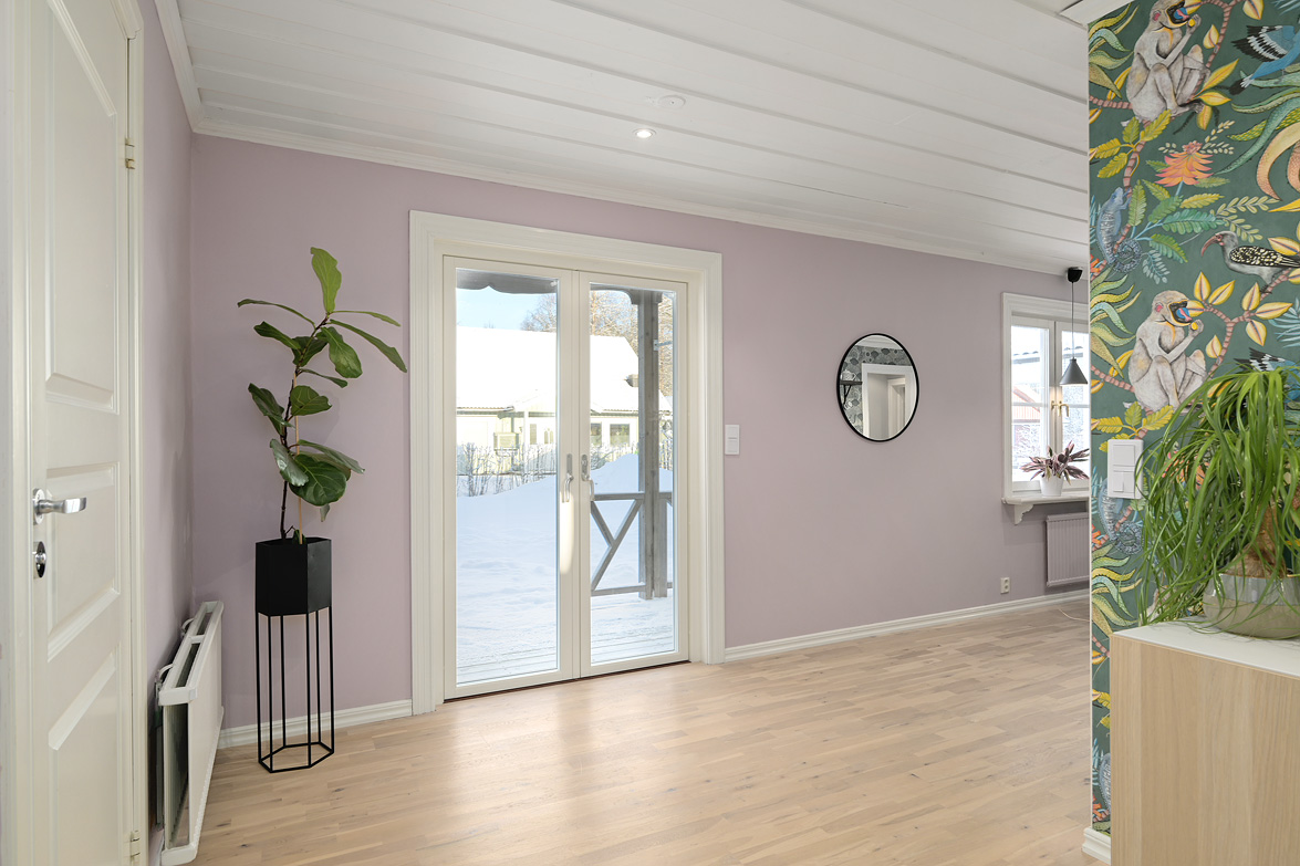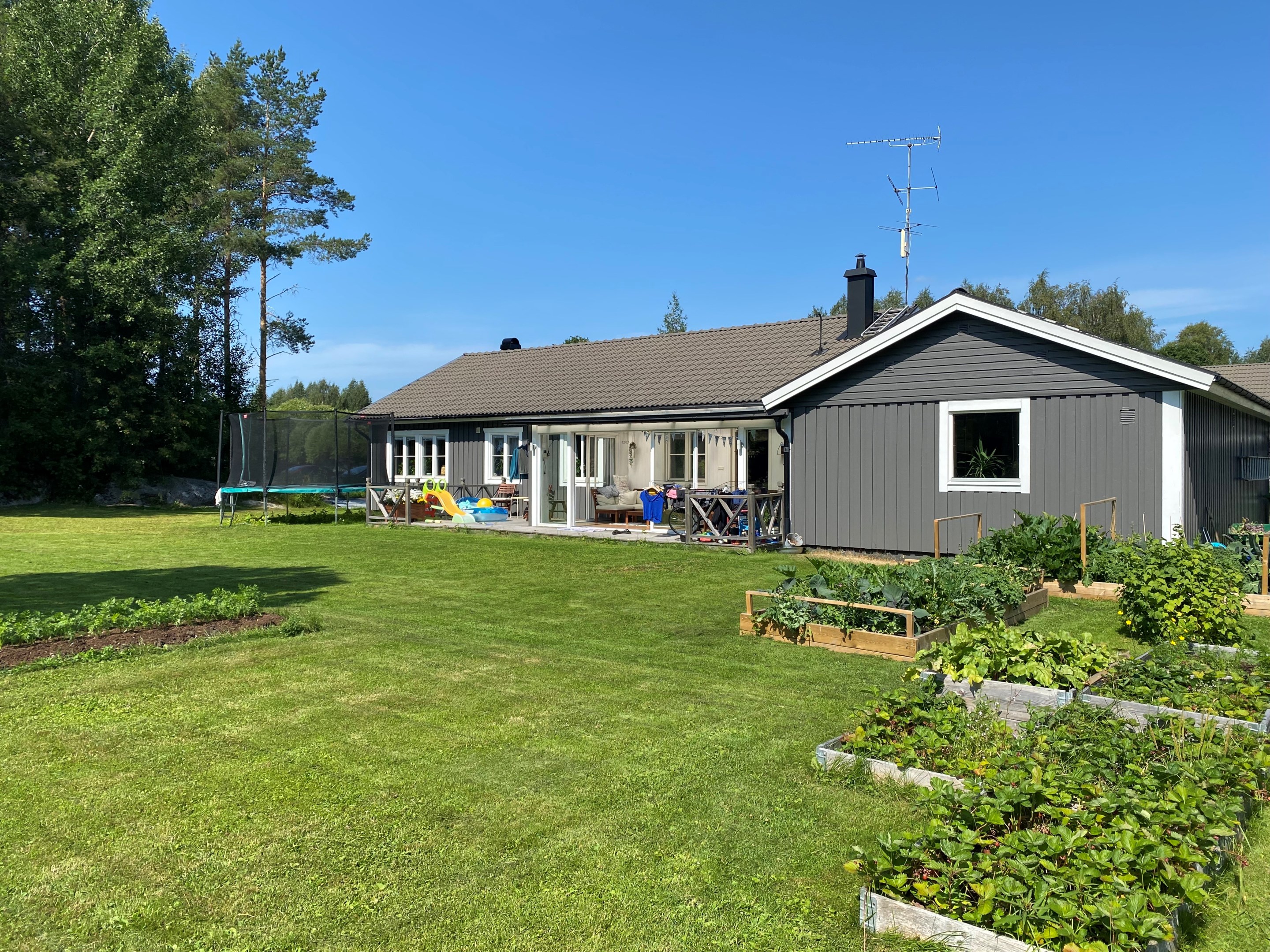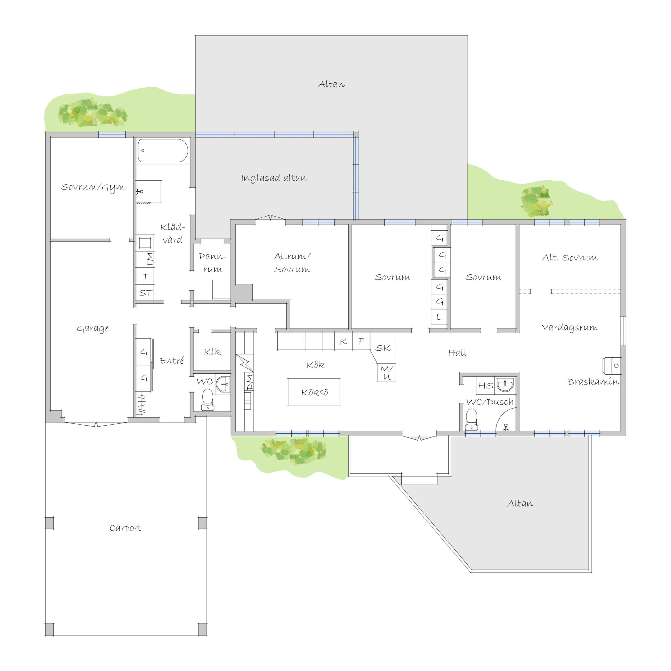 Välkommen in till en skön och hemtrevlig känsla där ett ljust parkettgolv löper från rum till rum, social planlösning, genomtänkta materialval och fönstersättning som skapar ett ljust och trivsamt hem. Hall Perfekta ytor där familjens kläder kan hängas upp öppet och dolt i skjutdörrsgarderob eller i garagedel direkt till vänster - perfekt yta för blöta kläder och skor. Ljusgrå väggar, gråmelerat golv och härliga spotlight i tak som ger både en ljus och lyxig känsla. Toalett Mindre toalett nås direkt från hall med wc, handfat med kommod och spegelskåp samt wc. Ljusa väggar till ljusgrå färg på golv. Kök Ljuvligt kök med allt man kan önska där infällda spotlights i tak och under överskåp ger ett härligt arbetsljus och en lyxig känsla. Köksinredningen erbjuder bra förvaring i flertalet skåp och lådor. Generösa och gedigna silestone-bänkskiva pryder arbetsytorna i köket och på den generösa köksön dukas det enkelt upp en härlig buffé under helger och årets alla högtider. Ett vitt kakel harmonierar fint till köksinredningen. Maskinerna består av öppen rostfri fläktkåpa, induktionshäll, ugn och mikro i högkåp samt diskmaskin och rostfri kyl och frys. Livfull blommig tapet till lätt rosa väggar och ljust parkettgolv.. Vardagsrum - ev sovrum 5 Här flödar ljuset från fönster i tre väderstreck med en kamin centralt placerad mellan de härliga sociala ytorna. Både matplats och den generösa soffan välkomnar familj och vänner. Ljusa väggar till vackert ljust parkettgolv. Om så önskas kan del av vardagsrum delas av till ett femte sovrum, se alternativ planlösning. Inglasad del Möblera fritt och njut under era lediga stunder i bästa solläge medan ni blickar ut över gården och dess gröna ytor - för odling, lek och bus. Klinker och parkettgolv till ljusa väggar. Glaspartierna kan öppnas upp så inne och utemiljön vävs samman på ett mycket smakfullt sätt. Nyttjas från tidig vår till sen höst, ett favoritrum helt enkelt, Sovrum 1 Är generöst och ger plats för dubbelsäng och övriga möbler. Har tidigare varit familjens allrum med direkt utgång till det inglasade uterummet. Väggarna har en dunkelt blå ton till skön mjuk matta på golv. Badrum Helkaklat badrum med vit tvättställskommod, högskåp, spegelskåp med infälld belysning, dusch och wc. Fönster vetter mot framsidan och möjliggör vädring och sprider ett härligt dagsljus. Grå melera klinker på golv till ljust kakel samt mörk mosaik på vägg. Golvet har skön golvvärme. Sovrum 2 Detta rum nås från inre hall och ger plats för säng, garderob och övrig möblering, fönster vetter mot basidan. Ljusa och målade väggar till fint parkettgolv. Sovrum 3 Även här ett rum som ger plats för valfri möblering som säng och skrivbord. Fönster mot baksidan och väggarna har en vit och blågrå ton. Sovrum 4 – Gym Här kan du möblera fritt efter familjens behov. Idag används rummet till gym och lekrum. Snacka om att enkelt få till träningen hemmavid. Ljusa väggar, parkettgolv med idag ett mjukt gymgolv, perfekt dämpande vid träning. Här finns även en matkällarlucka där du kan förvara sylt, saft och höstens skörd. Bad - Tvättstuga Här kan du ta ett värmande bad och sen direkt kliva ut till det mysiga uterummet och trädgården. Här finns även dusch och en gladbetongvägg som avgränsar ytorna mot tvättdelen. Välplanerad med bra förvaring i skåp och lådor. Arbetsbänk och tvättho gör vardagen enkel. Här finns tvättmaskin och torktumlare. Gråmelerat klinkergolv med skön golvvärme. Badrumsdel med klinker på vägg och övriga väggar har en lätt grå ton. Spotlight i tak ger ett skönt ljus. Gården Utemiljön är mycket trivsam med pallkragar, planteringar och altaner med olika sollägen där framsidan har morgon och kvällssol och baksidan har sol hela dagen. Den inglasade delen används stora delar av året, här vävs inne och utemiljön ihop. Garage med carport Rymlig dubbelcarport leder oss in till garage med bra ytor, perfekt för familjen med många intressen. Bra förvaring med plats för cyklar, skidor och familjens prylar de behöver i vardagen. Lätt att ställa en vagnskyddat under carporten eller styra in i det varma garaget. Välkommen till en välplanerad och rymlig enplansvilla – hoppas vi ses på visning!