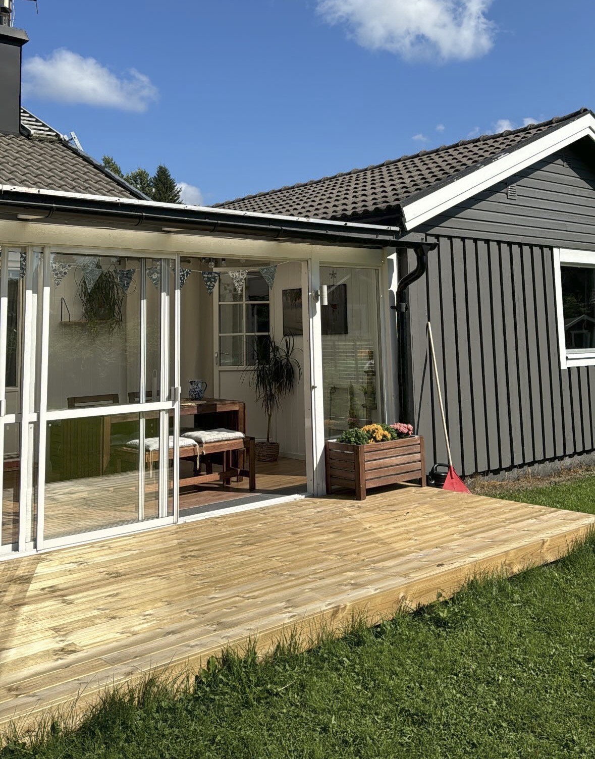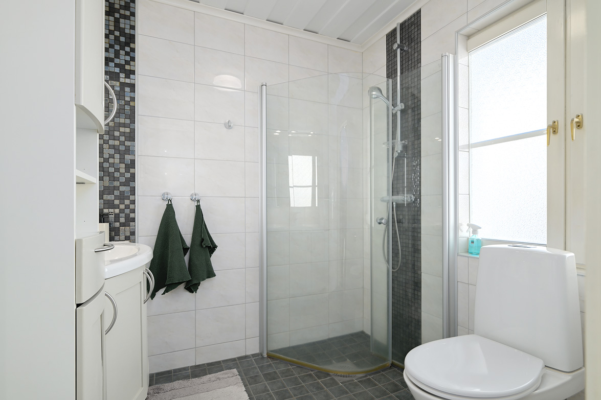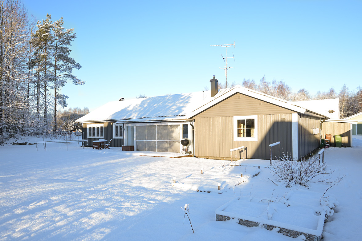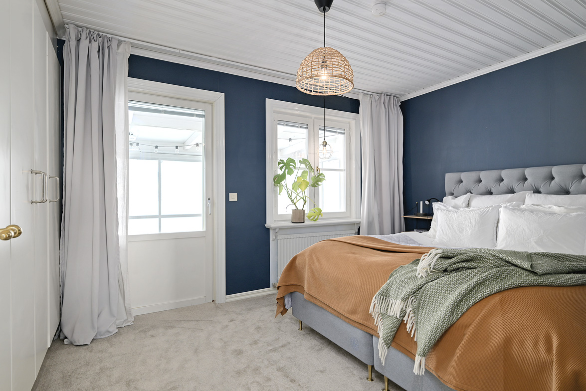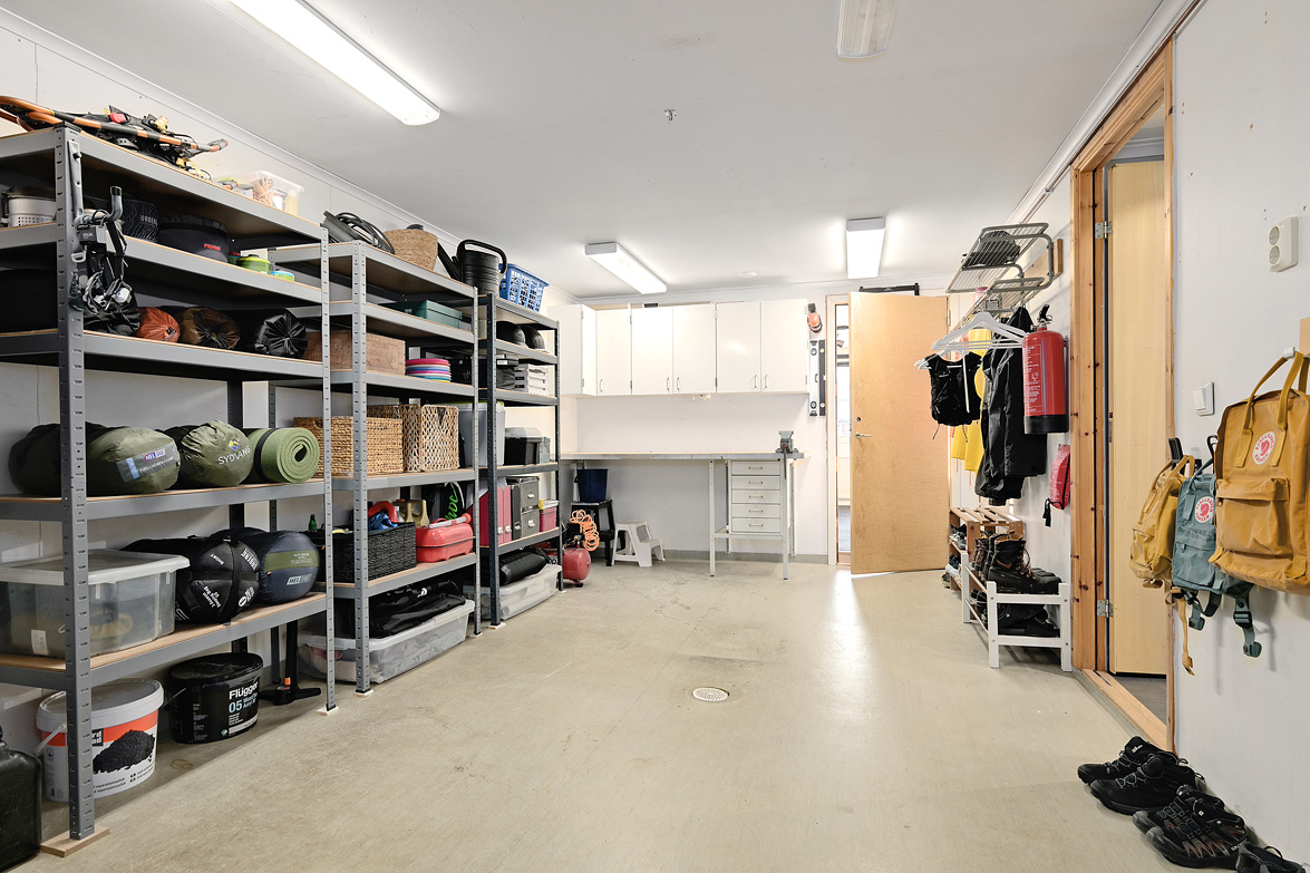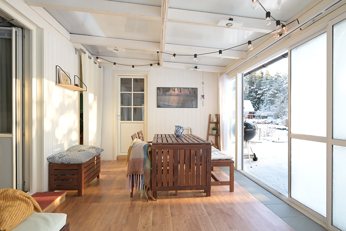 Välkommen in till en skön och hemtrevlig känsla där ett ljust parkettgolv löper från rum till rum, social planlösning, genomtänkta materialval och fönstersättning som skapar ett ljust och trivsamt hem. Hall Perfekta ytor där familjens kläder kan hängas upp öppet och dolt i skjutdörrsgarderob eller i garagedel direkt till vänster - perfekt yta för blöta kläder och skor. Ljusgrå väggar, gråmelerat golv och härliga spotlight i tak som ger både en ljus och lyxig känsla. Toalett Mindre toalett nås direkt från hall med wc, handfat med kommod och spegelskåp samt wc. Ljusa väggar till ljusgrå färg på golv. Kök Ljuvligt kök med allt man kan önska där infällda spotlights i tak och under överskåp ger ett härligt arbetsljus och en lyxig känsla. Köksinredningen erbjuder bra förvaring i flertalet skåp och lådor. Generösa och gedigna silestone-bänkskiva pryder arbetsytorna i köket och på den generösa köksön dukas det enkelt upp en härlig buffé under helger och årets alla högtider. Ett vitt kakel harmonierar fint till köksinredningen. Maskinerna består av öppen rostfri fläktkåpa, induktionshäll, ugn och mikro i högkåp samt diskmaskin och rostfri kyl och frys. Livfull blommig tapet till lätt rosa väggar och ljust parkettgolv.. Vardagsrum - ev sovrum 5 Här flödar ljuset från fönster i tre väderstreck med en kamin centralt placerad mellan de härliga sociala ytorna. Både matplats och den generösa soffan välkomnar familj och vänner. Ljusa väggar till vackert ljust parkettgolv. Om så önskas kan del av vardagsrum delas av till ett femte sovrum, se alternativ planlösning. Inglasad del Möblera fritt och njut under era lediga stunder i bästa solläge medan ni blickar ut över gården och dess gröna ytor - för odling, lek och bus. Klinker och parkettgolv till ljusa väggar. Glaspartierna kan öppnas upp så inne och utemiljön vävs samman på ett mycket smakfullt sätt. Nyttjas från tidig vår till sen höst, ett favoritrum helt enkelt, Sovrum 1 Är generöst och ger plats för dubbelsäng och övriga möbler. Har tidigare varit familjens allrum med direkt utgång till det inglasade uterummet. Väggarna har en dunkelt blå ton till skön mjuk matta på golv. Badrum Helkaklat badrum med vit tvättställskommod, högskåp, spegelskåp med infälld belysning, dusch och wc. Fönster vetter mot framsidan och möjliggör vädring och sprider ett härligt dagsljus. Grå melera klinker på golv till ljust kakel samt mörk mosaik på vägg. Golvet har skön golvvärme. Sovrum 2 Detta rum nås från inre hall och ger plats för säng, garderob och övrig möblering, fönster vetter mot basidan. Ljusa och målade väggar till fint parkettgolv. Sovrum 3 Även här ett rum som ger plats för valfri möblering som säng och skrivbord. Fönster mot baksidan och väggarna har en vit och blågrå ton. Sovrum 4 – Gym Här kan du möblera fritt efter familjens behov. Idag används rummet till gym och lekrum. Snacka om att enkelt få till träningen hemmavid. Ljusa väggar, parkettgolv med idag ett mjukt gymgolv, perfekt dämpande vid träning. Här finns även en matkällarlucka där du kan förvara sylt, saft och höstens skörd. Bad - Tvättstuga Här kan du ta ett värmande bad och sen direkt kliva ut till det mysiga uterummet och trädgården. Här finns även dusch och en gladbetongvägg som avgränsar ytorna mot tvättdelen. Välplanerad med bra förvaring i skåp och lådor. Arbetsbänk och tvättho gör vardagen enkel. Här finns tvättmaskin och torktumlare. Gråmelerat klinkergolv med skön golvvärme. Badrumsdel med klinker på vägg och övriga väggar har en lätt grå ton. Spotlight i tak ger ett skönt ljus. Gården Utemiljön är mycket trivsam med pallkragar, planteringar och altaner med olika sollägen där framsidan har morgon och kvällssol och baksidan har sol hela dagen. Den inglasade delen används stora delar av året, här vävs inne och utemiljön ihop. Garage med carport Rymlig dubbelcarport leder oss in till garage med bra ytor, perfekt för familjen med många intressen. Bra förvaring med plats för cyklar, skidor och familjens prylar de behöver i vardagen. Lätt att ställa en vagnskyddat under carporten eller styra in i det varma garaget. Välkommen till en välplanerad och rymlig enplansvilla – hoppas vi ses på visning!