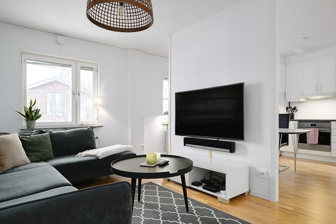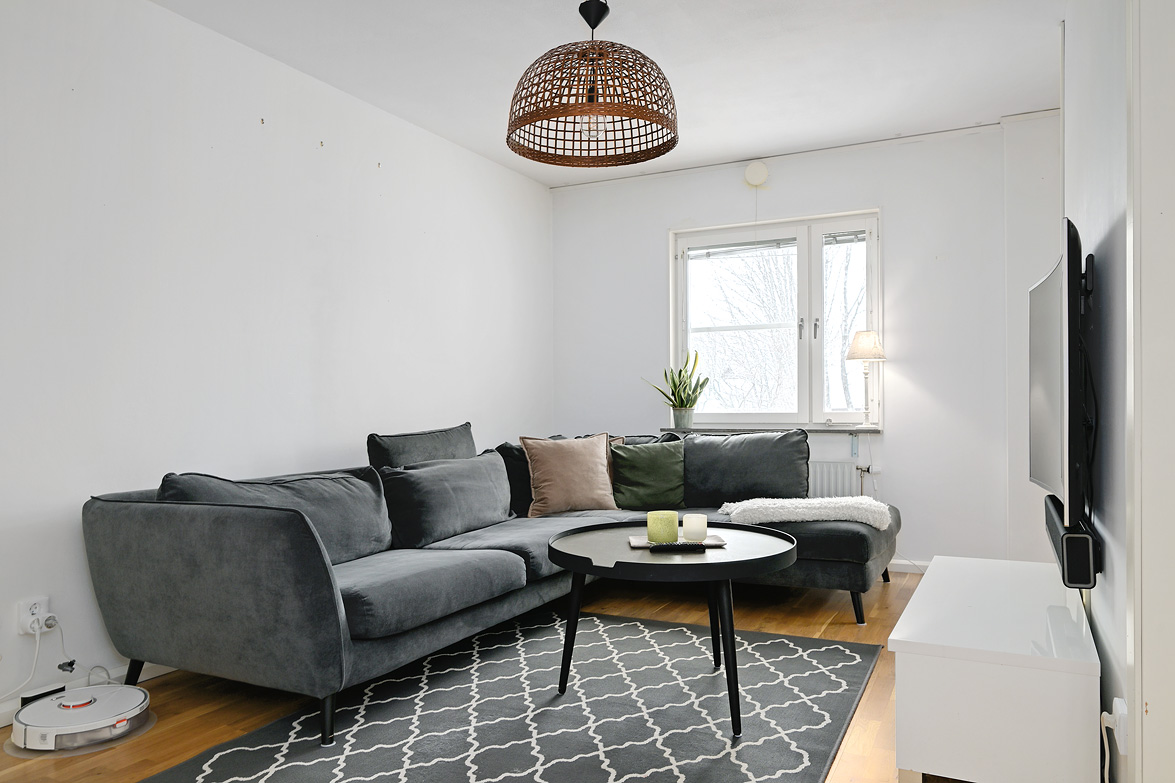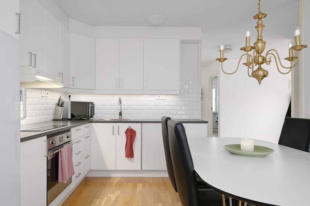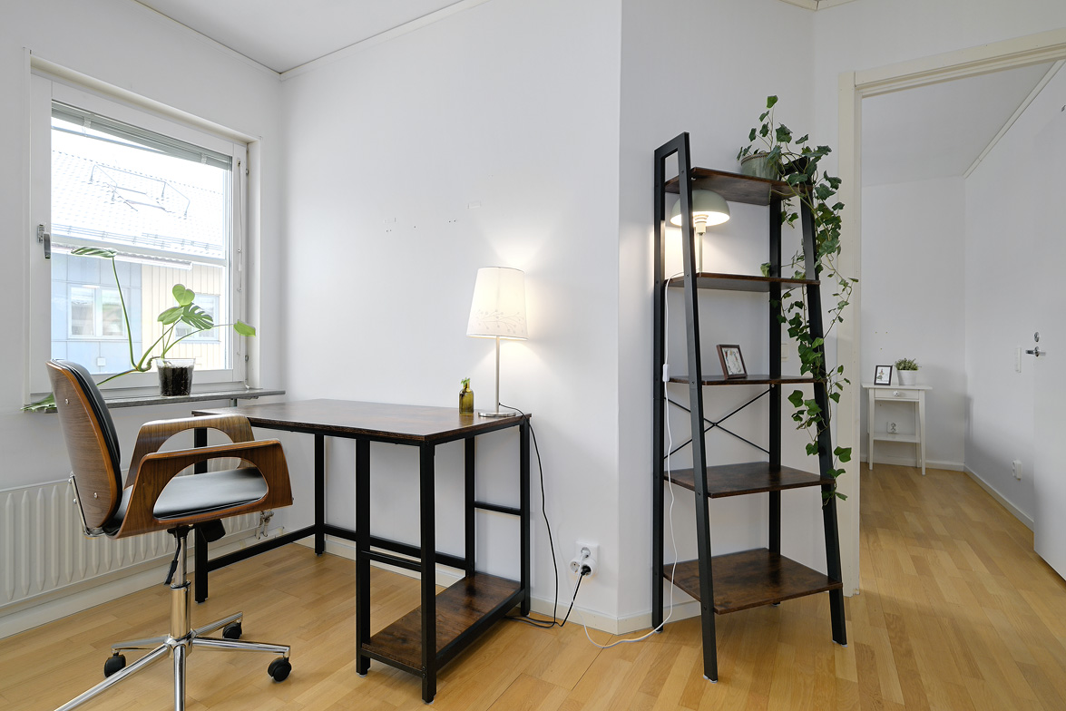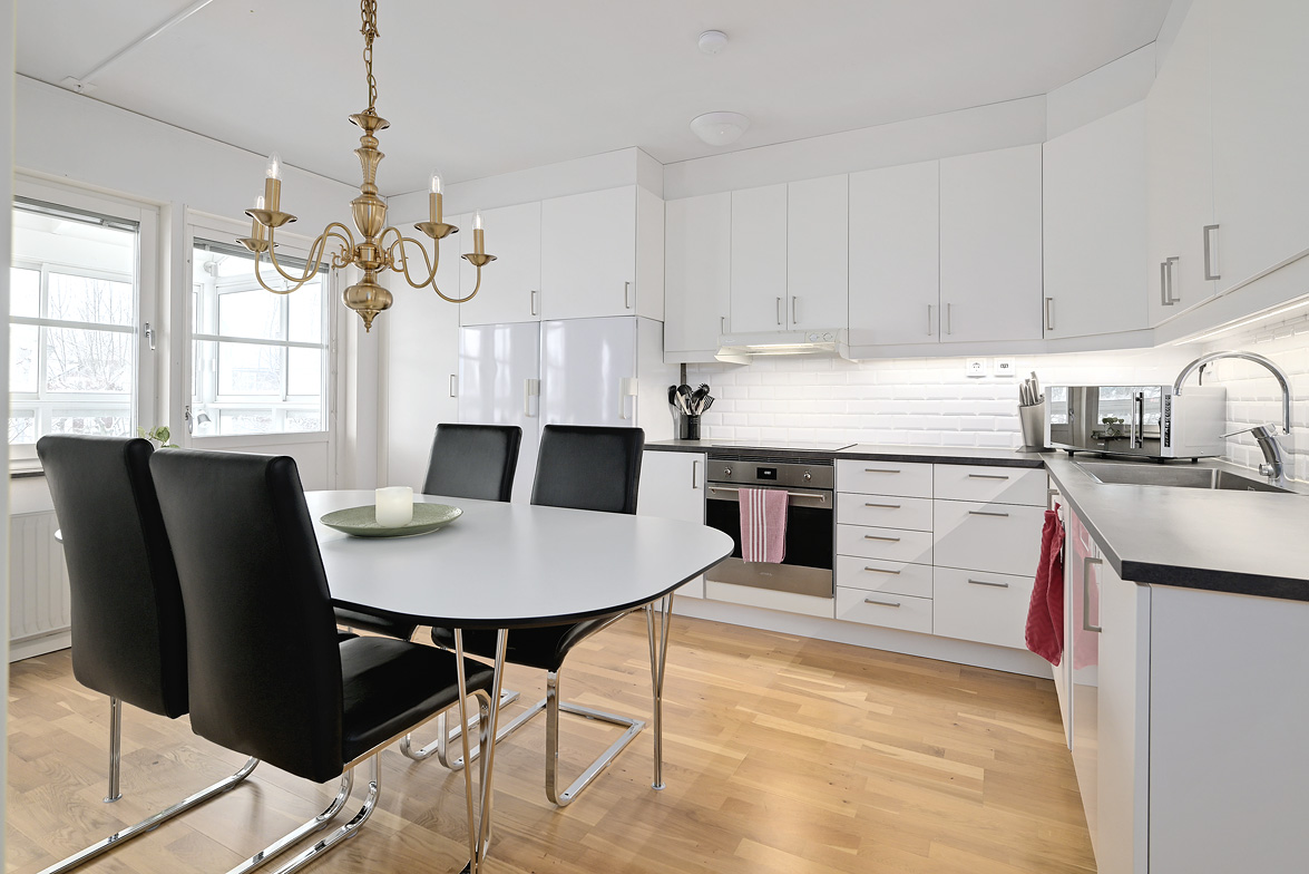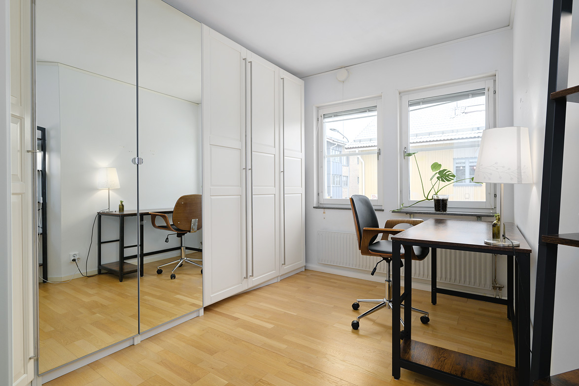 Hall Hall med hatthylla, ekparkettgolv och vita väggar. Kök Kök har gott om plats även för ett större matbord. Här får man ett modernt fullutrustat kök med inredning i vitt. I köket finns induktionshäll och inbyggnadsugn, ovan dessa sitter den en fläkt, fullstor kyl och frys, diskmaskin samt skafferi. Bänkskivorna är i mörkgrått laminat, ovan dessa sitter vitt kakel. Köket har ekparkettgolv och vita väggar. Från matplatsen har man utgång till den fina inglasade sydvästbalkongen som vetter mot den lummiga innergården. Vardagsrum Vardagsrum med ekparkettgolv och vita väggar. Det är två öppningar mellan vardagsrum och kök vilket ger en luftig känsla med fin kontakt mellan rummen. Badrum Det påkostade badrummet helrenoverades 2023. Det är idag helkaklat och försett med golvvärme, i taket sitter det infälld spotlightbelysning. I badrummet finns ett vägghängt wc, dusch med vikdörrar i glas, här man har en inbyggd förvaringshylla i duschplatsen, kommod med tvättställ och spegel samt en tvättmaskin med inbyggd tumlare. Badrummet är även försett med ett högt placerat fönster. Sovrum Sovrum med ekparkettgolv och vita väggar. Sovrum/allrum Detta rum används idag som kontor, och det kan lika väl fungera som ett andra sovrum. Rummet har ekparkett och vita väggar, här finns ett stort antal garderober varav två är försedda med speglar. Lägenheten är ljus och välrenoverad, den har genomgående ekparkettgolv och ljus färgsättning.