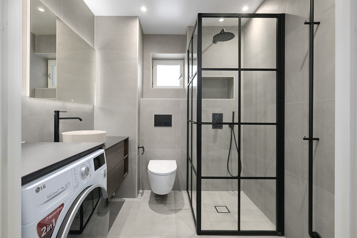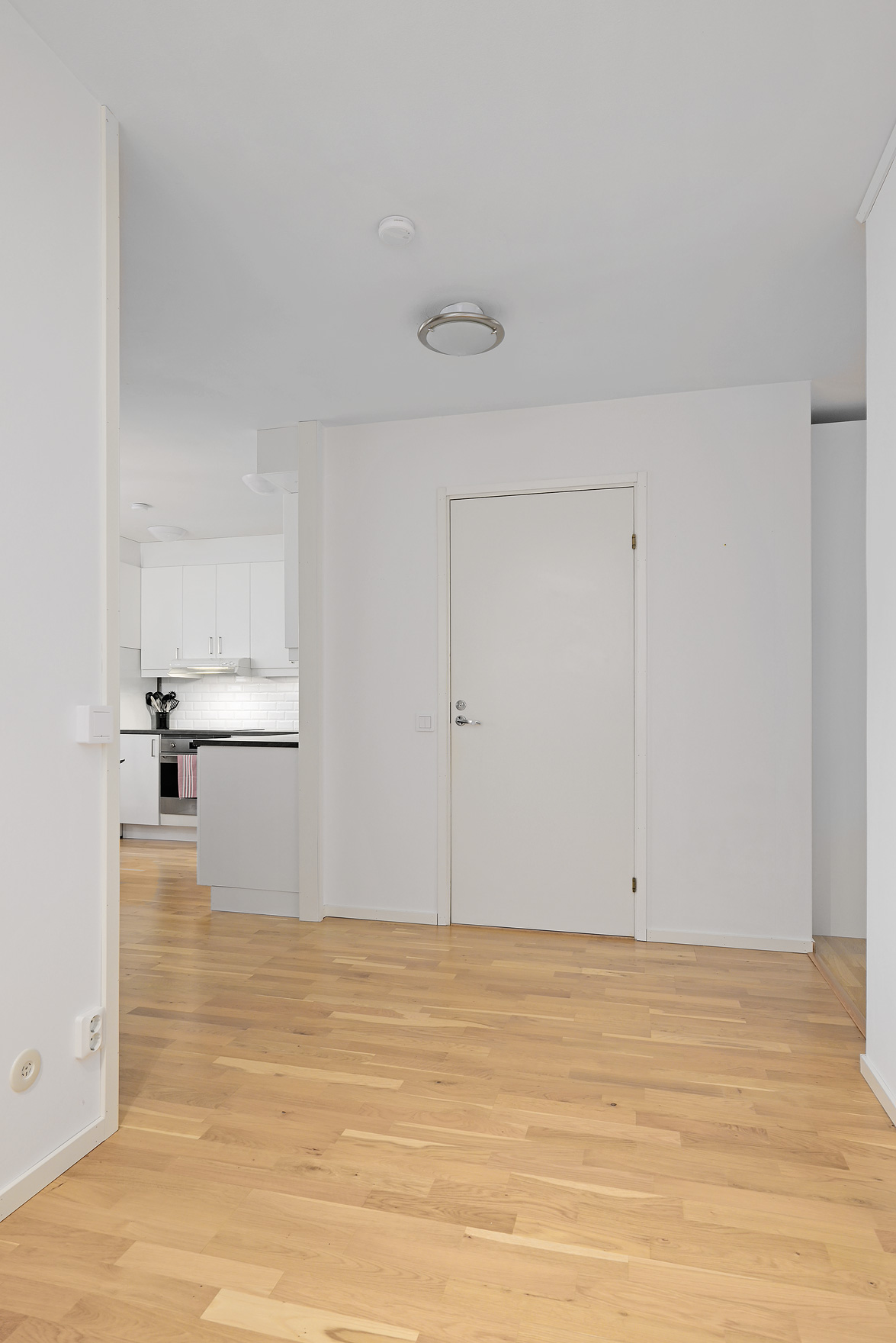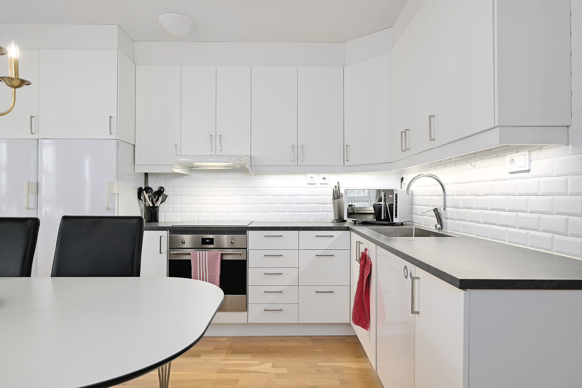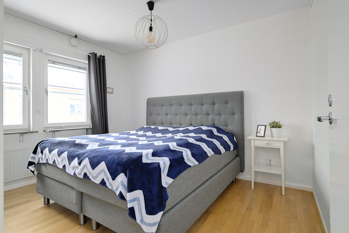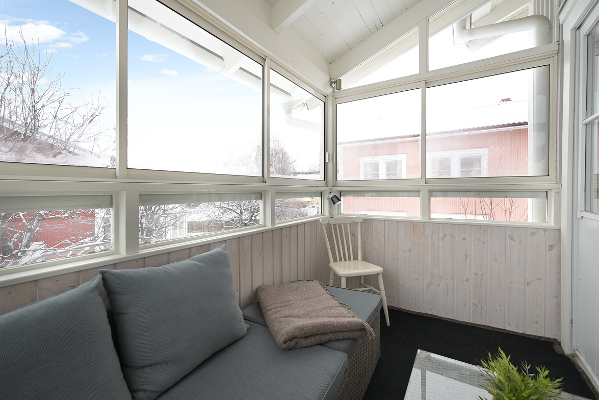 Hall Hall med hatthylla, ekparkettgolv och vita väggar. Kök Kök har gott om plats även för ett större matbord. Här får man ett modernt fullutrustat kök med inredning i vitt. I köket finns induktionshäll och inbyggnadsugn, ovan dessa sitter den en fläkt, fullstor kyl och frys, diskmaskin samt skafferi. Bänkskivorna är i mörkgrått laminat, ovan dessa sitter vitt kakel. Köket har ekparkettgolv och vita väggar. Från matplatsen har man utgång till den fina inglasade sydvästbalkongen som vetter mot den lummiga innergården. Vardagsrum Vardagsrum med ekparkettgolv och vita väggar. Det är två öppningar mellan vardagsrum och kök vilket ger en luftig känsla med fin kontakt mellan rummen. Badrum Det påkostade badrummet helrenoverades 2023. Det är idag helkaklat och försett med golvvärme, i taket sitter det infälld spotlightbelysning. I badrummet finns ett vägghängt wc, dusch med vikdörrar i glas, här man har en inbyggd förvaringshylla i duschplatsen, kommod med tvättställ och spegel samt en tvättmaskin med inbyggd tumlare. Badrummet är även försett med ett högt placerat fönster. Sovrum Sovrum med ekparkettgolv och vita väggar. Sovrum/allrum Detta rum används idag som kontor, och det kan lika väl fungera som ett andra sovrum. Rummet har ekparkett och vita väggar, här finns ett stort antal garderober varav två är försedda med speglar. Lägenheten är ljus och välrenoverad, den har genomgående ekparkettgolv och ljus färgsättning.