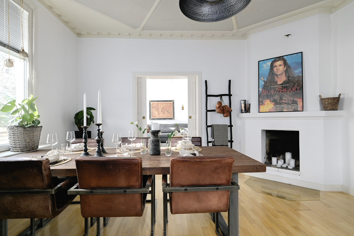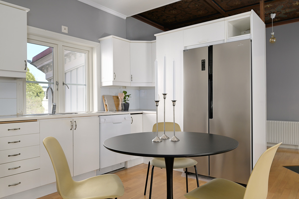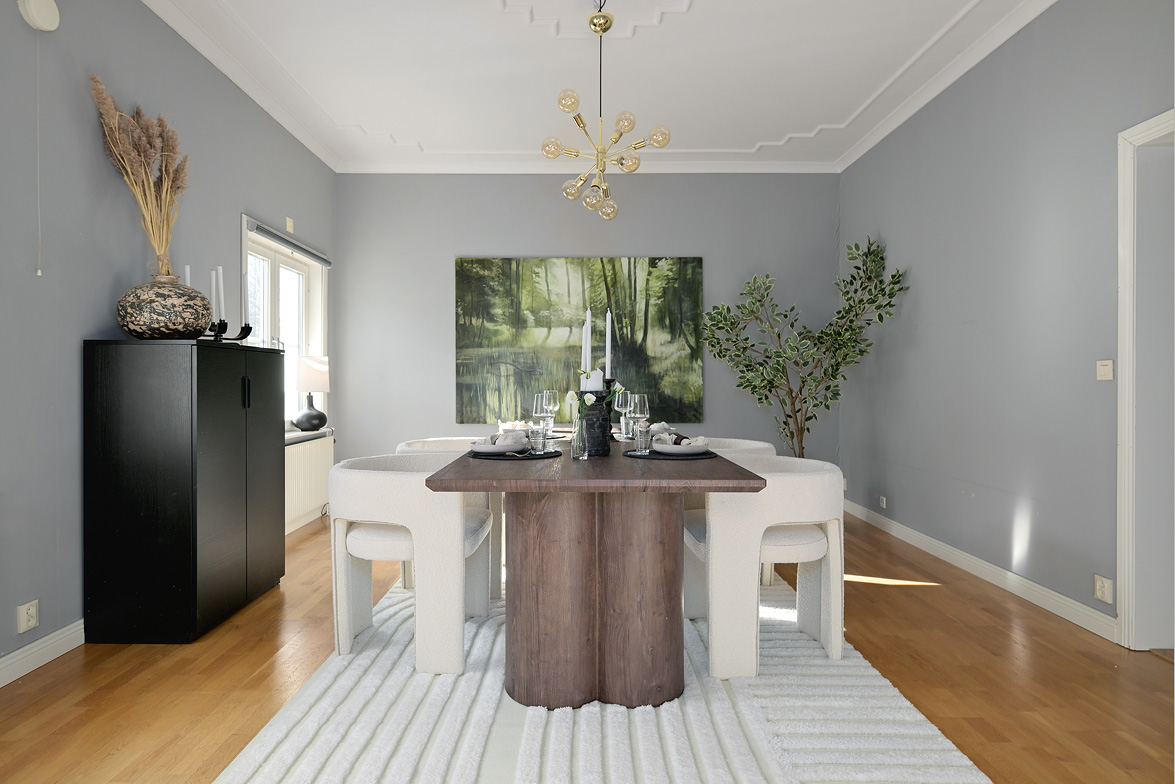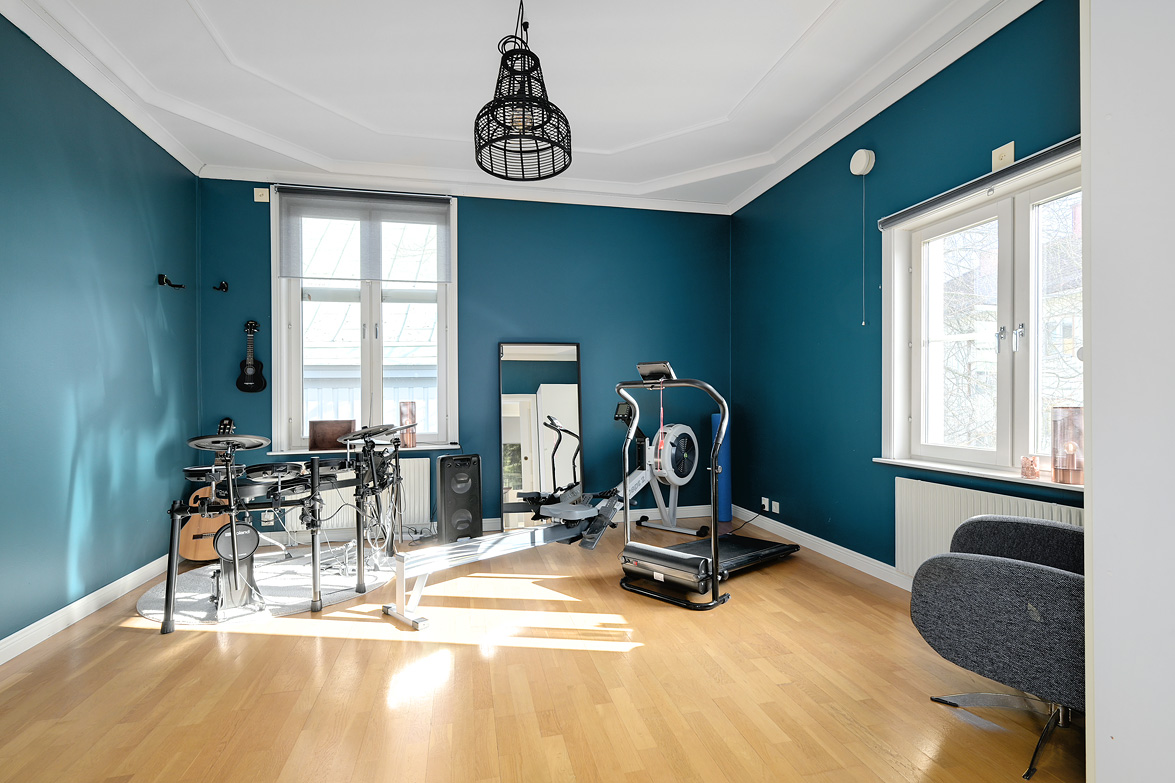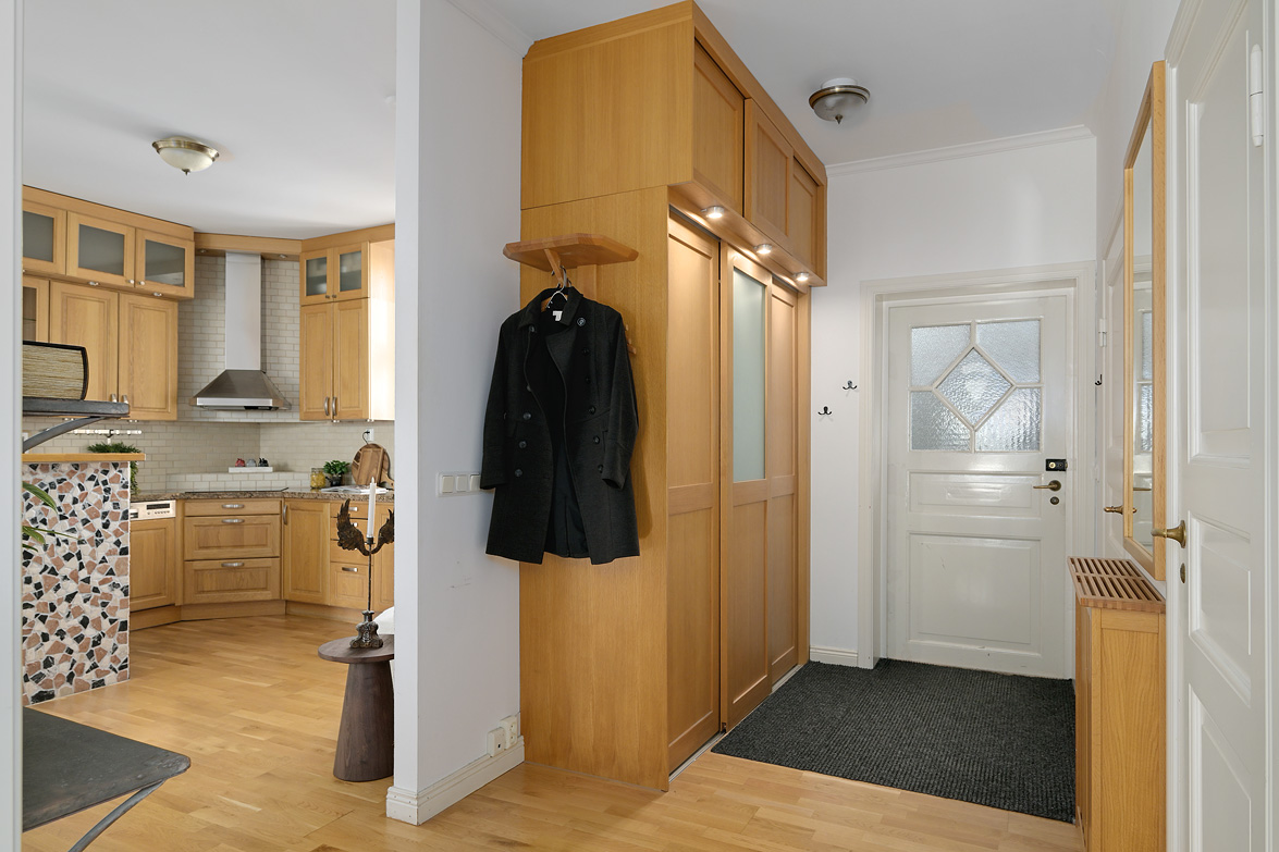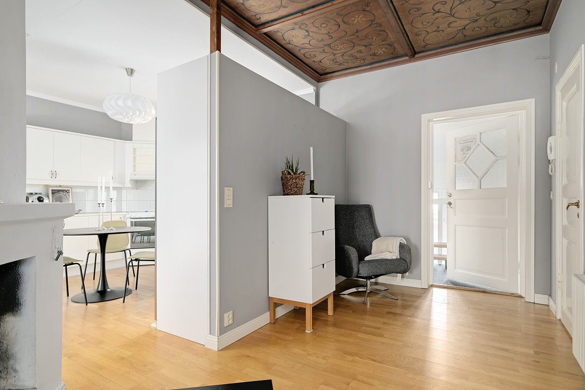 Bottenplans lägenheten om ca 140 kvm och övre plan om ca 90 kvm. Lägenhet bottenplan Luftig och inbjudande hall, här finns gott om plats för ytterkläder i en platsbyggd skjutdörrsgarderob i massiv ek, byggd av lokal snickare och utrustad med både spegel och infälld belysning. De vackra golvytorna pryds av klassisk ekparkett som löper vidare genom hemmets rum och skapar en enhetlig känsla, väggarna har en ljus ton. Rakt fram från hallen öppnar bostaden upp sig mot den representativa delen med matrum och vardagsrum. Här möts ni av tidstypiska skjutdörrar mellan rummen, vacker stuckatur och takmålningar utförda av den kände formgivaren och konstnären Otto Wretling. Den stilsäkra öppna spisen ger både värme och karaktär (behöver ses över innan eldning) och blir en naturlig samlingspunkt under årets kallare månader. Väggarna har en ljus tapet som förstärker rummens rymd. Vidare in i vardagsrummet väntar samma generösa takhöjd och stora fönsterpartier som skapar ett fantastiskt ljusflöde. De rymliga ytorna ger stor flexibilitet att möblera med såväl soffgrupp som övrigt möblemang. Även här återfinns vacker stuckatur i taket, genomgående ljusa väggar och parkettgolv som knyter samman hemmet på ett smakfullt sätt. Direkt till vänster från hallen finner ni ett helkaklat tvättrum med tvättmaskin, i stilrena blå och vita toner – fullt utrustat för att möta familjens behov av smidig klädvård. Från hallen nås även ett av hemmets badrum. Smakfullt inrett med kakel och klinker i gråblå nyanser samt behaglig golvvärme. Här finns kommod med handfat och spegelskåp, wc samt ett härligt badkar. Fönster bidrar med både dagsljus och möjlighet till vädring – en praktisk och trivsam lösning i vardagen. Köket är en dröm för den matglade. Ett generöst Tibrokök med luckor i massiv ek, vackra vitrinskåp och infälld belysning skapar en exklusiv känsla. De påkostade bänkskivorna i italiensk marmor harmonierar med ljust beige kakel. Maskinparken i rostfritt består av side-by-side kyl och frys, diskmaskin, inbyggd ugn och mikro samt fläktkåpa. En trevlig vinkellösning med ekskiva och skifferliknande ytskikt ramar in den infällda diskhon. Intill finns en mysig matplats med karaktärsfull bambutapet – perfekt för såväl vardagsmiddagar som långa frukostar. Det större badrummet är ett riktigt hemmaspa. Helkaklat och generöst tilltaget med spotlights och stämningsfull stjärnhimmel i taket. Två stora fönster ger rikligt med ljus över väggar och golv i varma vit/beige toner. Här finns duschhörna med välvda mosaikväggar, rymlig kommod i körsbärsträ med tillhörande spegelskåp, wc, en rymlig bastu samt ett inbjudande bubbelbadkar (ej använt funktionerna på länge). Sovrummet på entréplan erbjuder gott om plats för en större säng. Längs ena väggen löper skjutdörrsgarderober i massiv ek som rymmer en generös förvaring. Väggarna är ljusa och skapar en lugn atmosfär. En vacker ektrappa leder upp till ytterligare två sovrum samt wc. Båda rummen har ljusa väggar och fint ljusinsläpp från fönster. Det ena rummet är utrustat med skjutdörrsgarderob i massiv ek med infällda spotlights. Mellan rummen finns en inbyggd bokhylla som ger charm och karaktär, samt en mindre wc. Även här löper den vackra ekparketten vidare och binder samman våningsplanet på ett enhetligt och stilfullt sätt. Lägenhet övre plan Trapphuset leder oss upp till en unik och charmfull 3:a om ca 90 kvm. Redan vid entrén möts ni av en vacker ytterdörr och en praktisk hallmöbel där ytterkläder smidigt kan hängas av. Hallen är storslagen med sina unika och välbevarade takmålningar av Otto Wretling – en detalj som ger bostaden en alldeles särskild karaktär. Om elden sprakar i öppna spisen när du kliver in infinner sig genast en varm och inbjudande känsla. Väggen mot köket går inte hela vägen upp, vilket skapar ett härligt ljusflöde och en luftig atmosfär. Ljusgrå tapeter och vacker ekparkett, som löper vidare mot kök, vilket ger ett harmoniskt intryck. Till vänster från hall finns en rymlig klädkammare med gott om förvaring för både kläder och annat som behöver stuvas undan. Från hallen nås även det helkaklade badrummet i mjukt ljusrosa toner. Här finns handfat med spegel, wc och badkar. Det stora fönstret ger rummet ett fint dagsljus och en känsla av rymd. Rakt fram öppnar bostaden upp sig mot den representativa delen med luftigt matrum (idag musikrum) och vardagsrum. Tidstypiska skjutdörrar, vacker stuckatur, generös takhöjd och stora fönster skapar en elegant och trivsam miljö. Köket är klassiskt vitt med vita luckor och kakel samt flera öppna sidoskåp som ger både charm och praktisk förvaring. Den mörka bänkskivan bryter av stilfullt mot det ljusa och diskhon är elegant infälld. Fönstrets placering ger fint ljus över arbetsytorna. Side-by-side kyl och frys, spis med häll och ugn samt fläkt. Även här löper en färg på väggarna och binder samman bostadens stil. Sovrummet erbjuder gott om plats för säng och kompletterande möbler. Här finns praktisk förvaring i garderob samt ett generöst fönster som ger ett härligt ljusinsläpp och möjlighet till vädring. Rummet präglas av ljusa väggar och ett vackert ekparkettgolv som skapar en trivsam och ombonad känsla. Källare I källarplanet möts du av klinkergolv och ljusa väggar. Här finns en rymlig tvättstuga samt flera förråd, varav ett lämpar sig utmärkt som vinkällare. Helt enkelt en bostad med själ och vackra tidstypiska detaljer med centralt läge – perfekt för dig som söker något utöver det vanliga.