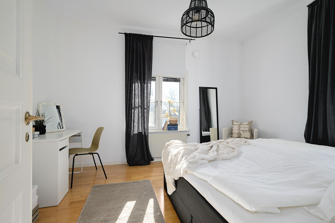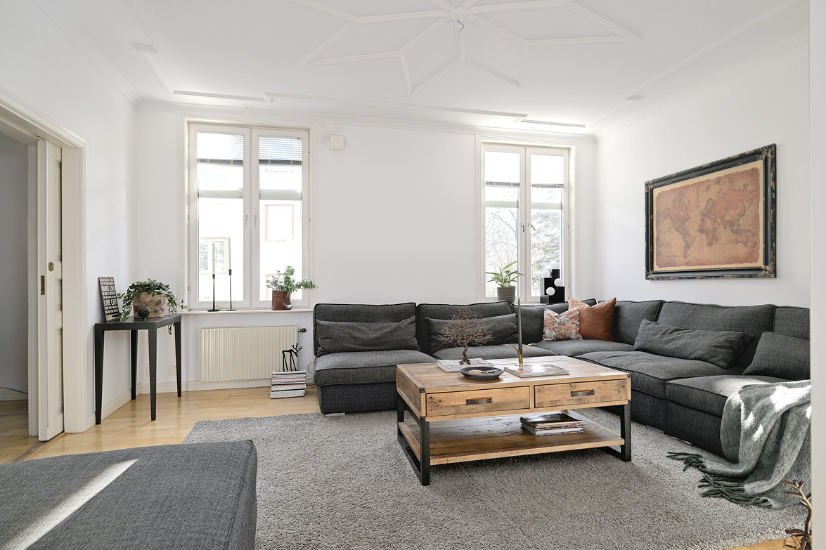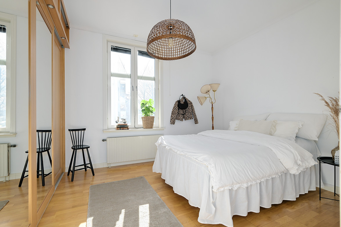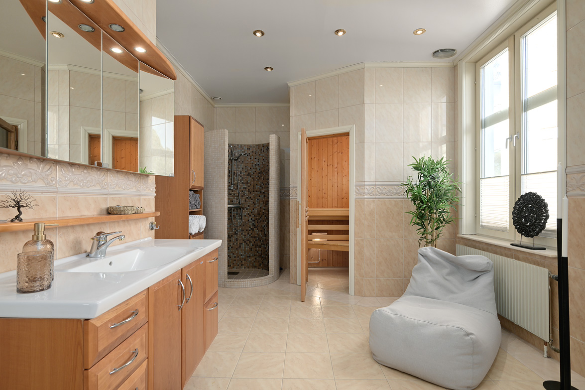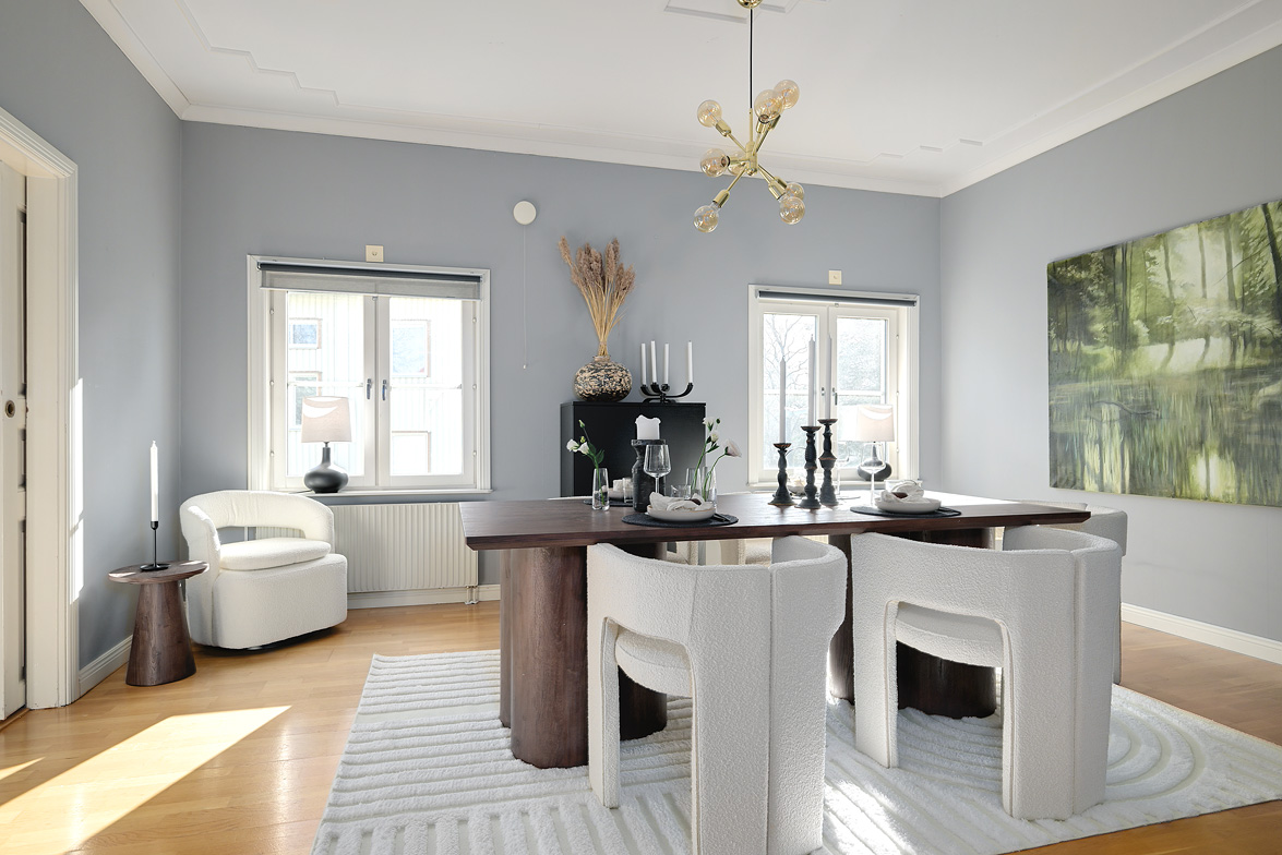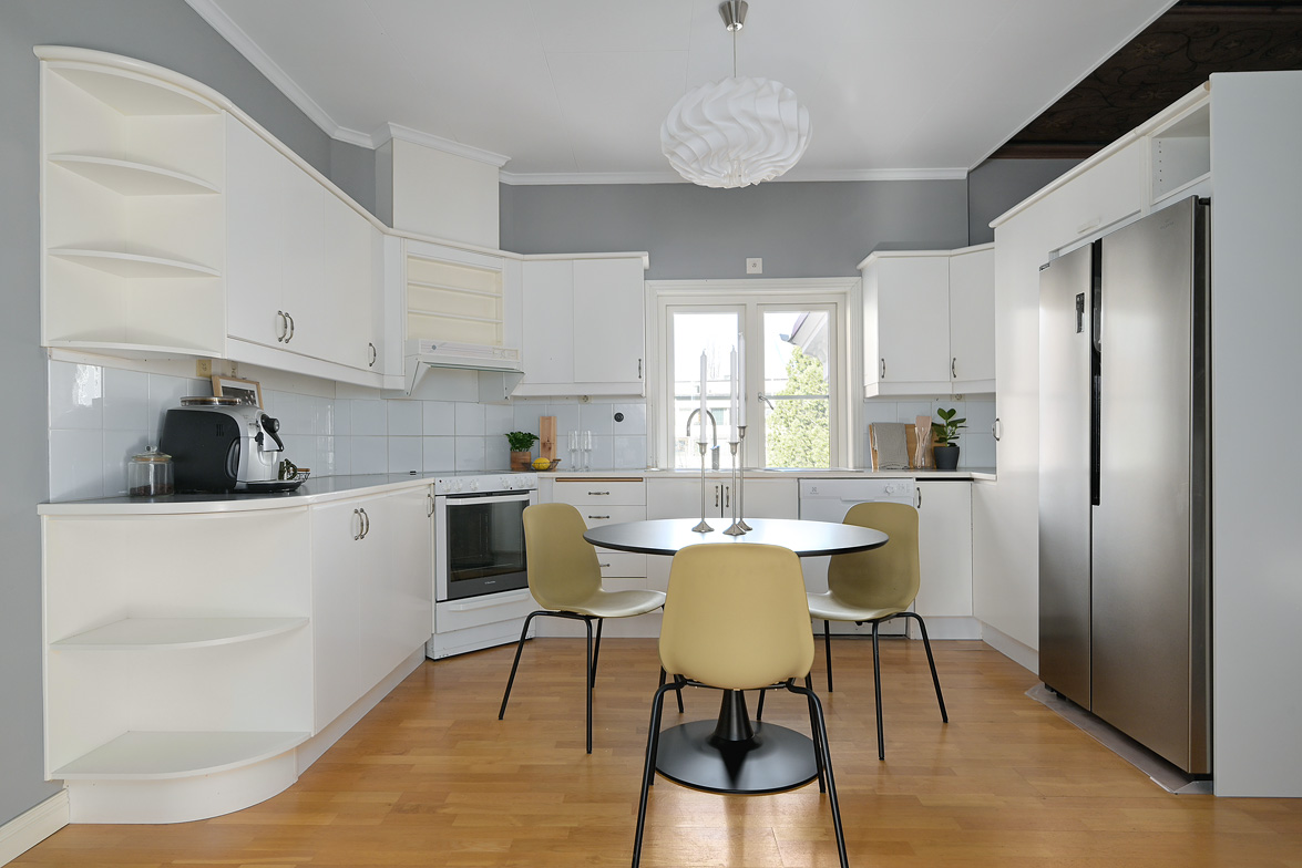 Bottenplans lägenheten om ca 140 kvm och övre plan om ca 90 kvm. Lägenhet bottenplan Luftig och inbjudande hall, här finns gott om plats för ytterkläder i en platsbyggd skjutdörrsgarderob i massiv ek, byggd av lokal snickare och utrustad med både spegel och infälld belysning. De vackra golvytorna pryds av klassisk ekparkett som löper vidare genom hemmets rum och skapar en enhetlig känsla, väggarna har en ljus ton. Rakt fram från hallen öppnar bostaden upp sig mot den representativa delen med matrum och vardagsrum. Här möts ni av tidstypiska skjutdörrar mellan rummen, vacker stuckatur och takmålningar utförda av den kände formgivaren och konstnären Otto Wretling. Den stilsäkra öppna spisen ger både värme och karaktär (behöver ses över innan eldning) och blir en naturlig samlingspunkt under årets kallare månader. Väggarna har en ljus tapet som förstärker rummens rymd. Vidare in i vardagsrummet väntar samma generösa takhöjd och stora fönsterpartier som skapar ett fantastiskt ljusflöde. De rymliga ytorna ger stor flexibilitet att möblera med såväl soffgrupp som övrigt möblemang. Även här återfinns vacker stuckatur i taket, genomgående ljusa väggar och parkettgolv som knyter samman hemmet på ett smakfullt sätt. Direkt till vänster från hallen finner ni ett helkaklat tvättrum med tvättmaskin, i stilrena blå och vita toner – fullt utrustat för att möta familjens behov av smidig klädvård. Från hallen nås även ett av hemmets badrum. Smakfullt inrett med kakel och klinker i gråblå nyanser samt behaglig golvvärme. Här finns kommod med handfat och spegelskåp, wc samt ett härligt badkar. Fönster bidrar med både dagsljus och möjlighet till vädring – en praktisk och trivsam lösning i vardagen. Köket är en dröm för den matglade. Ett generöst Tibrokök med luckor i massiv ek, vackra vitrinskåp och infälld belysning skapar en exklusiv känsla. De påkostade bänkskivorna i italiensk marmor harmonierar med ljust beige kakel. Maskinparken i rostfritt består av side-by-side kyl och frys, diskmaskin, inbyggd ugn och mikro samt fläktkåpa. En trevlig vinkellösning med ekskiva och skifferliknande ytskikt ramar in den infällda diskhon. Intill finns en mysig matplats med karaktärsfull bambutapet – perfekt för såväl vardagsmiddagar som långa frukostar. Det större badrummet är ett riktigt hemmaspa. Helkaklat och generöst tilltaget med spotlights och stämningsfull stjärnhimmel i taket. Två stora fönster ger rikligt med ljus över väggar och golv i varma vit/beige toner. Här finns duschhörna med välvda mosaikväggar, rymlig kommod i körsbärsträ med tillhörande spegelskåp, wc, en rymlig bastu samt ett inbjudande bubbelbadkar (ej använt funktionerna på länge). Sovrummet på entréplan erbjuder gott om plats för en större säng. Längs ena väggen löper skjutdörrsgarderober i massiv ek som rymmer en generös förvaring. Väggarna är ljusa och skapar en lugn atmosfär. En vacker ektrappa leder upp till ytterligare två sovrum samt wc. Båda rummen har ljusa väggar och fint ljusinsläpp från fönster. Det ena rummet är utrustat med skjutdörrsgarderob i massiv ek med infällda spotlights. Mellan rummen finns en inbyggd bokhylla som ger charm och karaktär, samt en mindre wc. Även här löper den vackra ekparketten vidare och binder samman våningsplanet på ett enhetligt och stilfullt sätt. Lägenhet övre plan Trapphuset leder oss upp till en unik och charmfull 3:a om ca 90 kvm. Redan vid entrén möts ni av en vacker ytterdörr och en praktisk hallmöbel där ytterkläder smidigt kan hängas av. Hallen är storslagen med sina unika och välbevarade takmålningar av Otto Wretling – en detalj som ger bostaden en alldeles särskild karaktär. Om elden sprakar i öppna spisen när du kliver in infinner sig genast en varm och inbjudande känsla. Väggen mot köket går inte hela vägen upp, vilket skapar ett härligt ljusflöde och en luftig atmosfär. Ljusgrå tapeter och vacker ekparkett, som löper vidare mot kök, vilket ger ett harmoniskt intryck. Till vänster från hall finns en rymlig klädkammare med gott om förvaring för både kläder och annat som behöver stuvas undan. Från hallen nås även det helkaklade badrummet i mjukt ljusrosa toner. Här finns handfat med spegel, wc och badkar. Det stora fönstret ger rummet ett fint dagsljus och en känsla av rymd. Rakt fram öppnar bostaden upp sig mot den representativa delen med luftigt matrum (idag musikrum) och vardagsrum. Tidstypiska skjutdörrar, vacker stuckatur, generös takhöjd och stora fönster skapar en elegant och trivsam miljö. Köket är klassiskt vitt med vita luckor och kakel samt flera öppna sidoskåp som ger både charm och praktisk förvaring. Den mörka bänkskivan bryter av stilfullt mot det ljusa och diskhon är elegant infälld. Fönstrets placering ger fint ljus över arbetsytorna. Side-by-side kyl och frys, spis med häll och ugn samt fläkt. Även här löper en färg på väggarna och binder samman bostadens stil. Sovrummet erbjuder gott om plats för säng och kompletterande möbler. Här finns praktisk förvaring i garderob samt ett generöst fönster som ger ett härligt ljusinsläpp och möjlighet till vädring. Rummet präglas av ljusa väggar och ett vackert ekparkettgolv som skapar en trivsam och ombonad känsla. Källare I källarplanet möts du av klinkergolv och ljusa väggar. Här finns en rymlig tvättstuga samt flera förråd, varav ett lämpar sig utmärkt som vinkällare. Helt enkelt en bostad med själ och vackra tidstypiska detaljer med centralt läge – perfekt för dig som söker något utöver det vanliga.