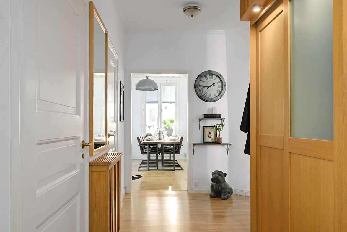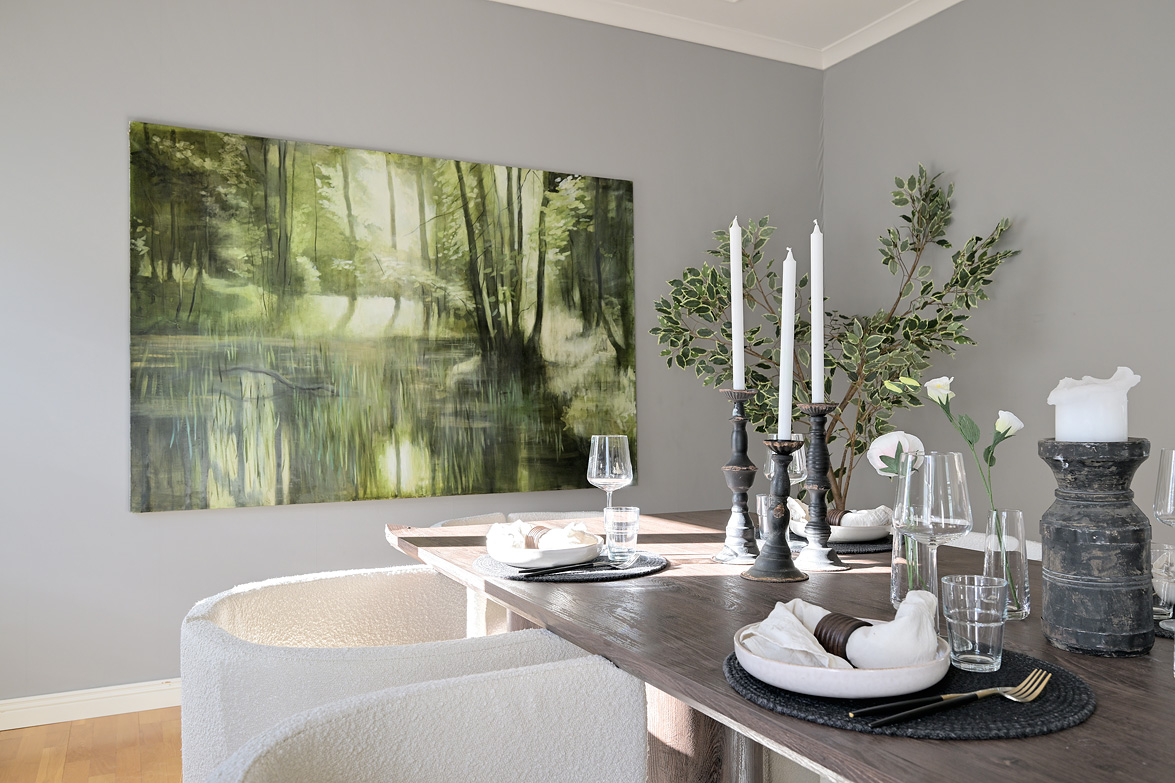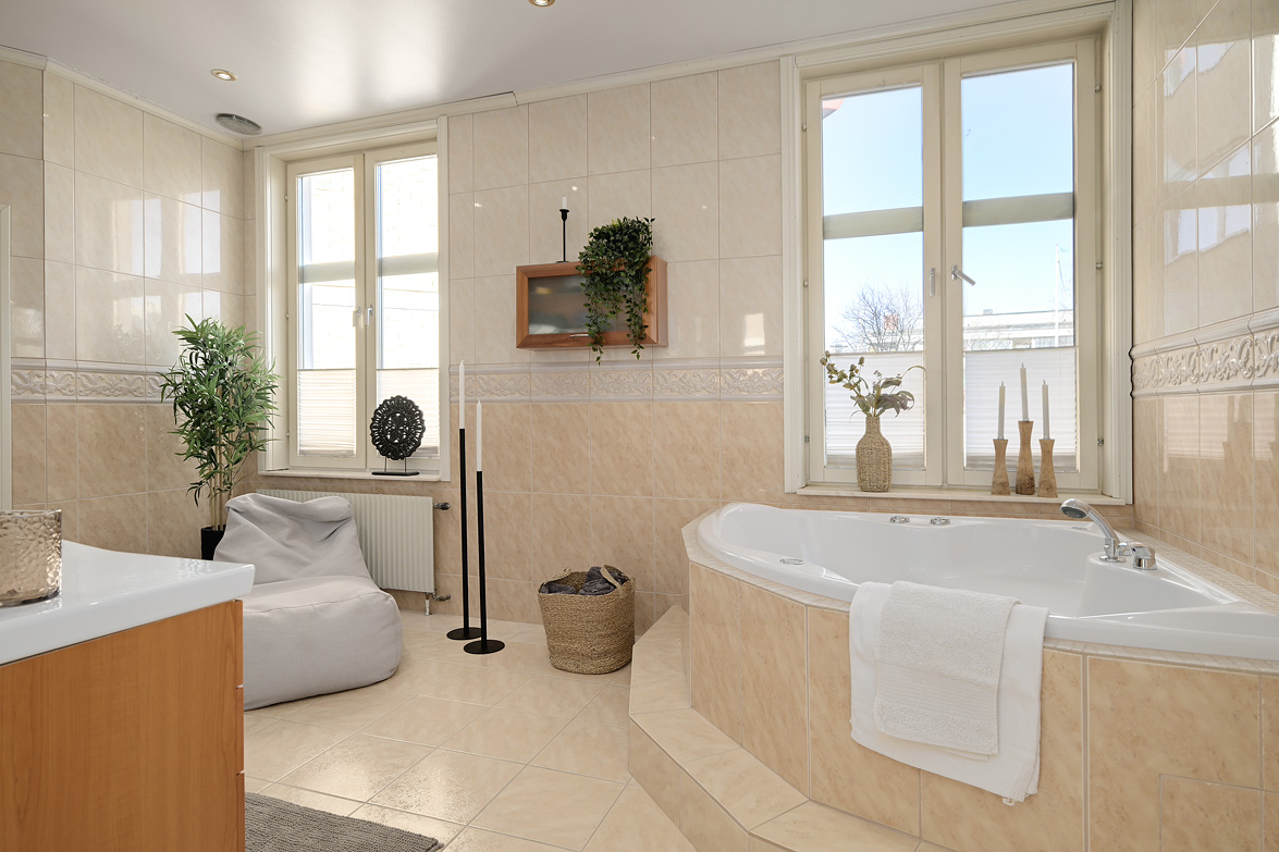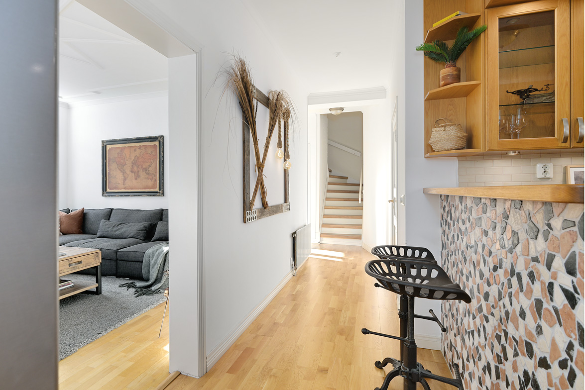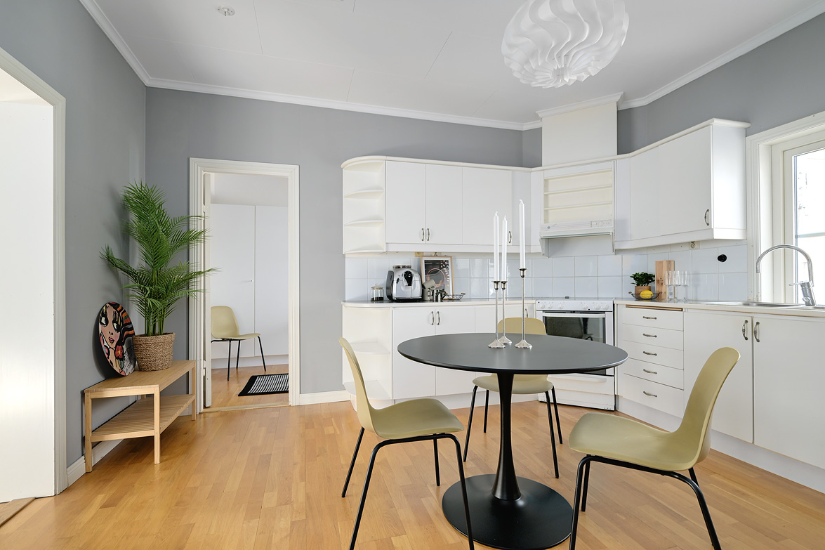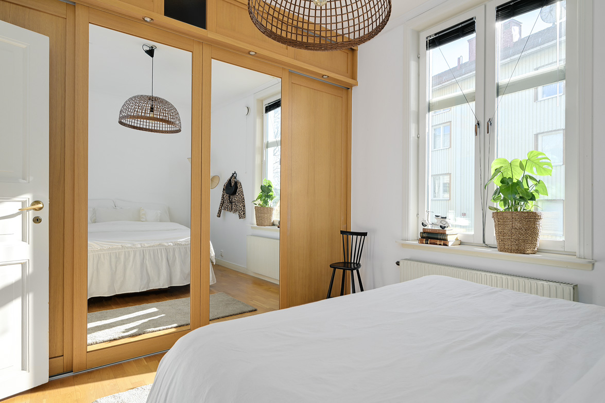 Bottenplans lägenheten om ca 140 kvm och övre plan om ca 90 kvm. Lägenhet bottenplan Luftig och inbjudande hall, här finns gott om plats för ytterkläder i en platsbyggd skjutdörrsgarderob i massiv ek, byggd av lokal snickare och utrustad med både spegel och infälld belysning. De vackra golvytorna pryds av klassisk ekparkett som löper vidare genom hemmets rum och skapar en enhetlig känsla, väggarna har en ljus ton. Rakt fram från hallen öppnar bostaden upp sig mot den representativa delen med matrum och vardagsrum. Här möts ni av tidstypiska skjutdörrar mellan rummen, vacker stuckatur och takmålningar utförda av den kände formgivaren och konstnären Otto Wretling. Den stilsäkra öppna spisen ger både värme och karaktär (behöver ses över innan eldning) och blir en naturlig samlingspunkt under årets kallare månader. Väggarna har en ljus tapet som förstärker rummens rymd. Vidare in i vardagsrummet väntar samma generösa takhöjd och stora fönsterpartier som skapar ett fantastiskt ljusflöde. De rymliga ytorna ger stor flexibilitet att möblera med såväl soffgrupp som övrigt möblemang. Även här återfinns vacker stuckatur i taket, genomgående ljusa väggar och parkettgolv som knyter samman hemmet på ett smakfullt sätt. Direkt till vänster från hallen finner ni ett helkaklat tvättrum med tvättmaskin, i stilrena blå och vita toner – fullt utrustat för att möta familjens behov av smidig klädvård. Från hallen nås även ett av hemmets badrum. Smakfullt inrett med kakel och klinker i gråblå nyanser samt behaglig golvvärme. Här finns kommod med handfat och spegelskåp, wc samt ett härligt badkar. Fönster bidrar med både dagsljus och möjlighet till vädring – en praktisk och trivsam lösning i vardagen. Köket är en dröm för den matglade. Ett generöst Tibrokök med luckor i massiv ek, vackra vitrinskåp och infälld belysning skapar en exklusiv känsla. De påkostade bänkskivorna i italiensk marmor harmonierar med ljust beige kakel. Maskinparken i rostfritt består av side-by-side kyl och frys, diskmaskin, inbyggd ugn och mikro samt fläktkåpa. En trevlig vinkellösning med ekskiva och skifferliknande ytskikt ramar in den infällda diskhon. Intill finns en mysig matplats med karaktärsfull bambutapet – perfekt för såväl vardagsmiddagar som långa frukostar. Det större badrummet är ett riktigt hemmaspa. Helkaklat och generöst tilltaget med spotlights och stämningsfull stjärnhimmel i taket. Två stora fönster ger rikligt med ljus över väggar och golv i varma vit/beige toner. Här finns duschhörna med välvda mosaikväggar, rymlig kommod i körsbärsträ med tillhörande spegelskåp, wc, en rymlig bastu samt ett inbjudande bubbelbadkar (ej använt funktionerna på länge). Sovrummet på entréplan erbjuder gott om plats för en större säng. Längs ena väggen löper skjutdörrsgarderober i massiv ek som rymmer en generös förvaring. Väggarna är ljusa och skapar en lugn atmosfär. En vacker ektrappa leder upp till ytterligare två sovrum samt wc. Båda rummen har ljusa väggar och fint ljusinsläpp från fönster. Det ena rummet är utrustat med skjutdörrsgarderob i massiv ek med infällda spotlights. Mellan rummen finns en inbyggd bokhylla som ger charm och karaktär, samt en mindre wc. Även här löper den vackra ekparketten vidare och binder samman våningsplanet på ett enhetligt och stilfullt sätt. Lägenhet övre plan Trapphuset leder oss upp till en unik och charmfull 3:a om ca 90 kvm. Redan vid entrén möts ni av en vacker ytterdörr och en praktisk hallmöbel där ytterkläder smidigt kan hängas av. Hallen är storslagen med sina unika och välbevarade takmålningar av Otto Wretling – en detalj som ger bostaden en alldeles särskild karaktär. Om elden sprakar i öppna spisen när du kliver in infinner sig genast en varm och inbjudande känsla. Väggen mot köket går inte hela vägen upp, vilket skapar ett härligt ljusflöde och en luftig atmosfär. Ljusgrå tapeter och vacker ekparkett, som löper vidare mot kök, vilket ger ett harmoniskt intryck. Till vänster från hall finns en rymlig klädkammare med gott om förvaring för både kläder och annat som behöver stuvas undan. Från hallen nås även det helkaklade badrummet i mjukt ljusrosa toner. Här finns handfat med spegel, wc och badkar. Det stora fönstret ger rummet ett fint dagsljus och en känsla av rymd. Rakt fram öppnar bostaden upp sig mot den representativa delen med luftigt matrum (idag musikrum) och vardagsrum. Tidstypiska skjutdörrar, vacker stuckatur, generös takhöjd och stora fönster skapar en elegant och trivsam miljö. Köket är klassiskt vitt med vita luckor och kakel samt flera öppna sidoskåp som ger både charm och praktisk förvaring. Den mörka bänkskivan bryter av stilfullt mot det ljusa och diskhon är elegant infälld. Fönstrets placering ger fint ljus över arbetsytorna. Side-by-side kyl och frys, spis med häll och ugn samt fläkt. Även här löper en färg på väggarna och binder samman bostadens stil. Sovrummet erbjuder gott om plats för säng och kompletterande möbler. Här finns praktisk förvaring i garderob samt ett generöst fönster som ger ett härligt ljusinsläpp och möjlighet till vädring. Rummet präglas av ljusa väggar och ett vackert ekparkettgolv som skapar en trivsam och ombonad känsla. Källare I källarplanet möts du av klinkergolv och ljusa väggar. Här finns en rymlig tvättstuga samt flera förråd, varav ett lämpar sig utmärkt som vinkällare. Helt enkelt en bostad med själ och vackra tidstypiska detaljer med centralt läge – perfekt för dig som söker något utöver det vanliga.