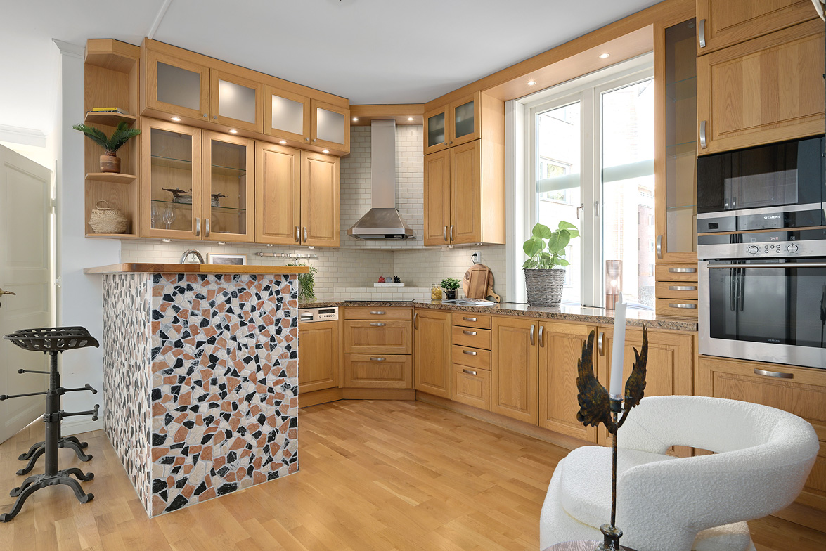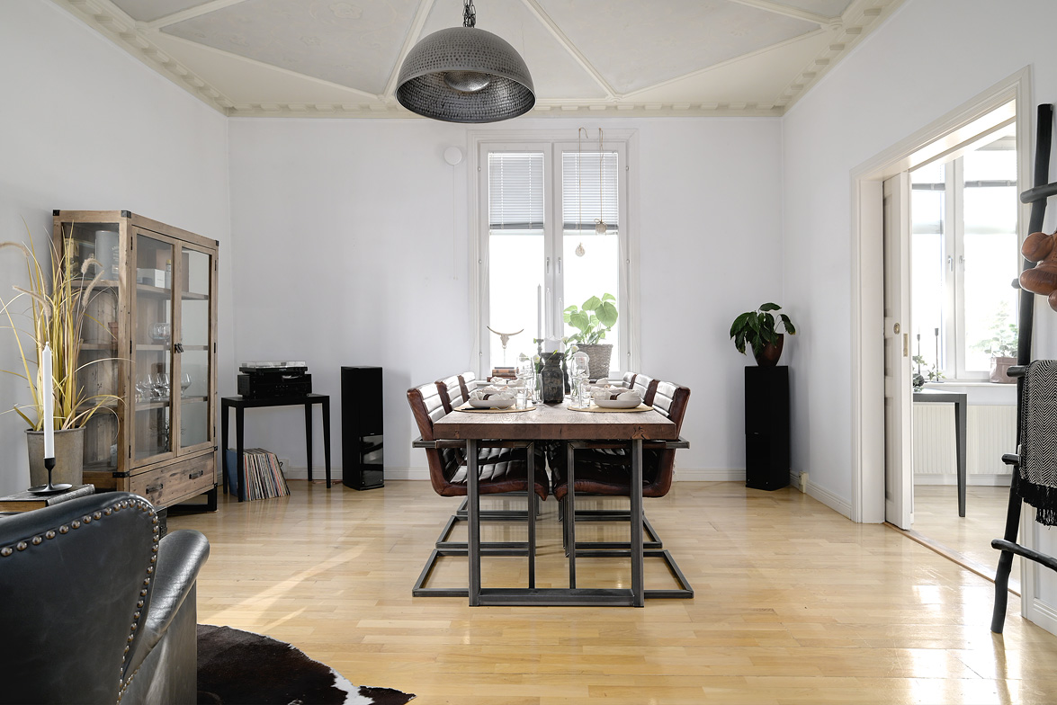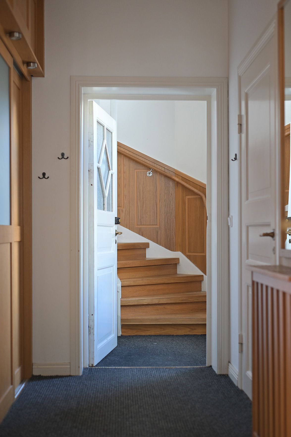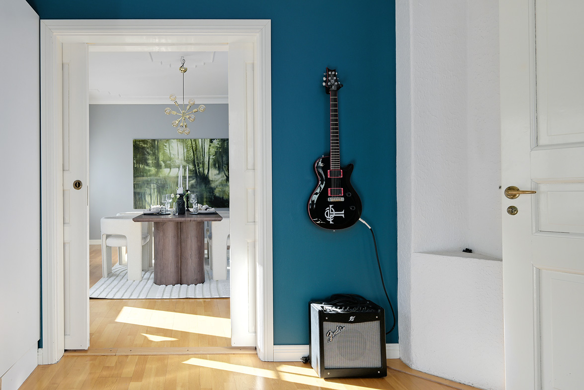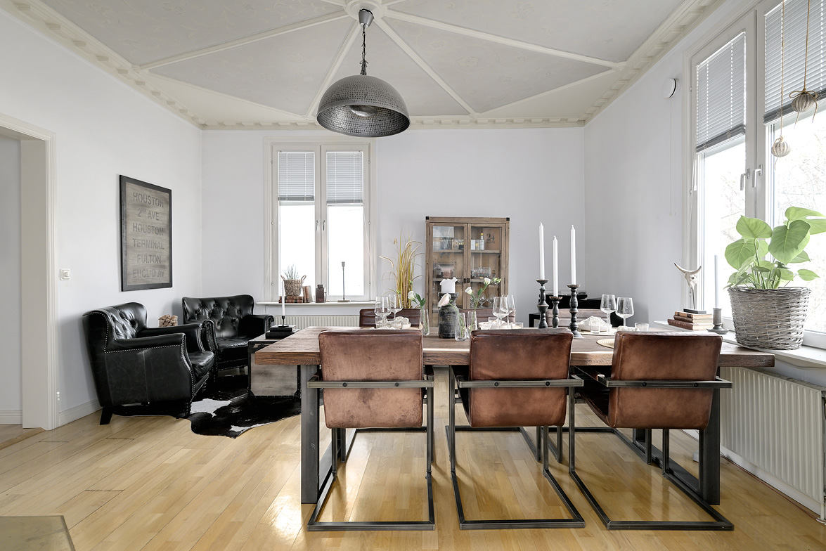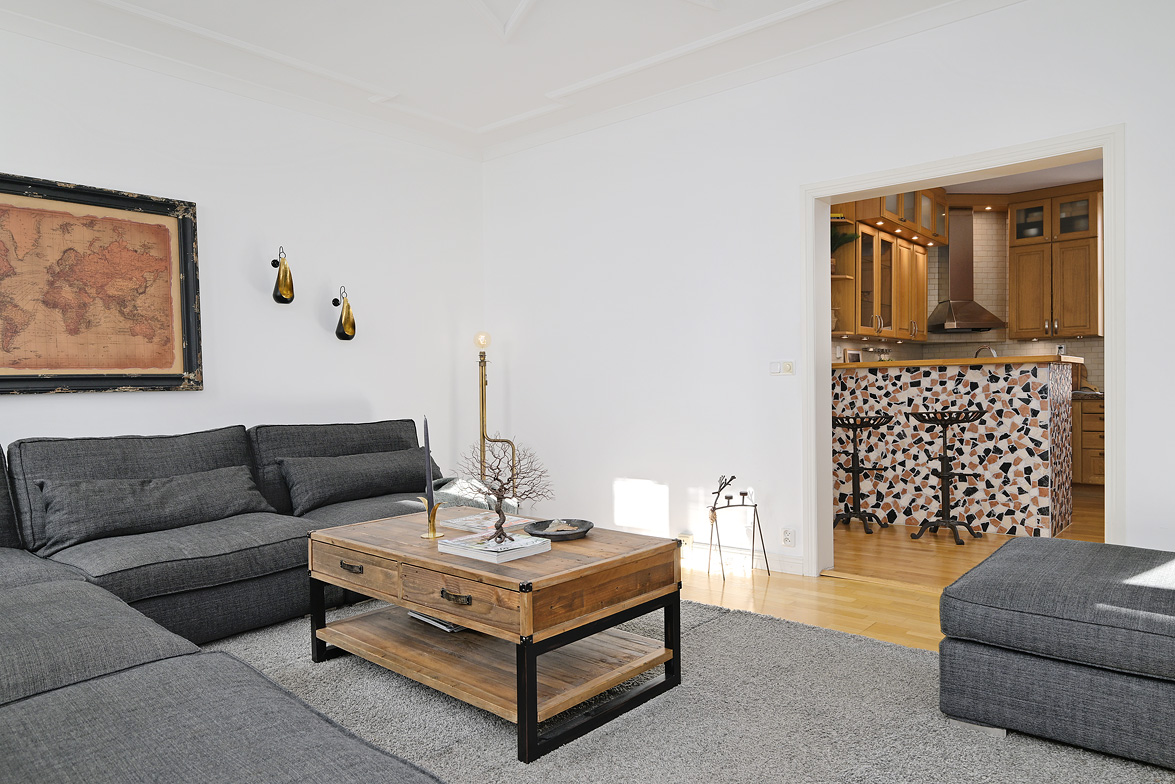 Bottenplans lägenheten om ca 140 kvm och övre plan om ca 90 kvm. Lägenhet bottenplan Luftig och inbjudande hall, här finns gott om plats för ytterkläder i en platsbyggd skjutdörrsgarderob i massiv ek, byggd av lokal snickare och utrustad med både spegel och infälld belysning. De vackra golvytorna pryds av klassisk ekparkett som löper vidare genom hemmets rum och skapar en enhetlig känsla, väggarna har en ljus ton. Rakt fram från hallen öppnar bostaden upp sig mot den representativa delen med matrum och vardagsrum. Här möts ni av tidstypiska skjutdörrar mellan rummen, vacker stuckatur och takmålningar utförda av den kände formgivaren och konstnären Otto Wretling. Den stilsäkra öppna spisen ger både värme och karaktär (behöver ses över innan eldning) och blir en naturlig samlingspunkt under årets kallare månader. Väggarna har en ljus tapet som förstärker rummens rymd. Vidare in i vardagsrummet väntar samma generösa takhöjd och stora fönsterpartier som skapar ett fantastiskt ljusflöde. De rymliga ytorna ger stor flexibilitet att möblera med såväl soffgrupp som övrigt möblemang. Även här återfinns vacker stuckatur i taket, genomgående ljusa väggar och parkettgolv som knyter samman hemmet på ett smakfullt sätt. Direkt till vänster från hallen finner ni ett helkaklat tvättrum med tvättmaskin, i stilrena blå och vita toner – fullt utrustat för att möta familjens behov av smidig klädvård. Från hallen nås även ett av hemmets badrum. Smakfullt inrett med kakel och klinker i gråblå nyanser samt behaglig golvvärme. Här finns kommod med handfat och spegelskåp, wc samt ett härligt badkar. Fönster bidrar med både dagsljus och möjlighet till vädring – en praktisk och trivsam lösning i vardagen. Köket är en dröm för den matglade. Ett generöst Tibrokök med luckor i massiv ek, vackra vitrinskåp och infälld belysning skapar en exklusiv känsla. De påkostade bänkskivorna i italiensk marmor harmonierar med ljust beige kakel. Maskinparken i rostfritt består av side-by-side kyl och frys, diskmaskin, inbyggd ugn och mikro samt fläktkåpa. En trevlig vinkellösning med ekskiva och skifferliknande ytskikt ramar in den infällda diskhon. Intill finns en mysig matplats med karaktärsfull bambutapet – perfekt för såväl vardagsmiddagar som långa frukostar. Det större badrummet är ett riktigt hemmaspa. Helkaklat och generöst tilltaget med spotlights och stämningsfull stjärnhimmel i taket. Två stora fönster ger rikligt med ljus över väggar och golv i varma vit/beige toner. Här finns duschhörna med välvda mosaikväggar, rymlig kommod i körsbärsträ med tillhörande spegelskåp, wc, en rymlig bastu samt ett inbjudande bubbelbadkar (ej använt funktionerna på länge). Sovrummet på entréplan erbjuder gott om plats för en större säng. Längs ena väggen löper skjutdörrsgarderober i massiv ek som rymmer en generös förvaring. Väggarna är ljusa och skapar en lugn atmosfär. En vacker ektrappa leder upp till ytterligare två sovrum samt wc. Båda rummen har ljusa väggar och fint ljusinsläpp från fönster. Det ena rummet är utrustat med skjutdörrsgarderob i massiv ek med infällda spotlights. Mellan rummen finns en inbyggd bokhylla som ger charm och karaktär, samt en mindre wc. Även här löper den vackra ekparketten vidare och binder samman våningsplanet på ett enhetligt och stilfullt sätt. Lägenhet övre plan Trapphuset leder oss upp till en unik och charmfull 3:a om ca 90 kvm. Redan vid entrén möts ni av en vacker ytterdörr och en praktisk hallmöbel där ytterkläder smidigt kan hängas av. Hallen är storslagen med sina unika och välbevarade takmålningar av Otto Wretling – en detalj som ger bostaden en alldeles särskild karaktär. Om elden sprakar i öppna spisen när du kliver in infinner sig genast en varm och inbjudande känsla. Väggen mot köket går inte hela vägen upp, vilket skapar ett härligt ljusflöde och en luftig atmosfär. Ljusgrå tapeter och vacker ekparkett, som löper vidare mot kök, vilket ger ett harmoniskt intryck. Till vänster från hall finns en rymlig klädkammare med gott om förvaring för både kläder och annat som behöver stuvas undan. Från hallen nås även det helkaklade badrummet i mjukt ljusrosa toner. Här finns handfat med spegel, wc och badkar. Det stora fönstret ger rummet ett fint dagsljus och en känsla av rymd. Rakt fram öppnar bostaden upp sig mot den representativa delen med luftigt matrum (idag musikrum) och vardagsrum. Tidstypiska skjutdörrar, vacker stuckatur, generös takhöjd och stora fönster skapar en elegant och trivsam miljö. Köket är klassiskt vitt med vita luckor och kakel samt flera öppna sidoskåp som ger både charm och praktisk förvaring. Den mörka bänkskivan bryter av stilfullt mot det ljusa och diskhon är elegant infälld. Fönstrets placering ger fint ljus över arbetsytorna. Side-by-side kyl och frys, spis med häll och ugn samt fläkt. Även här löper en färg på väggarna och binder samman bostadens stil. Sovrummet erbjuder gott om plats för säng och kompletterande möbler. Här finns praktisk förvaring i garderob samt ett generöst fönster som ger ett härligt ljusinsläpp och möjlighet till vädring. Rummet präglas av ljusa väggar och ett vackert ekparkettgolv som skapar en trivsam och ombonad känsla. Källare I källarplanet möts du av klinkergolv och ljusa väggar. Här finns en rymlig tvättstuga samt flera förråd, varav ett lämpar sig utmärkt som vinkällare. Helt enkelt en bostad med själ och vackra tidstypiska detaljer med centralt läge – perfekt för dig som söker något utöver det vanliga.