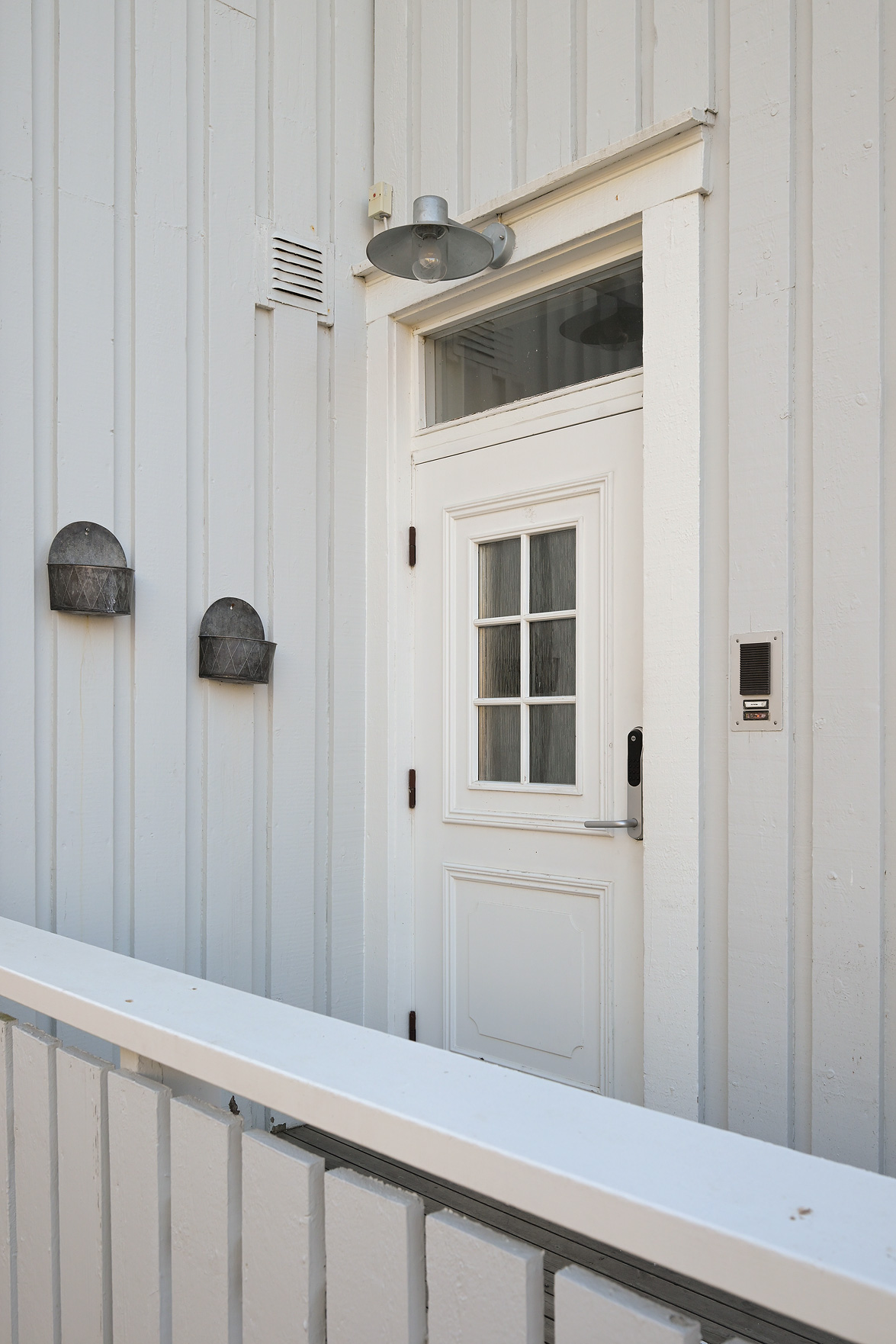 Solig altan med räcke som nås utifrån.
