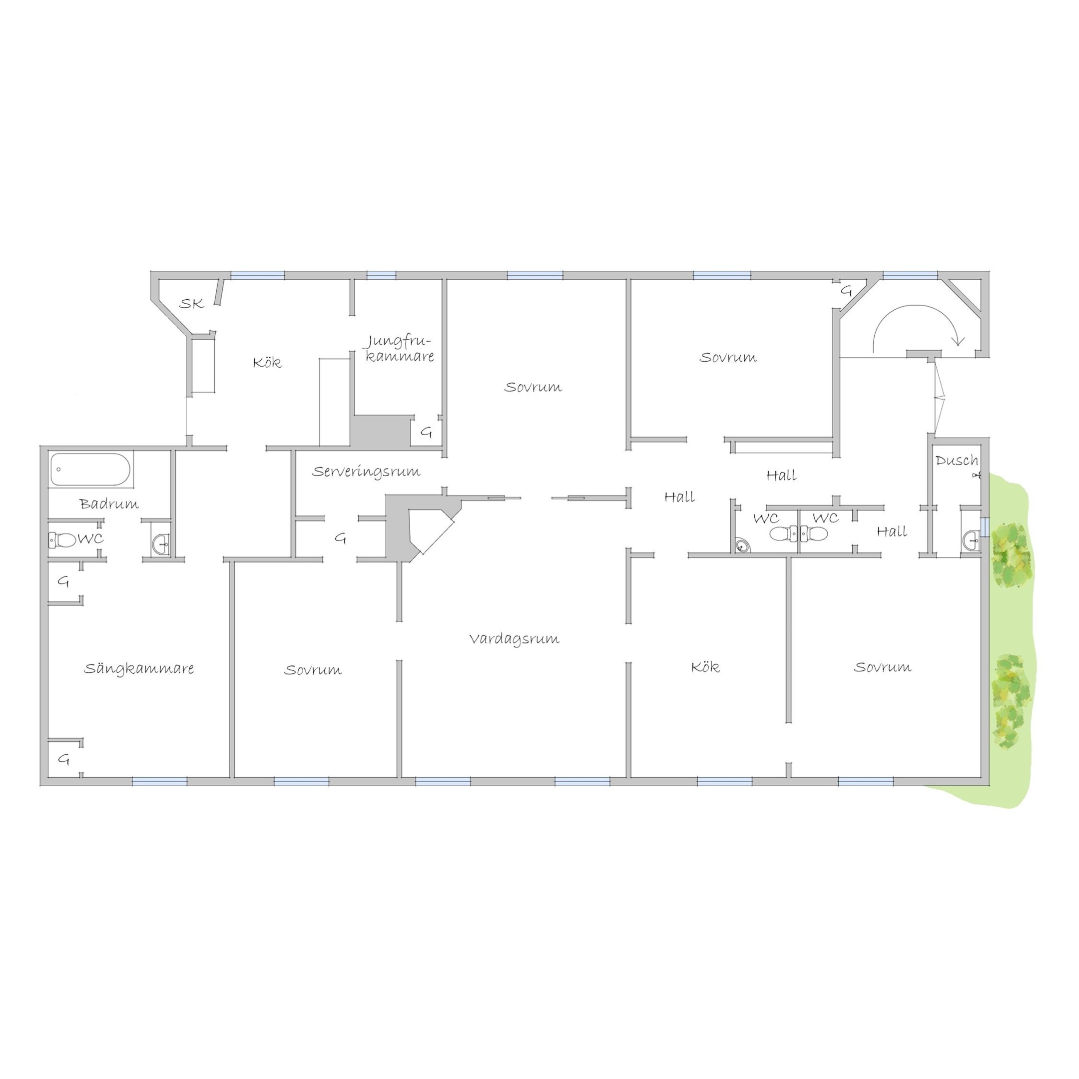 Detalj vindsvåning huskropp 2 med aktuell planlösning och inritat badrum