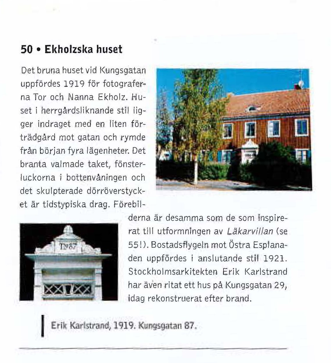 Nu säljer vi ett av Umeås verkliga landmärken - det vackra Ekholzska huset på Kungsatan 87! Byggnaden som uppfördes i herrgårdsliknande stil 1919 av de kända umeåfotograferna Tor och Nanna Ekholz, och 1921 kompletterades byggnaden med en bostadsflygel i anslutande stil mot Östra Esplanaden. Arkitekten var Umeås dåvarande stadsarkitekt Erik Karlstrand som även ritat det vackra huset på Kungsgatan 29, han var senare huvudsakligen verksam i Stockholm. Huset har idag totalt 12 lägenheter, här finns även 6 garage och 11 parkeringar. Kontakta mäklaren för mer information.