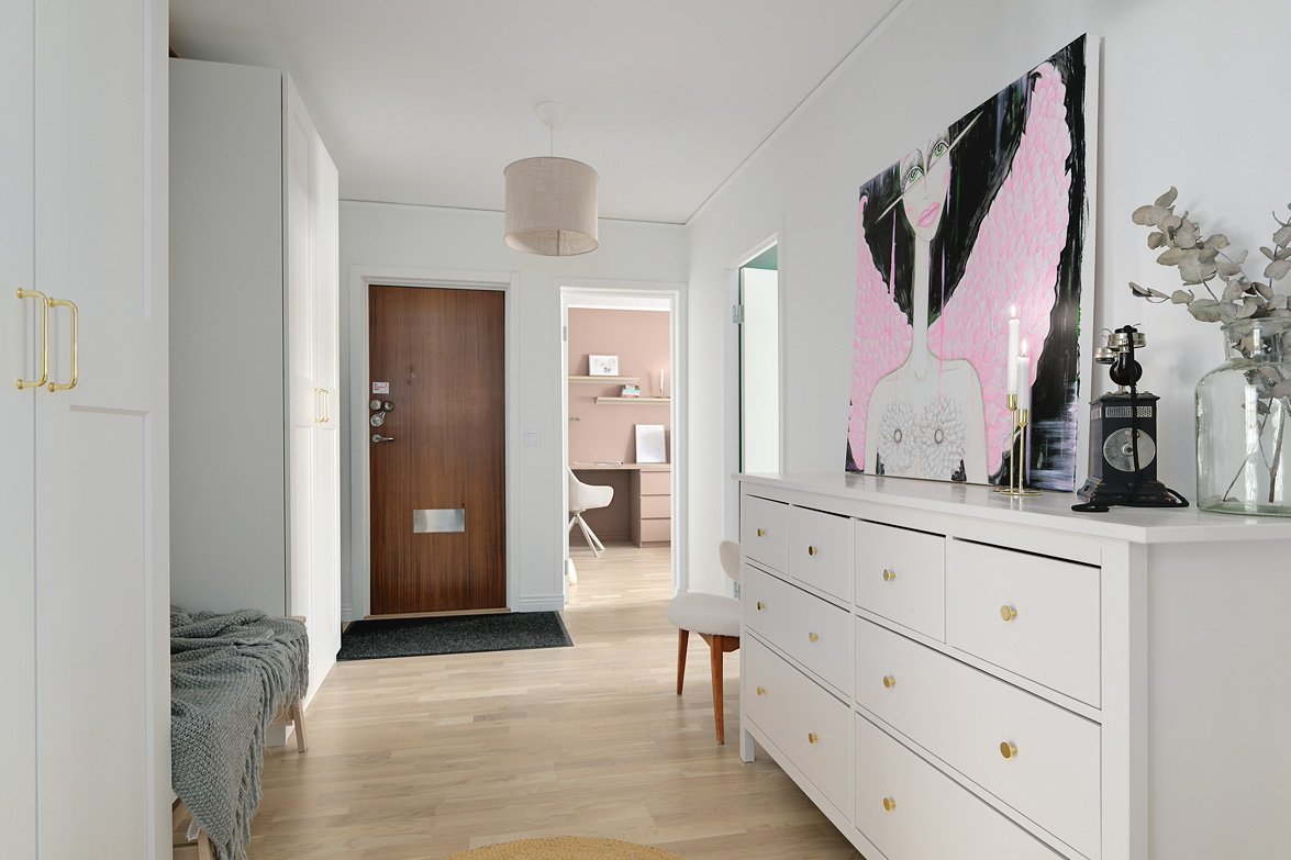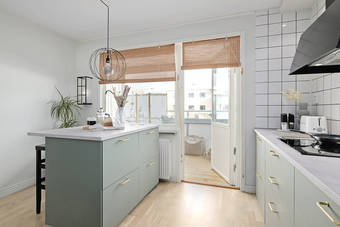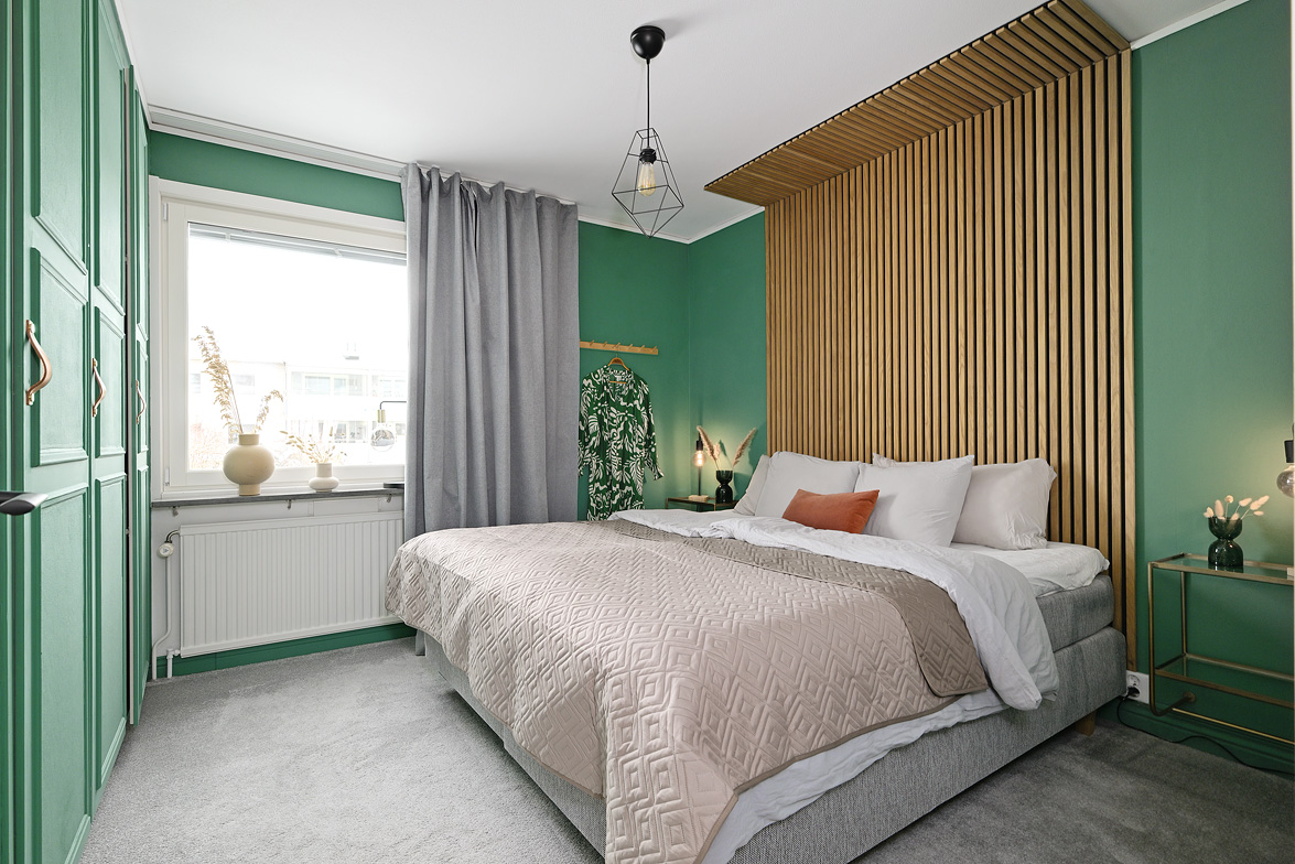 Hall Välkomnande och ljus entré med vitmålade väggar och genomgående ljus parkett som leder vidare genom bostaden och skapar en fin helhet. Här finns goda förvaringsmöjligheter i stilrena garderober med mässingshandtag som ger en elegant detalj. Mellan garderoberna finns plats för bänk eller annan möbel. Hallens neutrala bas låter bostadens övriga färgsättning ta vid på ett harmoniskt sätt. Kök Ett smakfullt totalrenoverat kök där färgvalet verkligen sätter tonen. Luckorna går i en dämpad salviagrön kulör som tillsammans med mässingshandtag skapar en mjuk och exklusiv känsla. Ovan arbetsytorna sitter vitt kakel i klassiskt rutmönster som ger ett tidlöst uttryck och förstärker ljuset i rummet. Kökets maskinpark består av integrerad diskmaskin, spishäll, fläkt, kyl/frys samt ugn och micro i modern och bekväm arbetshöjd. Bänkskivan i ljus ton ger en fin kontrast mot de gröna luckorna och den svarta köksfläkten adderar modern karaktär. Den fina köksön med förvaring fungerar både som arbetsyta och en perfekt frukostplats. Köksön är inte skruvad i golvet och går därför att ta bort om man hellre önskar ett matbord här. Stora fönster samt utgång till inglasningen skapar ett fint ljusflöde! Vardagsrum Ett generöst och ljust rum med stora fönsterpartier och vitmålade väggar som skapar en perfekt bas för inredning. Här ryms både soffgrupp och matplats. Bakom nuvarande TV-bänk finns en smakfull akustikpanel. Här ligger samma fina ekparkett som övrig bostadsyta. Sovrum 1 Ett mer uttrycksfullt sovrum med gröna väggar som ger en djup och ombonad känsla. Den ribbade träpanelen bakom sängen skapar en fin varm kontrast. De rymliga och platsbyggda garderoberna i matchande grön kulör smälter in stilrent samtidigt som som erbjuder stora förvaringsmöjligheter. Båda sovrummen har fönster mot föreningens innergård. Sovrum 2 Det större sovrummet är målat i en varm, dämpad terracotta-ton som skapar en mjuk känsla. Färgen ger rummet karaktär samtidigt som den upplevs harmonisk och omfamnande. Här finns gott om plats för dubbelsäng, sängbord och förvaring. Badrum Helrenoverat och stilrent badrum i smakfulla grå toner på både väggar och golv. Den enhetliga färgsättningen ger ett lugnt och modernt uttryck. Svarta detaljer i takdusch, duschvägg och handdukstork skapar en fin kontrast. Kommoden går i grått med mörk bänkskiva och ovanpå sitter ett stilrent runt handfat. Här finns även tvättmaskin med praktisk arbetsbänk ovanför till klädvård. Inglasad balkong En verklig förlängning av bostaden. Golvet i trä ger en varm och naturlig känsla medan den generösa inglasningen skapar ljus och skydd. Placeringen mot föreningens innergård ger en lugn och trivsam vy.