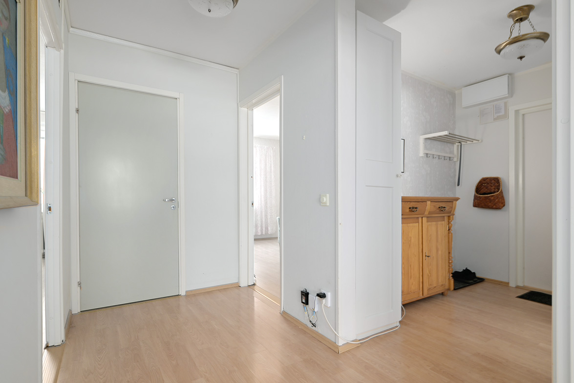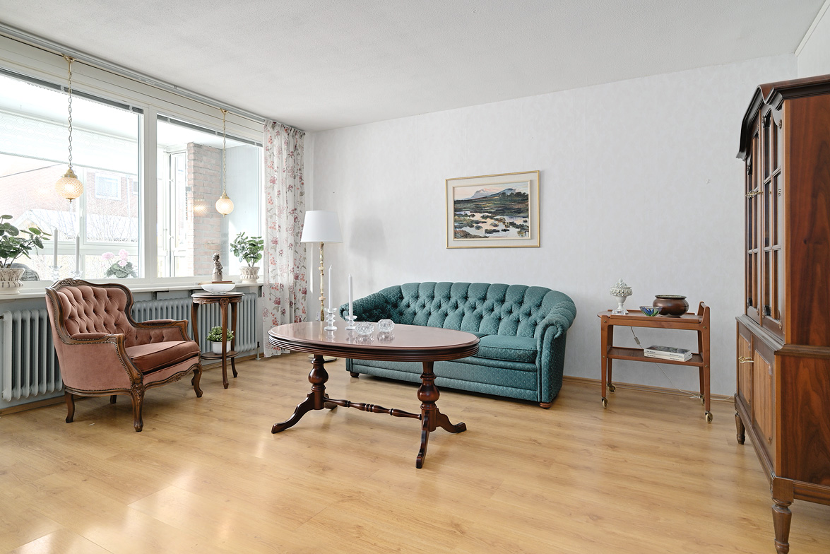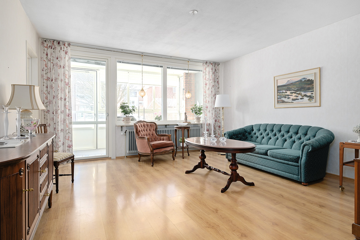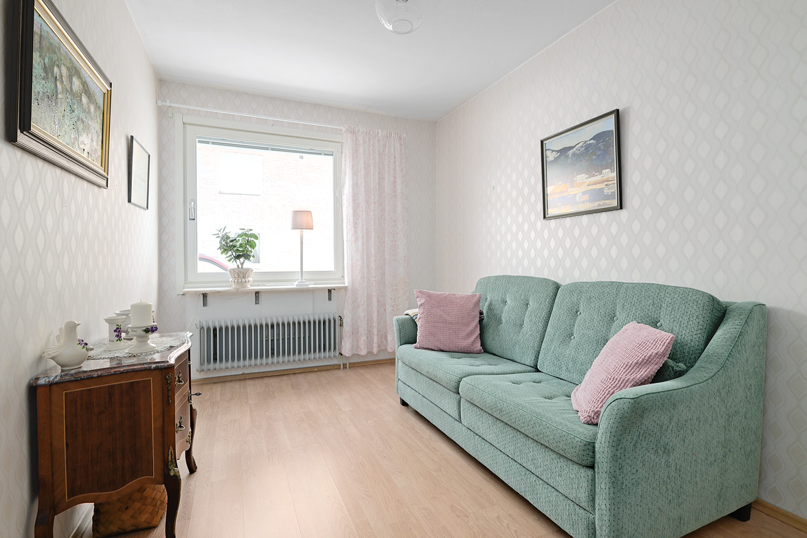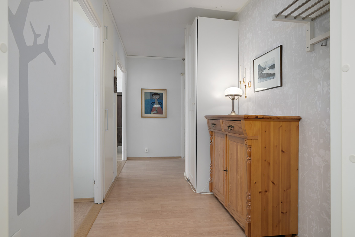 Hall Rymlig och möblerbar hall med bra plats för ytterkläder både öppet och dolt i garderob. Ljus tapet på vägg till laminatgolv. Kök Välutrustat kök med generös rostfri diskbänk, gråmelerad bänkskiva där ett passande kakel löper ovanför. Matplatsen är trevligt placerad vid fönster med öppen känsla mot vardagsrummet. Här finns allt man kan önska som hel kyl och frys, spis med häll och ugn, fläkt samt bra förvaring i skåp och lådor där ett vitrinskåp ger en öppen och stilfull känsla. Köket är verkligen ljust och rymligt med mycket bra förvaring. Tapeterna på vägg är ljusa med ett lätt mönster till laminatgolv. Vardagsrum Rymligt vardagsrum med plats för både soff- och matgrupp om så önskas. Fina ljusinsläpp via flertalet fönster mot gården. Härifrån nås den inglasade balkongen där man njuter under lediga stunder. Ljus lätt mönstrad tapet på vägg till parkettgolv Inglasad balkong Dörr direkt till gården gör att man enkelt kan känna gräset mellan tårna under hela dagen, ta ut en solstol och njuta i det fria - ute och inne vävs samman. Detta har verkligen uppskattats av säljarna under alla år de bott i bostaden. Sovrum 1 och 2 Två rymliga sovrum som ger plats för säng och den inredning familjen har behov av. Ett av sovrummen har en klädkammare som nås direkt från rummet. Ljusa tapet på vägg till laminatgolv. Badrum Här erbjuds handfat med spegelskåp, wc, dusch och badkar. Möjlighet finns att installera tvättmaskin i badrummet om man det önskar. I kvarterslokalen finns tvättstuga med effektiva maskiner och torktumlare/torkskåp vilket är lyxigt om man har en stortvätt som man snabbt vill tvätta undan. Matta på golv och vägg. Förråd Vid entrédörren till lägenheten finns stort förråd vilket underlättar då man behöver stoppa undan eller hämta något man behöver. Mycket smidigt! Se bild på förrådet i planritningen. Lägenheten är genomgående ljus och luftig, den fina planlösningen med bra förvaring uppskattas i vardagen... Missa inte denna rymliga lägenhet – Välkommen på visning!