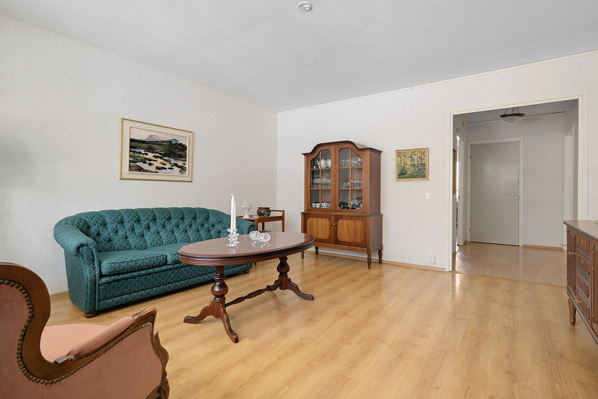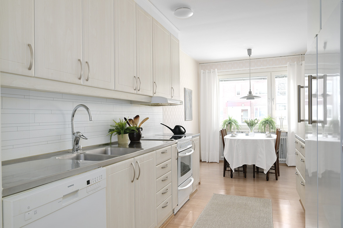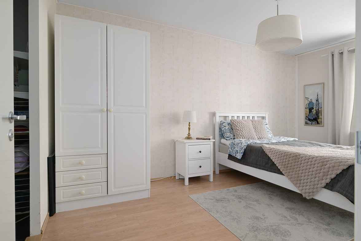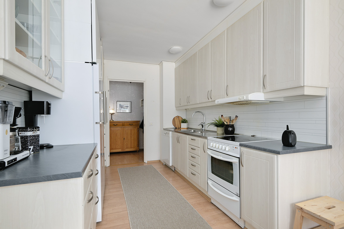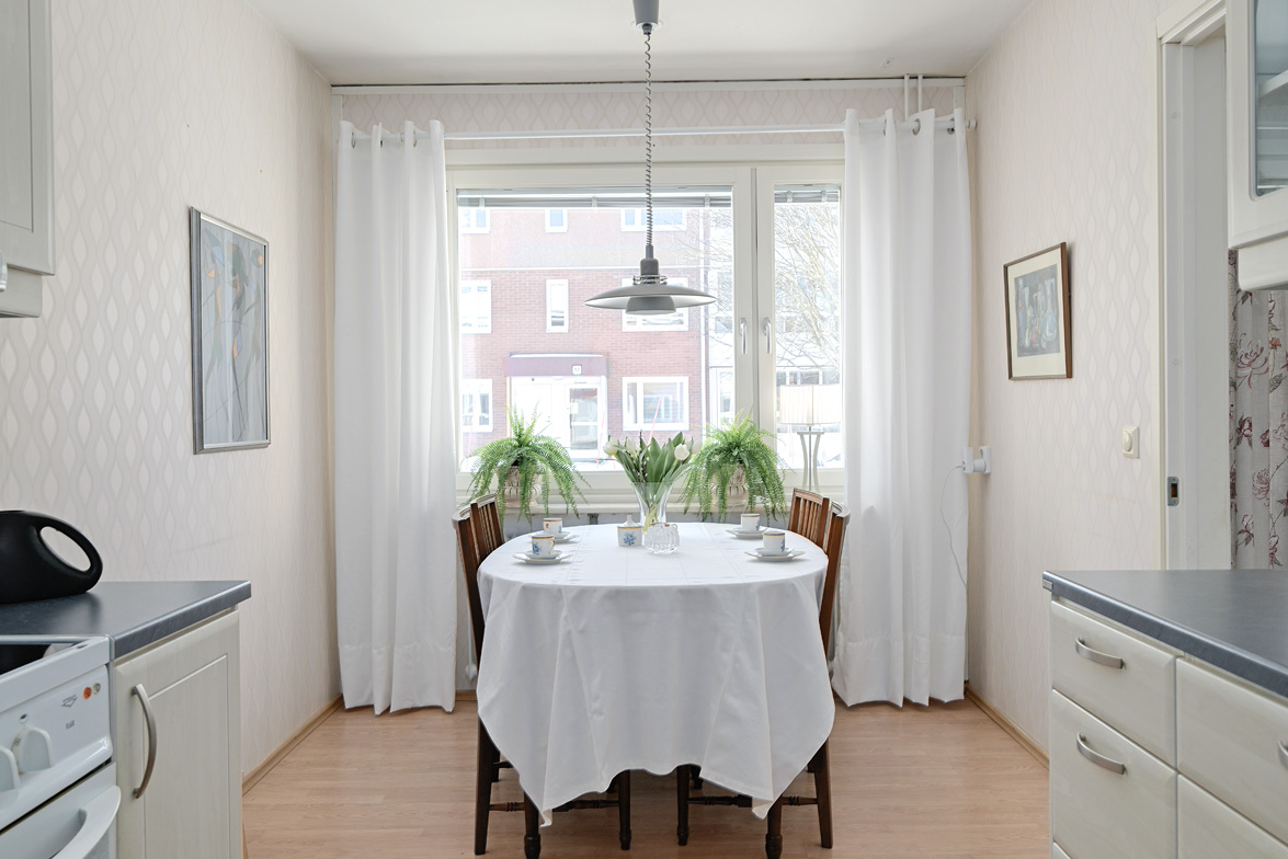 Hall Rymlig och möblerbar hall med bra plats för ytterkläder både öppet och dolt i garderob. Ljus tapet på vägg till laminatgolv. Kök Välutrustat kök med generös rostfri diskbänk, gråmelerad bänkskiva där ett passande kakel löper ovanför. Matplatsen är trevligt placerad vid fönster med öppen känsla mot vardagsrummet. Här finns allt man kan önska som hel kyl och frys, spis med häll och ugn, fläkt samt bra förvaring i skåp och lådor där ett vitrinskåp ger en öppen och stilfull känsla. Köket är verkligen ljust och rymligt med mycket bra förvaring. Tapeterna på vägg är ljusa med ett lätt mönster till laminatgolv. Vardagsrum Rymligt vardagsrum med plats för både soff- och matgrupp om så önskas. Fina ljusinsläpp via flertalet fönster mot gården. Härifrån nås den inglasade balkongen där man njuter under lediga stunder. Ljus lätt mönstrad tapet på vägg till parkettgolv Inglasad balkong Dörr direkt till gården gör att man enkelt kan känna gräset mellan tårna under hela dagen, ta ut en solstol och njuta i det fria - ute och inne vävs samman. Detta har verkligen uppskattats av säljarna under alla år de bott i bostaden. Sovrum 1 och 2 Två rymliga sovrum som ger plats för säng och den inredning familjen har behov av. Ett av sovrummen har en klädkammare som nås direkt från rummet. Ljusa tapet på vägg till laminatgolv. Badrum Här erbjuds handfat med spegelskåp, wc, dusch och badkar. Möjlighet finns att installera tvättmaskin i badrummet om man det önskar. I kvarterslokalen finns tvättstuga med effektiva maskiner och torktumlare/torkskåp vilket är lyxigt om man har en stortvätt som man snabbt vill tvätta undan. Matta på golv och vägg. Förråd Vid entrédörren till lägenheten finns stort förråd vilket underlättar då man behöver stoppa undan eller hämta något man behöver. Mycket smidigt! Se bild på förrådet i planritningen. Lägenheten är genomgående ljus och luftig, den fina planlösningen med bra förvaring uppskattas i vardagen... Missa inte denna rymliga lägenhet – Välkommen på visning!
