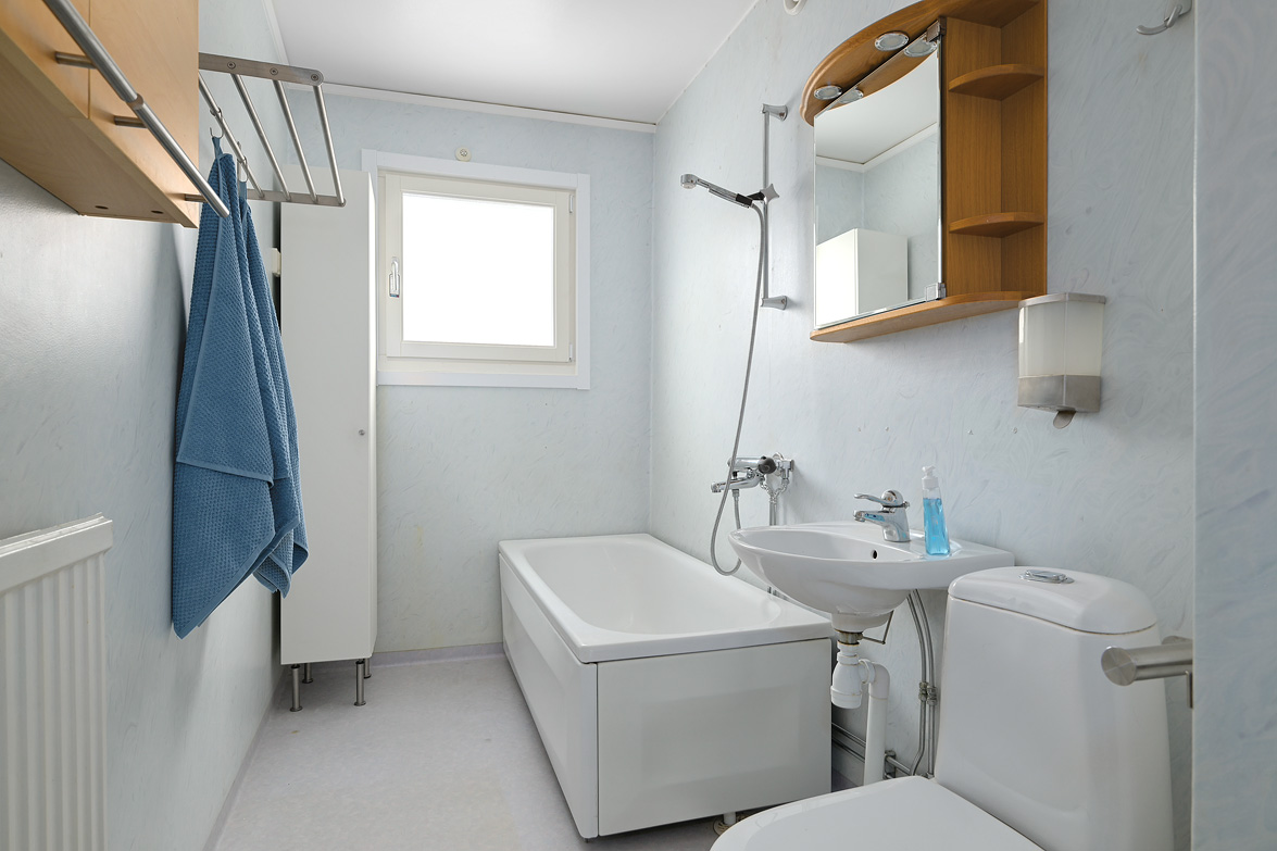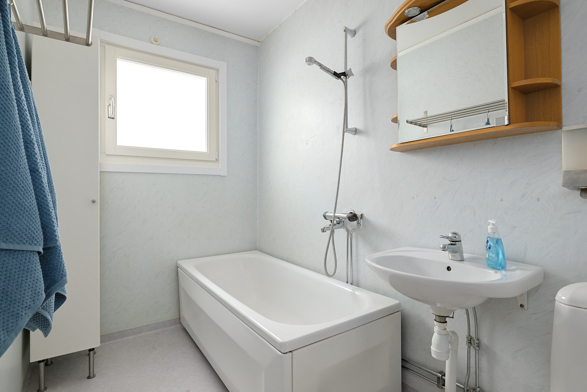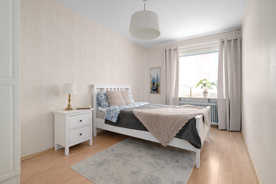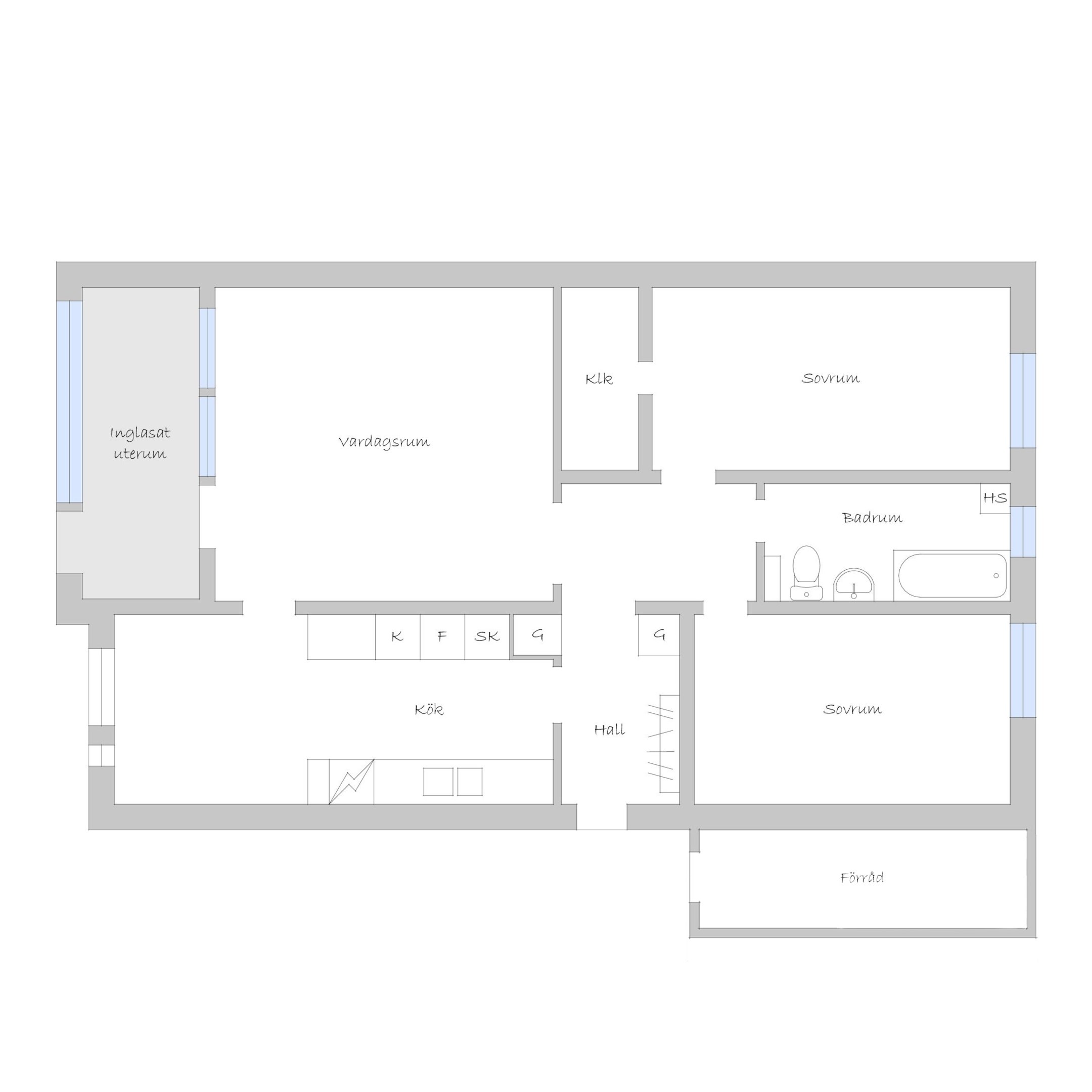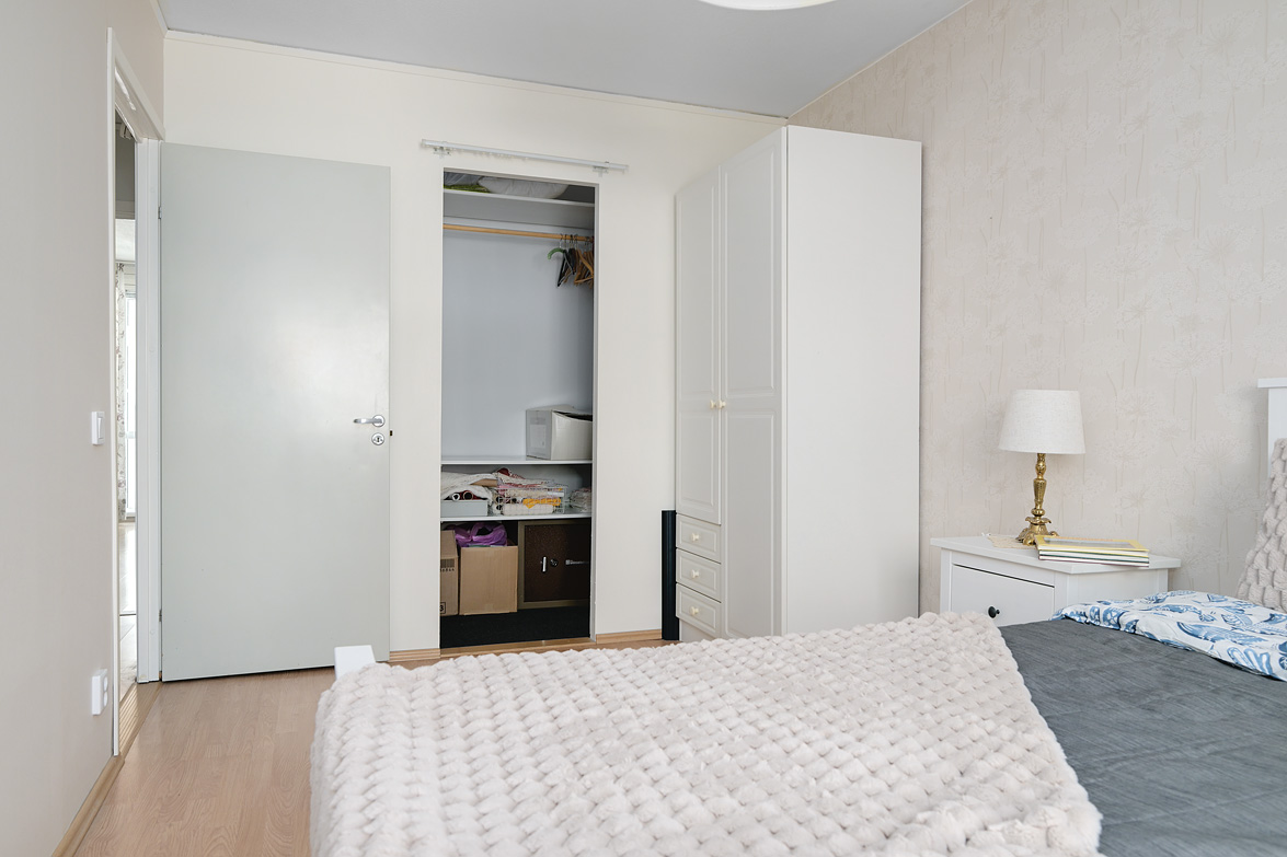 Hall Rymlig och möblerbar hall med bra plats för ytterkläder både öppet och dolt i garderob. Ljus tapet på vägg till laminatgolv. Kök Välutrustat kök med generös rostfri diskbänk, gråmelerad bänkskiva där ett passande kakel löper ovanför. Matplatsen är trevligt placerad vid fönster med öppen känsla mot vardagsrummet. Här finns allt man kan önska som hel kyl och frys, spis med häll och ugn, fläkt samt bra förvaring i skåp och lådor där ett vitrinskåp ger en öppen och stilfull känsla. Köket är verkligen ljust och rymligt med mycket bra förvaring. Tapeterna på vägg är ljusa med ett lätt mönster till laminatgolv. Vardagsrum Rymligt vardagsrum med plats för både soff- och matgrupp om så önskas. Fina ljusinsläpp via flertalet fönster mot gården. Härifrån nås den inglasade balkongen där man njuter under lediga stunder. Ljus lätt mönstrad tapet på vägg till parkettgolv Inglasad balkong Dörr direkt till gården gör att man enkelt kan känna gräset mellan tårna under hela dagen, ta ut en solstol och njuta i det fria - ute och inne vävs samman. Detta har verkligen uppskattats av säljarna under alla år de bott i bostaden. Sovrum 1 och 2 Två rymliga sovrum som ger plats för säng och den inredning familjen har behov av. Ett av sovrummen har en klädkammare som nås direkt från rummet. Ljusa tapet på vägg till laminatgolv. Badrum Här erbjuds handfat med spegelskåp, wc, dusch och badkar. Möjlighet finns att installera tvättmaskin i badrummet om man det önskar. I kvarterslokalen finns tvättstuga med effektiva maskiner och torktumlare/torkskåp vilket är lyxigt om man har en stortvätt som man snabbt vill tvätta undan. Matta på golv och vägg. Förråd Vid entrédörren till lägenheten finns stort förråd vilket underlättar då man behöver stoppa undan eller hämta något man behöver. Mycket smidigt! Se bild på förrådet i planritningen. Lägenheten är genomgående ljus och luftig, den fina planlösningen med bra förvaring uppskattas i vardagen... Missa inte denna rymliga lägenhet – Välkommen på visning!