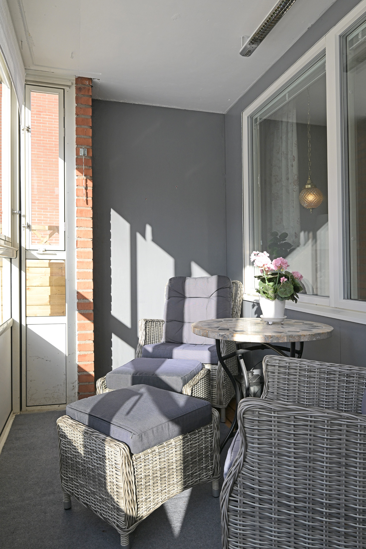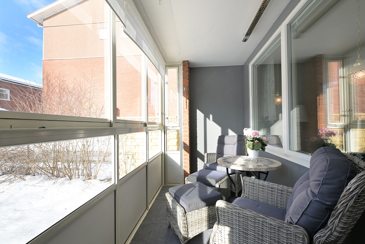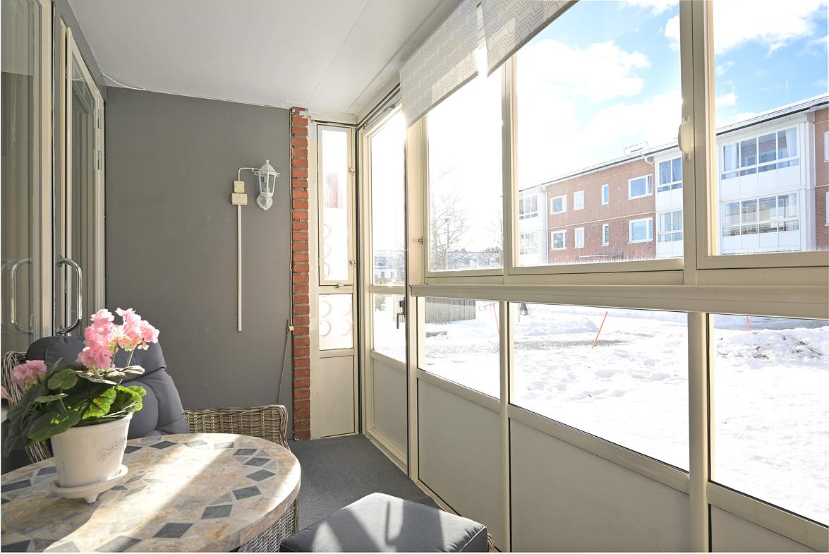 Inglasad balkong med bakongdörr som leder fritt ut mot den gröna gräsmattan vilket uppskattas mycket och gör bostaden extra trevlig.