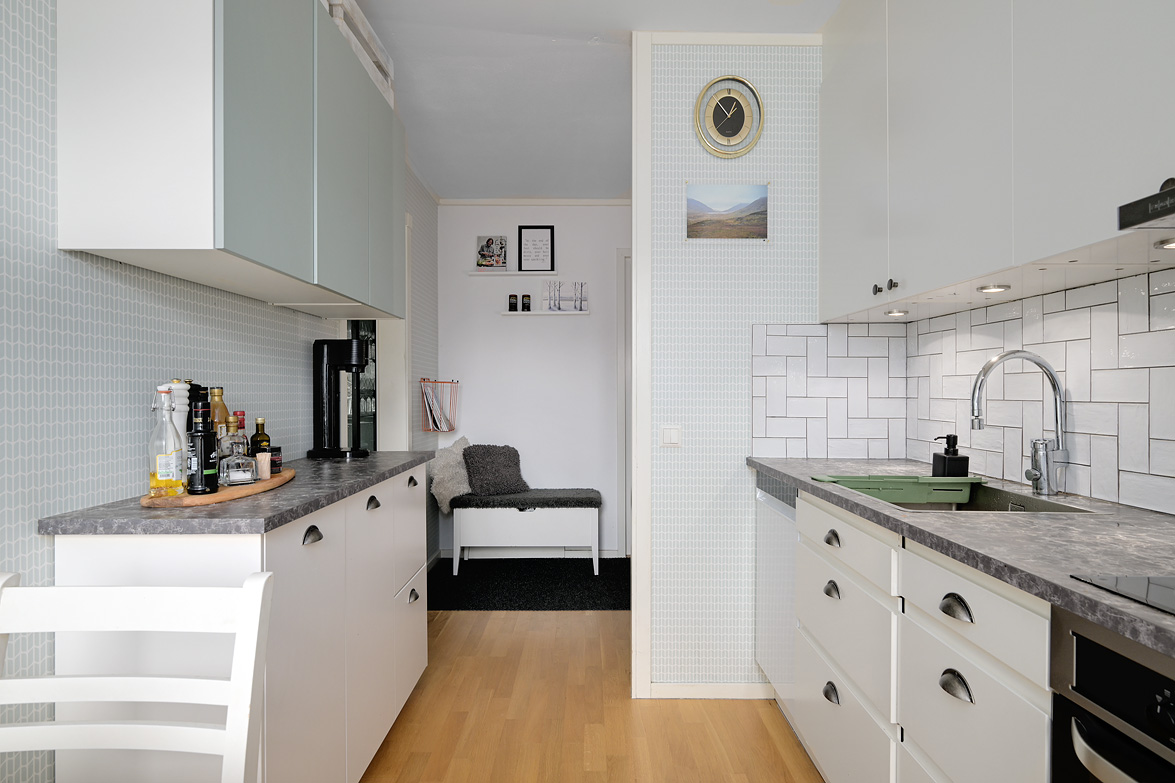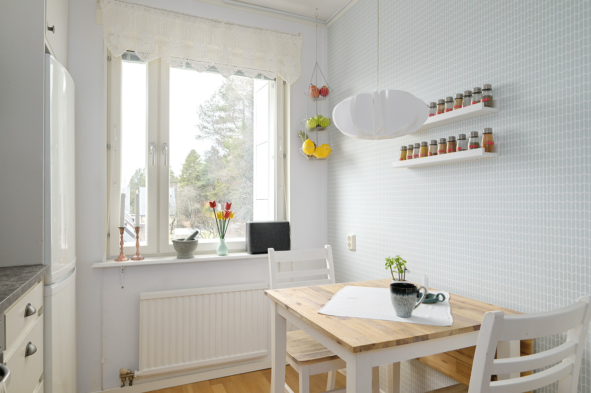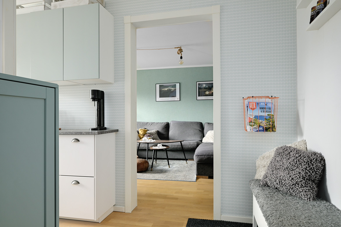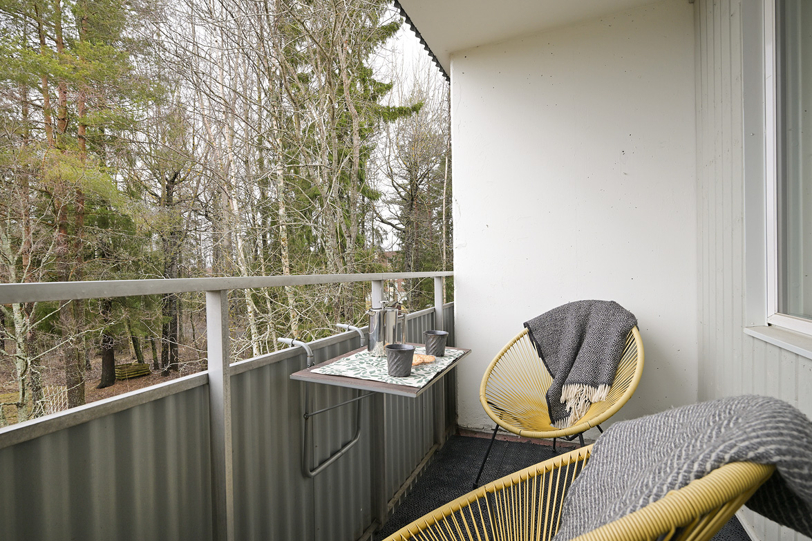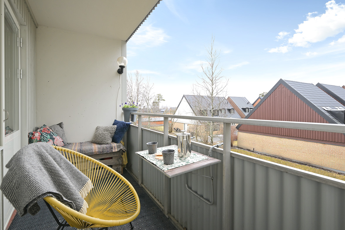 Hall Välkomnande hall med plats för avhängning av ytterkläder samt förvaring i garderober. I anslutning finns även en klädkammare som ger extra förvaringsutrymme. Kök Praktiskt kök med goda arbetsytor och förvaringsmöjligheter. Köksinredningen består av ljusa skåpluckor i kombination med gråmelerad bänkskiva som ger ett mjukt och enhetligt uttryck. Ovan arbetsbänken sitter ett ljust kakel som stänkskydd. Köket erbjuder gott om förvaring i både över- och underskåp samt bra med lådförvaring. Arbetsbänken erbjuder generösa ytor för matlagning. Maskinparken består av spis med ugn, fläkt, kyl/frys samt diskmaskin. Vid fönstret finns plats för matbord. Vardagsrum Rymligt och lättmöblerat vardagsrum med plats för soffgrupp, tv-möbel och eventuell matplats. Härifrån nås bostadens balkong. Balkong Balkong med plats för utemöbler och möjlighet att skapa en trivsam uteplats med utsikt över närområdet. Sovrum Sovrum i bra storlek med plats för dubbelsäng och förvaring. Lugn placering i bostaden. Badrum Badrum utrustat med wc, handfat med kommod, spegelskåp samt badkar med dusch. Fönster ger naturligt ljusinsläpp.