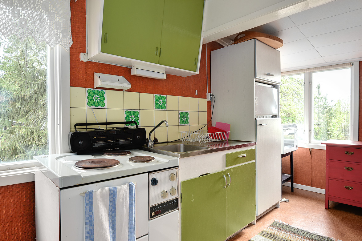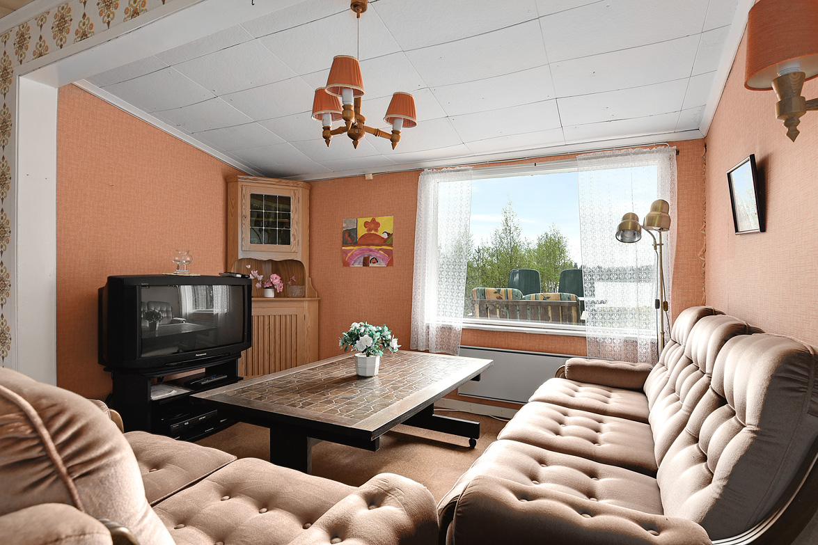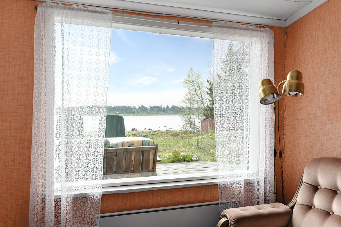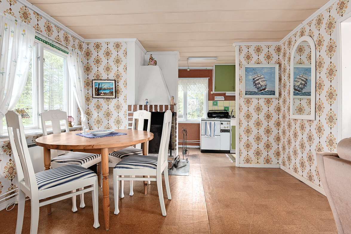 Äldre huvudbyggnad ca 40 kvm. Överbyggd entré. Allrum med plastmatta, matplats och allrumsdel med havsutsikt. I allrummet finns en fungerande öppen spis. Från allrummet har man utsikt ned mot havsviken. Kök med spis och kyl/frys, i köket finns en matkällare som nås via en lucka i golvet. . Litet förråd. Vid entrén finns ett separat rum med duschplats och portapotti. På gården finns också en separat sovstuga på ca 20 kvm, denna är byggd på 90-talet. En hel del lösöre kommer att ingå i köpet.