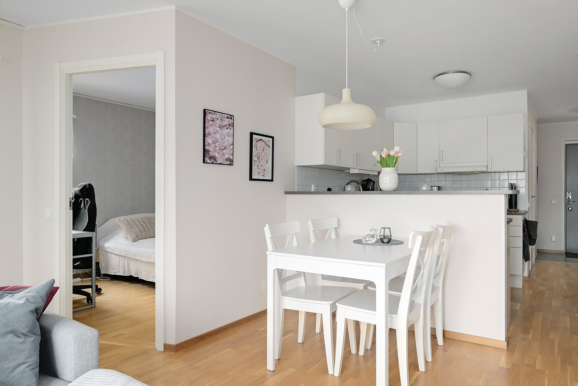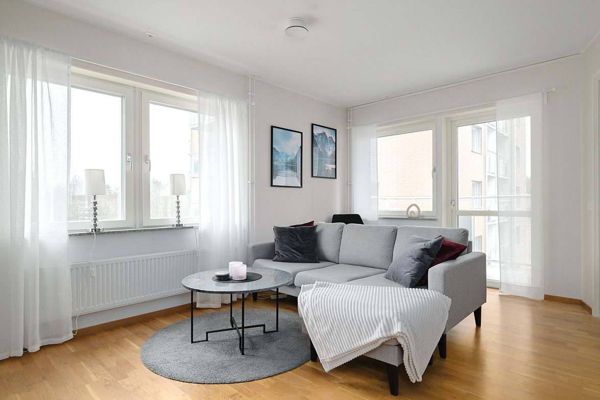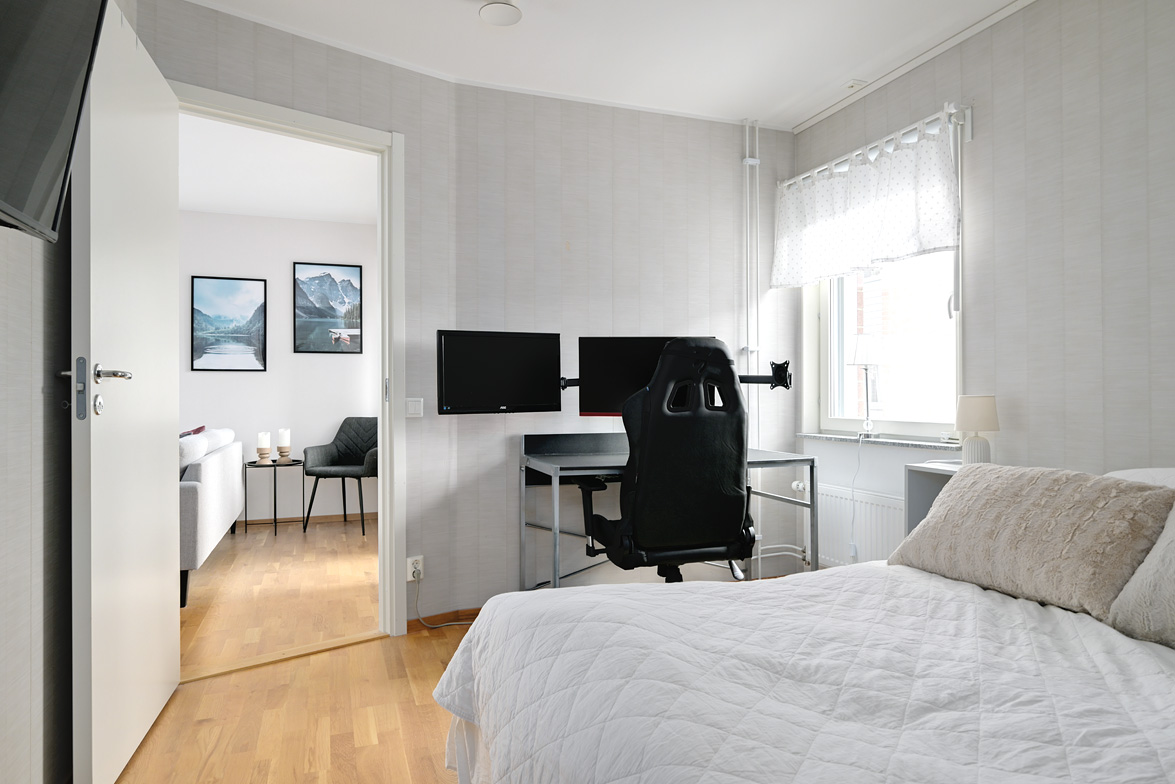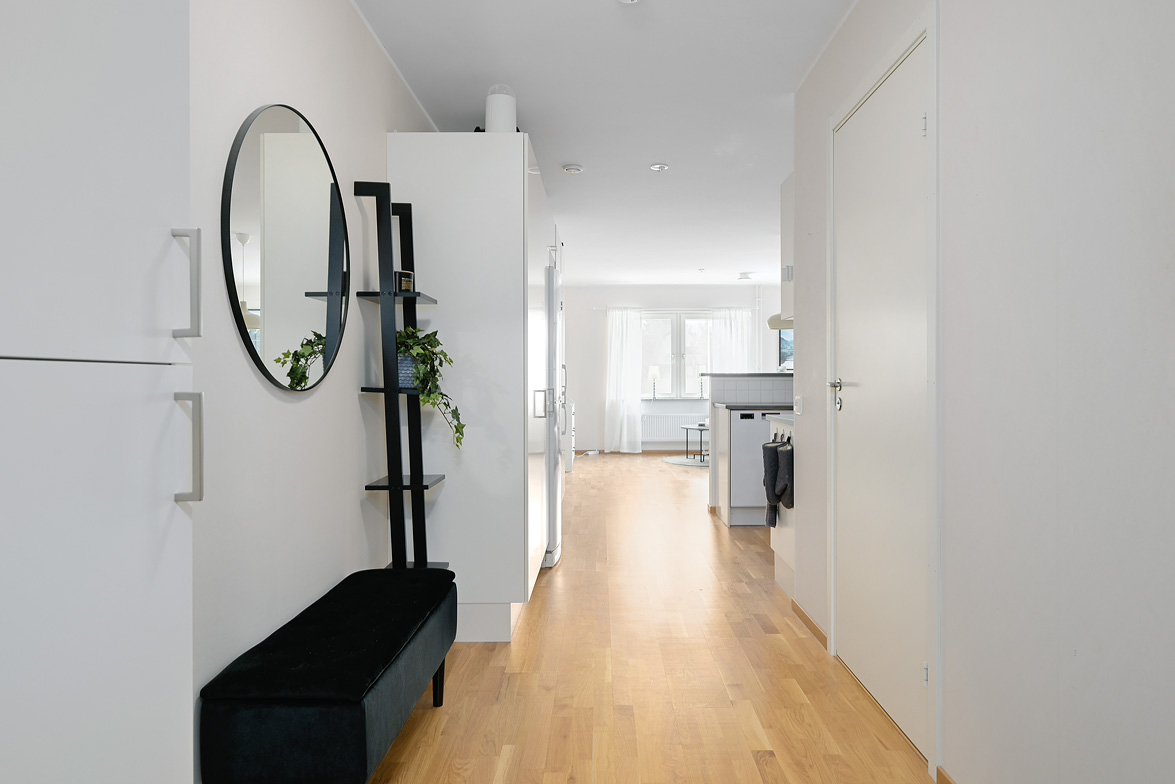Hall - Ljusa väggar, klinkergolv i grått med övergång till ett ekparkettgolv vilket ligger genomgående i resterande av lägenheten. Avhängningsmöjligheter direkt till vänster samt skåp till höger. Badrum - WC, dusch, handfat, spegel samt spegelskåp. Klinkergolv i grått samt vitt kakel på halva väggarna förutom i duschhörnan som har förlängd kakelvägg. I övrigt är väggarna målade i ljus vattentät kulör. Badrummet är anpassat för att rymma en tvättmaskin, det är även delvis förberett för detta. Kök - Bänkskiva i laminat, vitt kakel ovanför bänk, spis med ugn, kombinerad kyl/frys, samt diskmaskin. Vardagsrum och kök i fil då del av köksbänk vetter sig mot vardagsrummet med en förhöjd hylla. Fortsättningsvis ljusa väggar i kök och vardagsrum, fönsterbänkar i sten i vardagsrum och sovrum. Balkong i söderläge med härlig utsikt samt sol stora delar av dagen. Sovrum - Ekparkettgolv, ljusa väggar samt fyra garderober och fönster mot söder. Modern lägenhet i ett eftertraktat område med ett av husets bästa lägen, välkomna på visning!