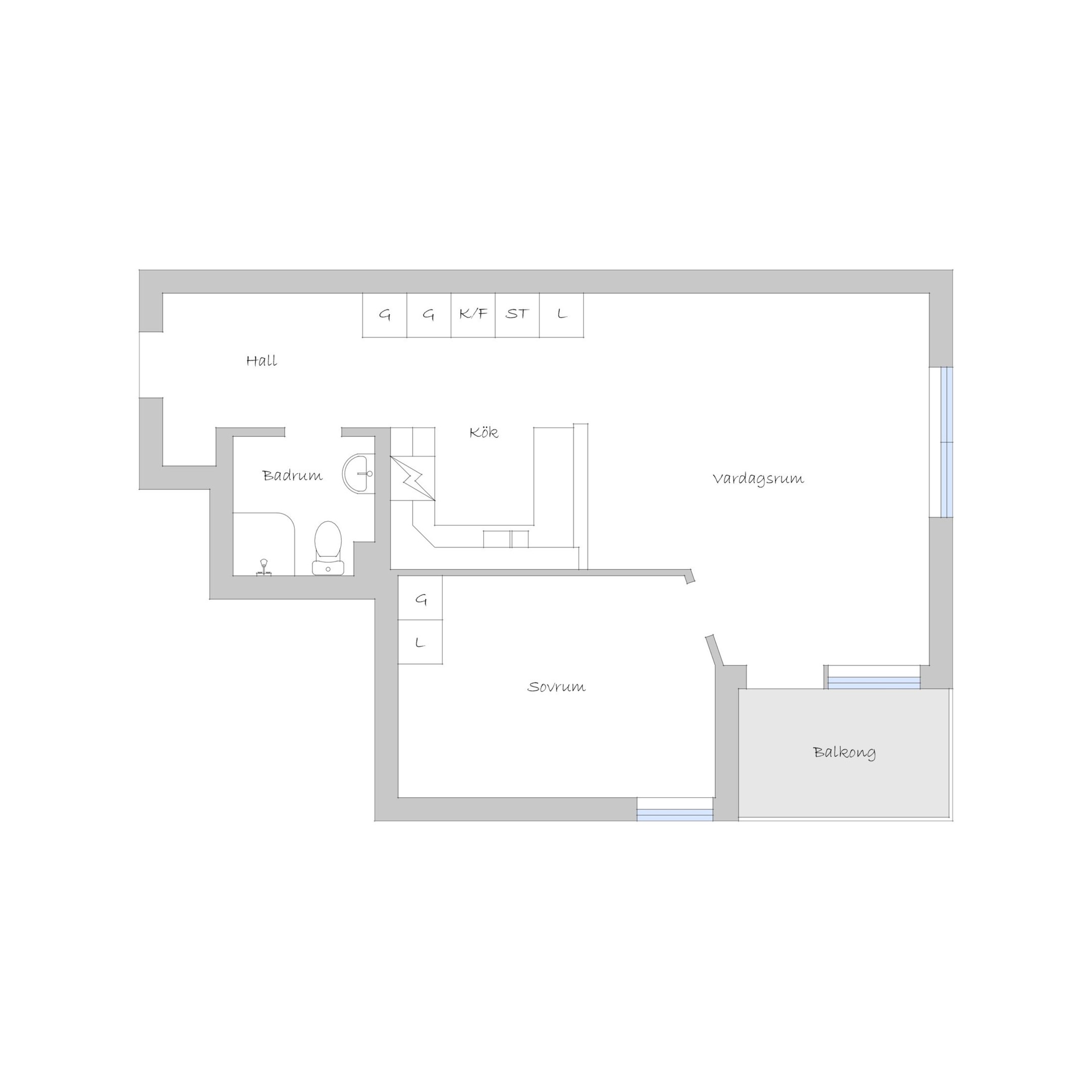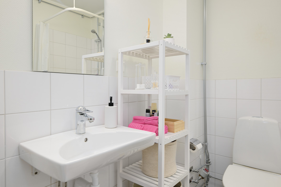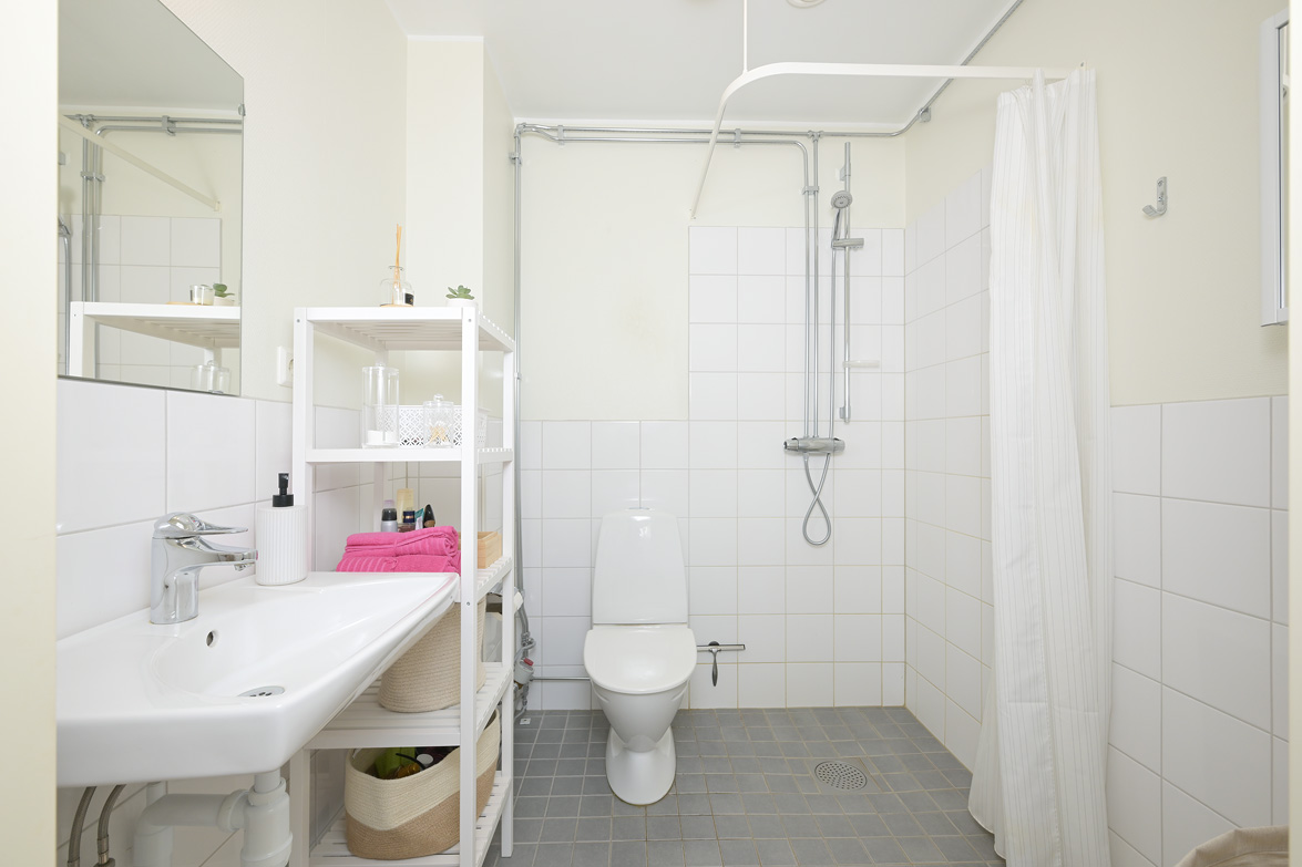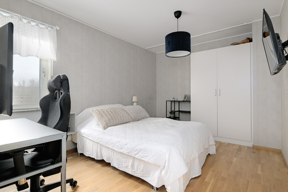 Hall - Ljusa väggar, klinkergolv i grått med övergång till ett ekparkettgolv vilket ligger genomgående i resterande av lägenheten. Avhängningsmöjligheter direkt till vänster samt skåp till höger. Badrum - WC, dusch, handfat, spegel samt spegelskåp. Klinkergolv i grått samt vitt kakel på halva väggarna förutom i duschhörnan som har förlängd kakelvägg. I övrigt är väggarna målade i ljus vattentät kulör. Badrummet är anpassat för att rymma en tvättmaskin, det är även delvis förberett för detta. Kök - Bänkskiva i laminat, vitt kakel ovanför bänk, spis med ugn, kombinerad kyl/frys, samt diskmaskin. Vardagsrum och kök i fil då del av köksbänk vetter sig mot vardagsrummet med en förhöjd hylla. Fortsättningsvis ljusa väggar i kök och vardagsrum, fönsterbänkar i sten i vardagsrum och sovrum. Balkong i söderläge med härlig utsikt samt sol stora delar av dagen. Sovrum - Ekparkettgolv, ljusa väggar samt fyra garderober och fönster mot söder. Modern lägenhet i ett eftertraktat område med ett av husets bästa lägen, välkomna på visning!