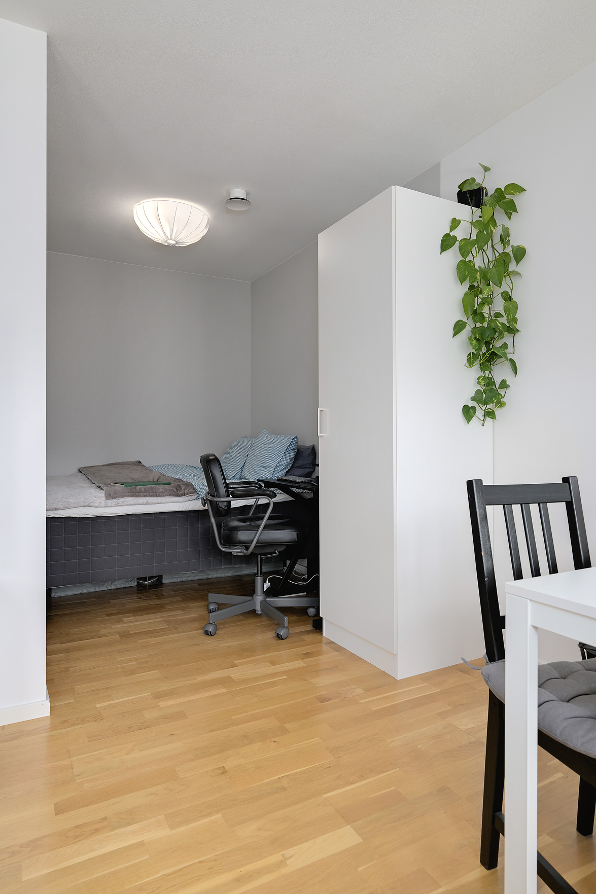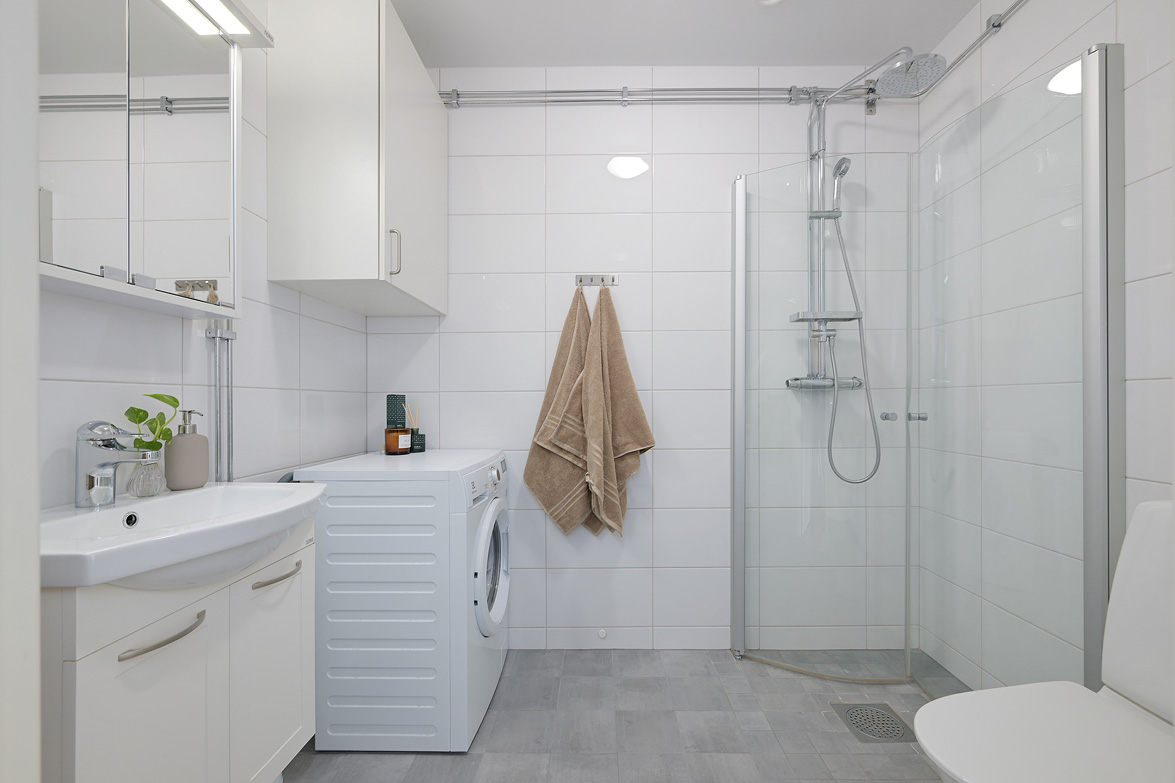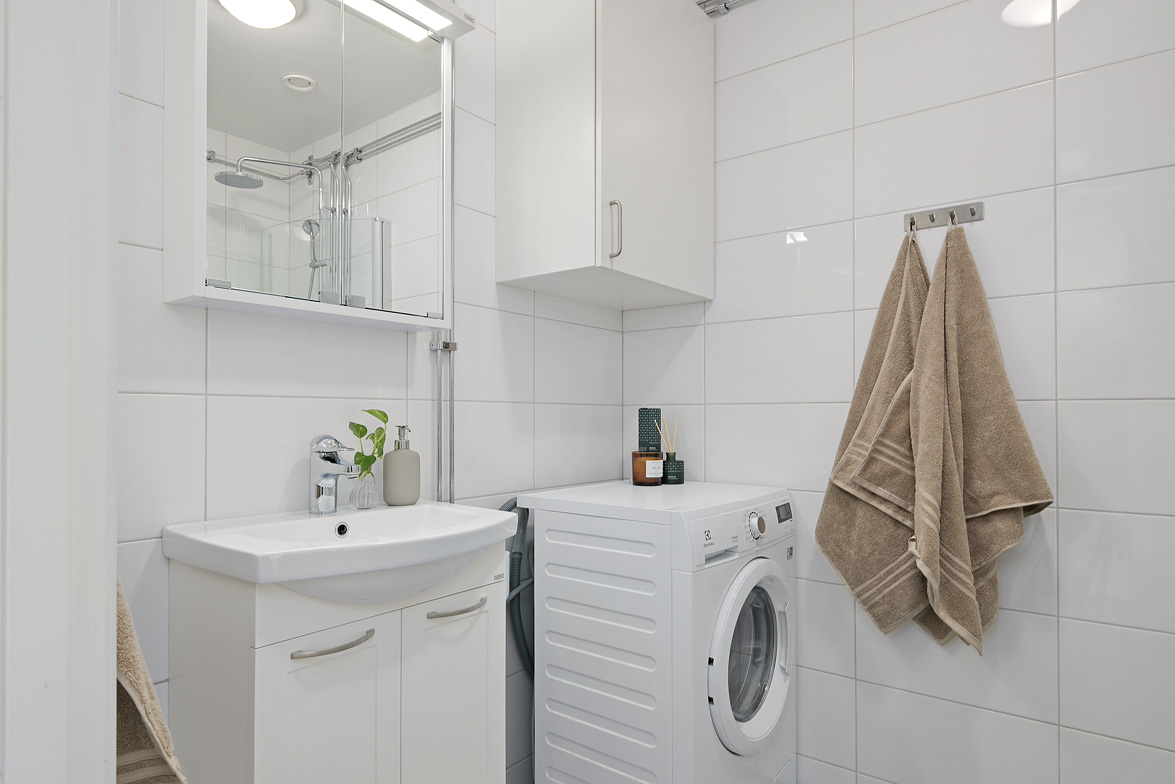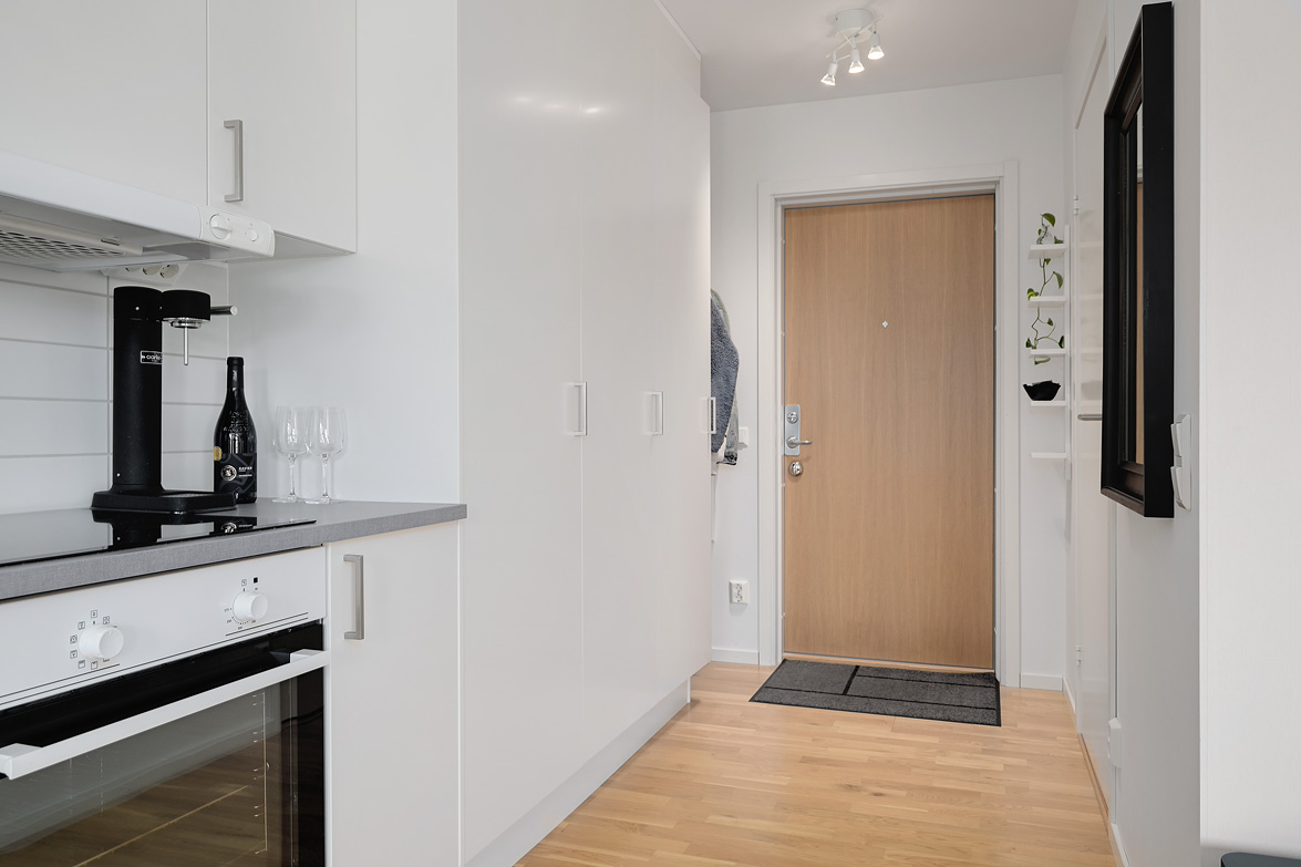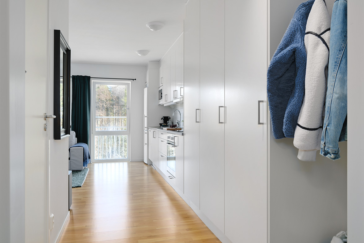 Hall Välkomnande hall med ett vackert parkettgolv och smakfull tapet som sätter tonen för bostadens varma helhetskänsla. Här finns praktisk avhängning via hatthylla samt god förvaring i två garderober och ett städskåp – allt snyggt integrerat för en ordnad entré. Badrum Stilrent badrum med grått klinkergolv och klassiskt vitt kakel som tillsammans skapar en lugn och tidlös atmosfär. Här finns en kombinerad tvätt- och torkmaskin som förenklar vardagen, samt kommod, spegelskåp med belysning, wc och ett elegant takduschset som ger en känsla av vardagslyx. Kök Ljust och trivsamt kök med vita, släta luckor och en praktisk laminatbänkskiva med klassisk diskbänk. Köket är fullt utrustat med diskmaskin, kombinerad kyl/frys, inbyggd mikro, häll och ugn – allt för ett smidigt och funktionellt köksliv. Här finns även plats för ett matbord i en naturlig samlingspunkt. Allrum Generöst och öppet allrum med ett härligt ljusinsläpp och en luftig planlösning som bjuder in till både avkoppling och sociala stunder. Här ryms såväl soffgrupp som matplats, och den franska balkongen i österläge ger ett fint ljusflöde och en extra känsla av rymd. Sovalkov Ombonad och smart planerad sovalkov med parkettgolv och harmonisk tapet. Den avskilda placeringen skapar en lugn sovdel, kompletterad med ett praktiskt garderob för bra förvaring.
