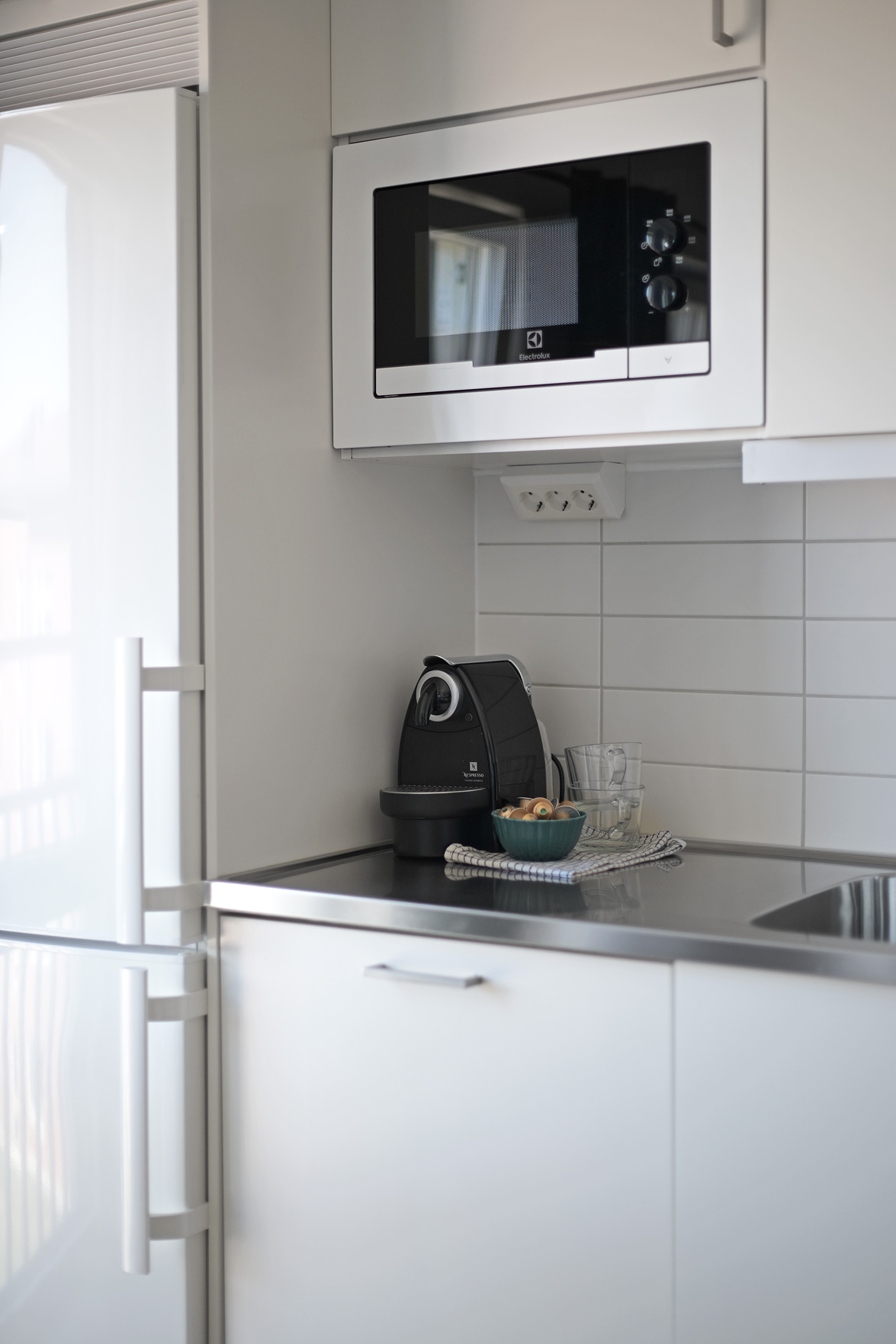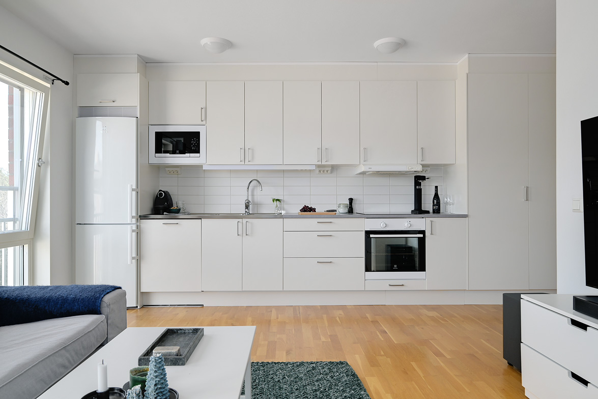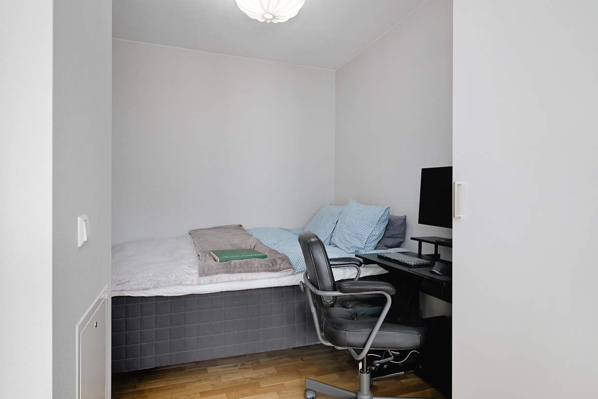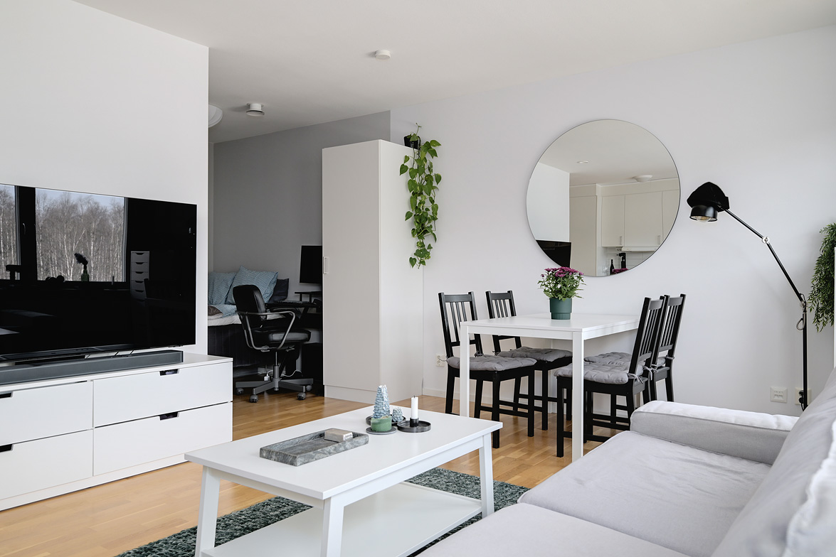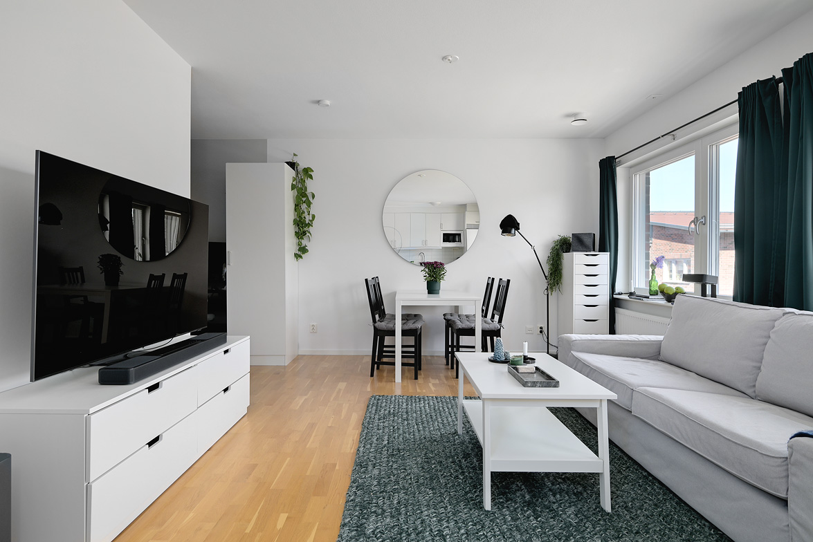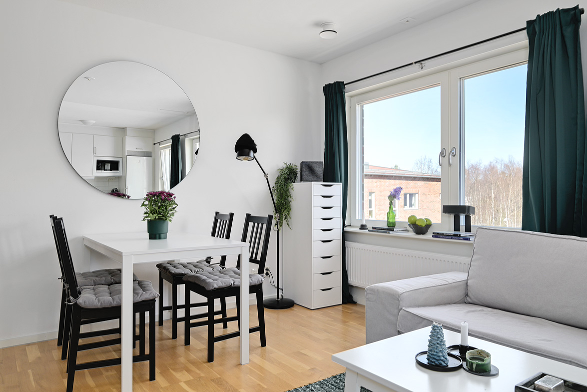 Hall Välkomnande hall med ett vackert parkettgolv och smakfull tapet som sätter tonen för bostadens varma helhetskänsla. Här finns praktisk avhängning via hatthylla samt god förvaring i två garderober och ett städskåp – allt snyggt integrerat för en ordnad entré. Badrum Stilrent badrum med grått klinkergolv och klassiskt vitt kakel som tillsammans skapar en lugn och tidlös atmosfär. Här finns en kombinerad tvätt- och torkmaskin som förenklar vardagen, samt kommod, spegelskåp med belysning, wc och ett elegant takduschset som ger en känsla av vardagslyx. Kök Ljust och trivsamt kök med vita, släta luckor och en praktisk laminatbänkskiva med klassisk diskbänk. Köket är fullt utrustat med diskmaskin, kombinerad kyl/frys, inbyggd mikro, häll och ugn – allt för ett smidigt och funktionellt köksliv. Här finns även plats för ett matbord i en naturlig samlingspunkt. Allrum Generöst och öppet allrum med ett härligt ljusinsläpp och en luftig planlösning som bjuder in till både avkoppling och sociala stunder. Här ryms såväl soffgrupp som matplats, och den franska balkongen i österläge ger ett fint ljusflöde och en extra känsla av rymd. Sovalkov Ombonad och smart planerad sovalkov med parkettgolv och harmonisk tapet. Den avskilda placeringen skapar en lugn sovdel, kompletterad med ett praktiskt garderob för bra förvaring.
