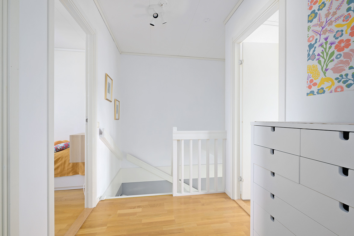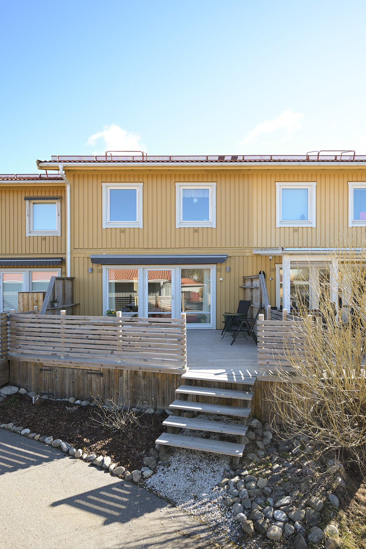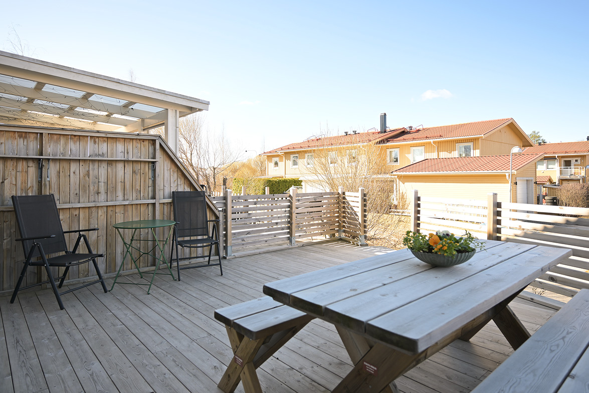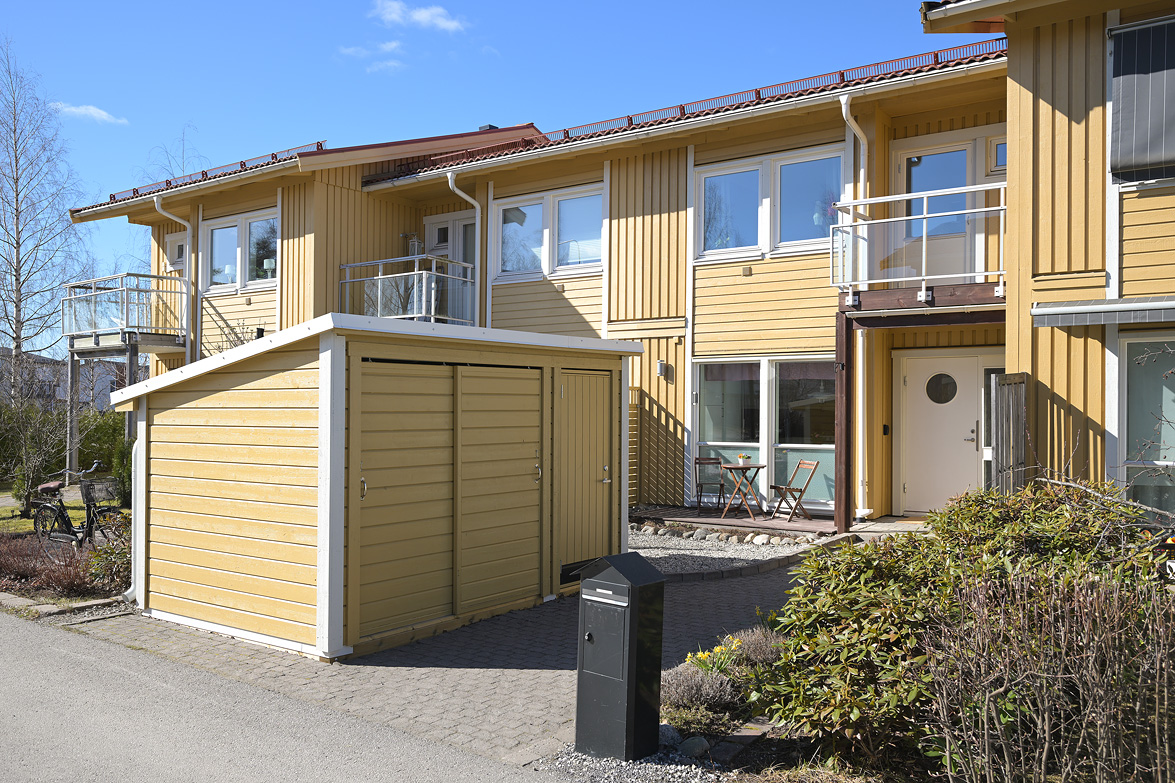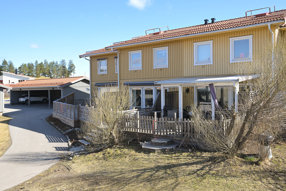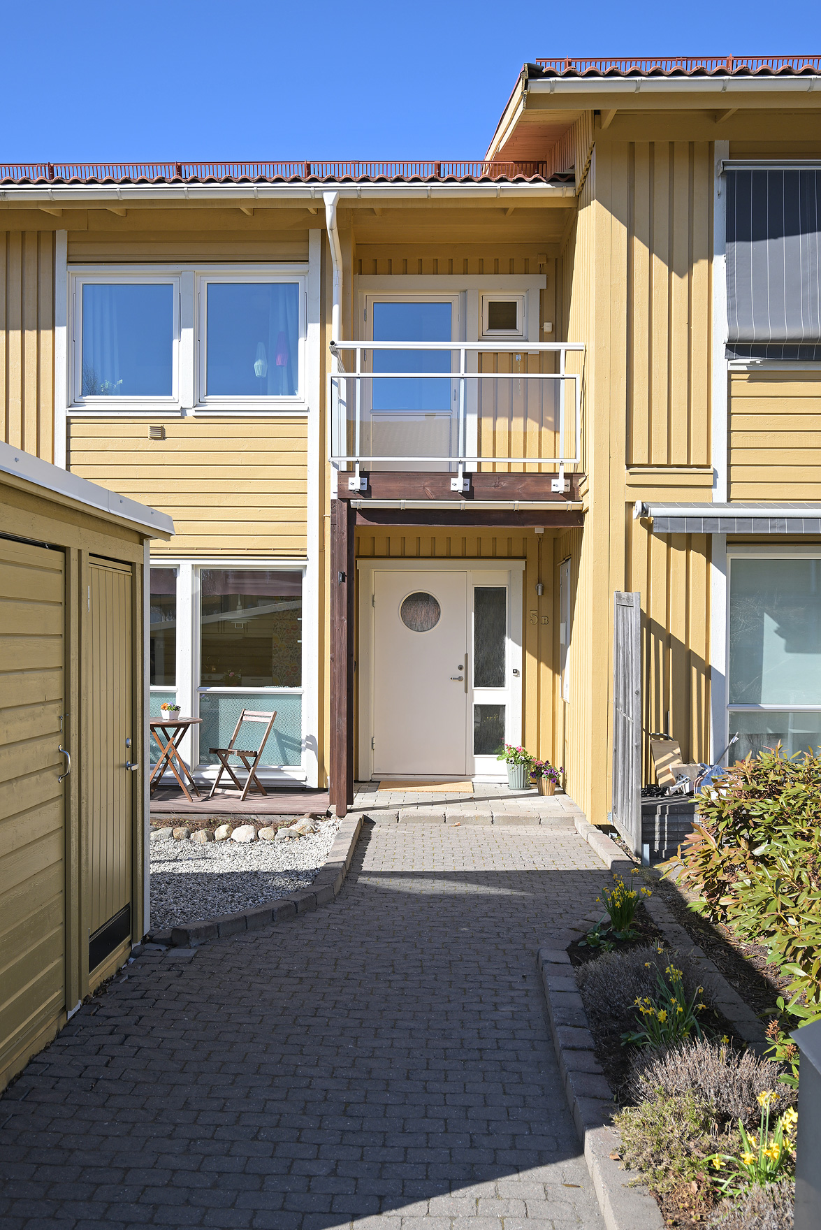 Trivsamt och välplanerat radhus med två uteplatser i populärt område Välkommen till detta ljusa och välplanerade radhus som erbjuder ett bekvämt och harmoniskt boende i ett omtyckt område. Här bor du i en välskött bostad som genom åren genomgått flera renoveringar – perfekt för dig som söker ett hem att trivas i från första stund. Redan i hallen möts du av ett stilrent klinkergolv och generösa avhängningsmöjligheter som gör vardagen smidig. Vidare in i bostaden finner du ett rymligt och fräscht kök med modern maskinpark, gott om arbetsyta och plats för ett större matbord – en naturlig samlingspunkt för familj och vänner. Det luftiga vardagsrummet erbjuder gott om utrymme för en stor soffgrupp där hela bekantskapskretsen får plats, samt möjlighet till ytterligare möblering såsom matplats eller hemmakontor. Härifrån nås bostadens ena uteplats – den större modellen – som är generöst utbyggd och ger plats för både loungemöbler, matgrupp, grill och odlingar. En perfekt plats för avkoppling och sociala tillställningar. Bostaden har två stilrena badrum med kakel och klinker, praktiskt fördelade med ett på vardera plan. På övre plan finner du även tre rymliga sovrum med goda förvaringsmöjligheter. Det största sovrummet erbjuder extra komfort med både klädkammare och egen balkong. Här får du ett hem som kombinerar funktion, komfort och livskvalitet – med närhet till allt du behöver. Till bostaden hör även en carport med intillliggande förråd. Varmt välkommen på visning! Renoveringar: 2019: - Målat fasad 2021: - Nya vitvaror; kyl/frys, spis, köksfläkt (Mats Åke på Teg) - Ny fasadbelysning framsida och baksida (Nordelektro) - Renovering av trappan (Sandström snickeri) 2025: - Renovering badrum (Haga bygg) - Utökat ytor på vinden för ytterligare möjlighet till förvaring (Haga bygg) - Byta av tegelpannor (Haga bygg) 2026: - Nybyggt cykelförråd med förrådsdel (Haga Bygg) - Ny tvättmaskin Mellan 2021 och 2026 har fjärrvärmesystemet underhållits och löpande delar har bytts ut eller uppdaterats (Johanssons rör). Övrigt: Det finns ett rymligt kallförråd i separat länga vid parkeringarna. I detta hus finns även återvinning av paper, plast, tidning, metall, lampor, batterier samt brännbart. Till huset finns en plats carport. I dagsläget är den el-säkrad för att kunna ladda en hybrid bil. Utredning om eventuell installation av laddstolpe pågår inom föreningen. På samfälligheters mark finns några bärbuskar, hallonplantor och en gräsmatta. Gräsmattan nås enkelt från baksidan av huset via altanen.