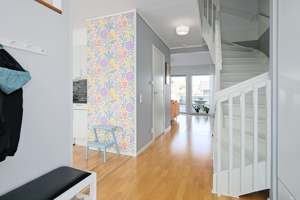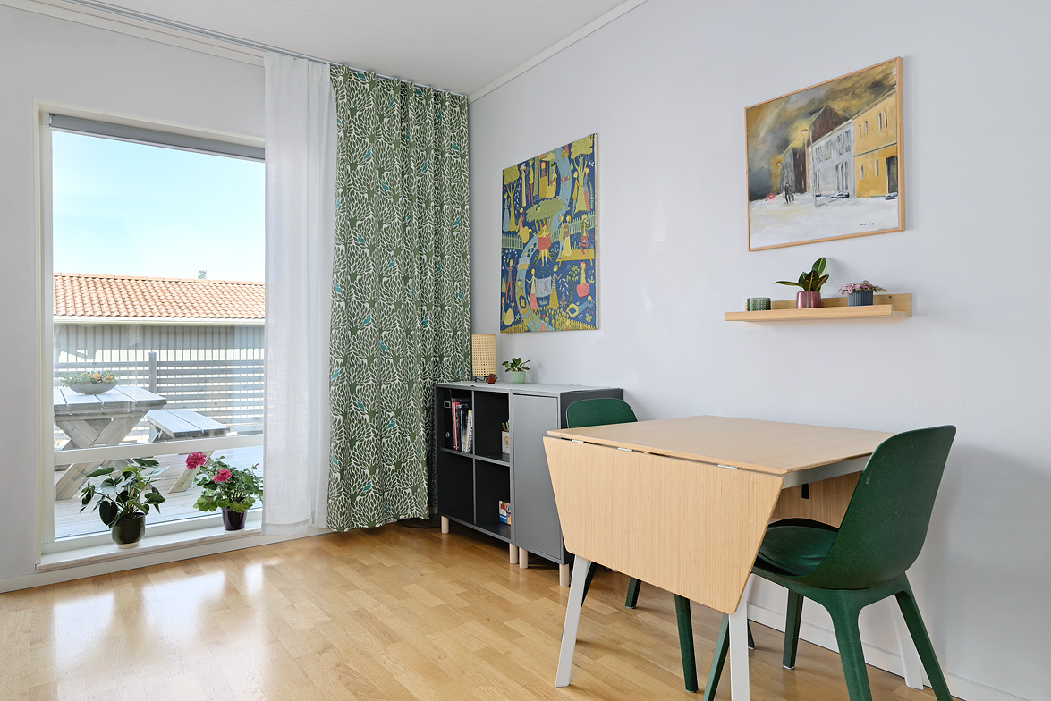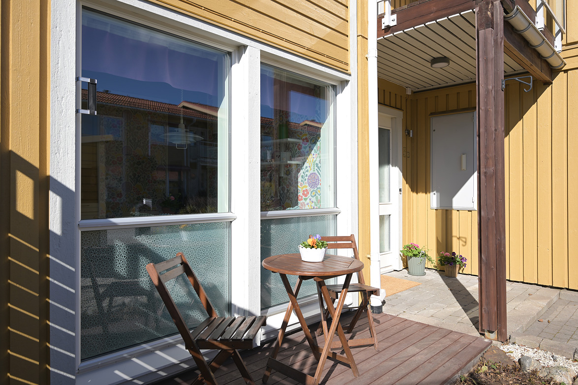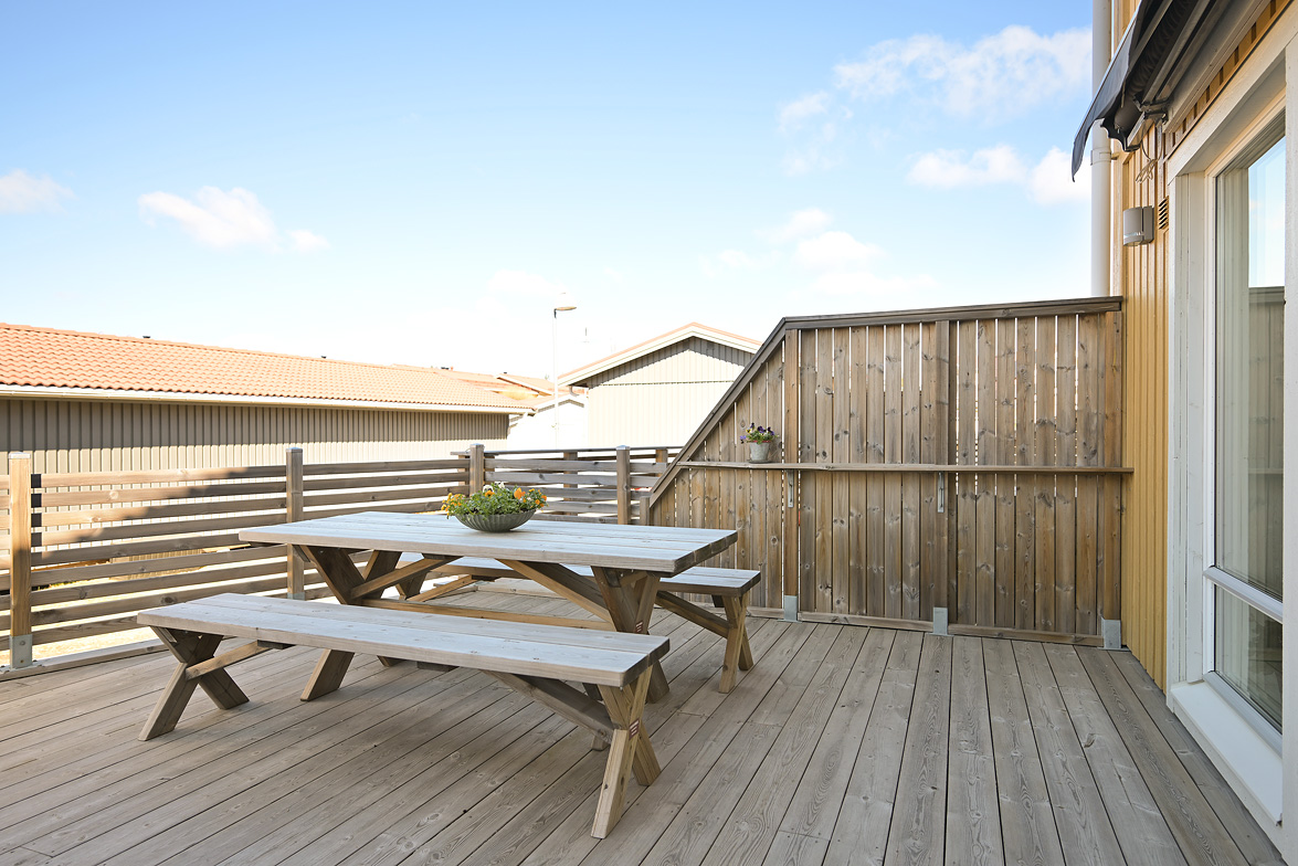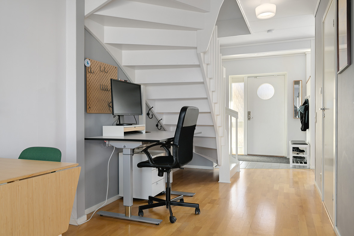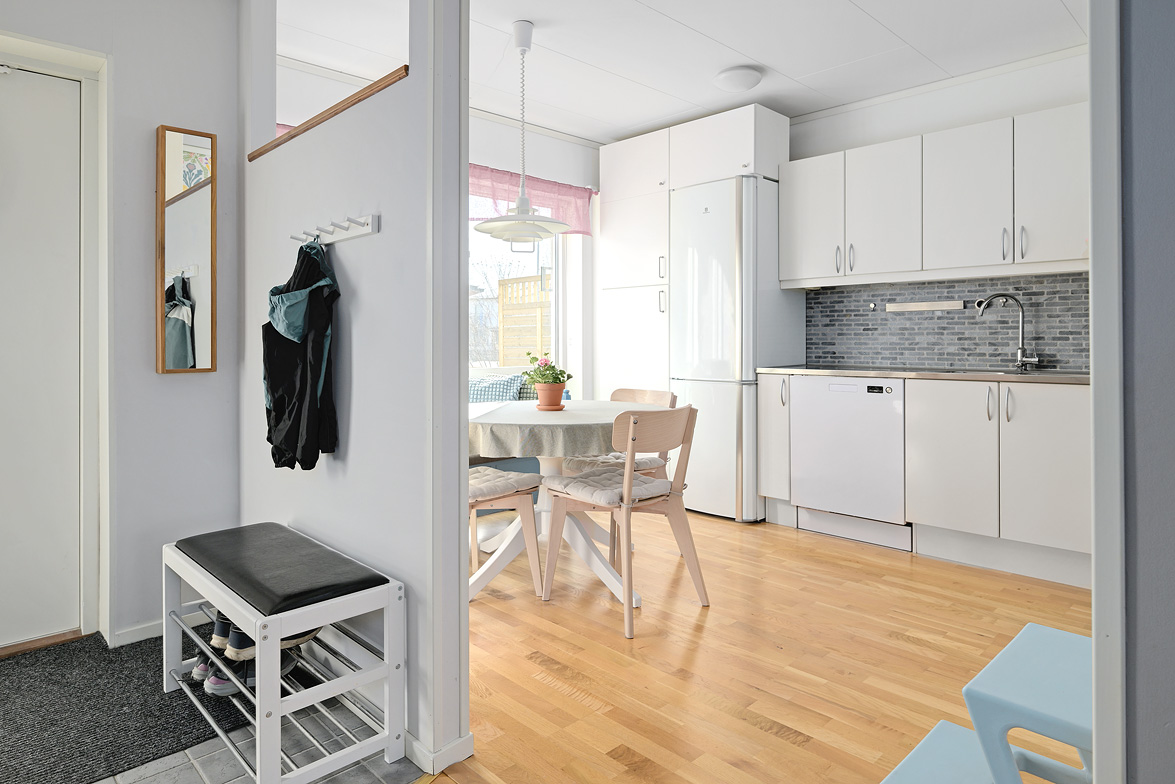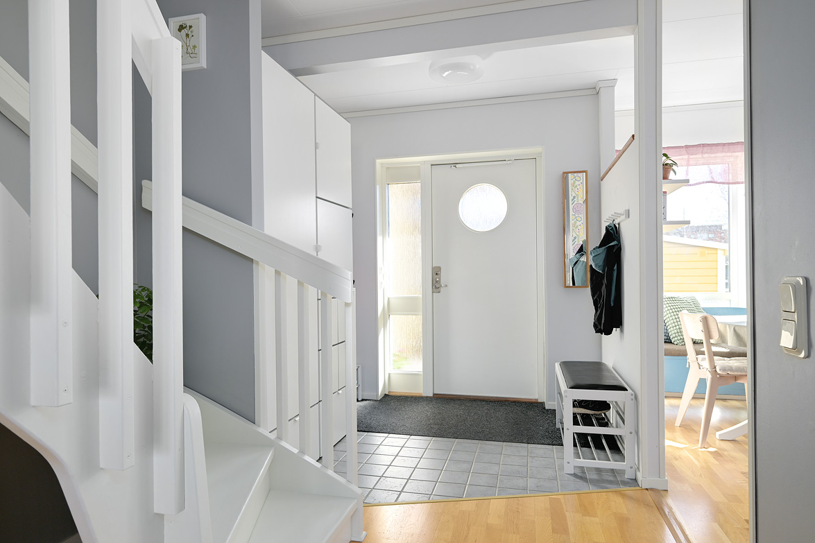 Trivsamt och välplanerat radhus med två uteplatser i populärt område Välkommen till detta ljusa och välplanerade radhus som erbjuder ett bekvämt och harmoniskt boende i ett omtyckt område. Här bor du i en välskött bostad som genom åren genomgått flera renoveringar – perfekt för dig som söker ett hem att trivas i från första stund. Redan i hallen möts du av ett stilrent klinkergolv och generösa avhängningsmöjligheter som gör vardagen smidig. Vidare in i bostaden finner du ett rymligt och fräscht kök med modern maskinpark, gott om arbetsyta och plats för ett större matbord – en naturlig samlingspunkt för familj och vänner. Det luftiga vardagsrummet erbjuder gott om utrymme för en stor soffgrupp där hela bekantskapskretsen får plats, samt möjlighet till ytterligare möblering såsom matplats eller hemmakontor. Härifrån nås bostadens ena uteplats – den större modellen – som är generöst utbyggd och ger plats för både loungemöbler, matgrupp, grill och odlingar. En perfekt plats för avkoppling och sociala tillställningar. Bostaden har två stilrena badrum med kakel och klinker, praktiskt fördelade med ett på vardera plan. På övre plan finner du även tre rymliga sovrum med goda förvaringsmöjligheter. Det största sovrummet erbjuder extra komfort med både klädkammare och egen balkong. Här får du ett hem som kombinerar funktion, komfort och livskvalitet – med närhet till allt du behöver. Till bostaden hör även en carport med intillliggande förråd. Varmt välkommen på visning! Renoveringar: 2019: - Målat fasad 2021: - Nya vitvaror; kyl/frys, spis, köksfläkt (Mats Åke på Teg) - Ny fasadbelysning framsida och baksida (Nordelektro) - Renovering av trappan (Sandström snickeri) 2025: - Renovering badrum (Haga bygg) - Utökat ytor på vinden för ytterligare möjlighet till förvaring (Haga bygg) - Byta av tegelpannor (Haga bygg) 2026: - Nybyggt cykelförråd med förrådsdel (Haga Bygg) - Ny tvättmaskin Mellan 2021 och 2026 har fjärrvärmesystemet underhållits och löpande delar har bytts ut eller uppdaterats (Johanssons rör). Övrigt: Det finns ett rymligt kallförråd i separat länga vid parkeringarna. I detta hus finns även återvinning av paper, plast, tidning, metall, lampor, batterier samt brännbart. Till huset finns en plats carport. I dagsläget är den el-säkrad för att kunna ladda en hybrid bil. Utredning om eventuell installation av laddstolpe pågår inom föreningen. På samfälligheters mark finns några bärbuskar, hallonplantor och en gräsmatta. Gräsmattan nås enkelt från baksidan av huset via altanen.